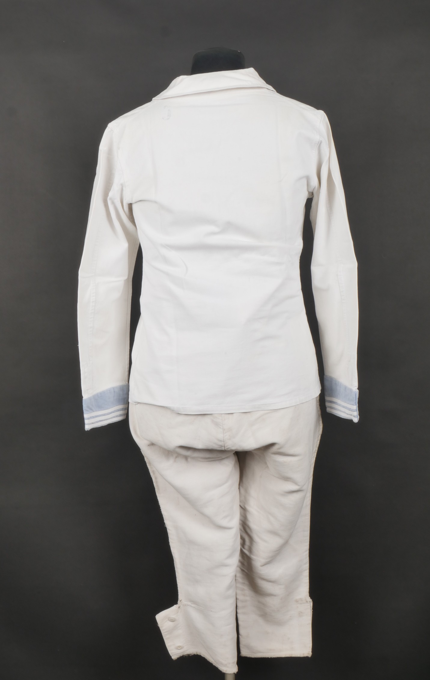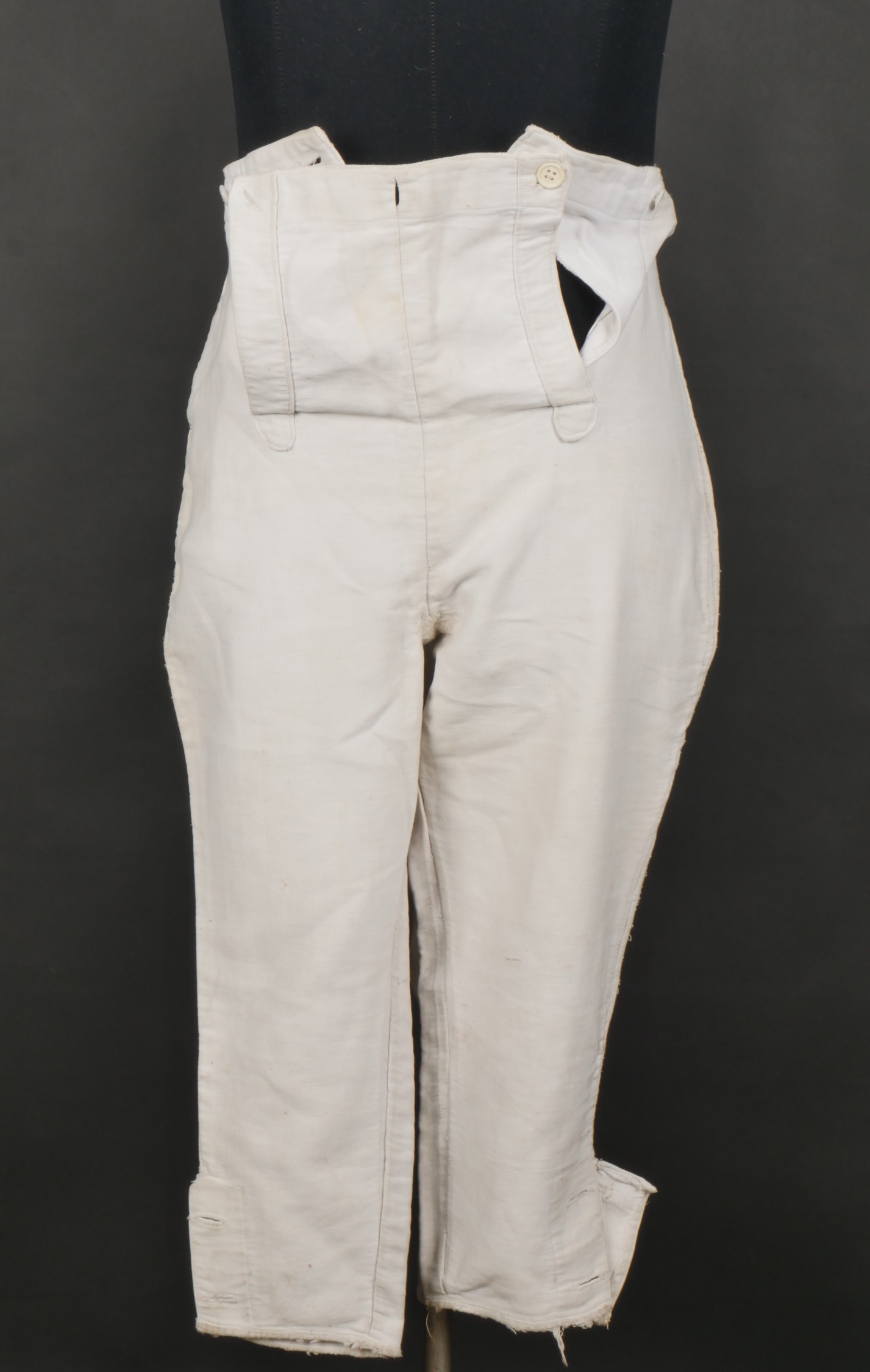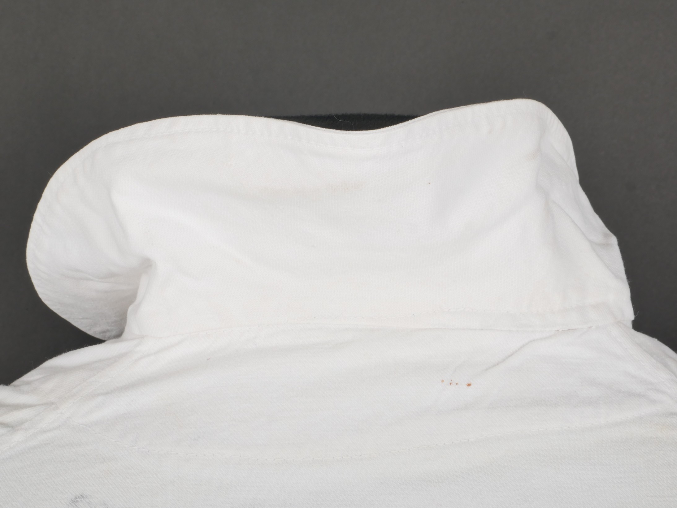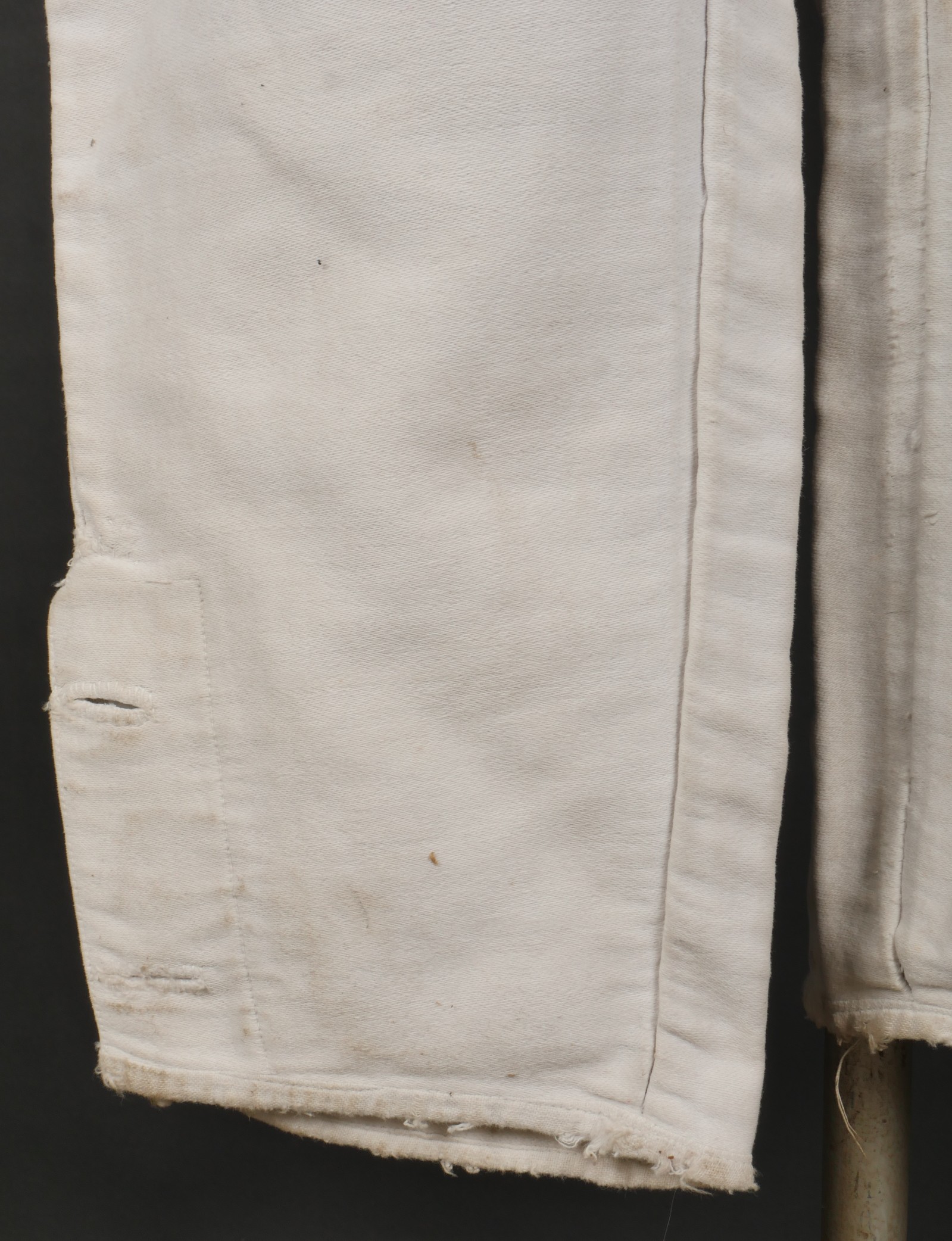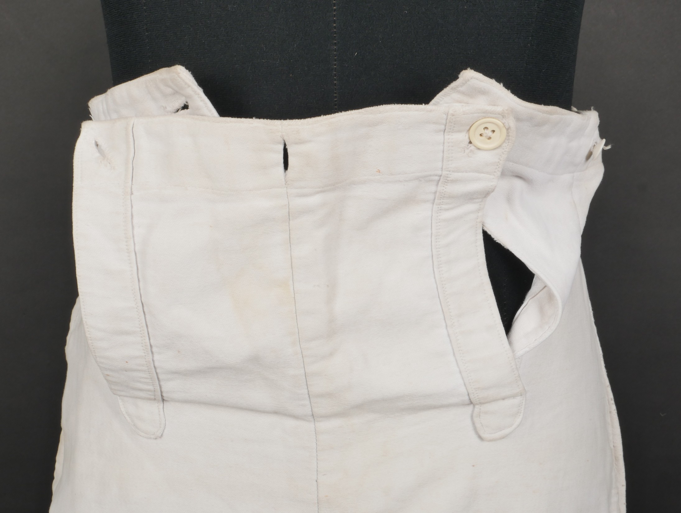 Ensemble de vêtements de marin français. Deux chemises dont une à col carré bleu fixe, une culotte en coton écru. Divers marquages à déchiffrer. Set of French Navy Clothing Two shirts, one with fixed square blue collar, and one pair of ecru cotton trousers. Various stamps to be deciphered.