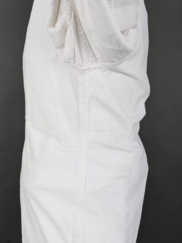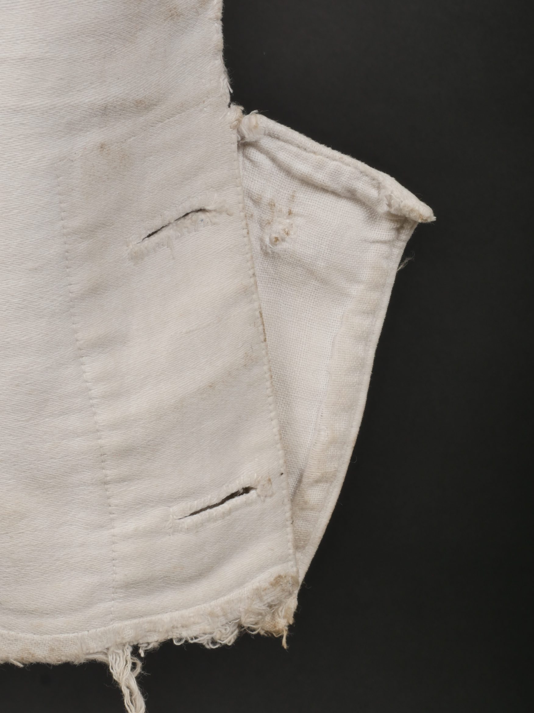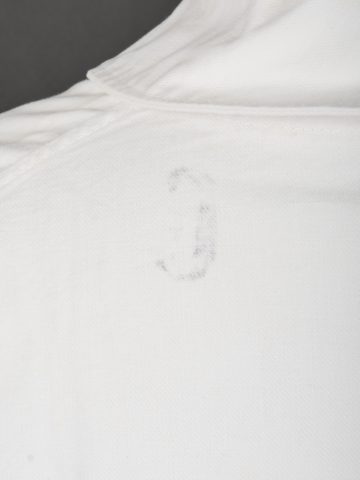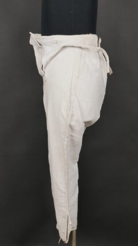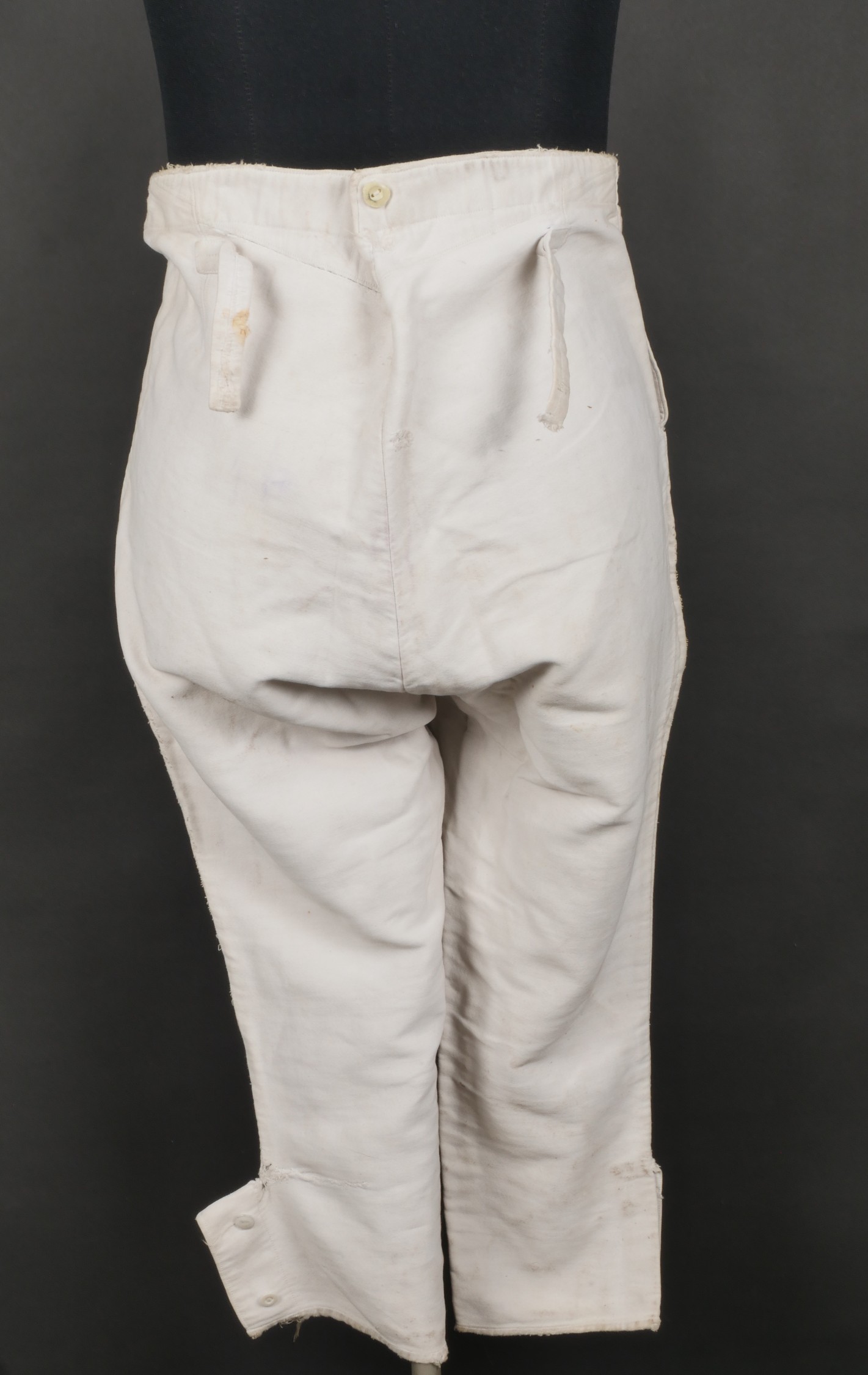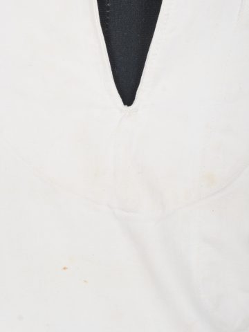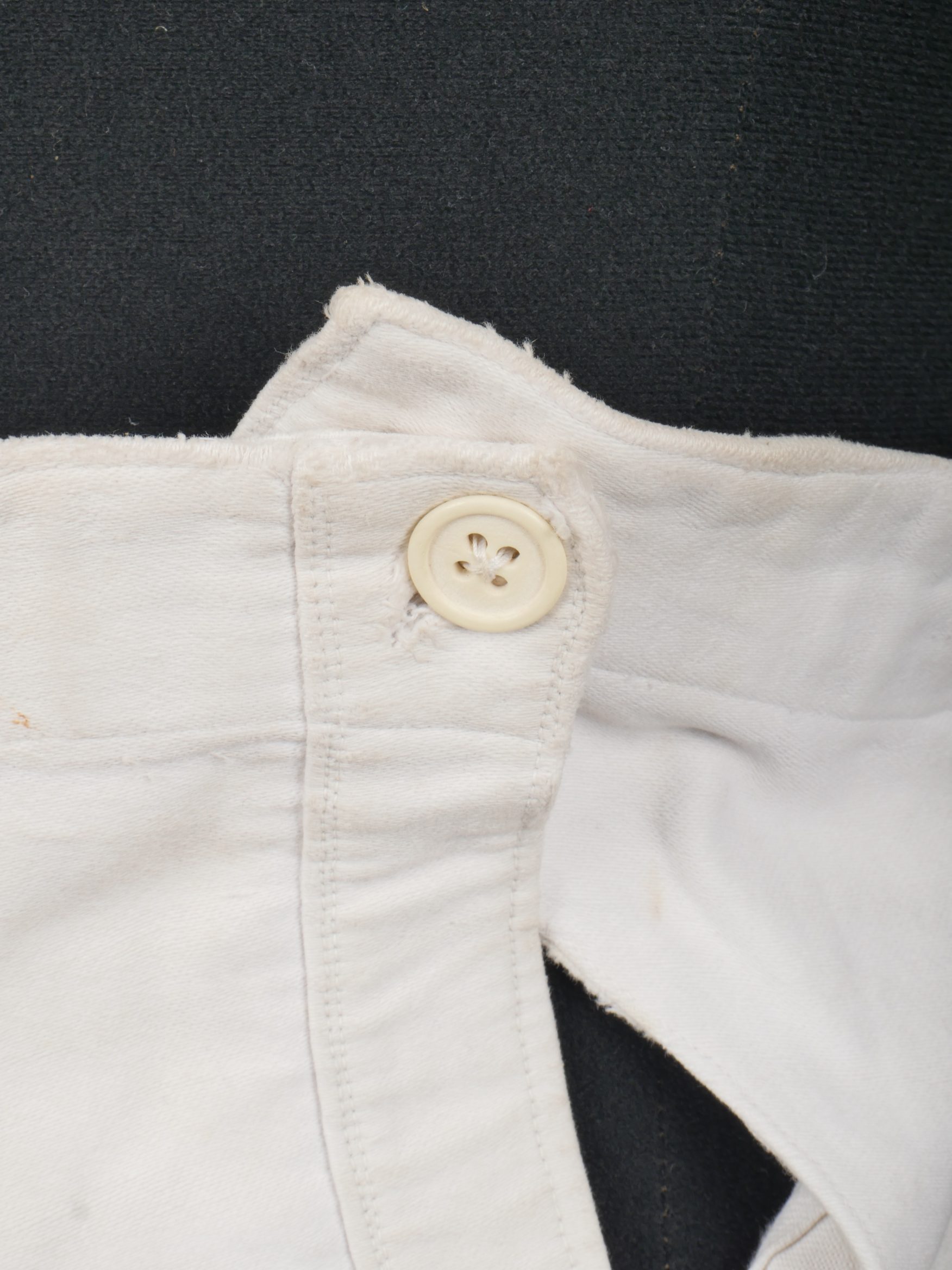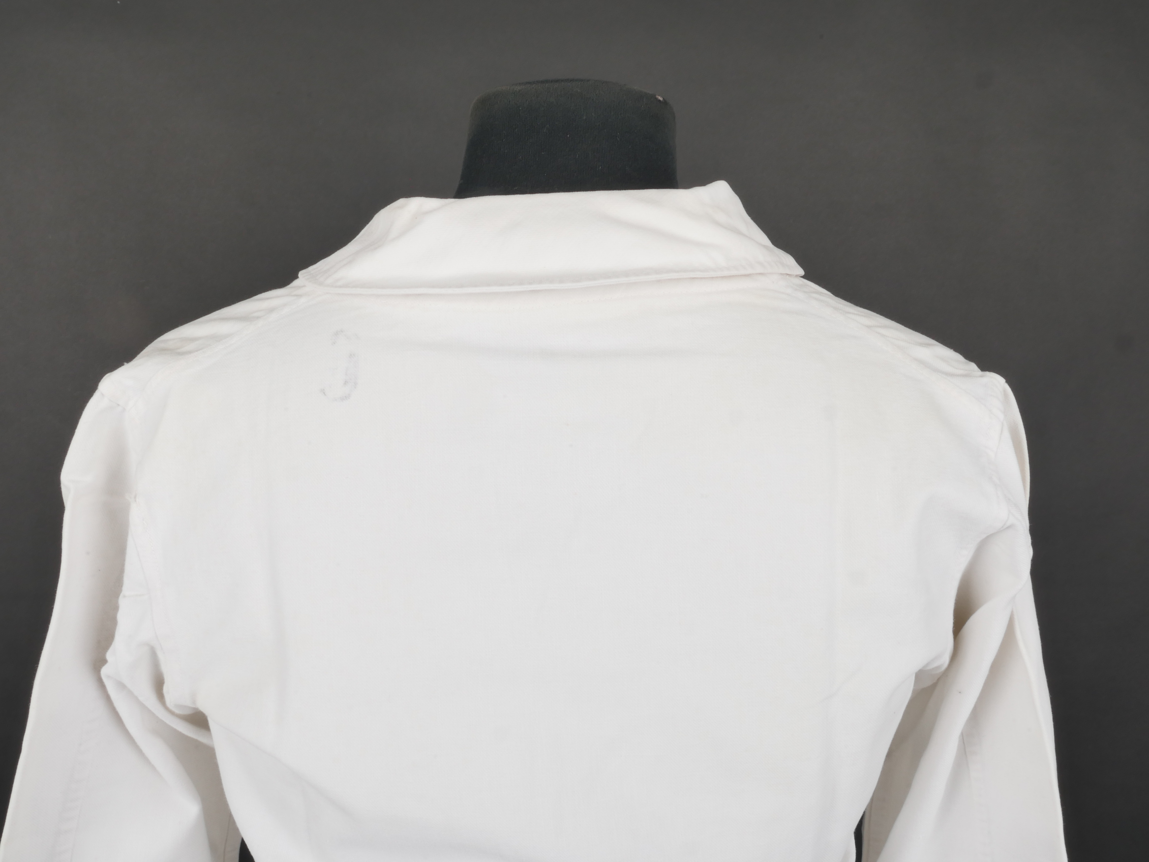 Ensemble de vêtements de marin français. Deux chemises dont une à col carré bleu fixe, une culotte en coton écru. Divers marquages à déchiffrer. Set of French Navy Clothing Two shirts, one with fixed square blue collar, and one pair of ecru cotton trousers. Various stamps to be deciphered.