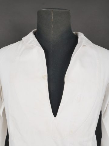 Détails de la vente >Ensemble de vêtements de marin français. Deux chemises dont une à col carré bleu fixe, une culotte en coton écru. Divers marquages à déchiffrer. Set of French Navy Clothing Two shirts, one... en savoir plus