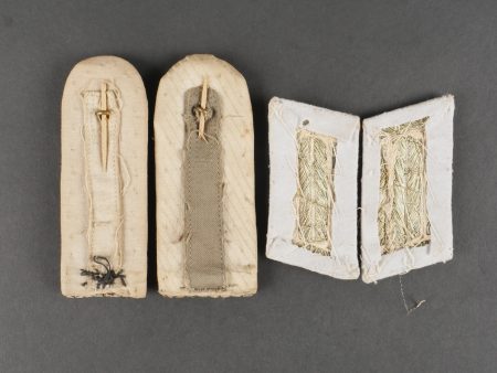 Ensemble pattes d’épaules et de col d’officier d’infanterie. Une paire de pattes d’épaule modèle 1915 d’officier d’infanterie prussien avec boutons en laiton, dessous blanc. Une paire de Kragenspiegeln en canetille argent sur fond blanc. Bon état. Set of Officer’s Infantry Shoulder and Collar Insignia Pair of M1915 Prussian infantry officer shoulder straps with brass buttons and white underlay, together with a pair of collar patches (Kragenspiegel) in silver bullion on white backing. Good condition.
