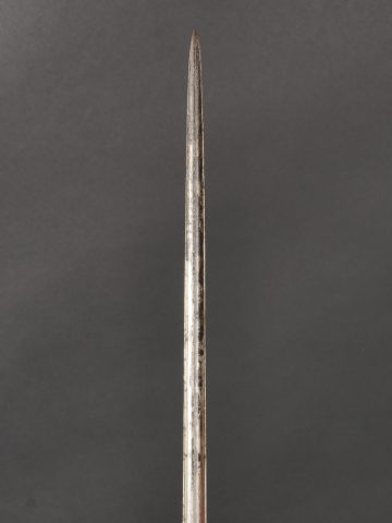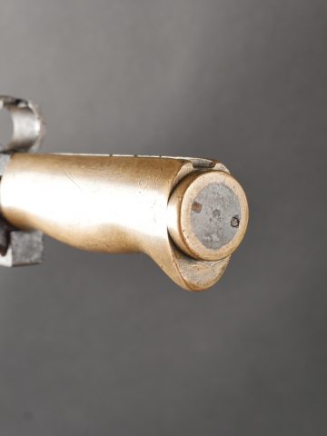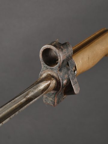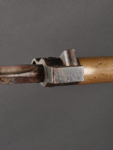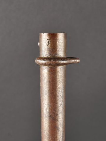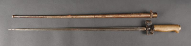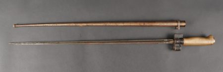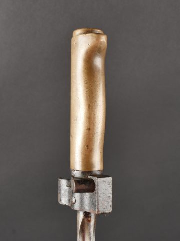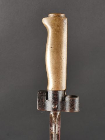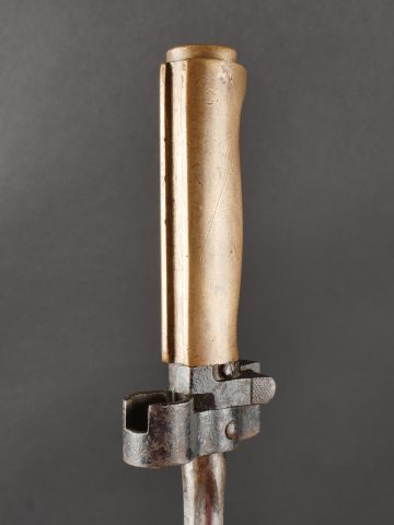 Epée-baïonnette 1886-15. Lame cruciforme. Poignée laiton moulée, sans quillon. Poussoir fonctionnel. Fourreau fer en bon état. Patine, usure d’usage. Model 1886-15 Sword Bayonet... en savoir plus
