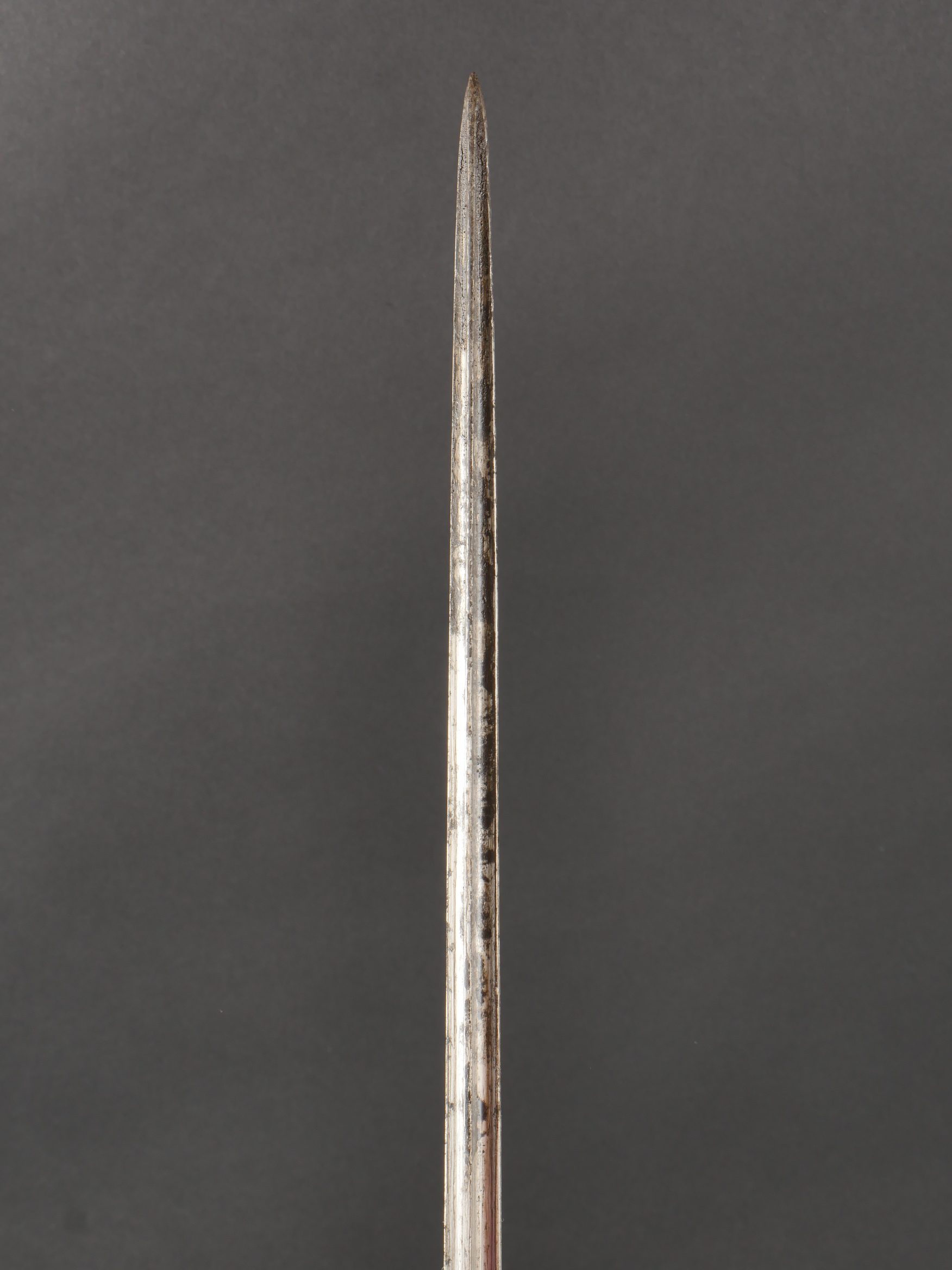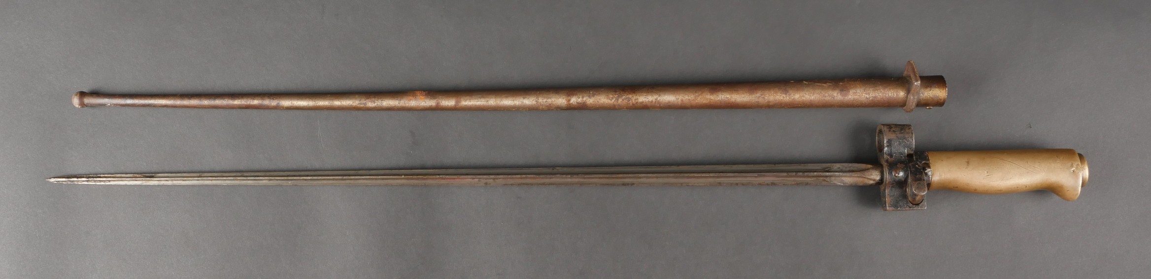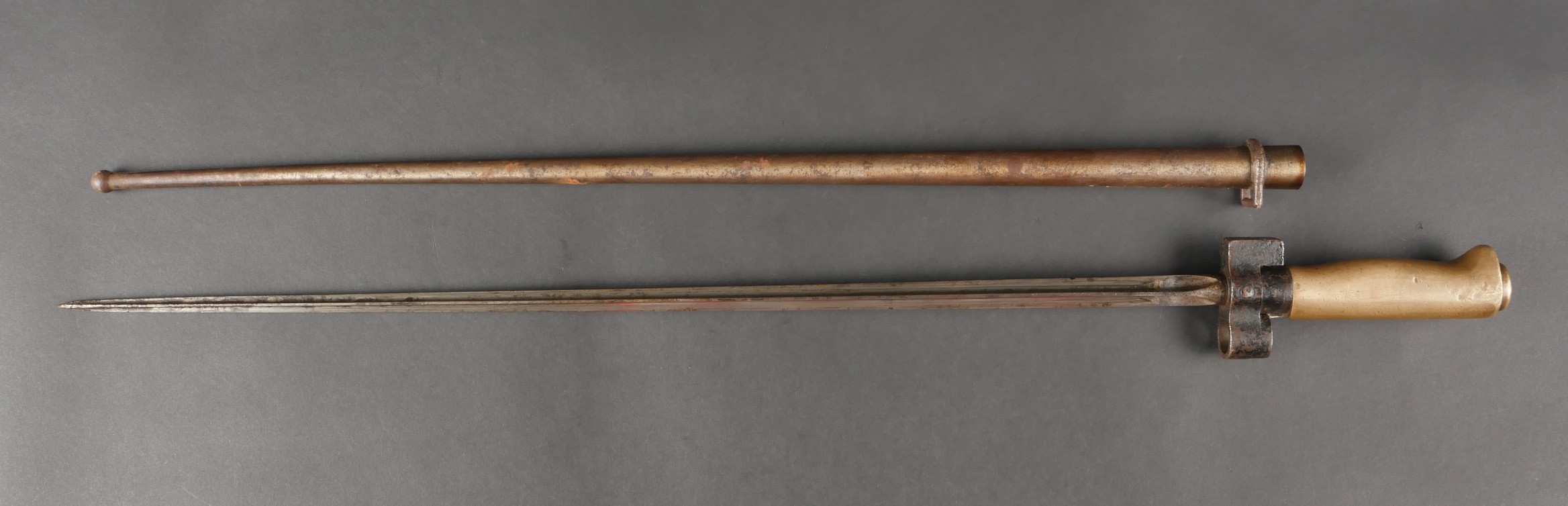 Détails de la vente >Epée-baïonnette 1886-15. Lame cruciforme. Poignée laiton moulée, sans quillon. Poussoir fonctionnel. Fourreau fer en bon état. Patine, usure d’usage. Model 1886-15 Sword Bayonet... en savoir plus