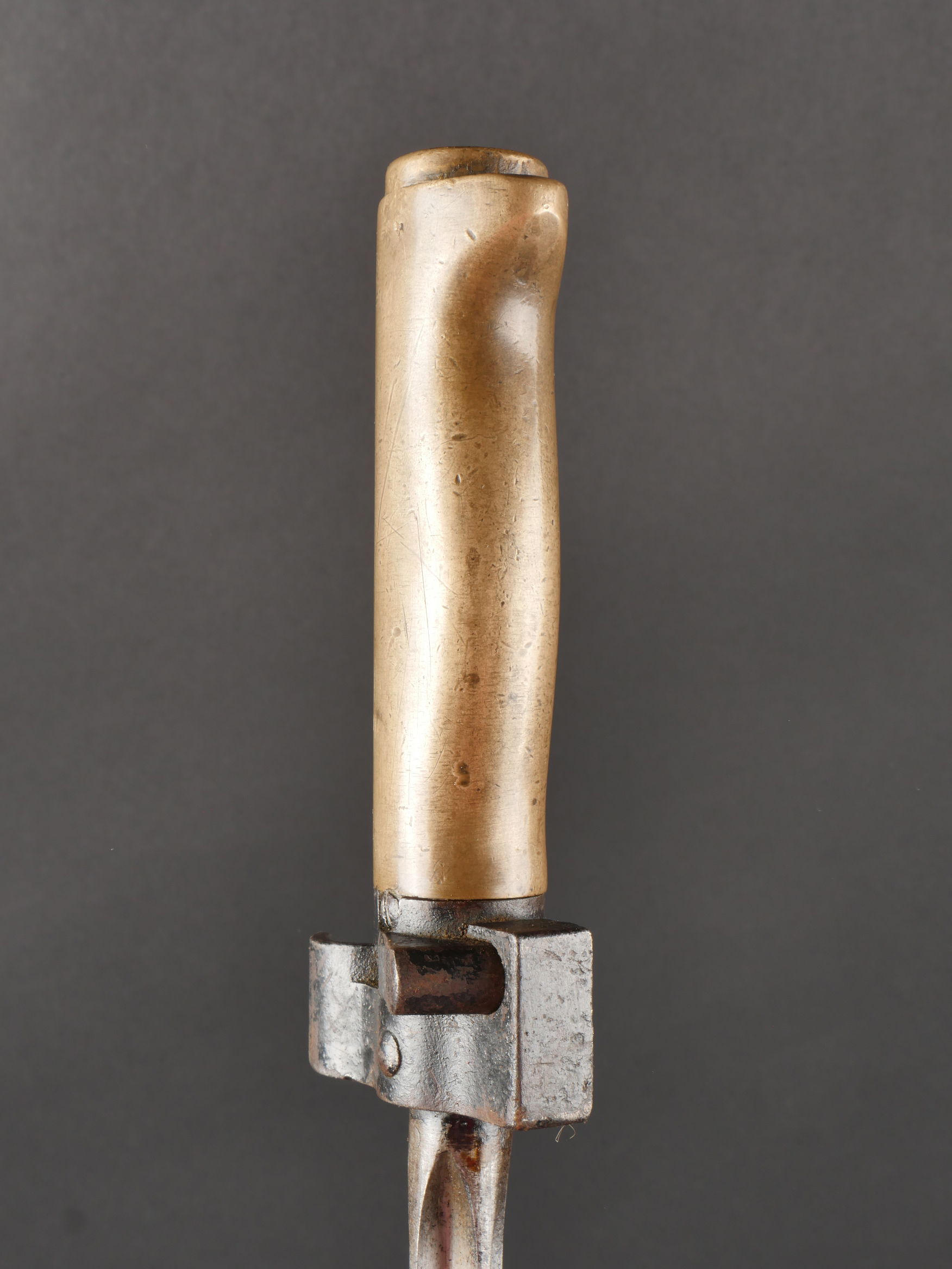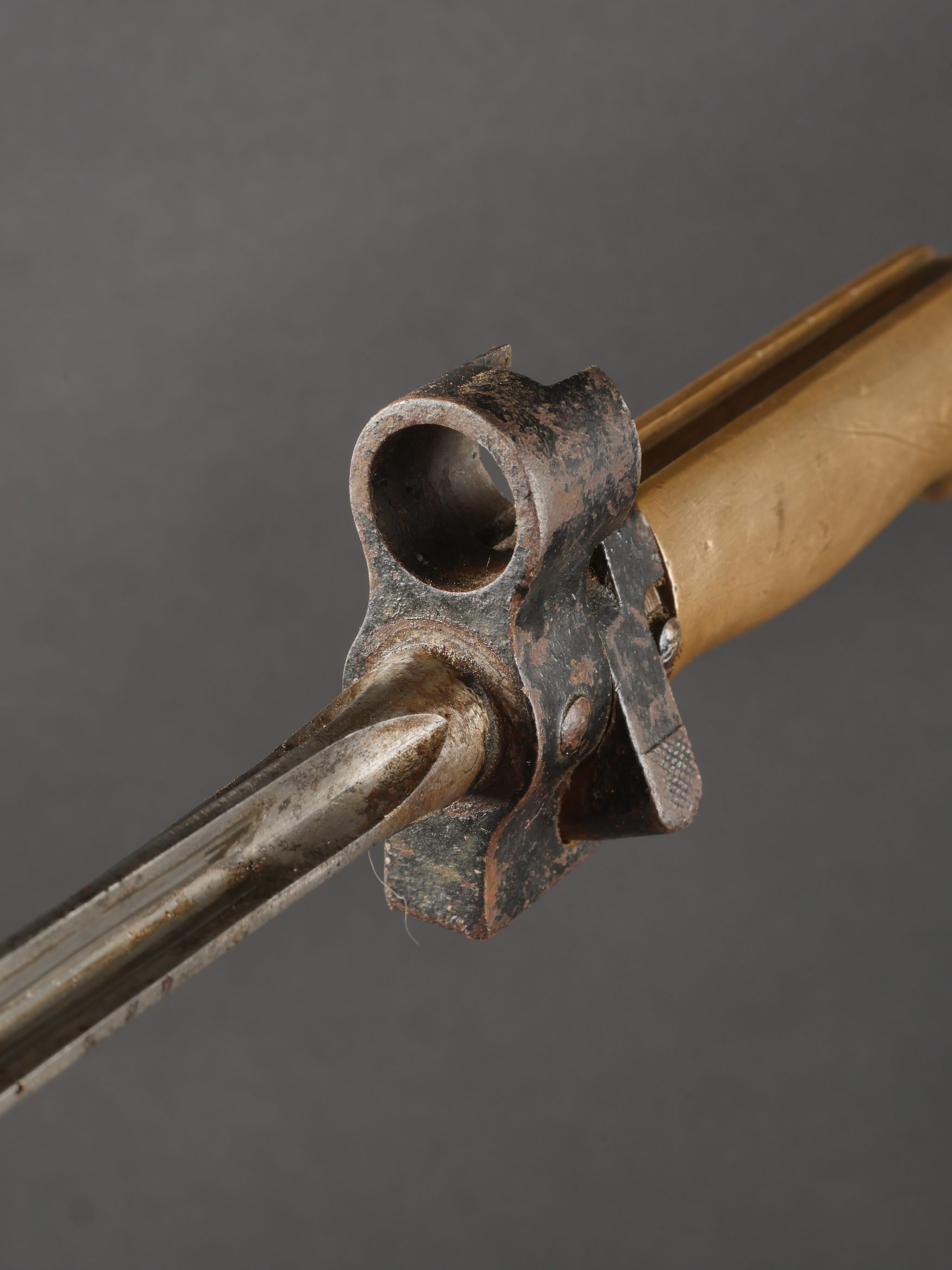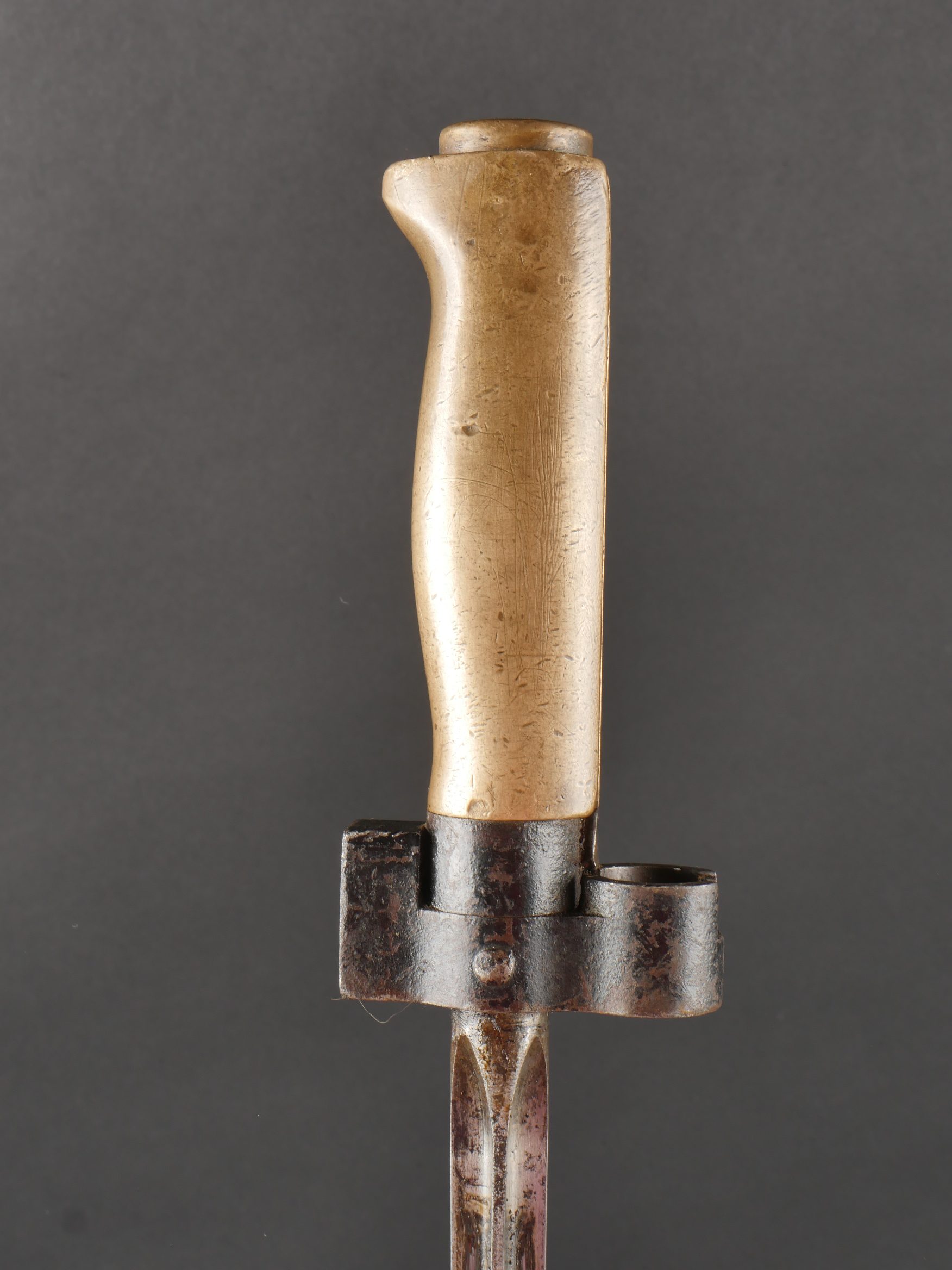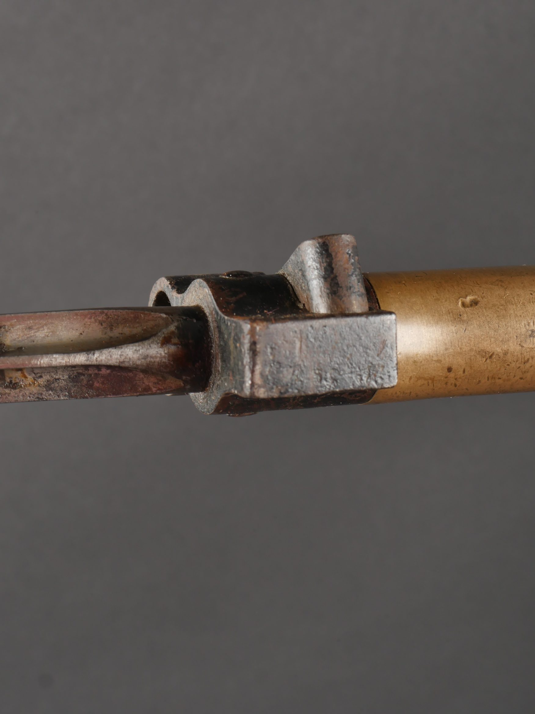 Epée-baïonnette 1886-15. Lame cruciforme. Poignée laiton moulée, sans quillon. Poussoir fonctionnel. Fourreau fer en bon état. Patine, usure d’usage. Model 1886-15 Sword Bayonet Cruciform blade, cast brass handle without quillon, functional release button. Iron scabbard in good condition. Patina and wear from use.