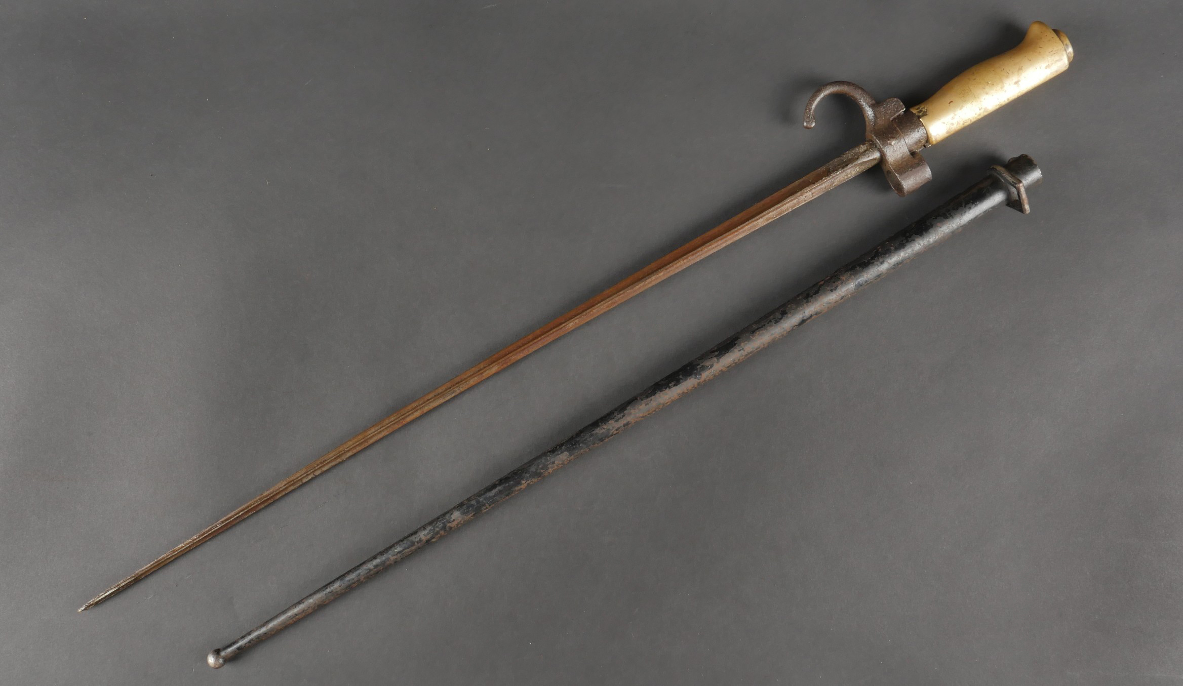 Epée-baïonnette française modèle 1886. Lame cruciforme, très légèrement raccourcie de quelques millimètres, poignée moulée en laiton, quillon. Bouton poussoir bloqué. Poignée en mauvais état, oxydation, coups. Fourreau fer en bon état avec numéro de série. French Model 1886 Sword Bayonet Cruciform blade slightly shortened by a few millimeters, brass cast handle with quillon, release button seized. Handle worn, oxidation and dents. Iron scabbard in good condition with visible serial number.