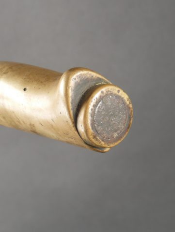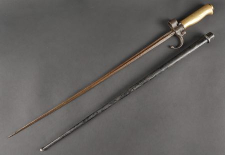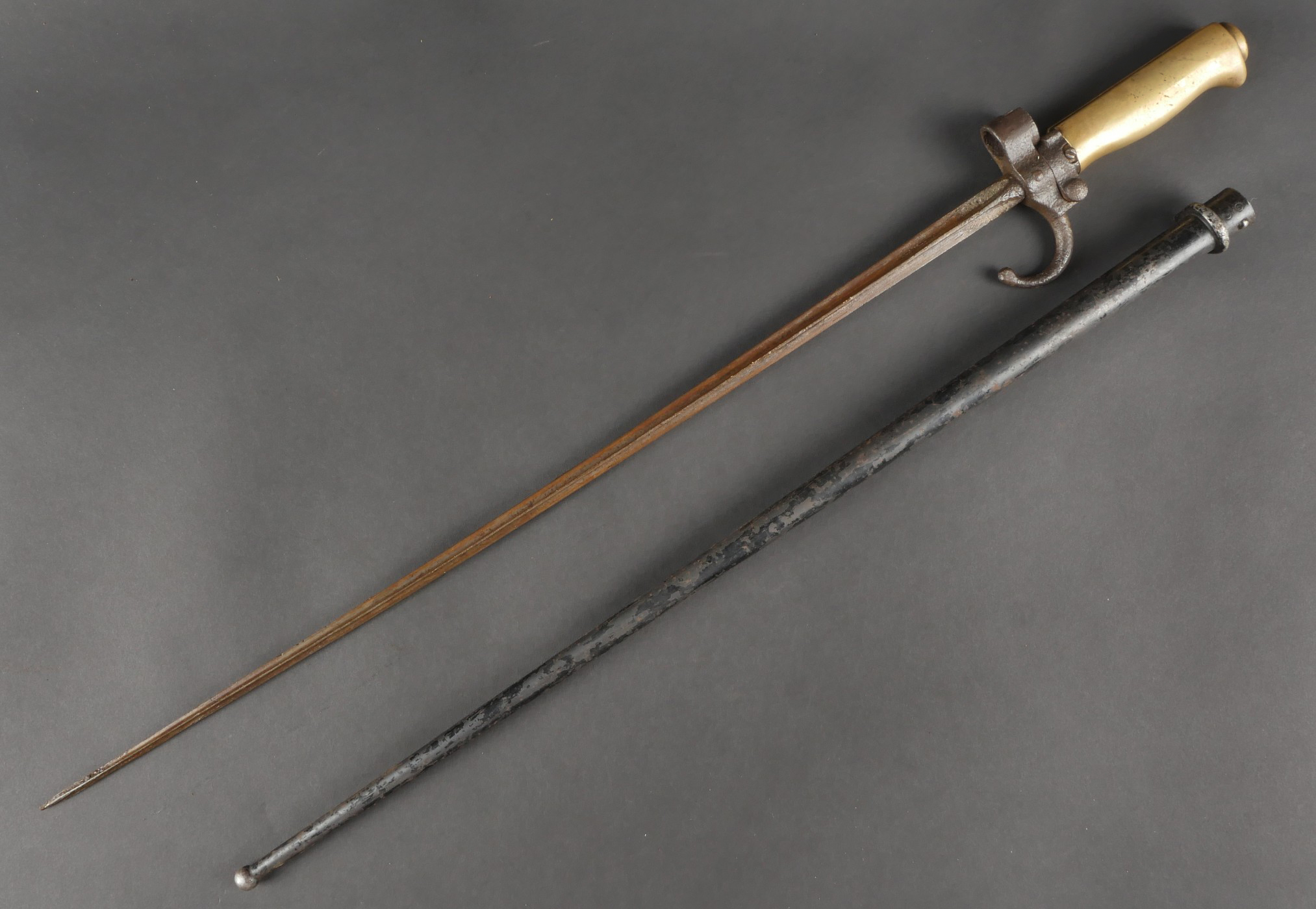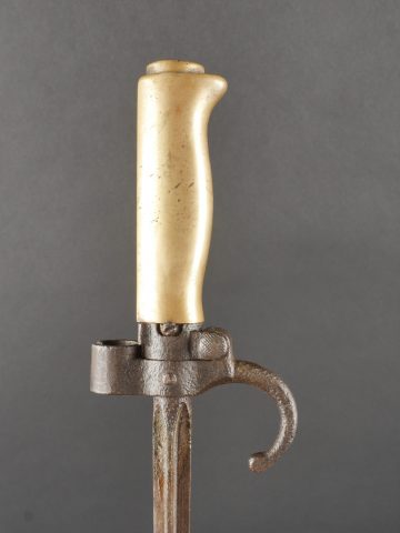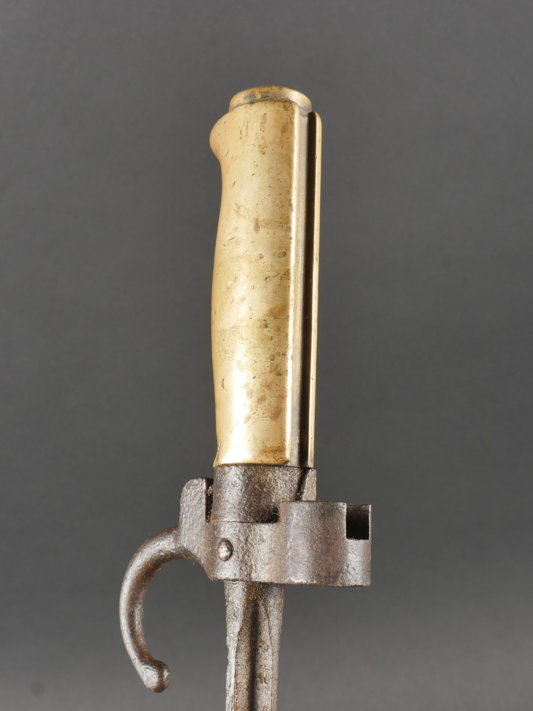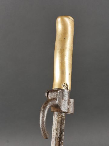 Détails de la vente >Epée-baïonnette française modèle 1886. Lame cruciforme, très légèrement raccourcie de quelques millimètres, poignée moulée en laiton, quillon. Bouton poussoir bloqué. Poignée en... en savoir plus