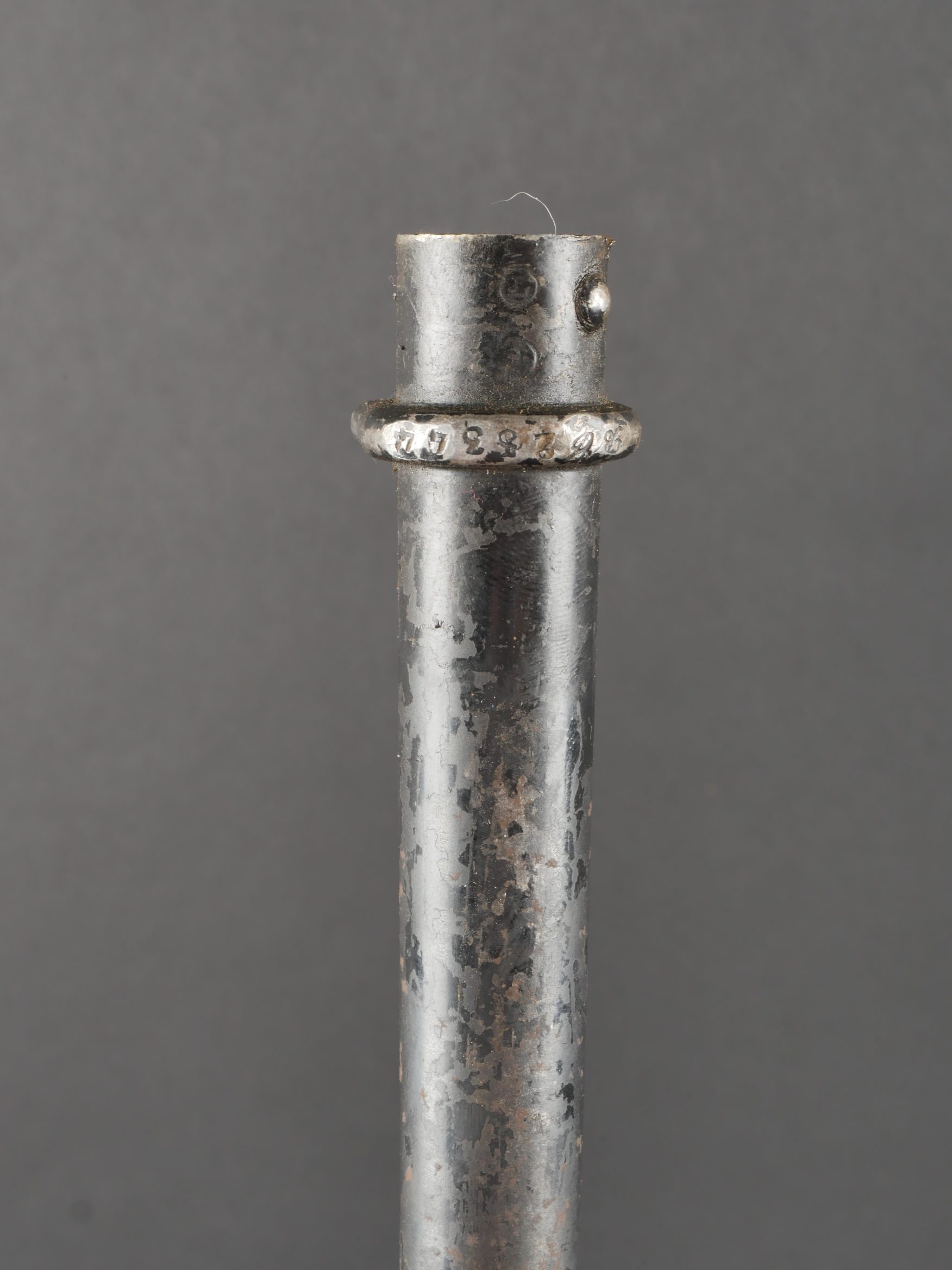 Epée-baïonnette française modèle 1886. Lame cruciforme, très légèrement raccourcie de quelques millimètres, poignée moulée en laiton, quillon. Bouton poussoir bloqué. Poignée en... en savoir plus
