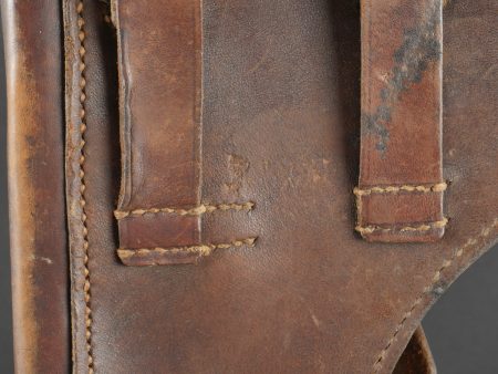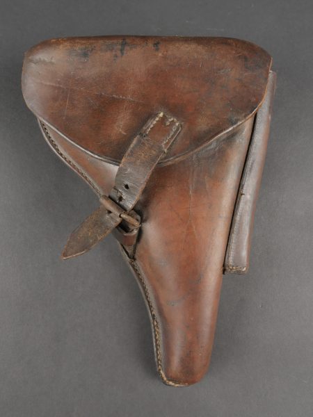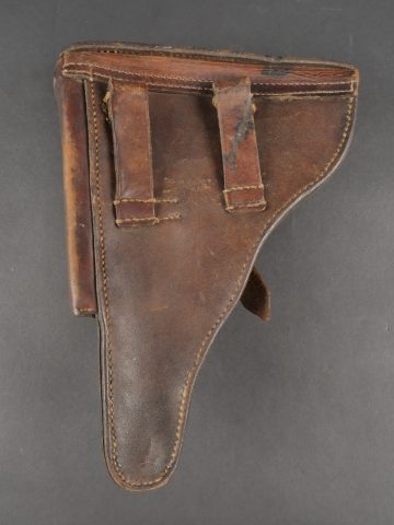 Etui de Luger P08 daté 1912. En cuir marron, complet de sa sangle de fermeture, de sa sangle d’extraction, de son compartiment interne et de ses passants de ceinturon. Marquage fabricant... en savoir plus