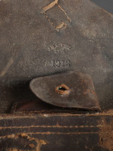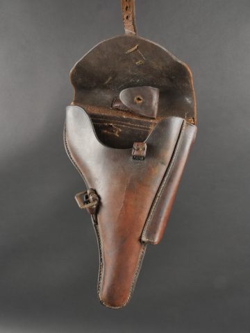 Détails de la vente >Etui de Luger P08 daté 1912. En cuir marron, complet de sa sangle de fermeture, de sa sangle d’extraction, de son compartiment interne et de ses passants de ceinturon. Marquage fabricant... en savoir plus