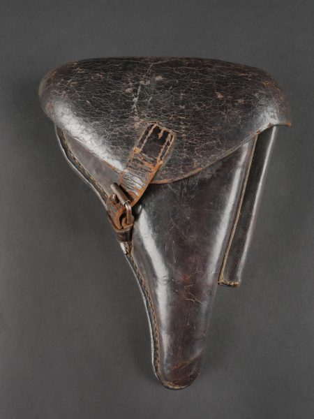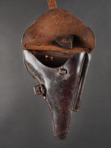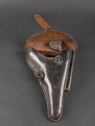 Etui de Luger P08 régimenté. En cuir de teinte chocolat foncé, complet de sa sangle de fermeture, de sa sangle d’extraction, de son compartiment interne et de ses passants de ceinturon.... en savoir plus