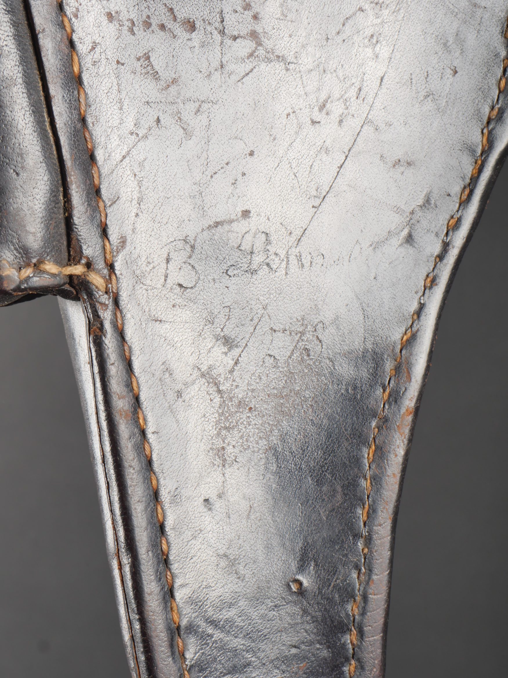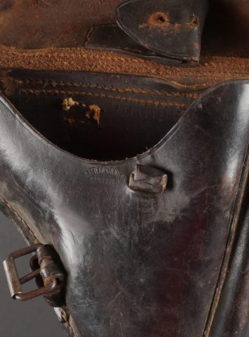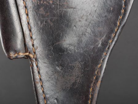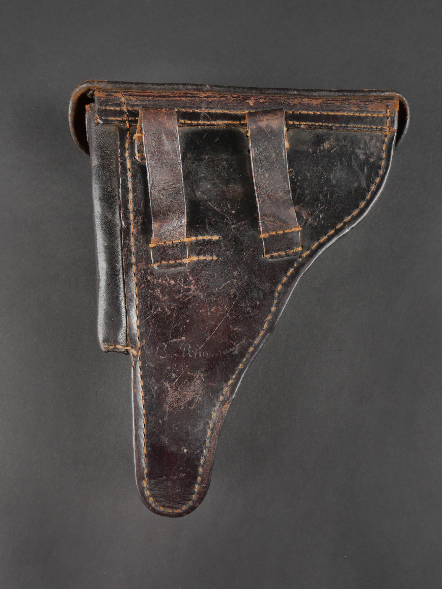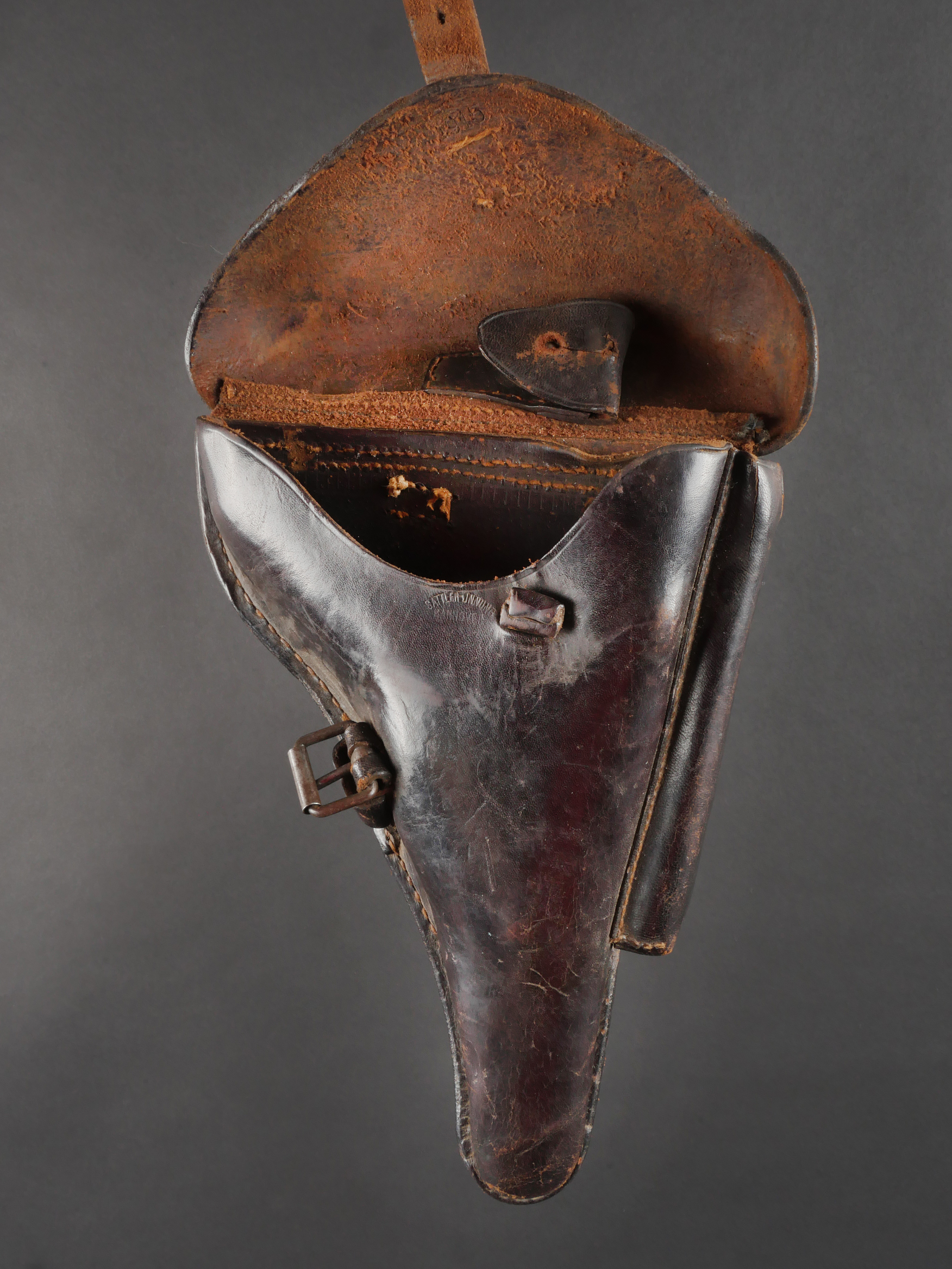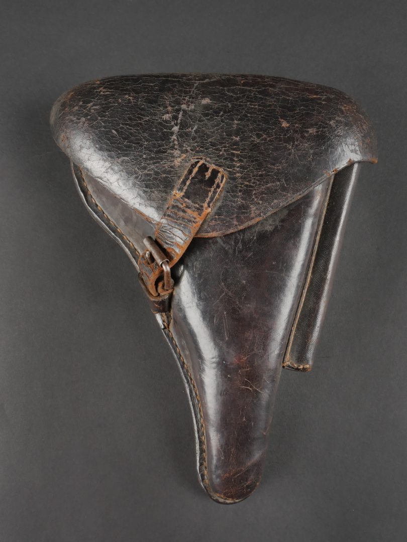 Etui de Luger P08 régimenté. En cuir de teinte chocolat foncé, complet de sa sangle de fermeture, de sa sangle d’extraction, de son compartiment interne et de ses passants de ceinturon. Marquage fabricant Sattler Innüng Hannover. Au dos, gravés, un nom à déchiffrer et marquage d’unité sauf erreur 2/273 pour 2e compagnie du RJR 273. Usure d’usage, patine. Regimental Luger P08 Holster Dark chocolate-brown leather, complete with closing strap, pull strap, internal compartment, and belt loops. Maker marked “Sattler Innüng, Hannover.” Reverse bears engraved name and possible unit marking “2/273,” for 2nd Company, Reserve Infantry Regiment 273. Signs of use, patina.