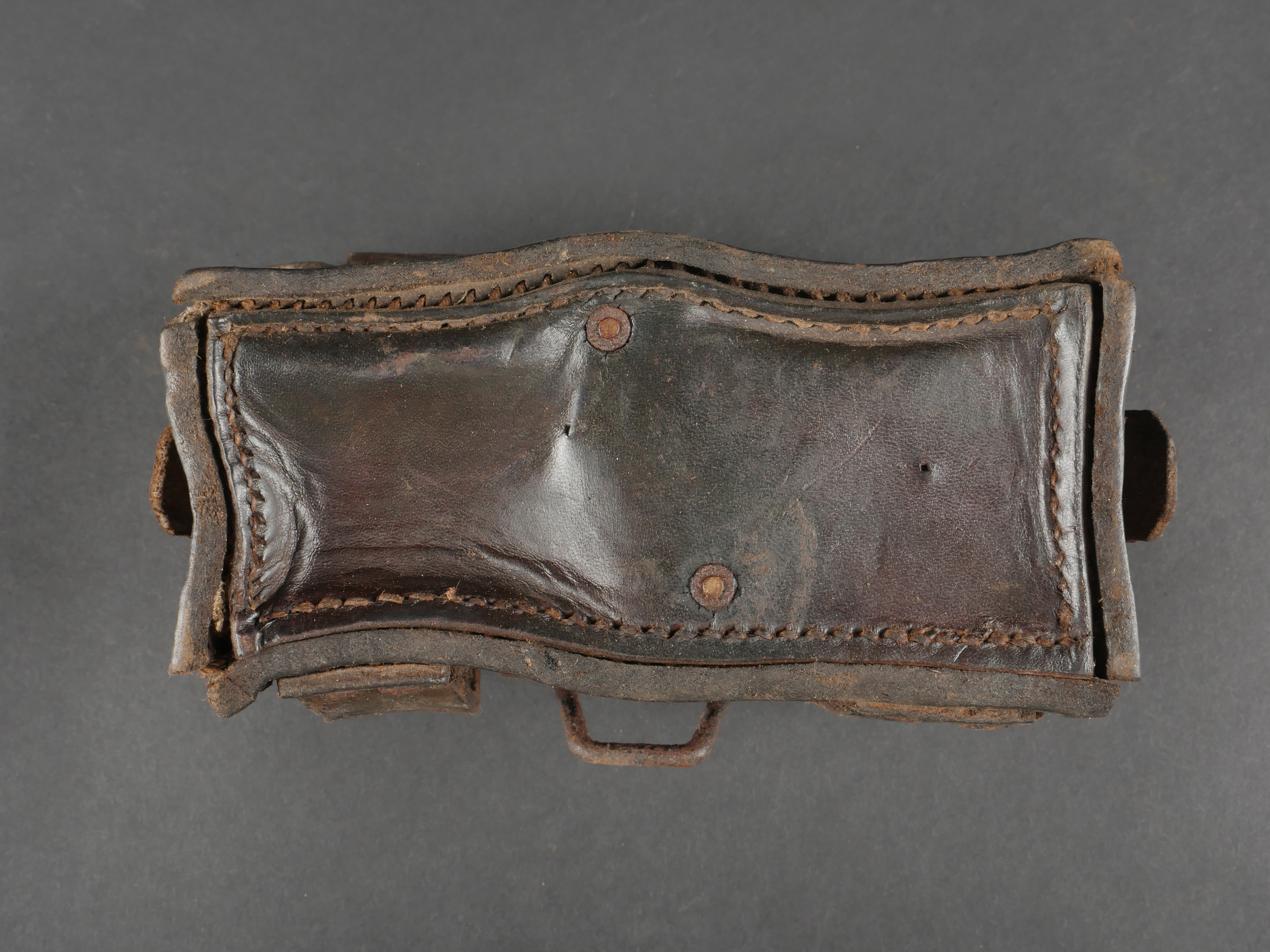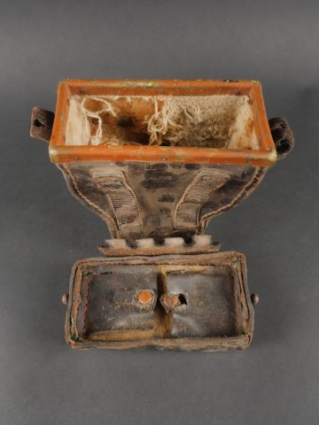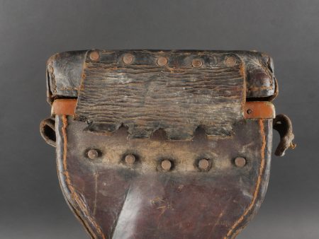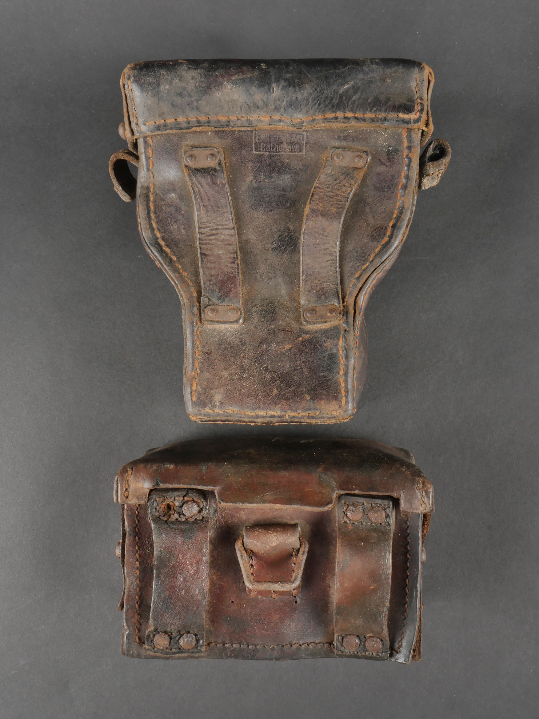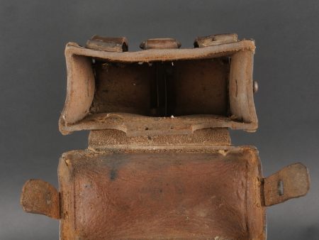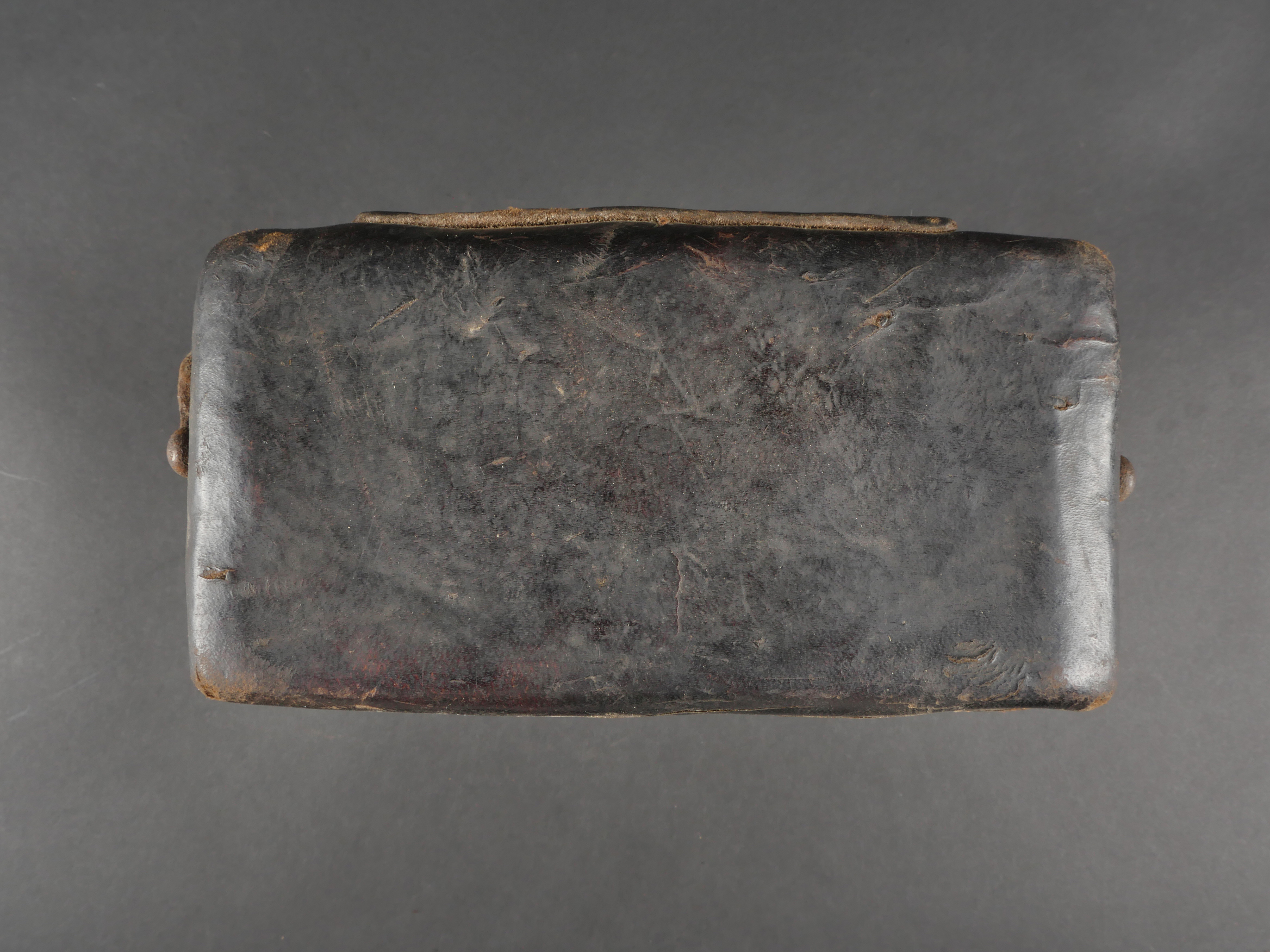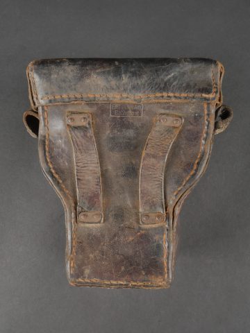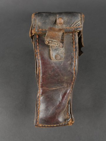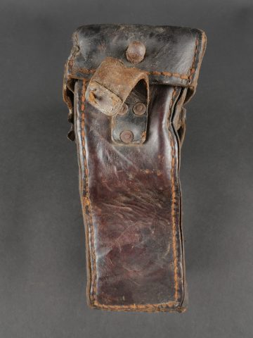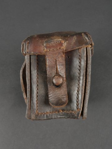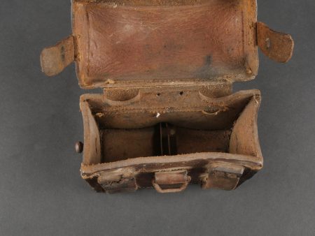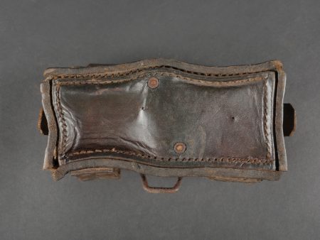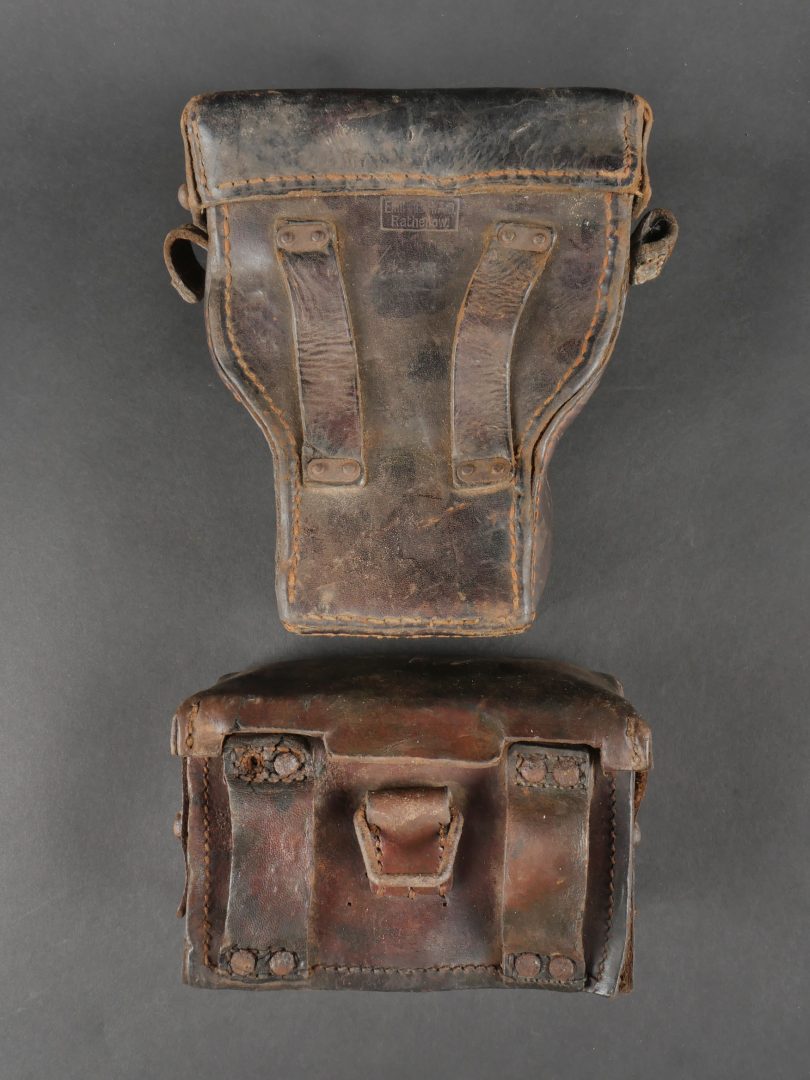 Etui de lunette de visée ZF12 pour mitrailleuse allemande MG08 et cartouchière ersatz 1914. Etui cuir destiné à recevoir la lunette ZF12 de MG08. Fabricant Emil Busch A.G. Rathenow. Pattes de fermetures et de ceinturon présentes, entières. Le couvercle est désolidarisé de la boîte, qui est légèrement déformée. Logements internes pour oculaires de rechange, vides. Une cartouchière ersatz en cuir. Pattes de fermetures entières. Pattes de ceinturon présentes. Rivets et dé de suspension oxydés. Usure, patine. Etat moyen. Case for ZF12 Optical Sight for MG08 with Ersatz Ammunition Pouch 1914 Leather case for ZF12 scope, maker “Emil Busch A.G. Rathenow.” Closure straps and belt loops intact. Lid detached and slightly deformed. Internal compartments for spare lenses, empty. Includes leather ersatz cartridge pouch with intact closure straps and loops, rivets oxidized. Worn condition, patina.