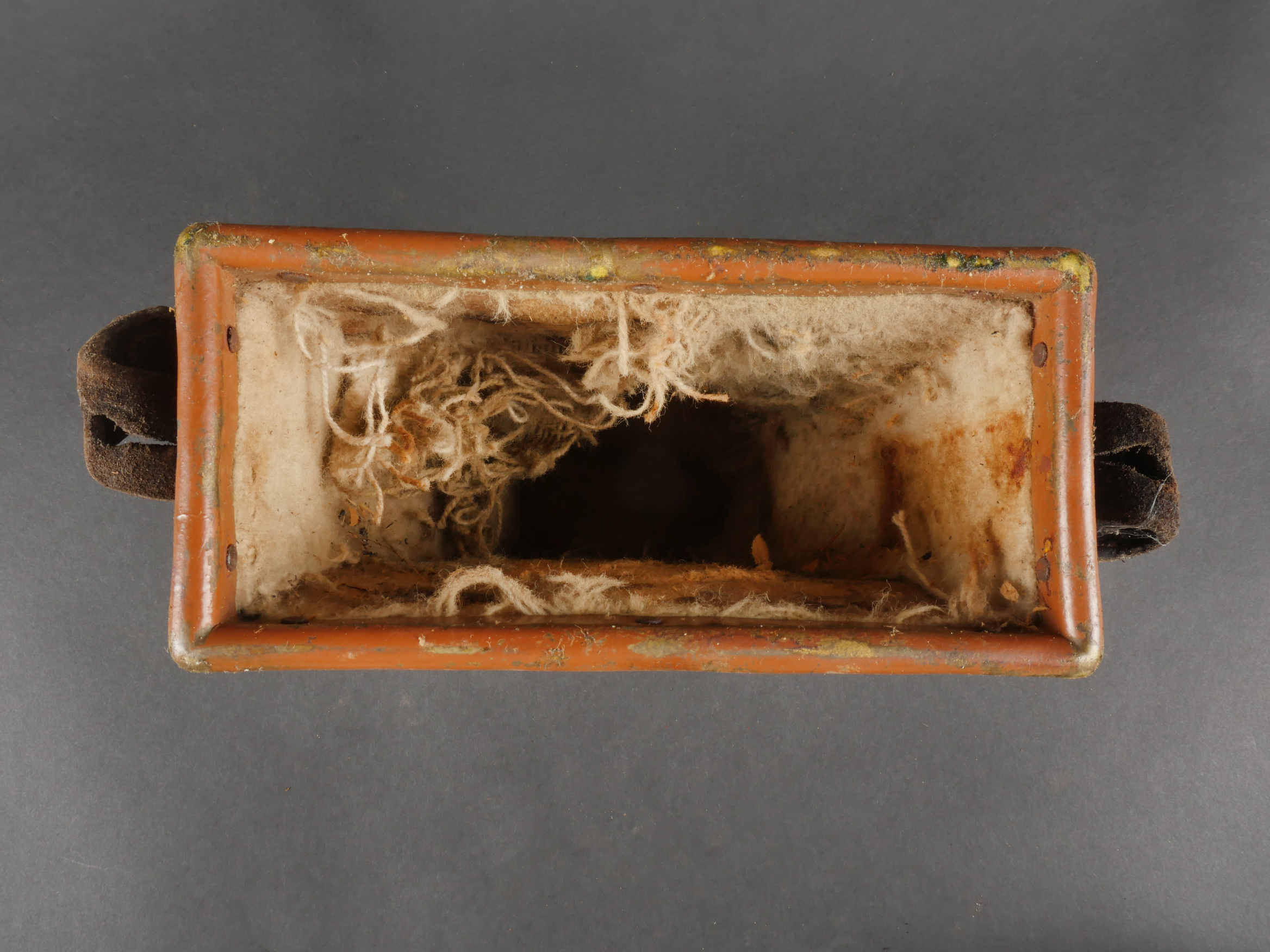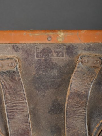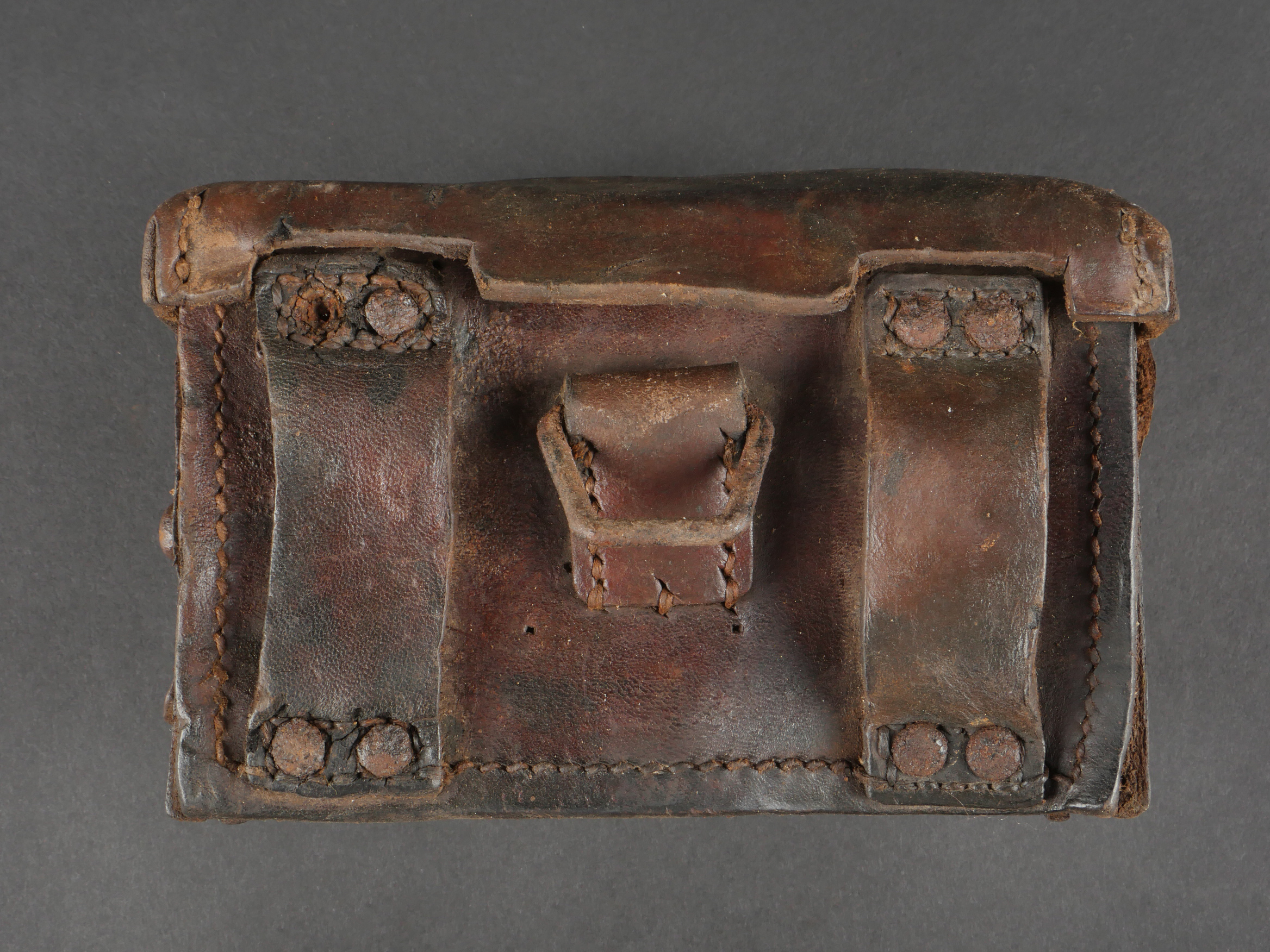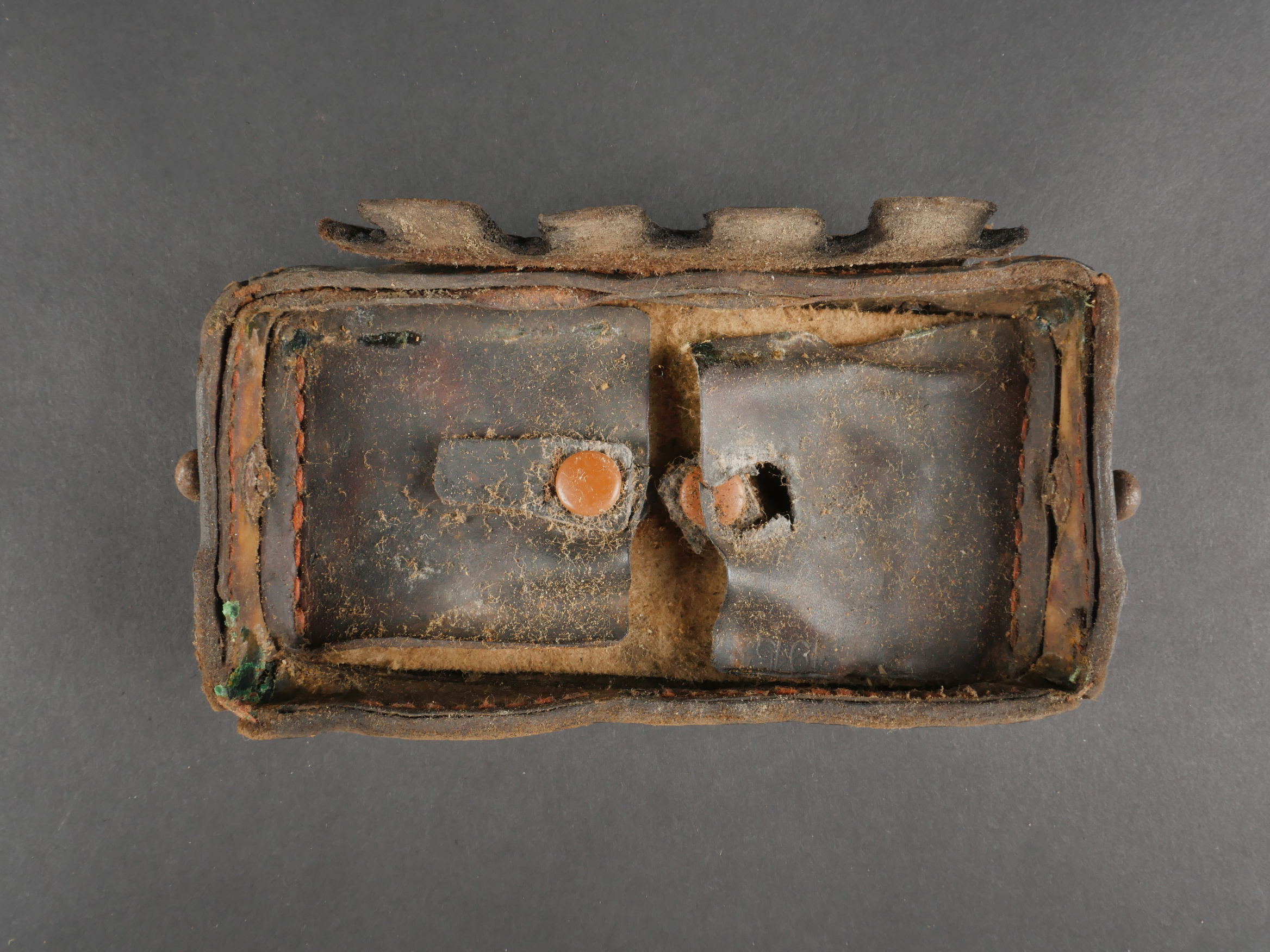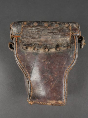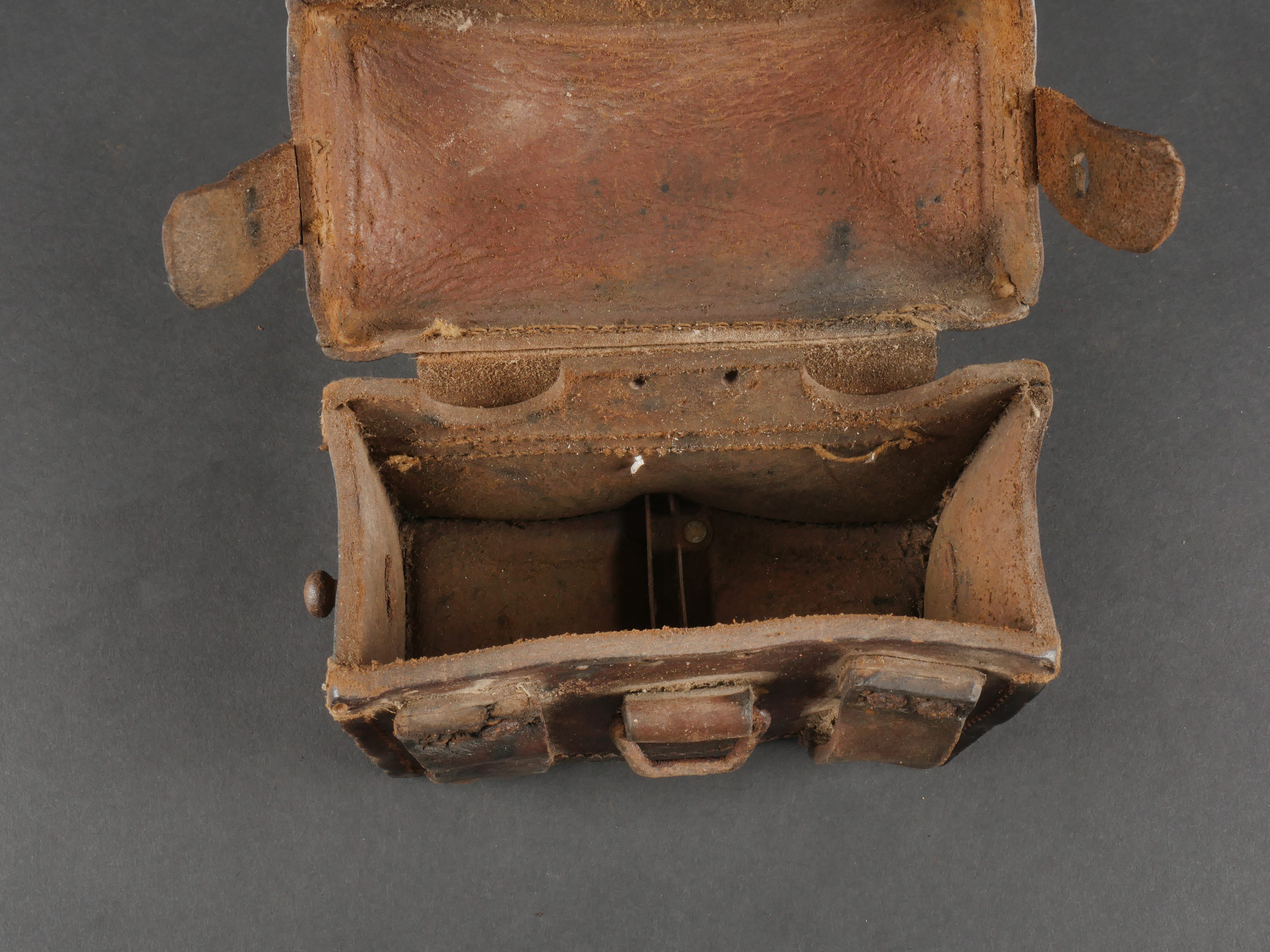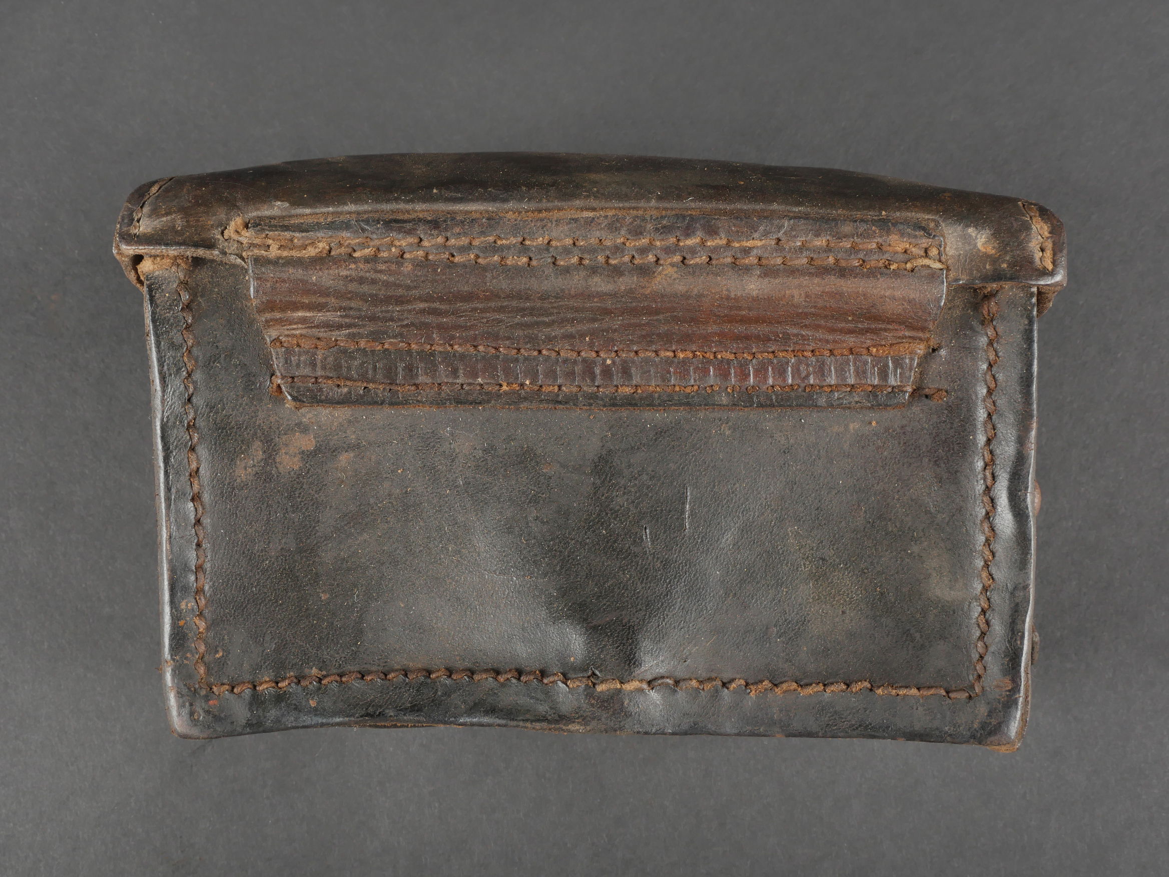 Etui de lunette de visée ZF12 pour mitrailleuse allemande MG08 et cartouchière ersatz 1914. Etui cuir destiné à recevoir la lunette ZF12 de MG08. Fabricant Emil Busch A.G. Rathenow. Pattes de fermetures et de ceinturon présentes, entières. Le couvercle est désolidarisé de la boîte, qui est légèrement déformée. Logements internes pour oculaires de rechange, vides. Une cartouchière ersatz en cuir. Pattes de fermetures entières. Pattes de ceinturon présentes. Rivets et dé de suspension oxydés. Usure, patine. Etat moyen. Case for ZF12 Optical Sight for MG08 with Ersatz Ammunition Pouch 1914 Leather case for ZF12 scope, maker “Emil Busch A.G. Rathenow.” Closure straps and belt loops intact. Lid detached and slightly deformed. Internal compartments for spare lenses, empty. Includes leather ersatz cartridge pouch with intact closure straps and loops, rivets oxidized. Worn condition, patina.