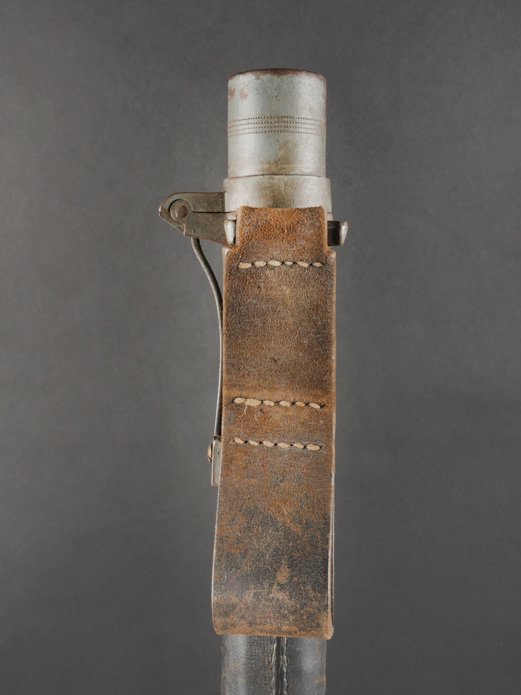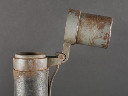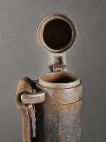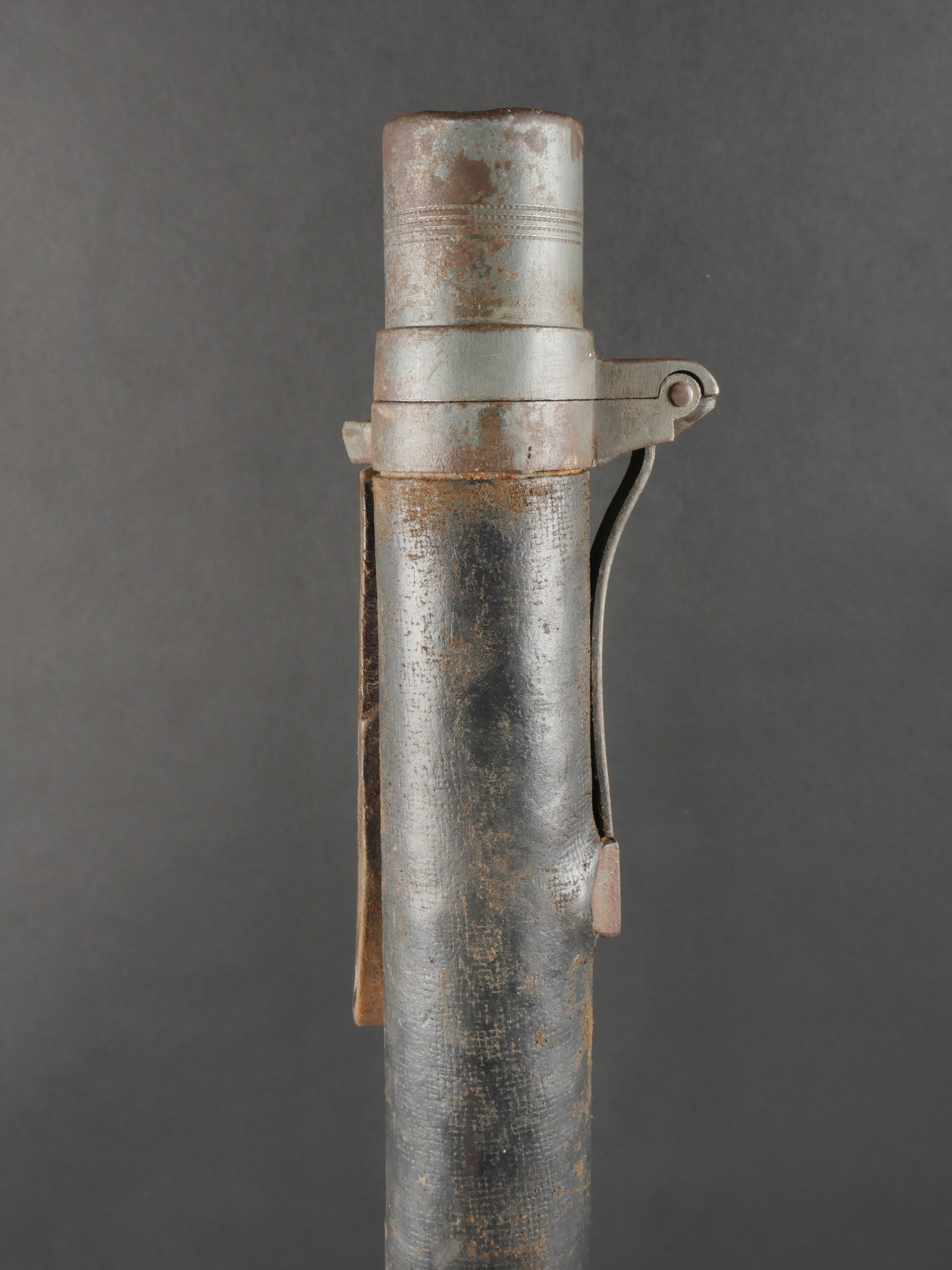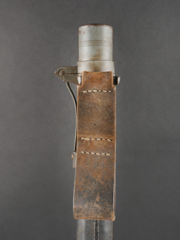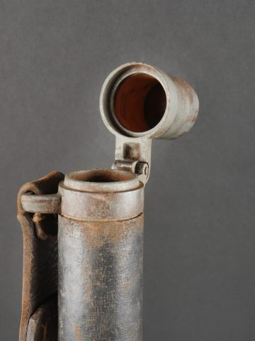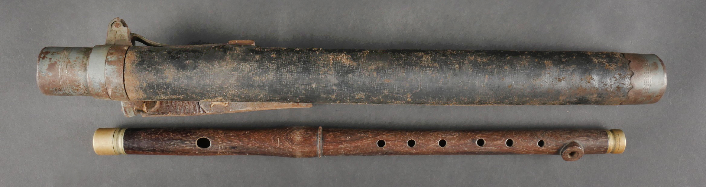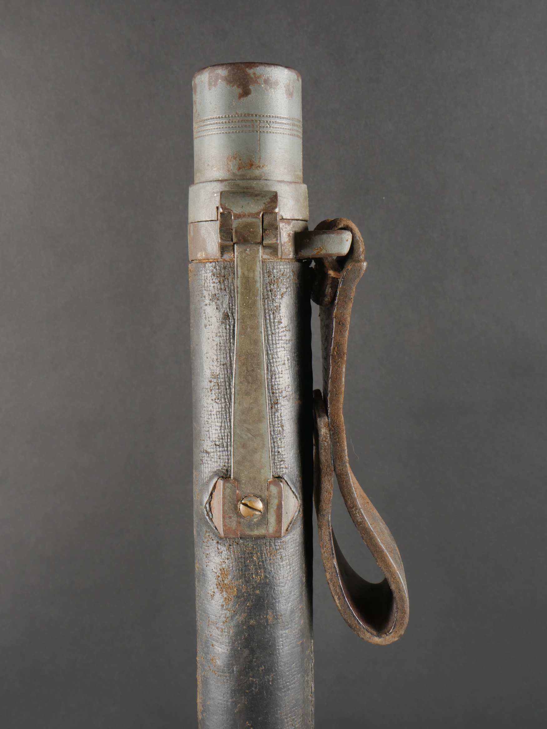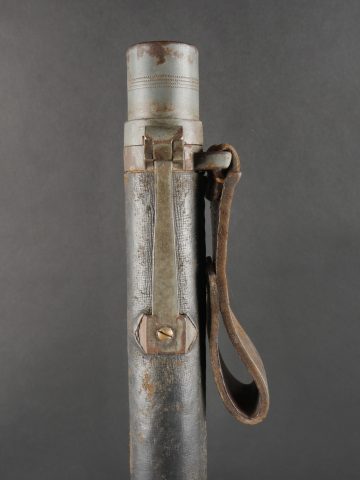 Fifre allemand dans son étui M1915. Fifre en bois noirci avec ses embouts en maillechort. Dans son bel étui gainé de cuir, garnitures en fer peint feldgrau, avec sa bouterole. Patte de ceinturon présente avec marquage fabricant et datée 1916. Usure d’usage, patine. German Fife with M1915 Case Blackened wooden fife with nickel-silver mounts, housed in its fine leather-covered case with field-grey painted iron fittings and tip. Belt loop present, maker-marked and dated 1916. Signs of use and patina.
