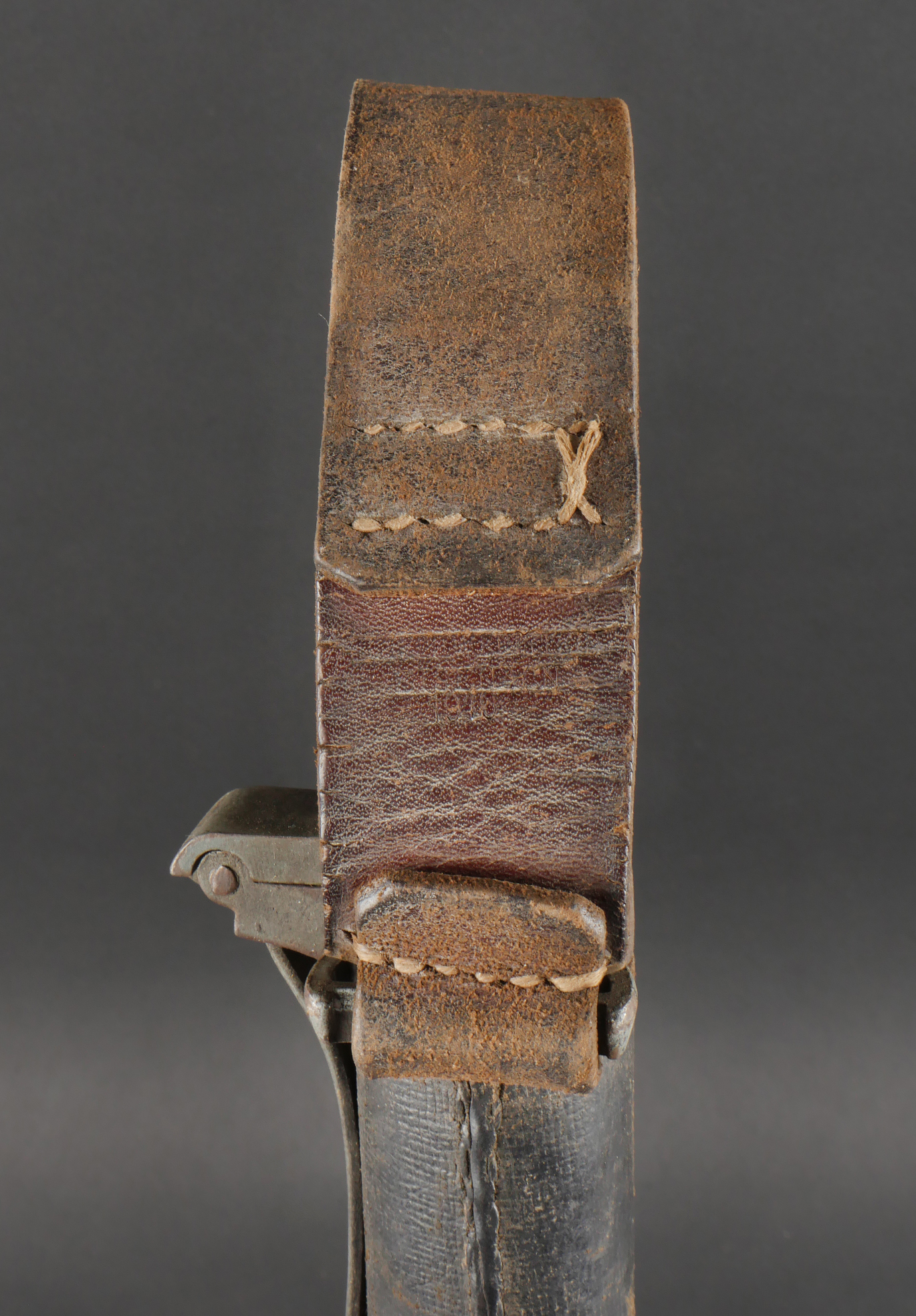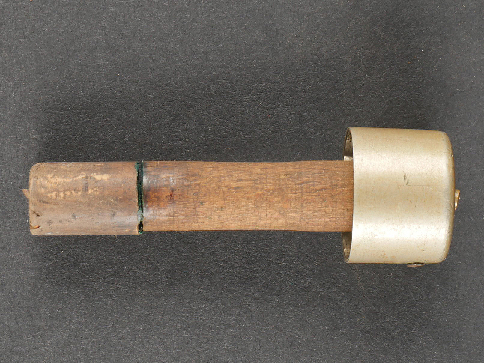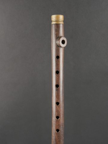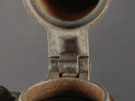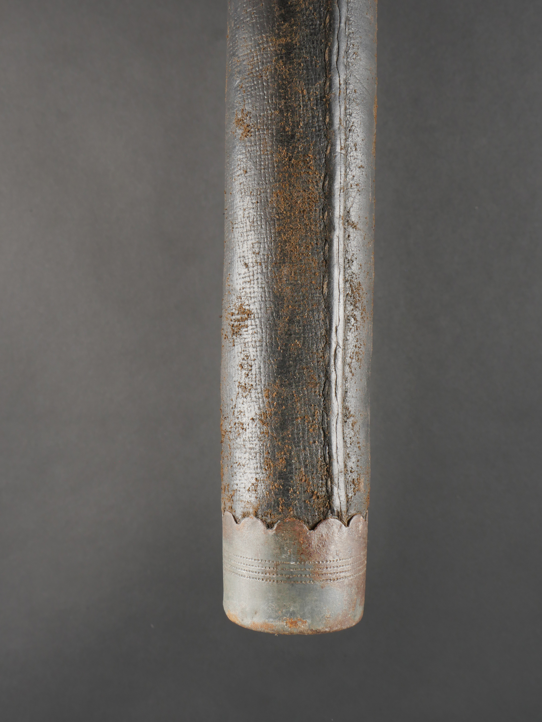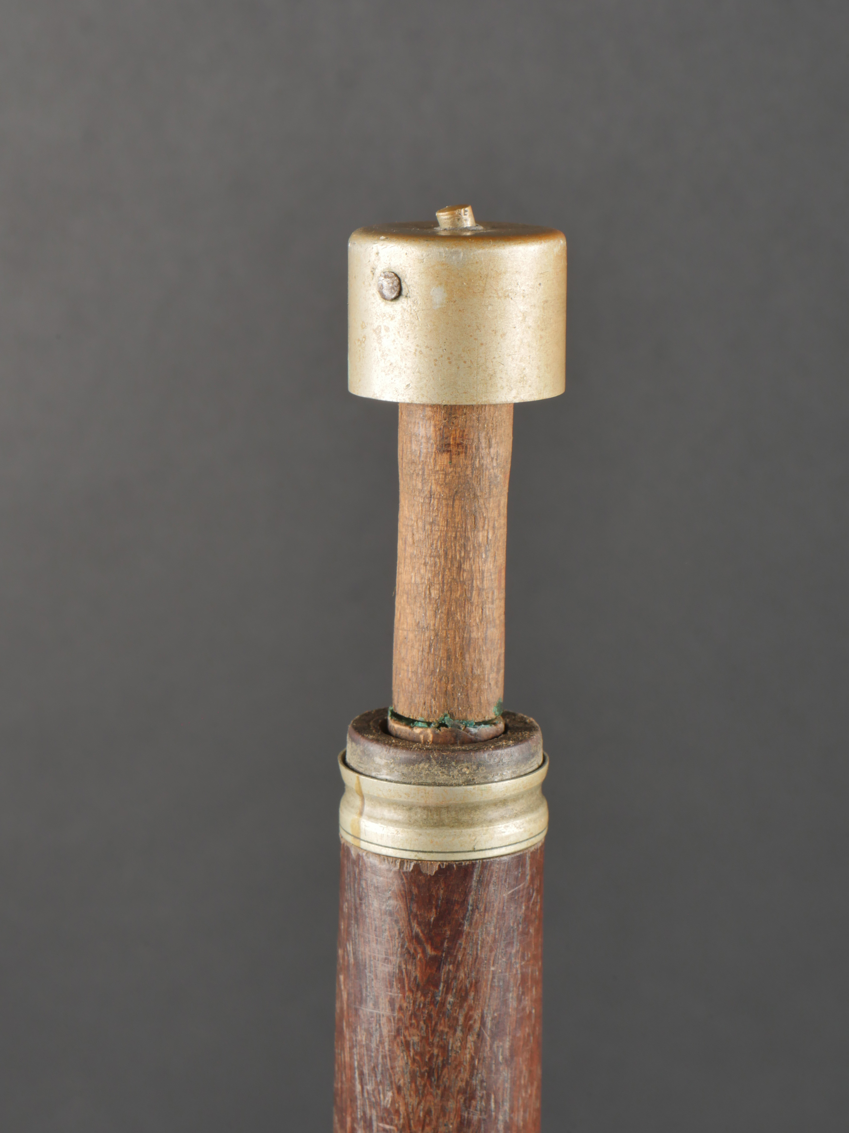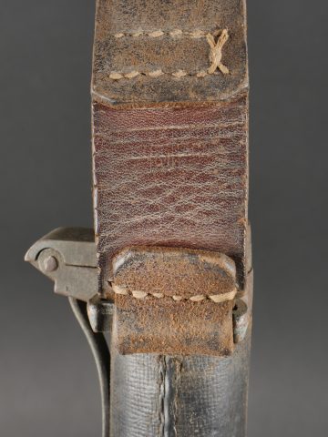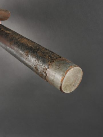 Fifre allemand dans son étui M1915. Fifre en bois noirci avec ses embouts en maillechort. Dans son bel étui gainé de cuir, garnitures en fer peint feldgrau, avec sa bouterole. Patte de ceinturon présente avec marquage fabricant et datée 1916. Usure d’usage, patine. German Fife with M1915 Case Blackened wooden fife with nickel-silver mounts, housed in its fine leather-covered case with field-grey painted iron fittings and tip. Belt loop present, maker-marked and dated 1916. Signs of use and patina.