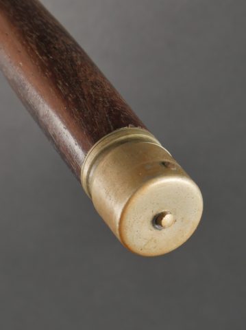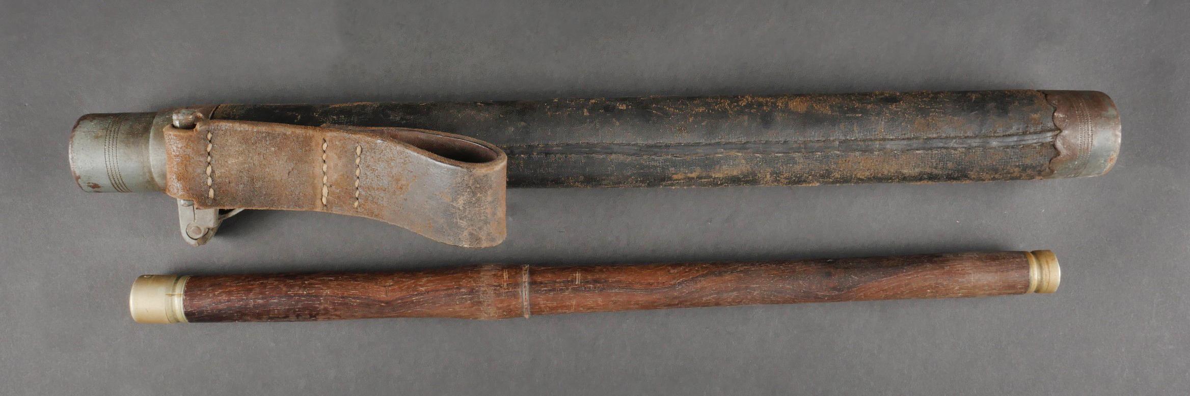 Détails de la vente >Fifre allemand dans son étui M1915. Fifre en bois noirci avec ses embouts en maillechort. Dans son bel étui gainé de cuir, garnitures en fer peint feldgrau, avec sa bouterole. Patte de... en savoir plus
