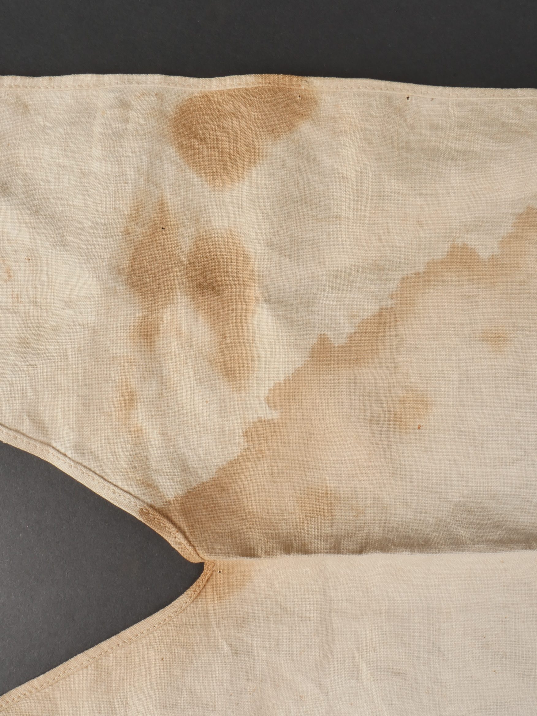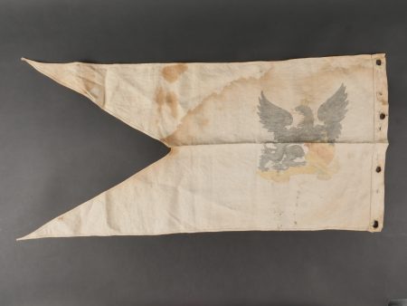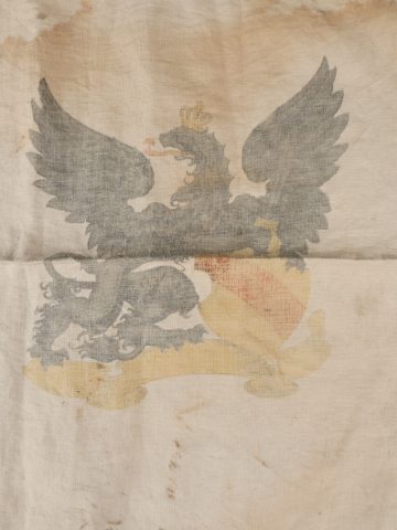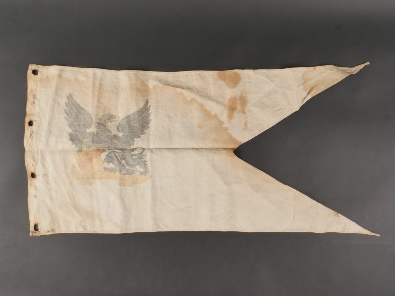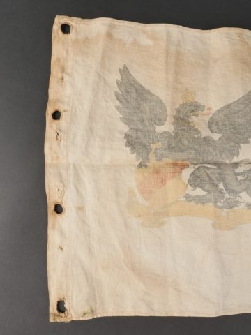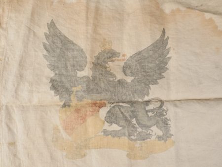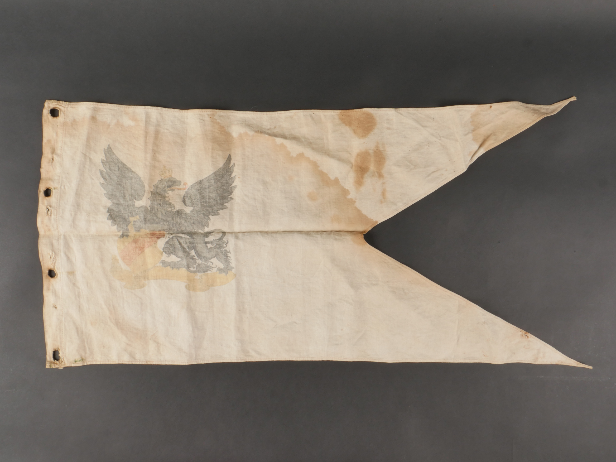 Flamme de lance de sous-officier badois. En lin imprimé du griffon badois. La bande de renfort ou se trouve les 4 œillets de fixation à la lance a été percée de petits trous additionnels, probablement pour une suspension décorative. Tachée, insolée. Lance Pennant of a Baden Non-Commissioned OfficerLinen pennant printed with the Baden griffin. The reinforced edge bearing four mounting eyelets has additional small holes, likely for decorative suspension. Stained and slightly faded.