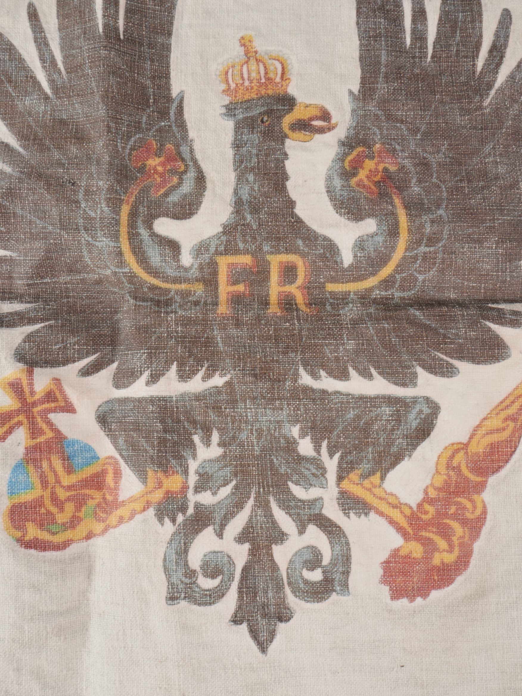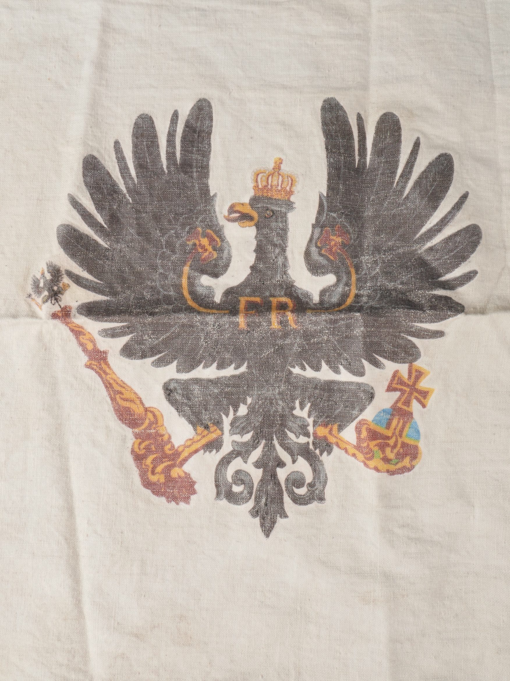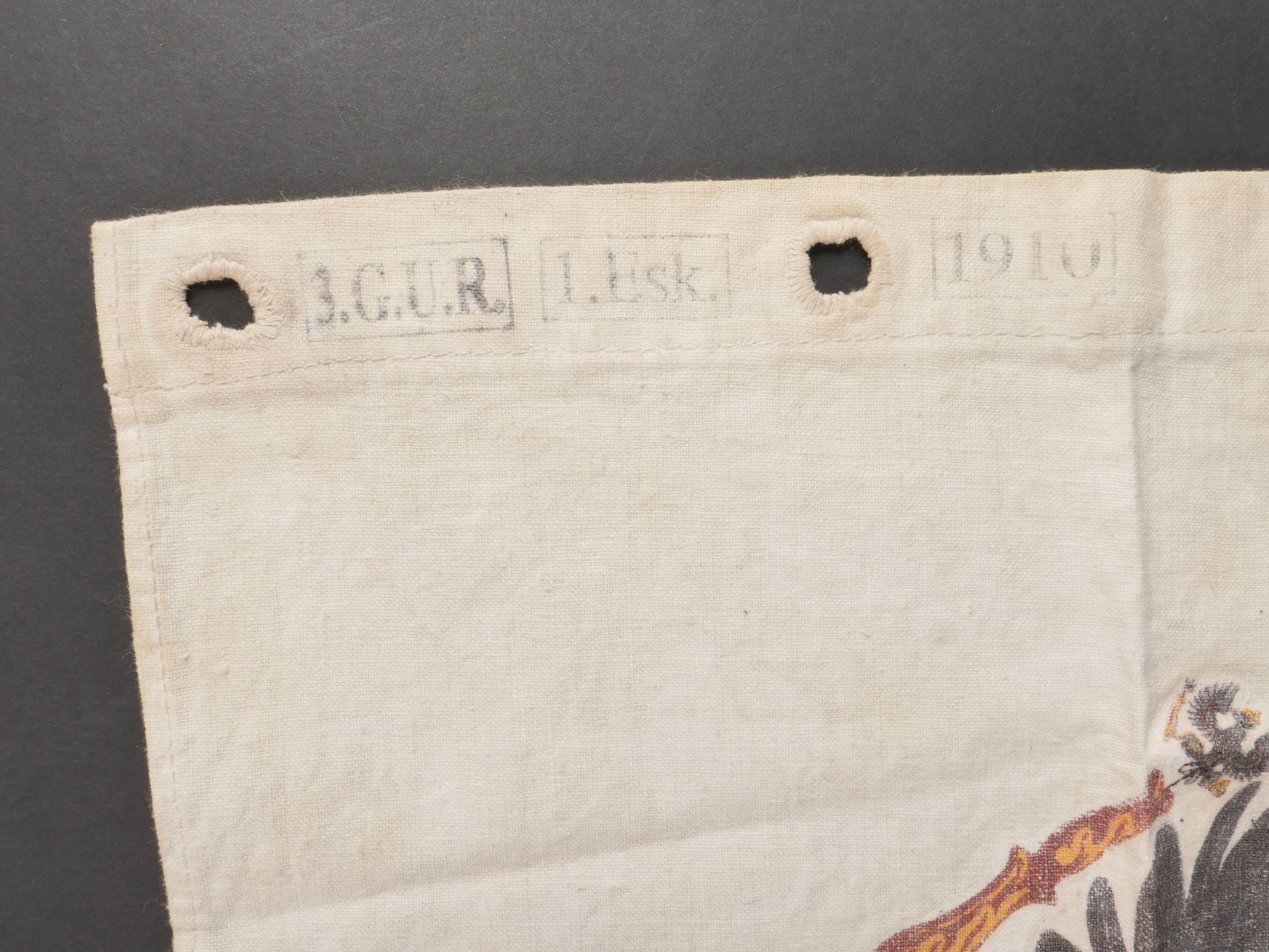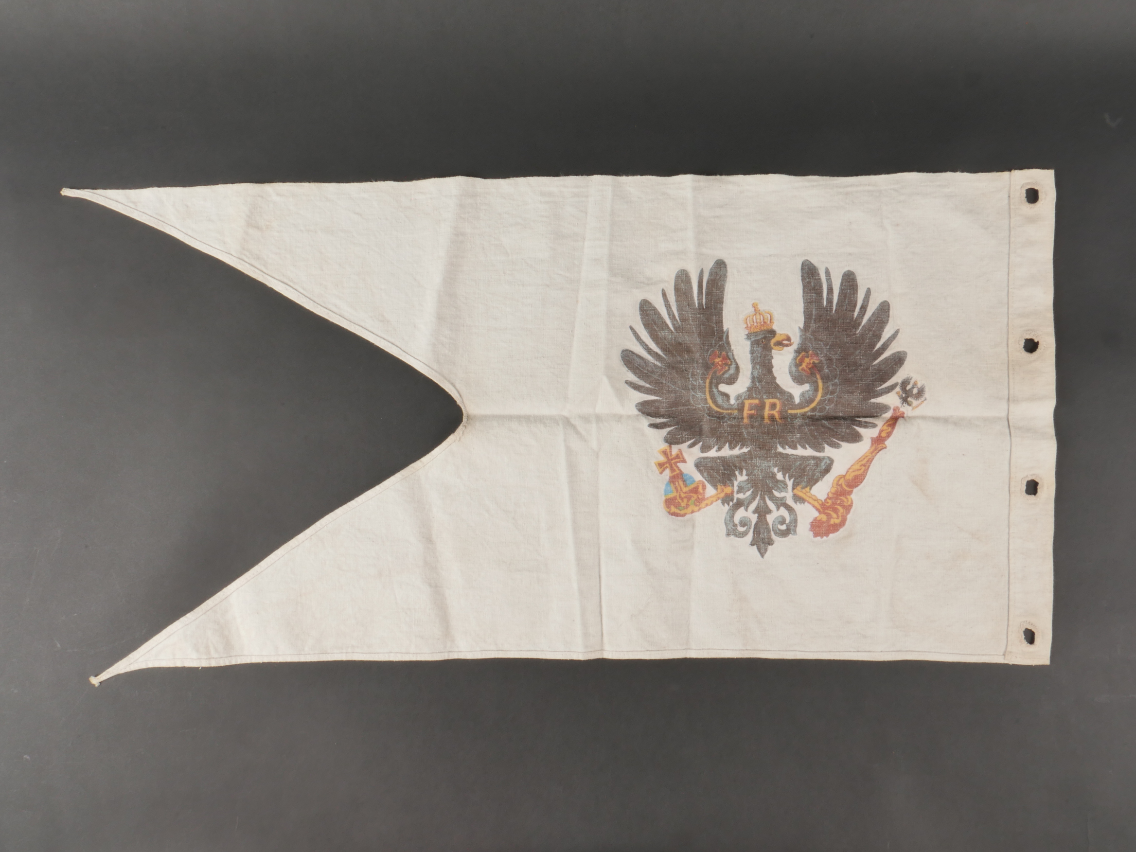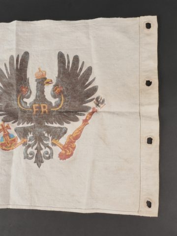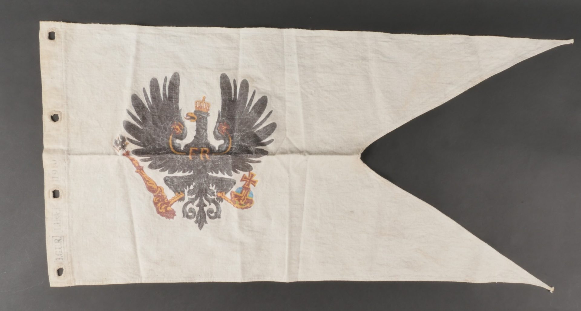 Flamme de lance d’un sous-officier du Garde Ulanen Regiment Nr 3. En lin imprimé de l’aigle allemand de chaque côté. Tampons à l’encre 3.G.U.R. pour le 3e régiment de uhlans de la Garde, 1 Eskadron et date 1910. En bon état. Lance Pennant of a Non-Commissioned Officer, Garde-Ulanen-Regiment Nr.3Linen pennant printed with German eagles on both sides. Ink stamps “3.G.U.R.” for the 3rd Guard Uhlan Regiment, 1st Squadron, dated 1910. Good condition.