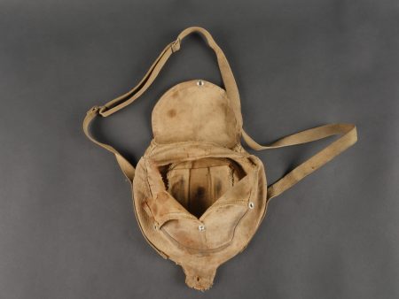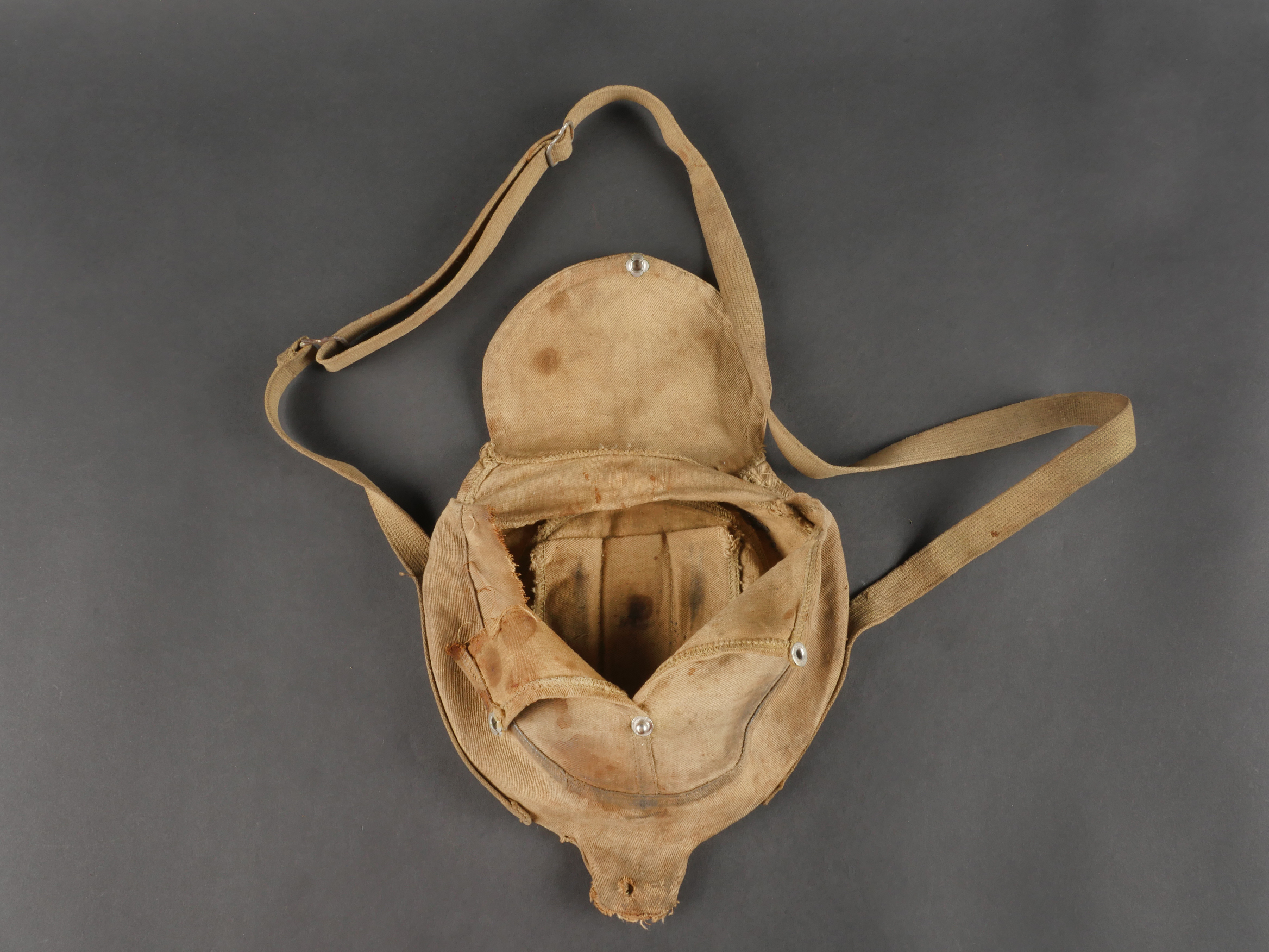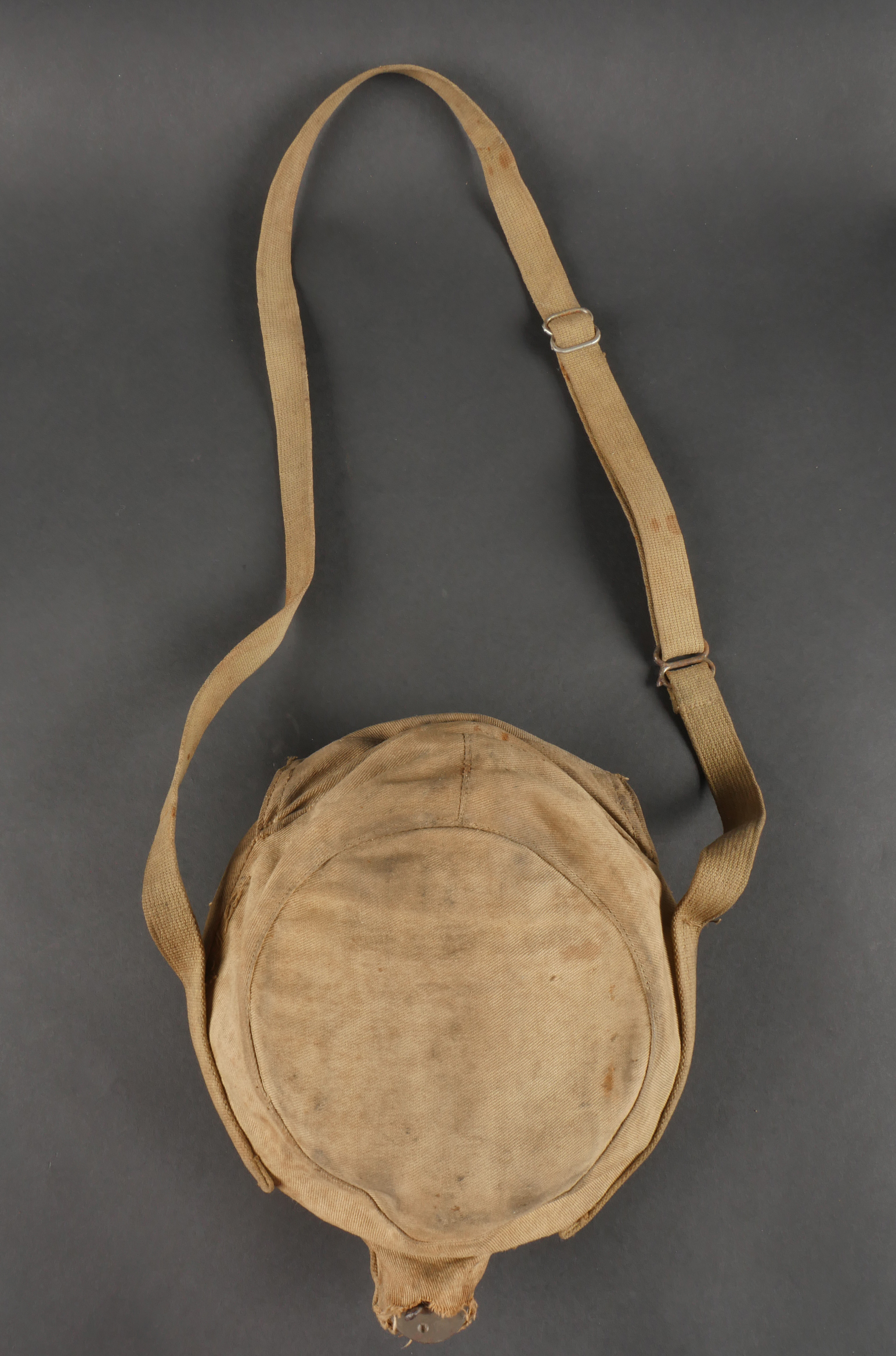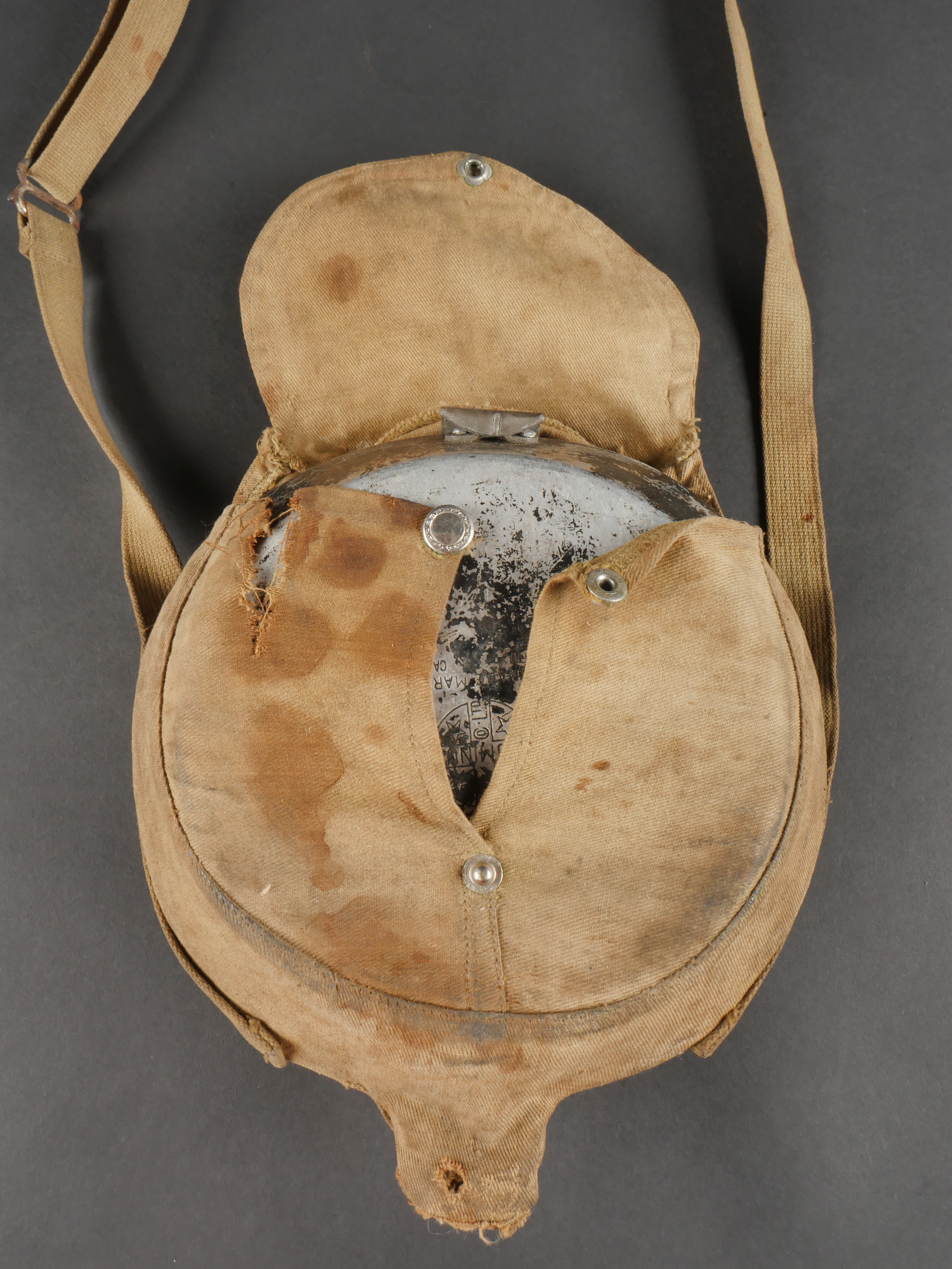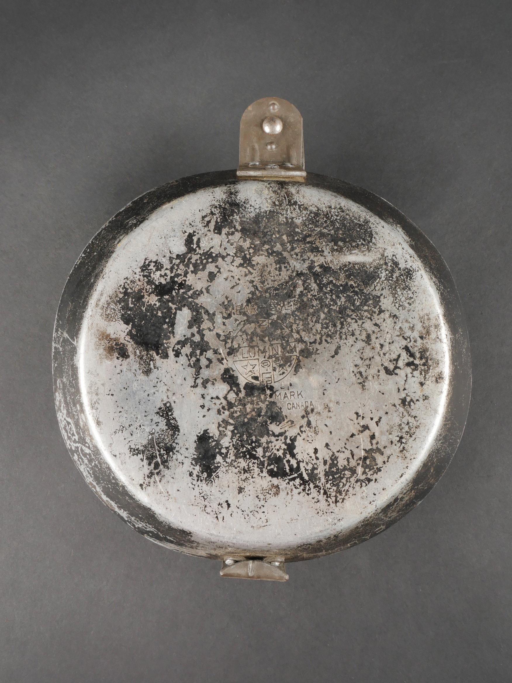 Gamelle américano-canadienne d’achat privé. Set de gamelle en aluminium de la marque Wear-Ever de N.A. Co Ltd. Ce type de gamelle a été utilisé chez les Scouts américains et Canadiens du début du XXe siècle et a donc pu se retrouver dans le paquetage d’un Sammy ou d’un soldat canadien. Composé d’une petite poêle, une assiette et une gamelle avec couvercle, les 4 pièces étant gravées du nom francophone CAULIER, l’ensemble maintenu par un élément faisant office de poignée. Le tout dans une housse en toile beige fermant par une pression, fonctionnelle et avec une sangle de portage en toile avec boucles en forme de 8. Usure, taches, déchirure à une extrémité. Un objet peu courant. American-Canadian Private Purchase Mess KitAluminum mess kit by Wear-Ever, N.A. Co Ltd. This type was used by early 20th-century American and Canadian Scouts and could have been found in the field gear of U.S. or Canadian soldiers. Consisting of a small frying pan, a plate and a covered dish, the four pieces engraved with the francophone name “CAULIER,” held together by a handle-shaped clip. Contained in a beige canvas pouch with functional snap closure and carrying strap with figure-8 buckles. Shows wear, stains, and a tear at one end. An uncommon private purchase item.