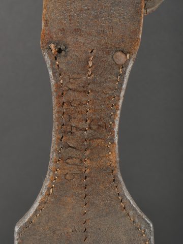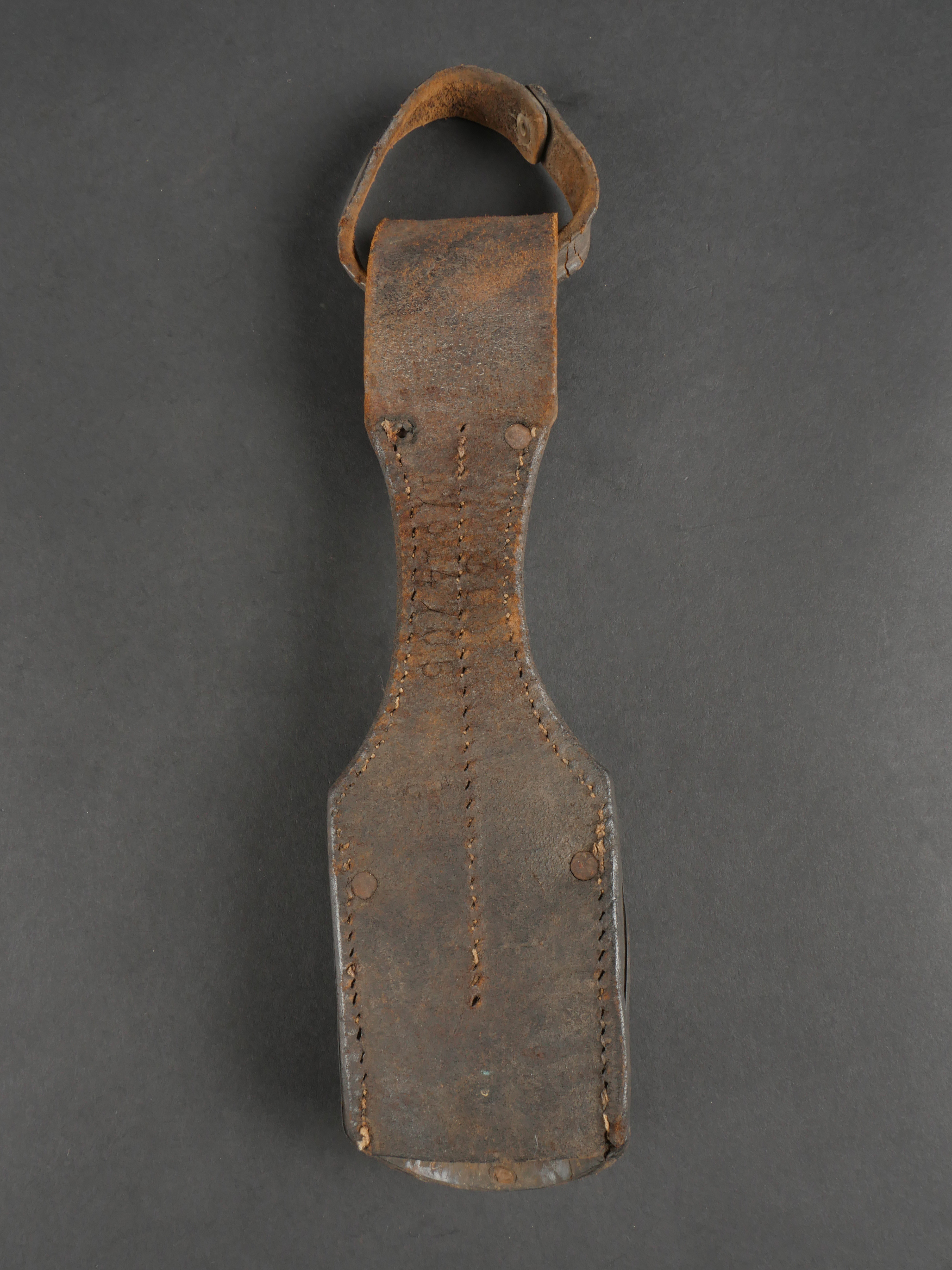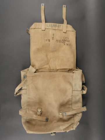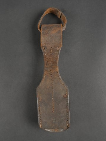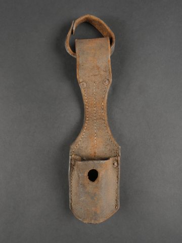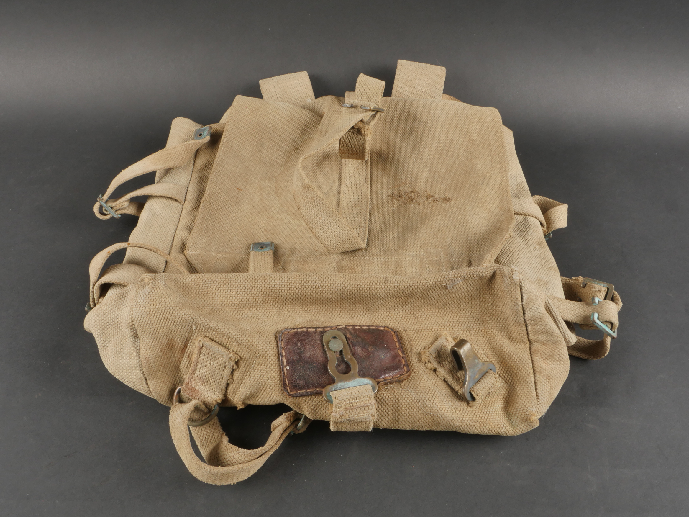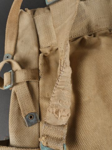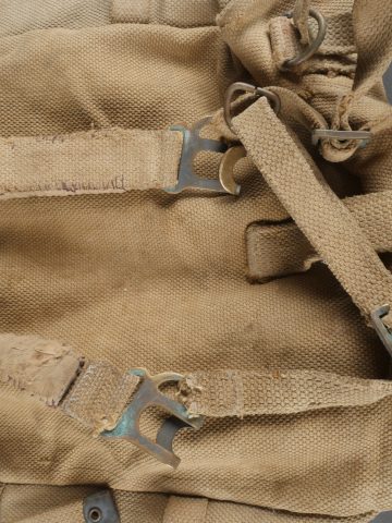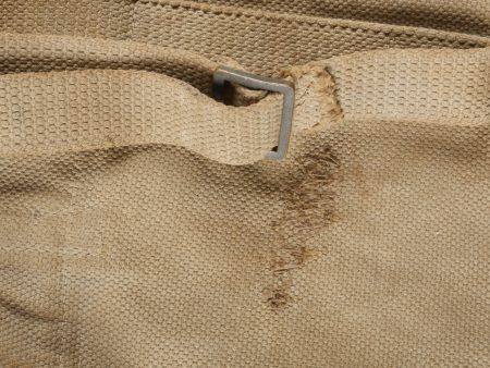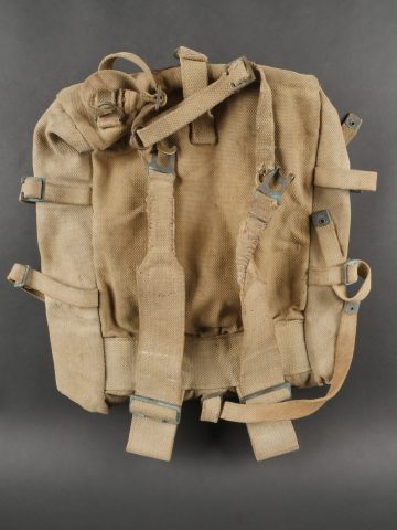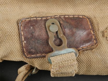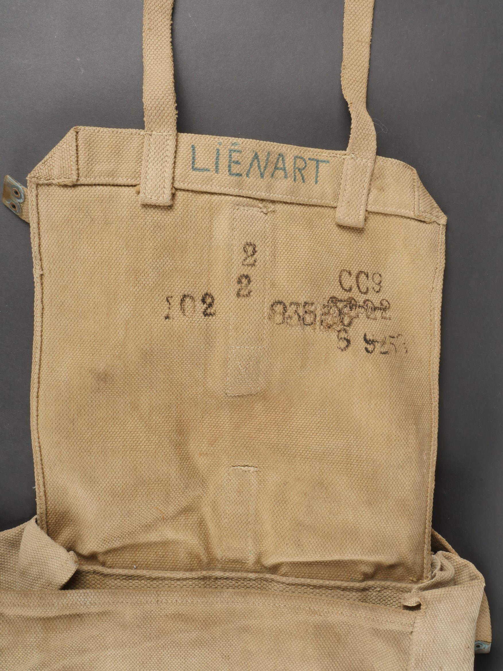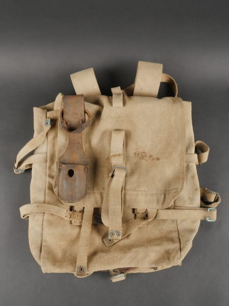 Havresac belge Mills. En forte toile coton filé web, complet de ses sangles et bouclerie, la sangle pour la gamelle a été réparée. Le soldat a ajouté des renforts matelassés sous les bretelles de suspension pour plus de confort. Sous le rabat plusieurs matricules avec codes d’unités dont CC pour 17e de Ligne puis 102 pour 2e de Ligne. Nom manuscrit Liénart. Un gousset porte baïonnette en cuir de fabrication allemande, réutilisé par l’armée belge avec ajout d’une sangle rivetée de maintien de la poignée et matricule belge frappé au dos. Usure d’usage. Belgian Mills Haversack with Bayonet FrogHeavy woven cotton haversack, complete with straps and buckles. The mess tin strap has been repaired. Padded reinforcements added by the soldier under the suspension straps for comfort. Under the flap, several service numbers and unit codes, “CC” for 17th Line Regiment and “102” for 2nd Line Regiment. Handwritten name “Liénart.” Bayonet frog in German leather reused by the Belgian Army, modified with a riveted retention strap and Belgian serial number stamped on the back. Worn condition.