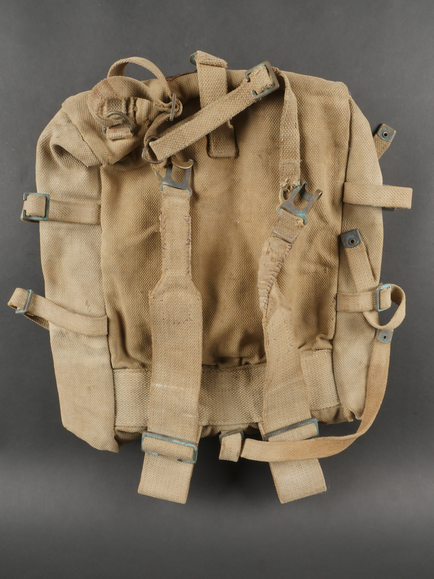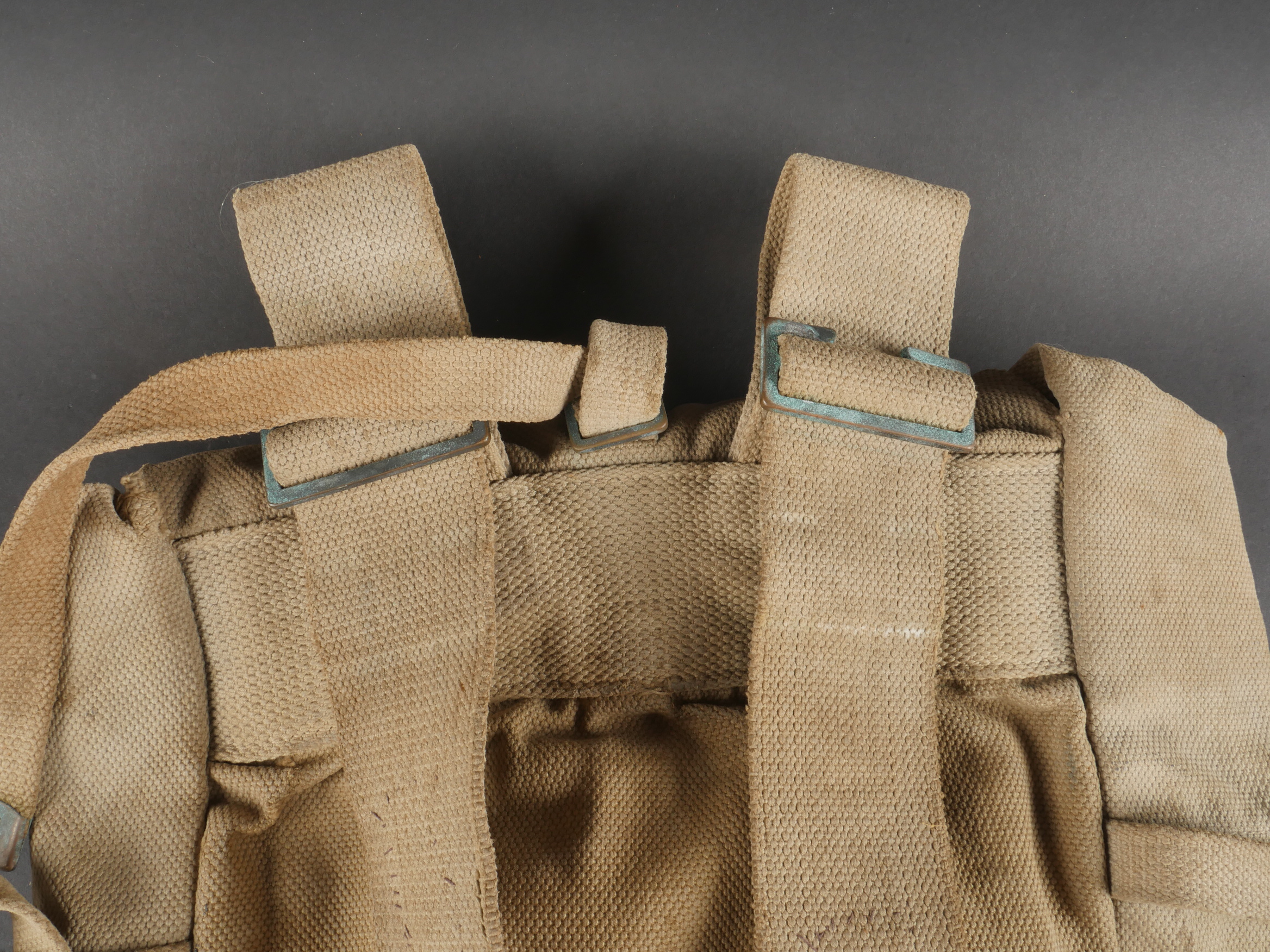 Détails de la vente >Havresac belge Mills. En forte toile coton filé web, complet de ses sangles et bouclerie, la sangle pour la gamelle a été réparée. Le soldat a ajouté des renforts matelassés sous les... en savoir plus