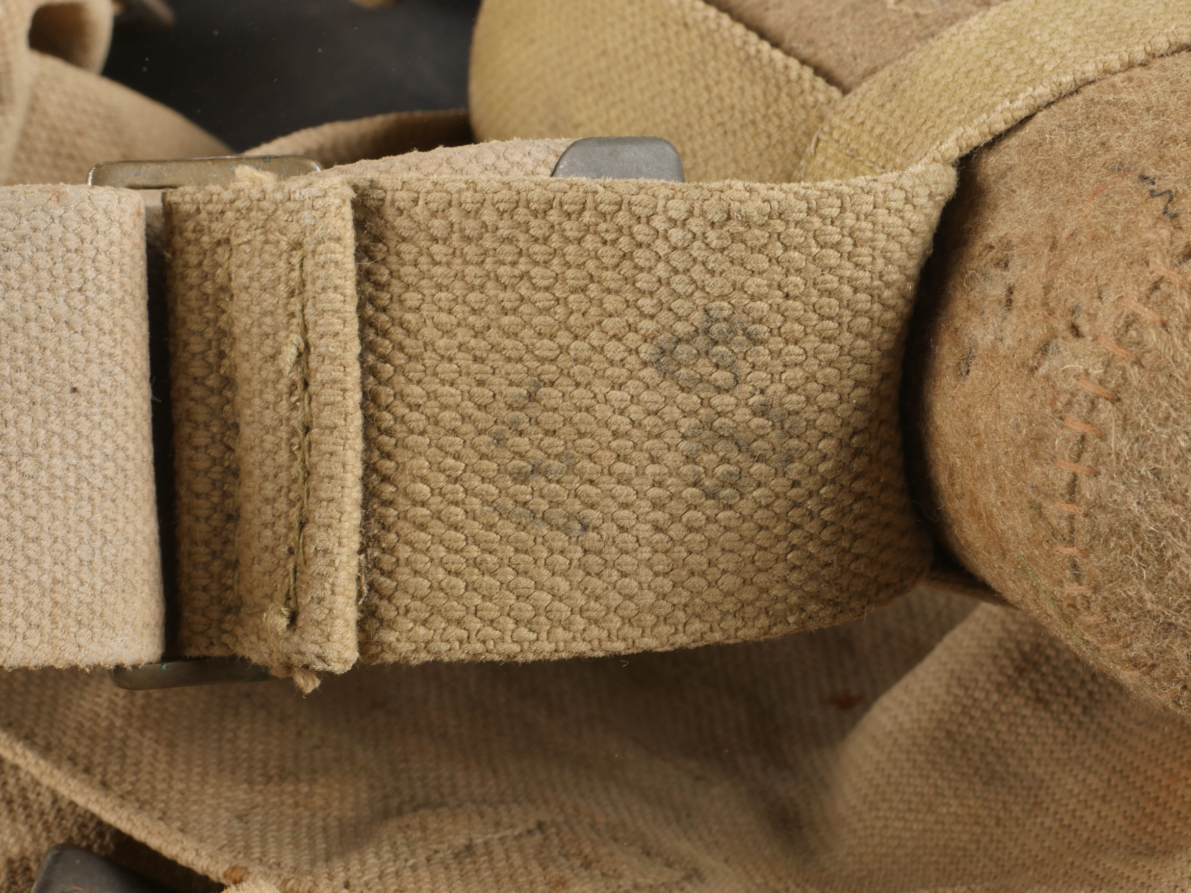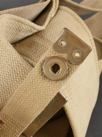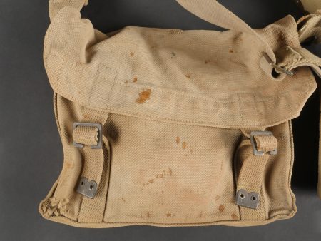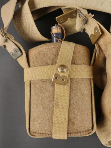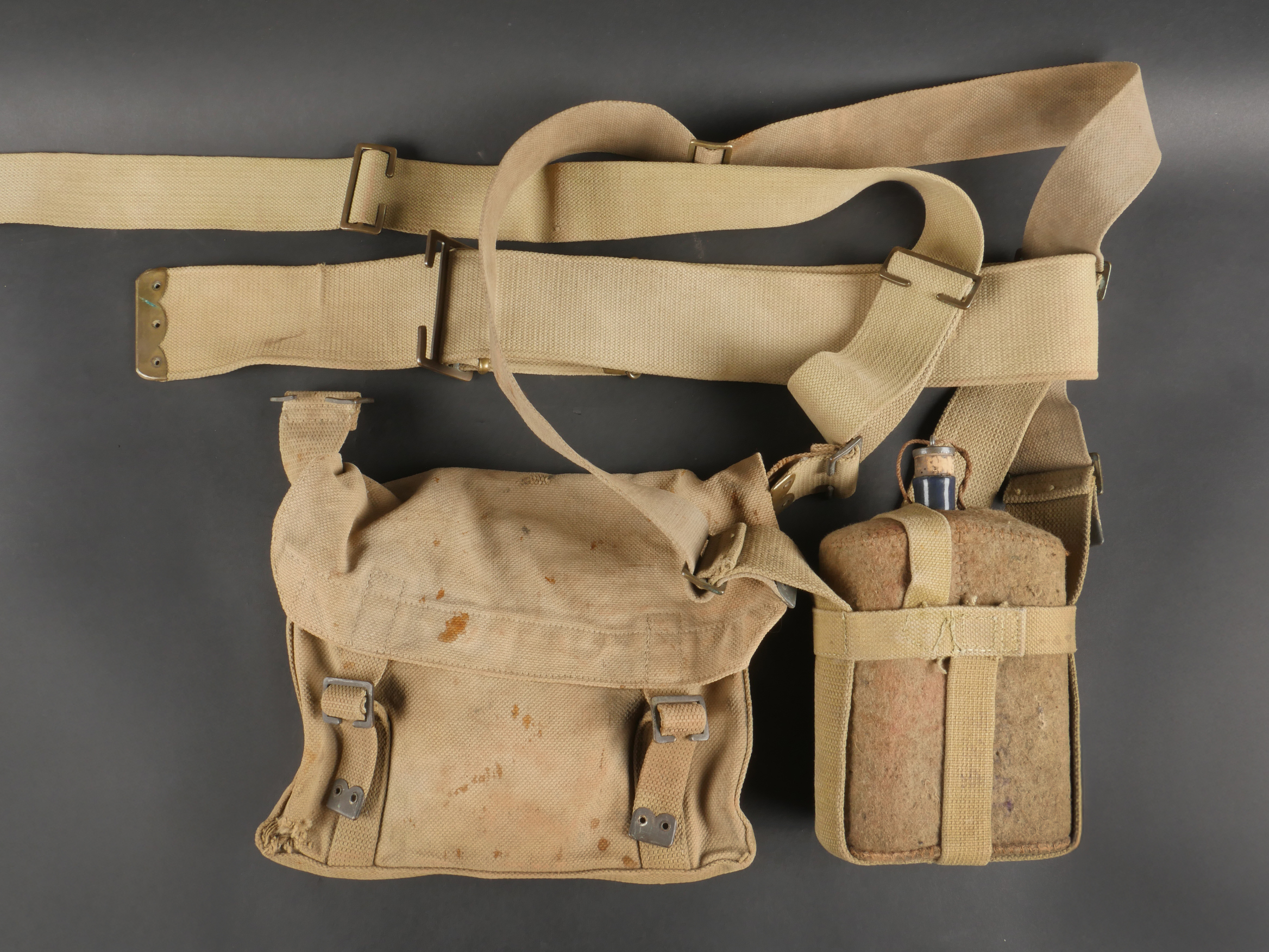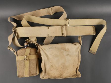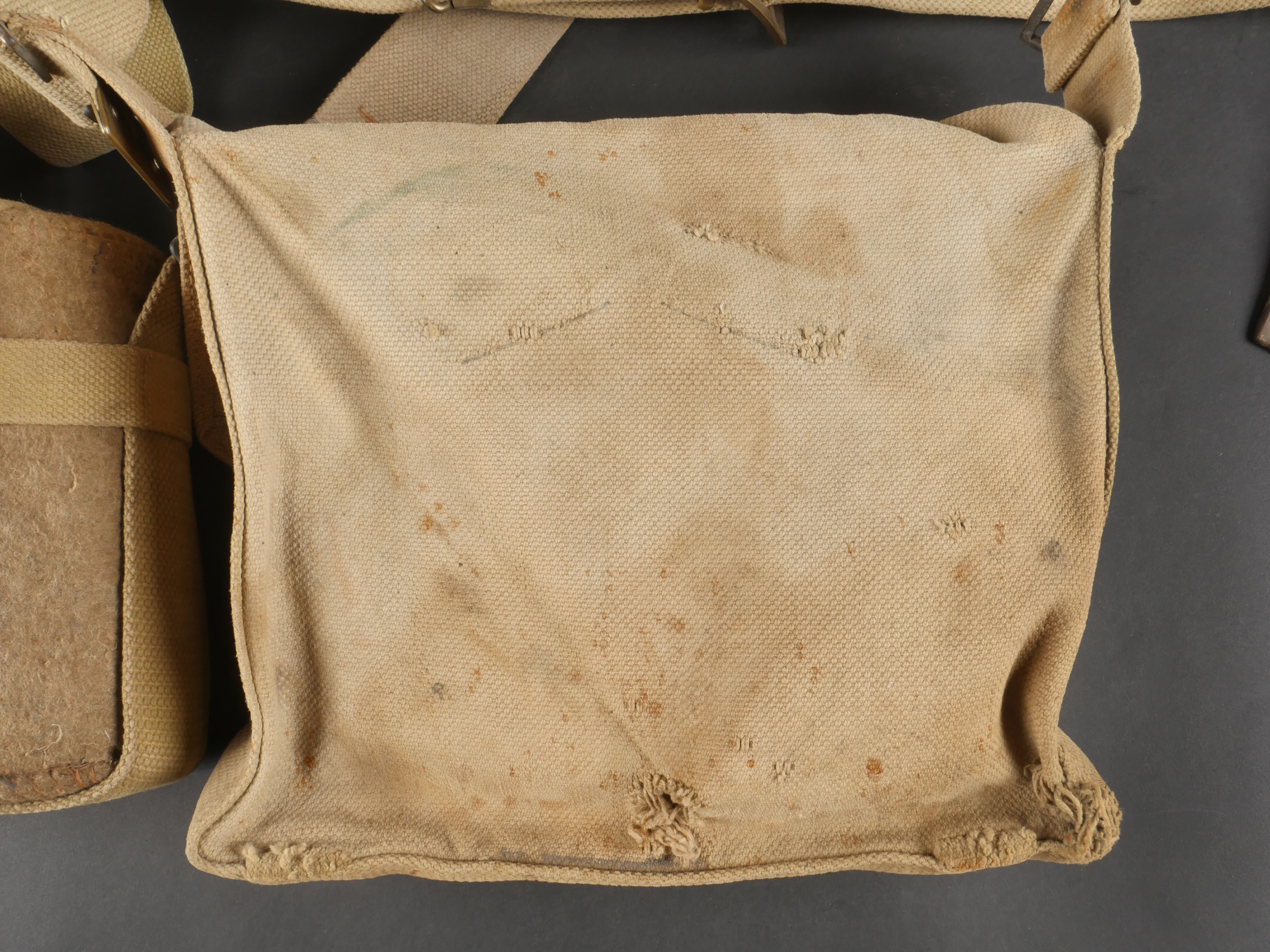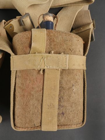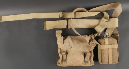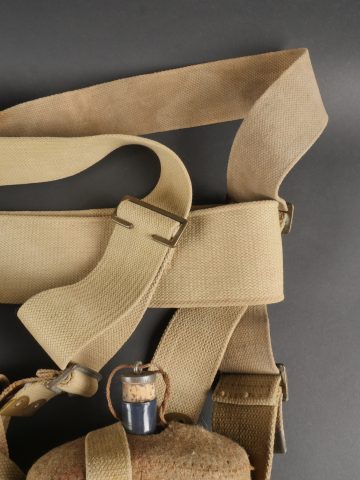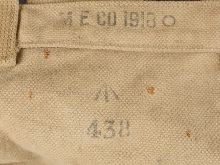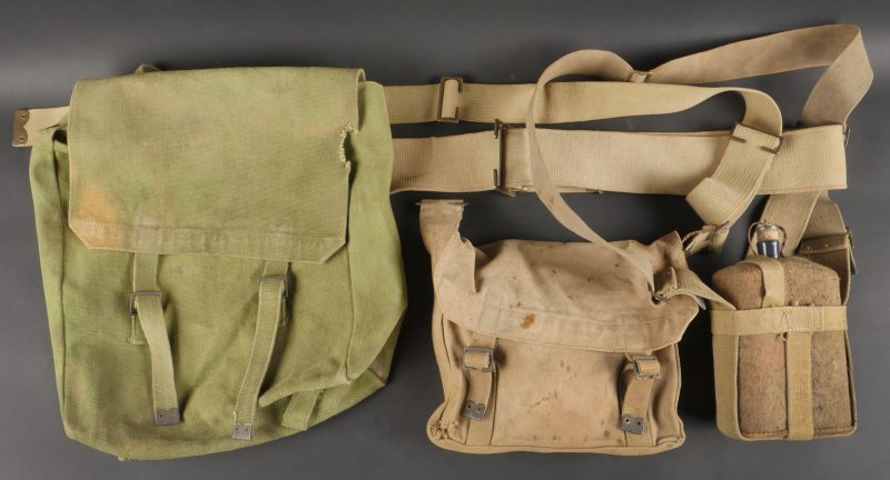 Important lot d’équipement anglais en Web. En toile de coton filé WEB modèle 1908, un ceinturon taille M bien daté 1916 avec toutes ses sangles, 2 bretelles, marquages peu lisibles, une musette small pack bien marquée MECO 1918, pattes pour le port au dos manquantes, un bidon émaillé bleu avec son bouchon, sa cordelette, sa housse en feutrine khaki et son harnais et enfin un havresac large pack, vercoté, daté 1918. Usure d’usage, taches, patine. Large Set of British Web EquipmentSet of 1908 pattern cotton webbing including a medium belt dated 1916 with all straps, two braces (stamps faint), a small pack clearly marked “MECO 1918” with missing rear tabs, a blue enamel water bottle with cork and cord, khaki felt cover and harness, and a large pack with varnished web straps dated 1918. Normal service wear, stains, and patina.