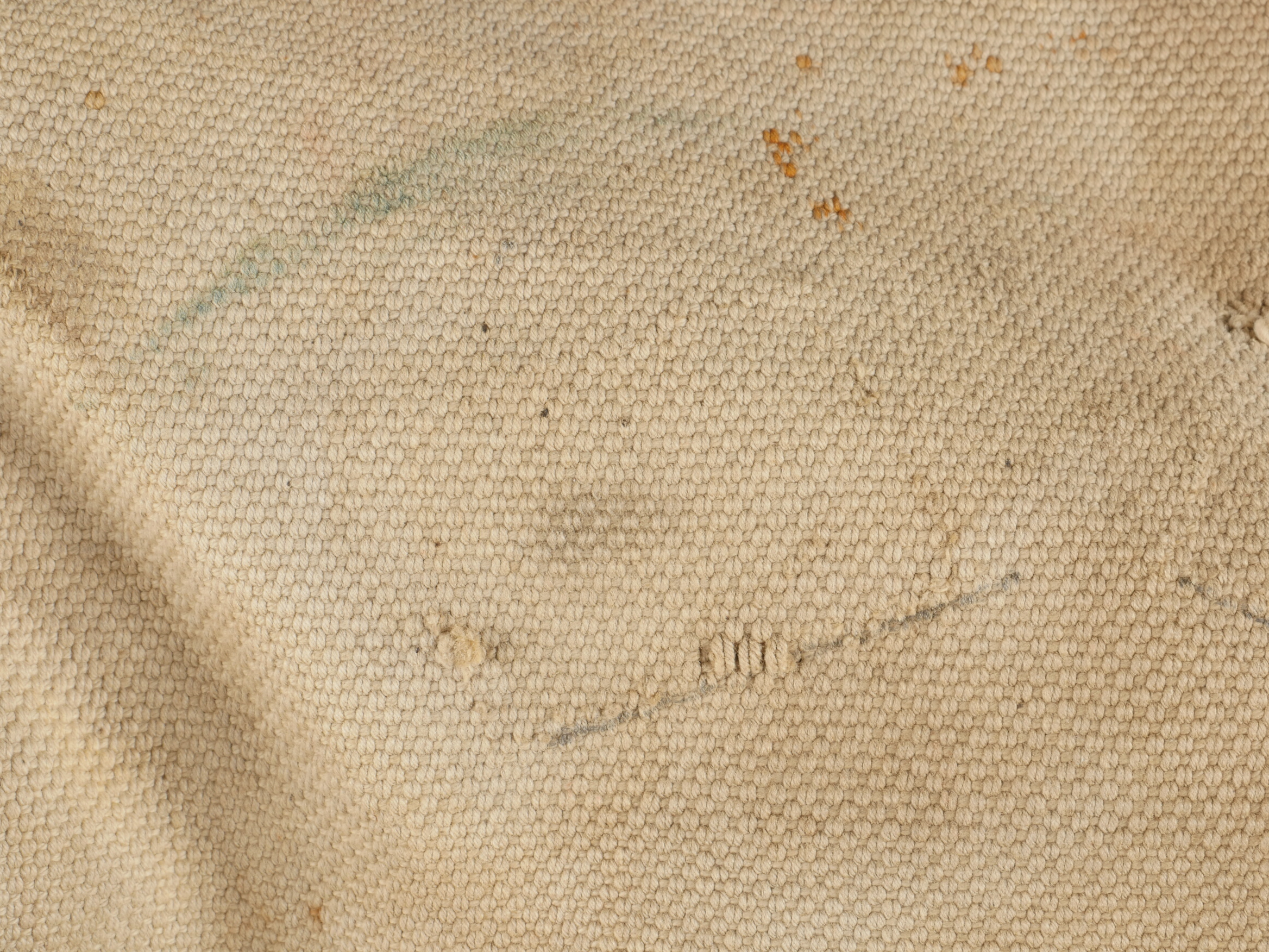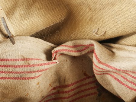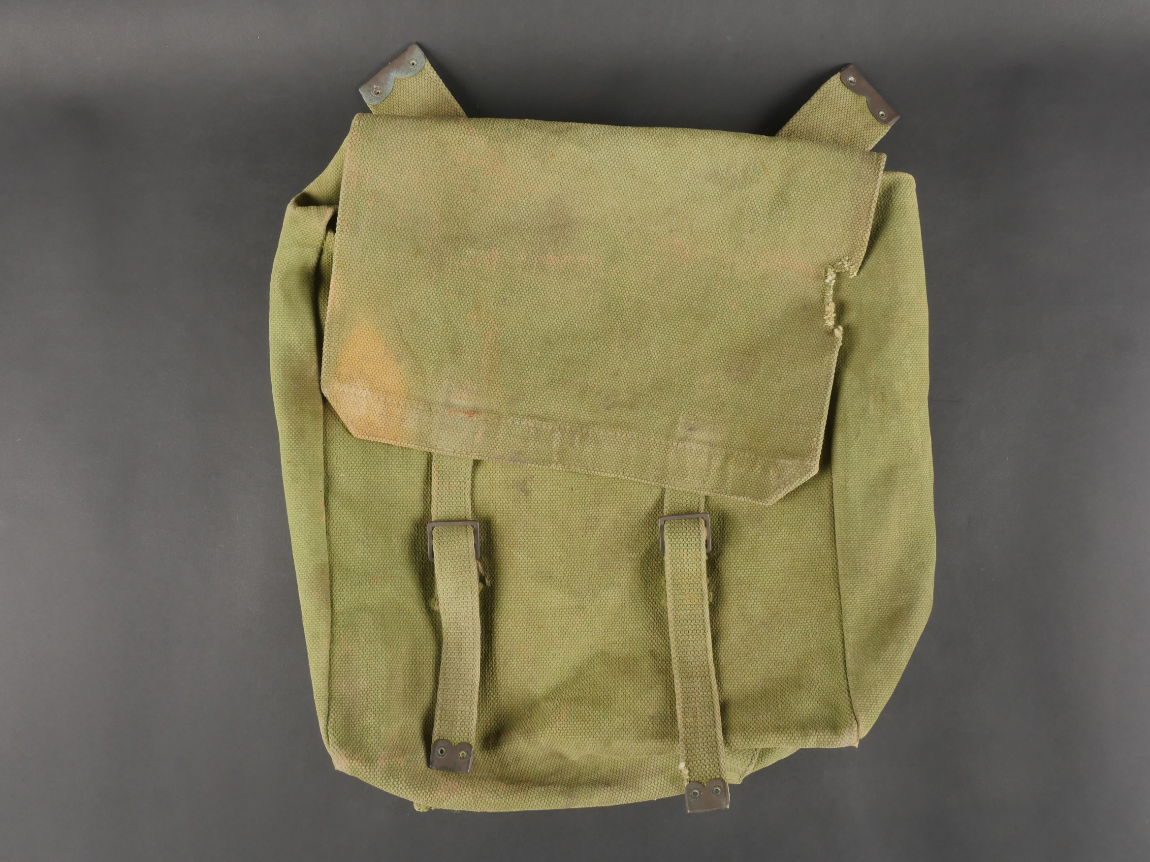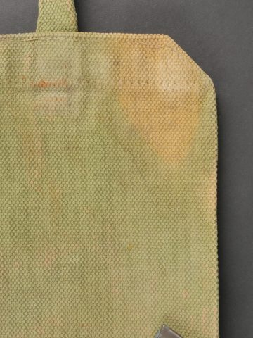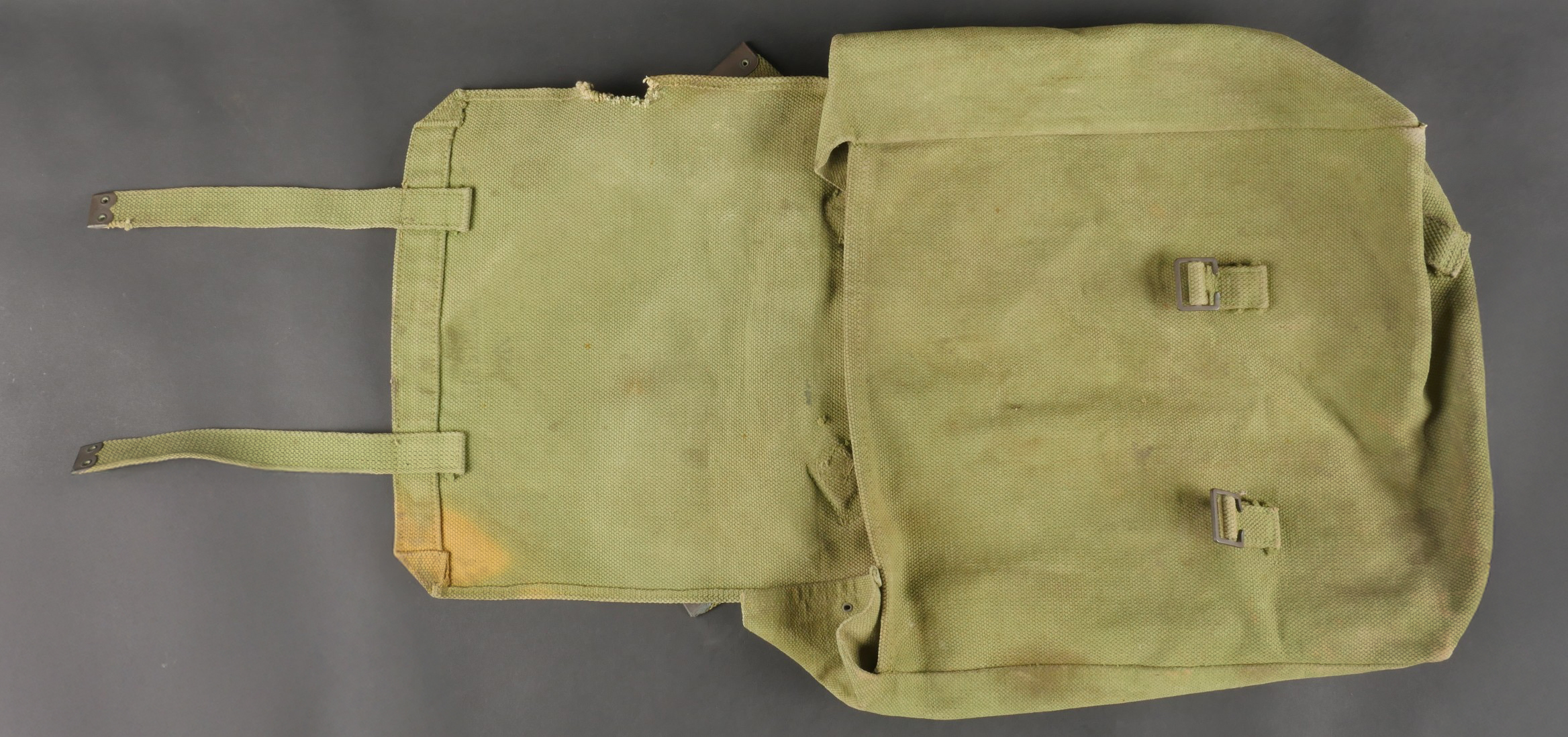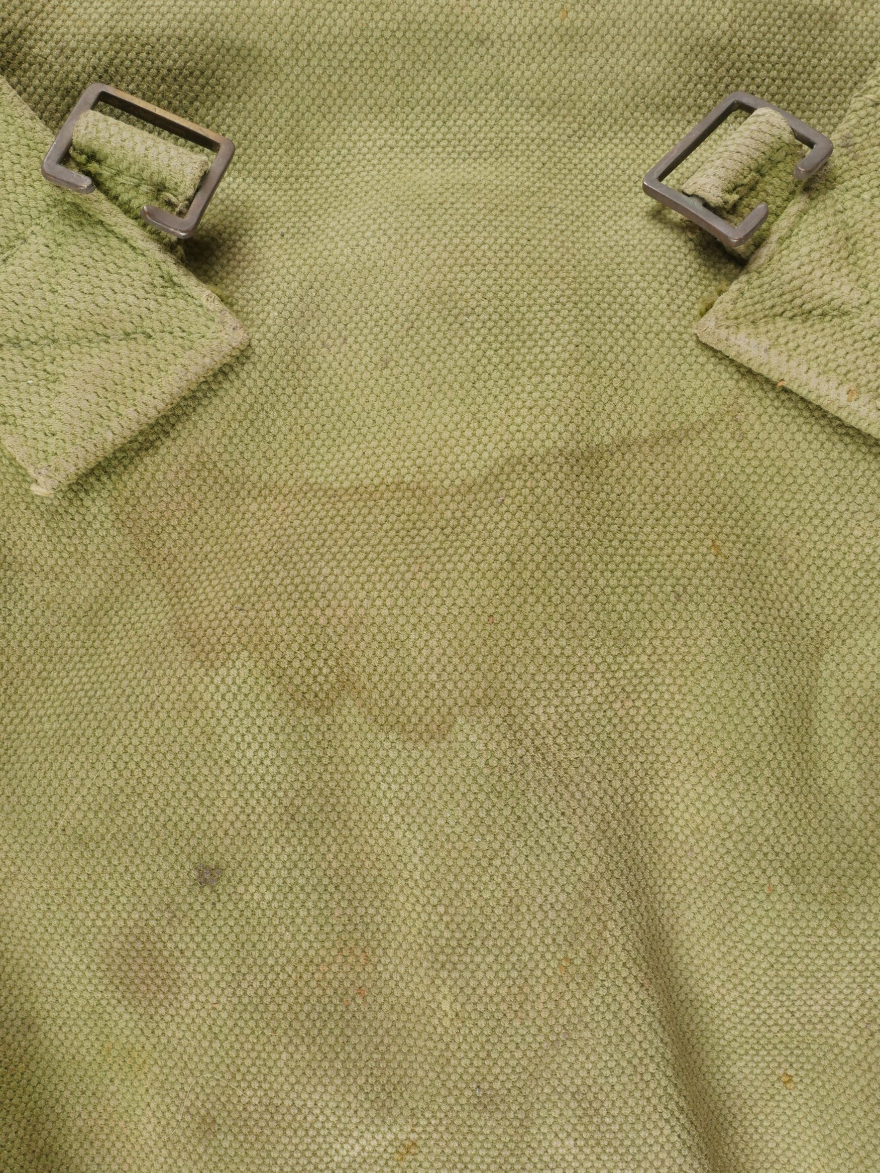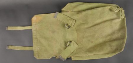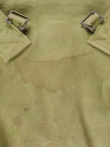 Important lot d’équipement anglais en Web. En toile de coton filé WEB modèle 1908, un ceinturon taille M bien daté 1916 avec toutes ses sangles, 2 bretelles, marquages peu lisibles, une musette small pack bien marquée MECO 1918, pattes pour le port au dos manquantes, un bidon émaillé bleu avec son bouchon, sa cordelette, sa housse en feutrine khaki et son harnais et enfin un havresac large pack, vercoté, daté 1918. Usure d’usage, taches, patine. Large Set of British Web EquipmentSet of 1908 pattern cotton webbing including a medium belt dated 1916 with all straps, two braces (stamps faint), a small pack clearly marked “MECO 1918” with missing rear tabs, a blue enamel water bottle with cork and cord, khaki felt cover and harness, and a large pack with varnished web straps dated 1918. Normal service wear, stains, and patina.