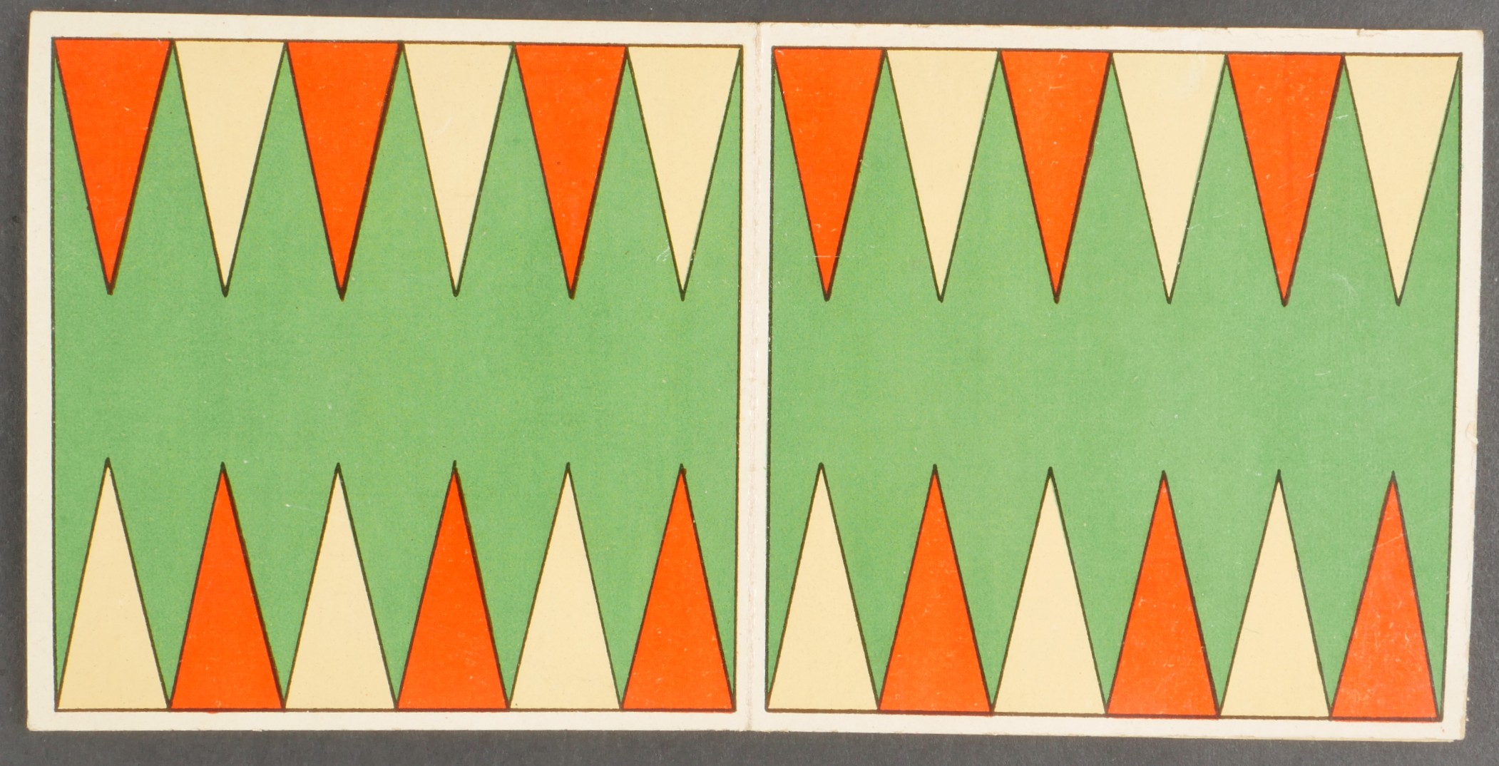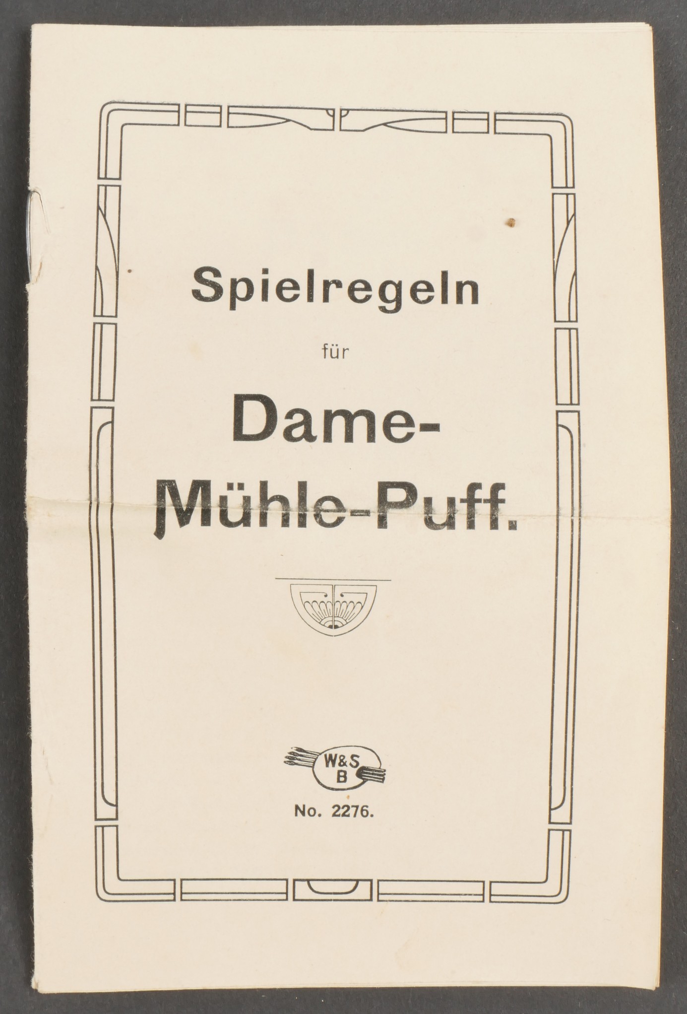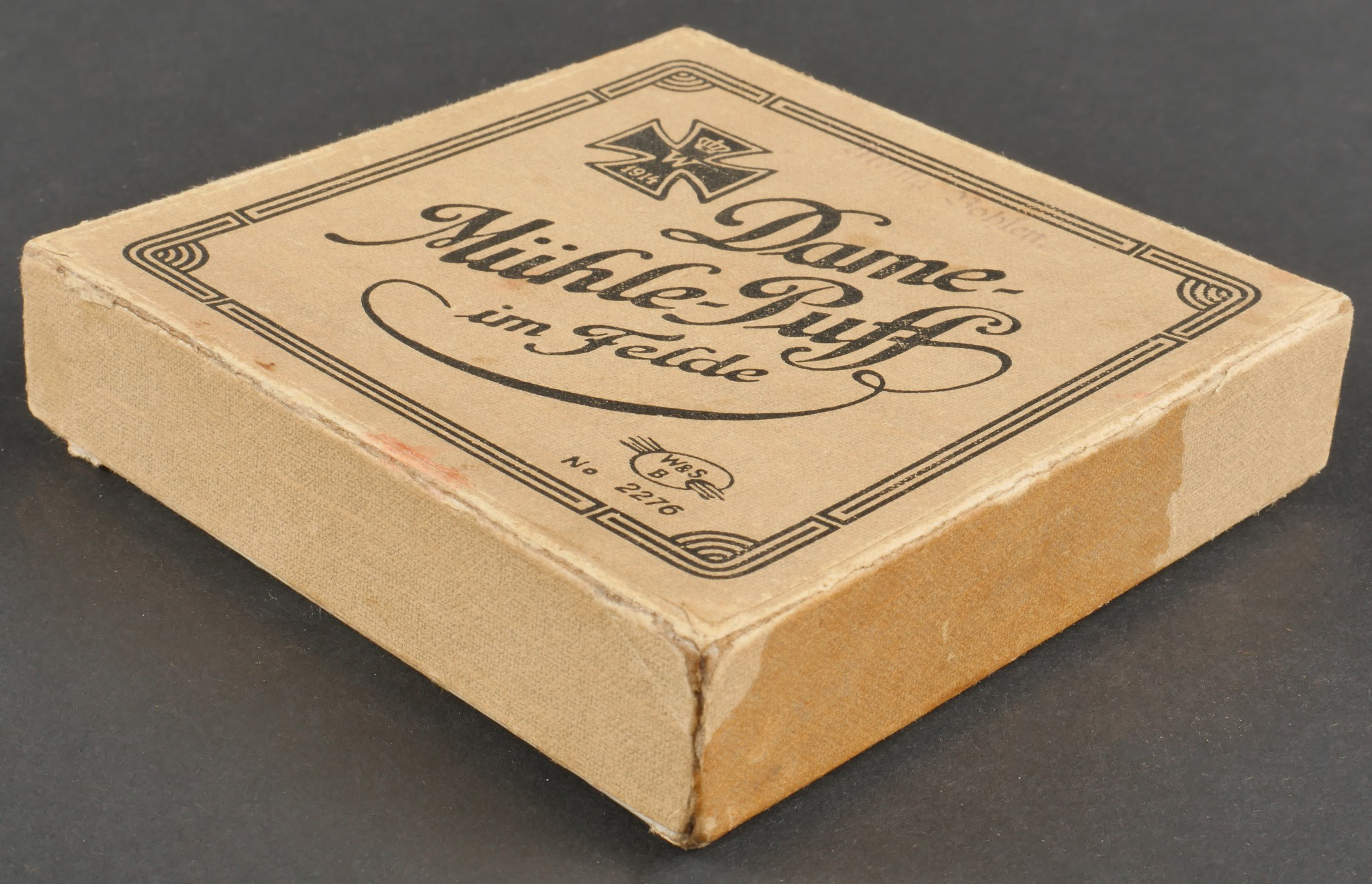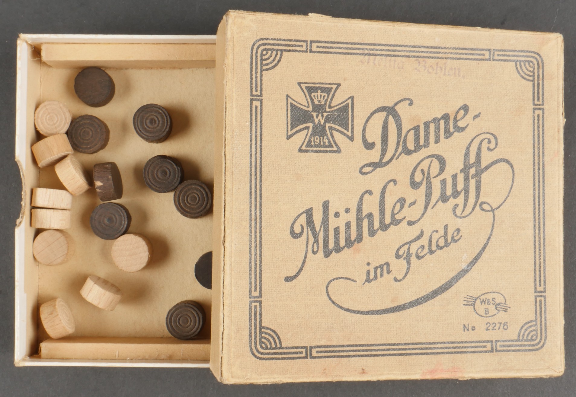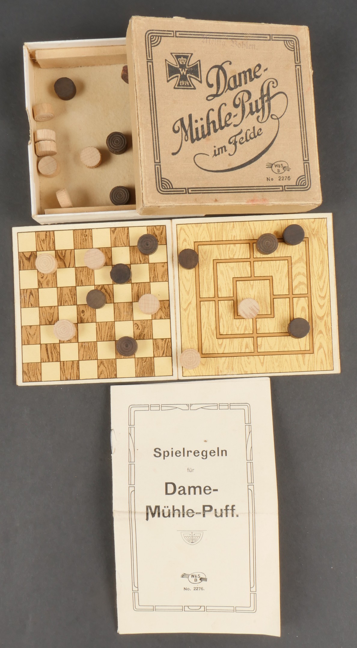 Jeu de pions de tranchée allemand avec croix de fer sur le couvercle. Boîte de jeu Dame-Mühle-Puff, permettant de jouer aux dames, marelle et backgammon. Boîte en carton avec couvercle à motif de Croix de Fer 1914, comprenant une notice avec règles des 3 jeux, un plateau pliable, 12 pions en bois blancs et 13 noirs. Usure d’usage. Bel objet de vitrine. German Trench Game Box with Iron Cross Lid “Dame-Mühle-Puff” game set for playing checkers, mill, and backgammon. Cardboard box with 1914 Iron Cross motif on lid, including rule booklet for three games, folding board, twelve white and thirteen black wooden pieces. Signs of use. Fine display item.