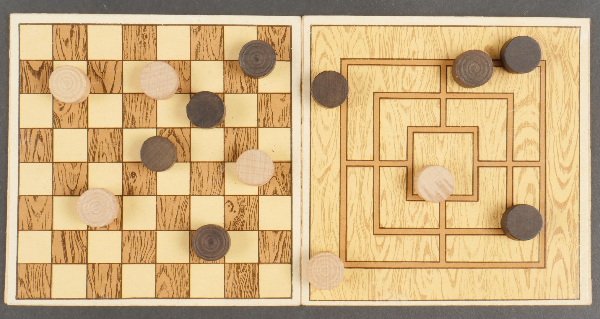 Détails de la vente >Jeu de pions de tranchée allemand avec croix de fer sur le couvercle. Boîte de jeu Dame-Mühle-Puff, permettant de jouer aux dames, marelle et backgammon. Boîte en carton avec couvercle à... en savoir plus