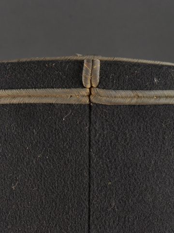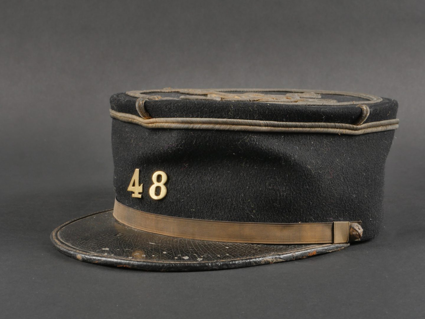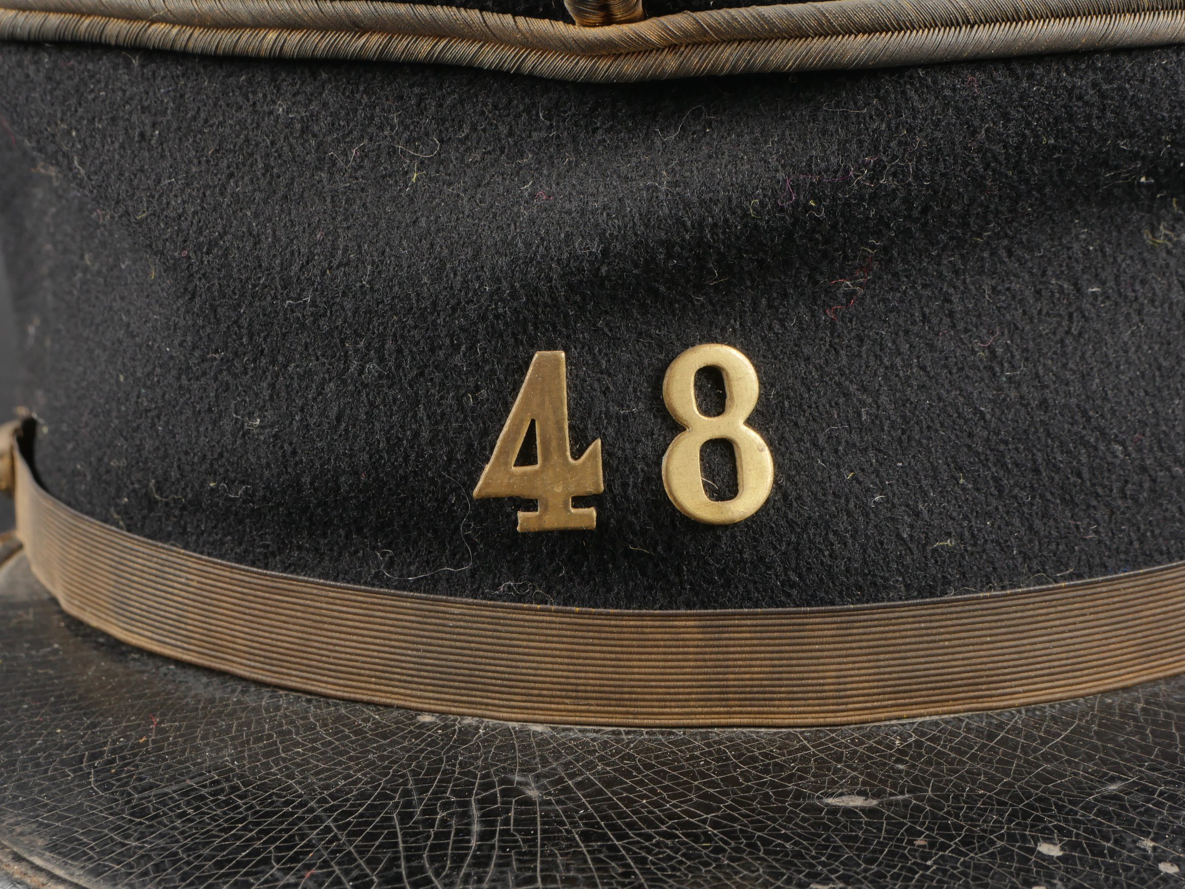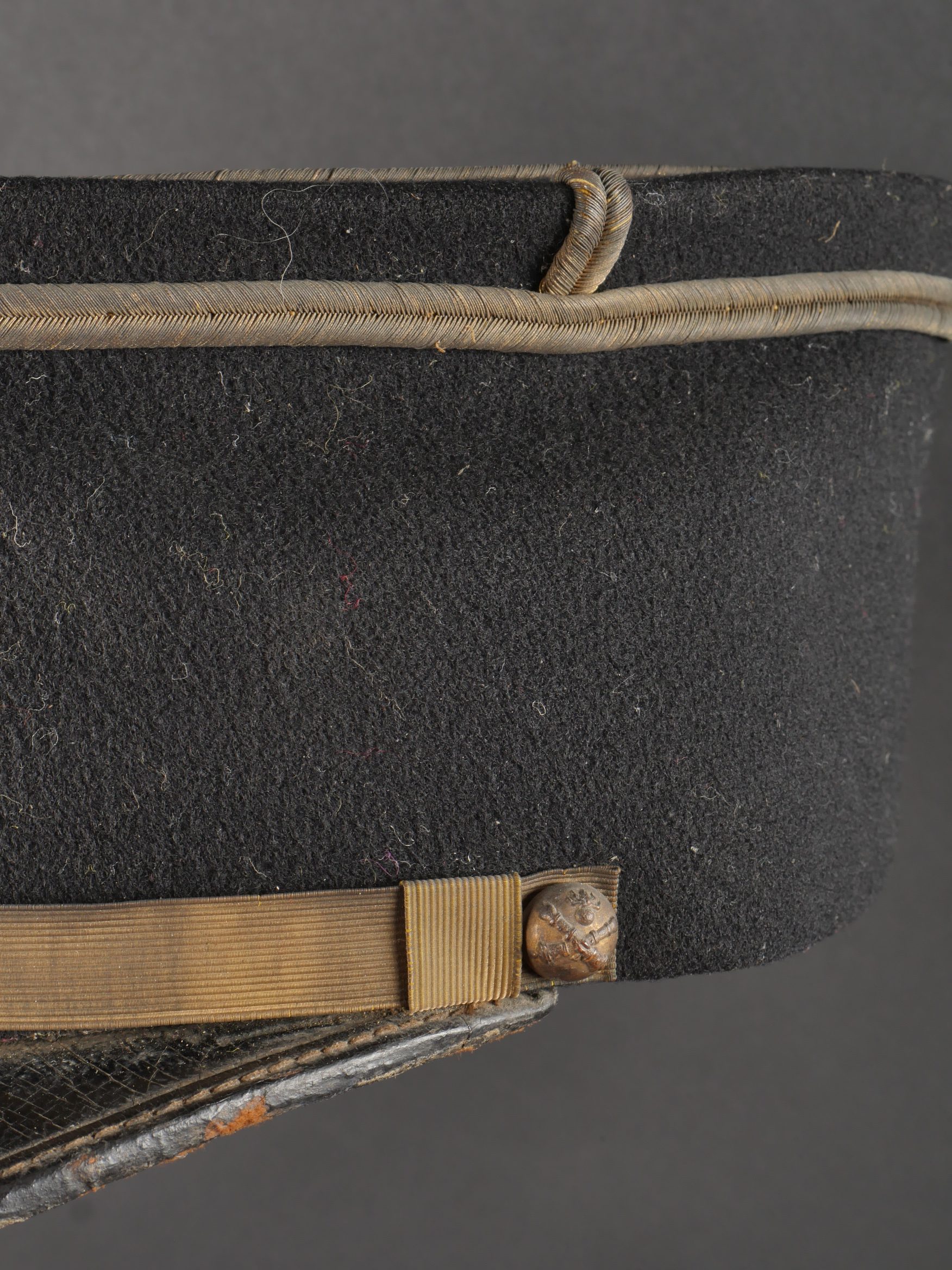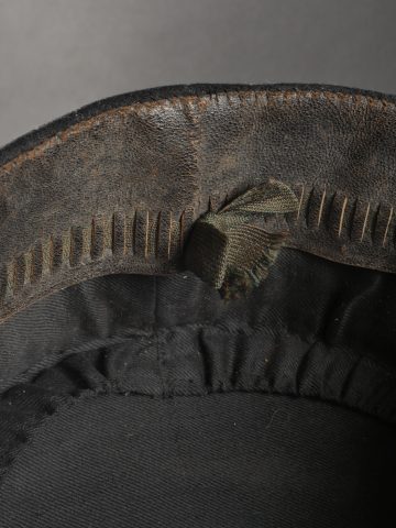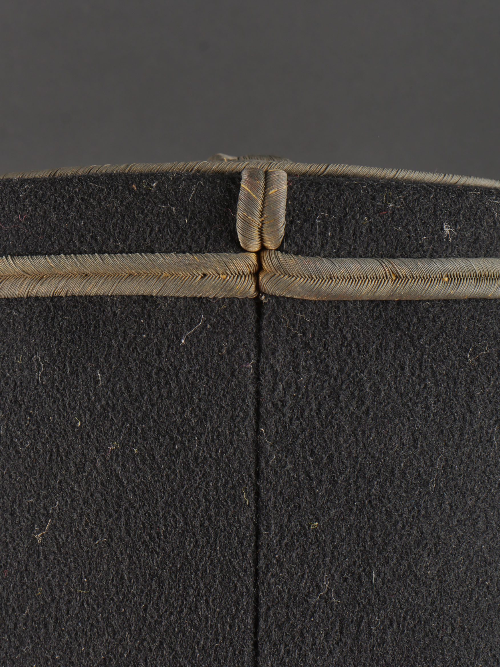 Képi d’un sous-lieutenant du 48e d’artillerie. Képi de forme polo en drap noir, nœud hongrois à simple brin sur le calot, Un galon doré de sous-lieutenant. Chiffres métalliques en laiton à pattes repliables. Fausse jugulaire dorée fixée par 2 petits boutons de l’arme. Dessous de visière et bandeau de sudation en basane foncée. Doublure en tissu noir. 4 trous de mites sur le calot. Usure d’usage, patine. Kepi of a Second Lieutenant, 48th Artillery Regiment Polo-shaped kepi in black cloth with single-strand Hungarian knot on crown, one gold braid of second lieutenant. Folded-tab brass artillery numerals. Gilt false chinstrap fixed by two small artillery buttons. Underside of visor and sweatband in dark leather, black fabric lining. Four small moth holes on crown. Signs of wear, patina.