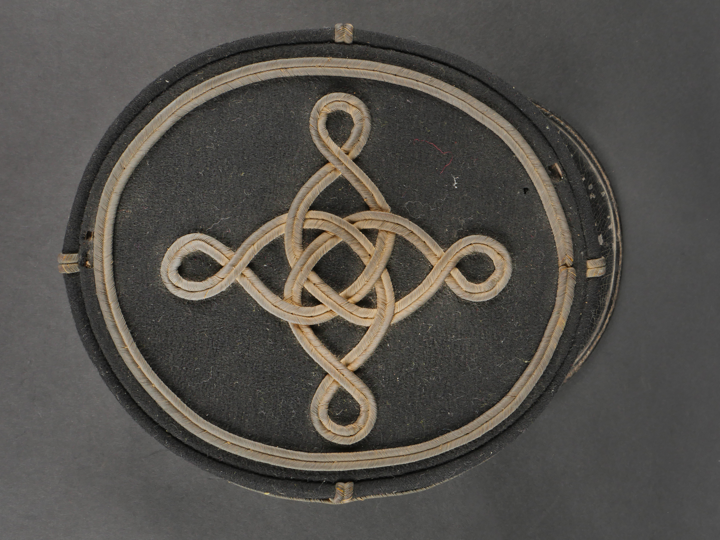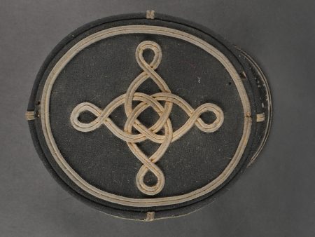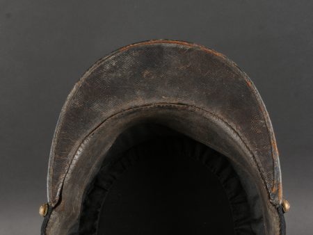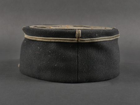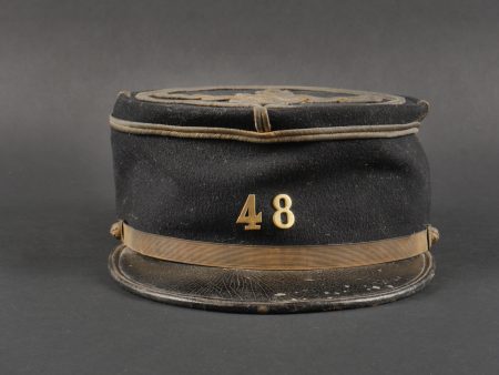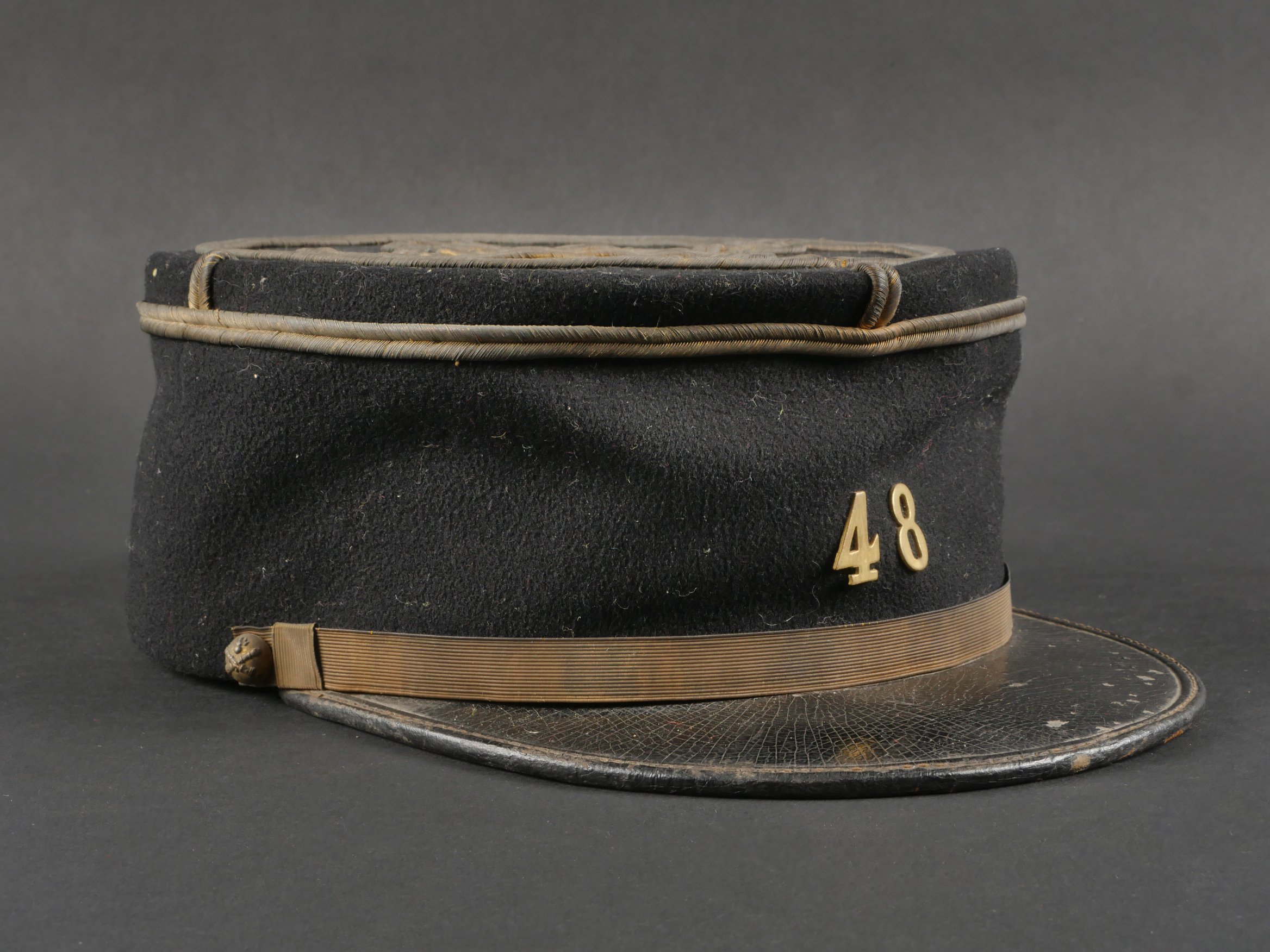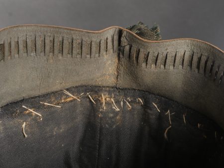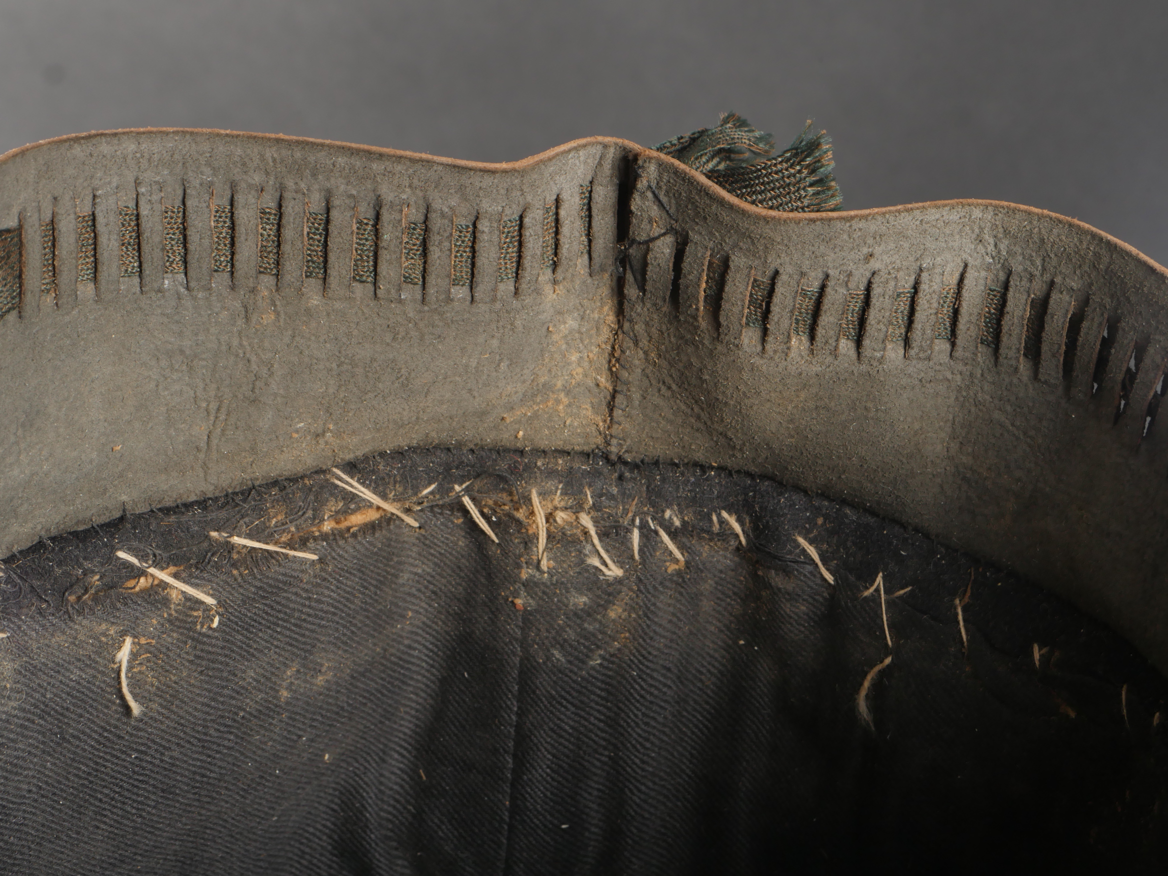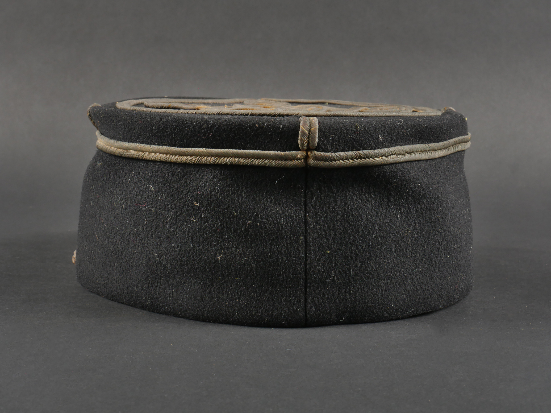 Képi d’un sous-lieutenant du 48e d’artillerie. Képi de forme polo en drap noir, nœud hongrois à simple brin sur le calot, Un galon doré de sous-lieutenant. Chiffres métalliques en laiton à pattes repliables. Fausse jugulaire dorée fixée par 2 petits boutons de l’arme. Dessous de visière et bandeau de sudation en basane foncée. Doublure en tissu noir. 4 trous de mites sur le calot. Usure d’usage, patine. Kepi of a Second Lieutenant, 48th Artillery Regiment Polo-shaped kepi in black cloth with single-strand Hungarian knot on crown, one gold braid of second lieutenant. Folded-tab brass artillery numerals. Gilt false chinstrap fixed by two small artillery buttons. Underside of visor and sweatband in dark leather, black fabric lining. Four small moth holes on crown. Signs of wear, patina.
