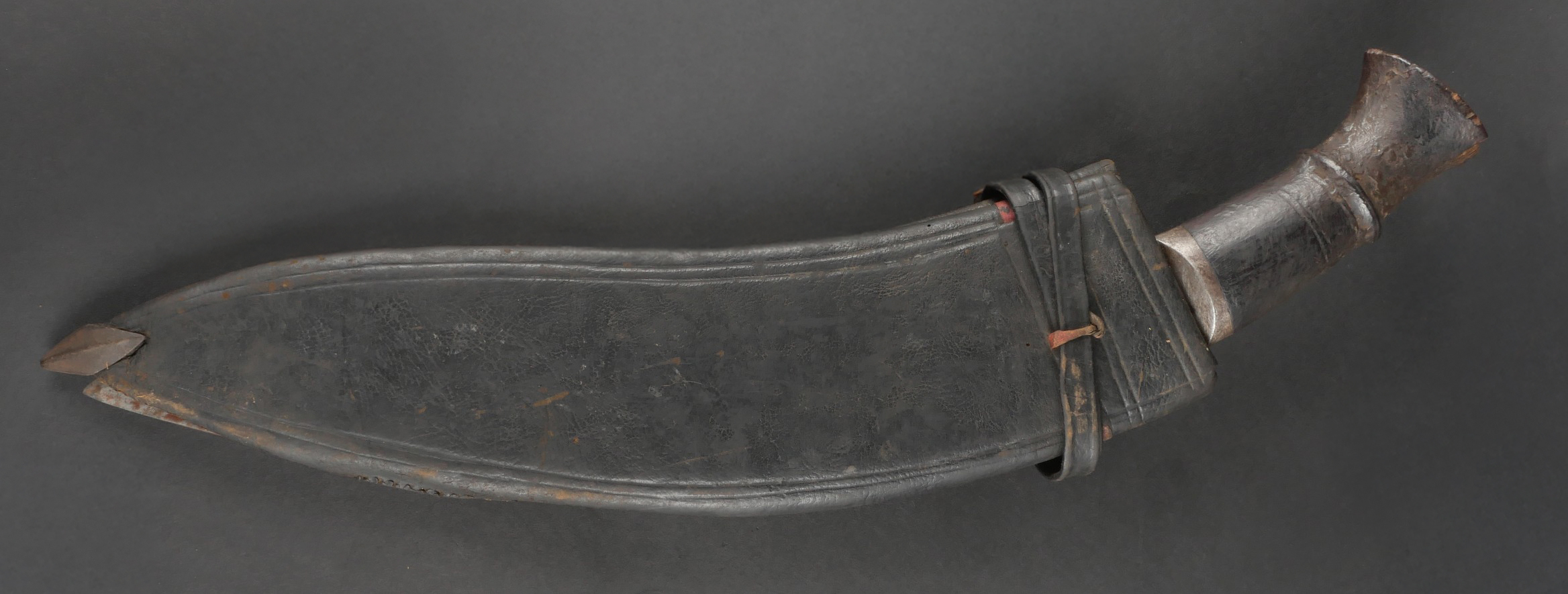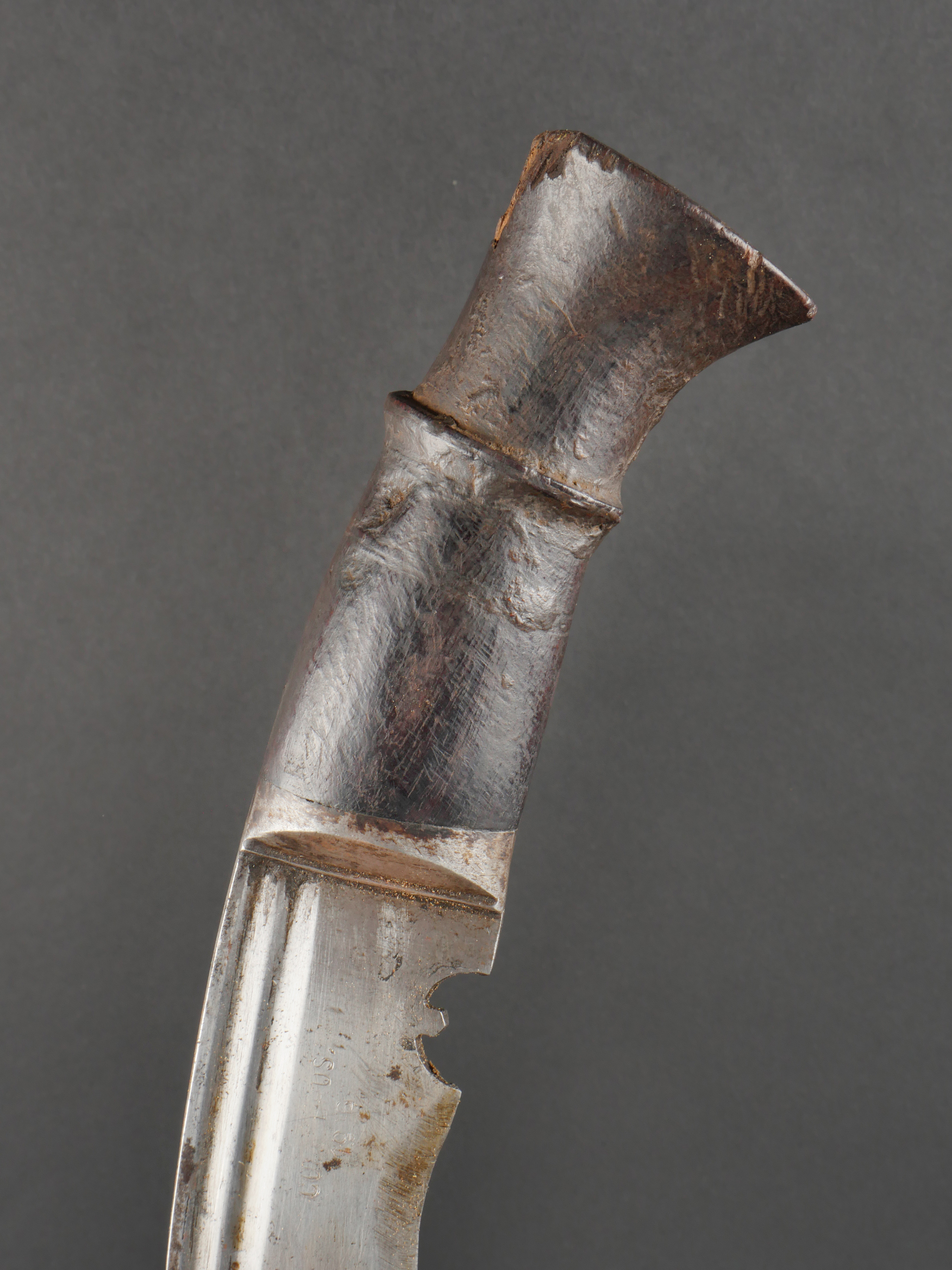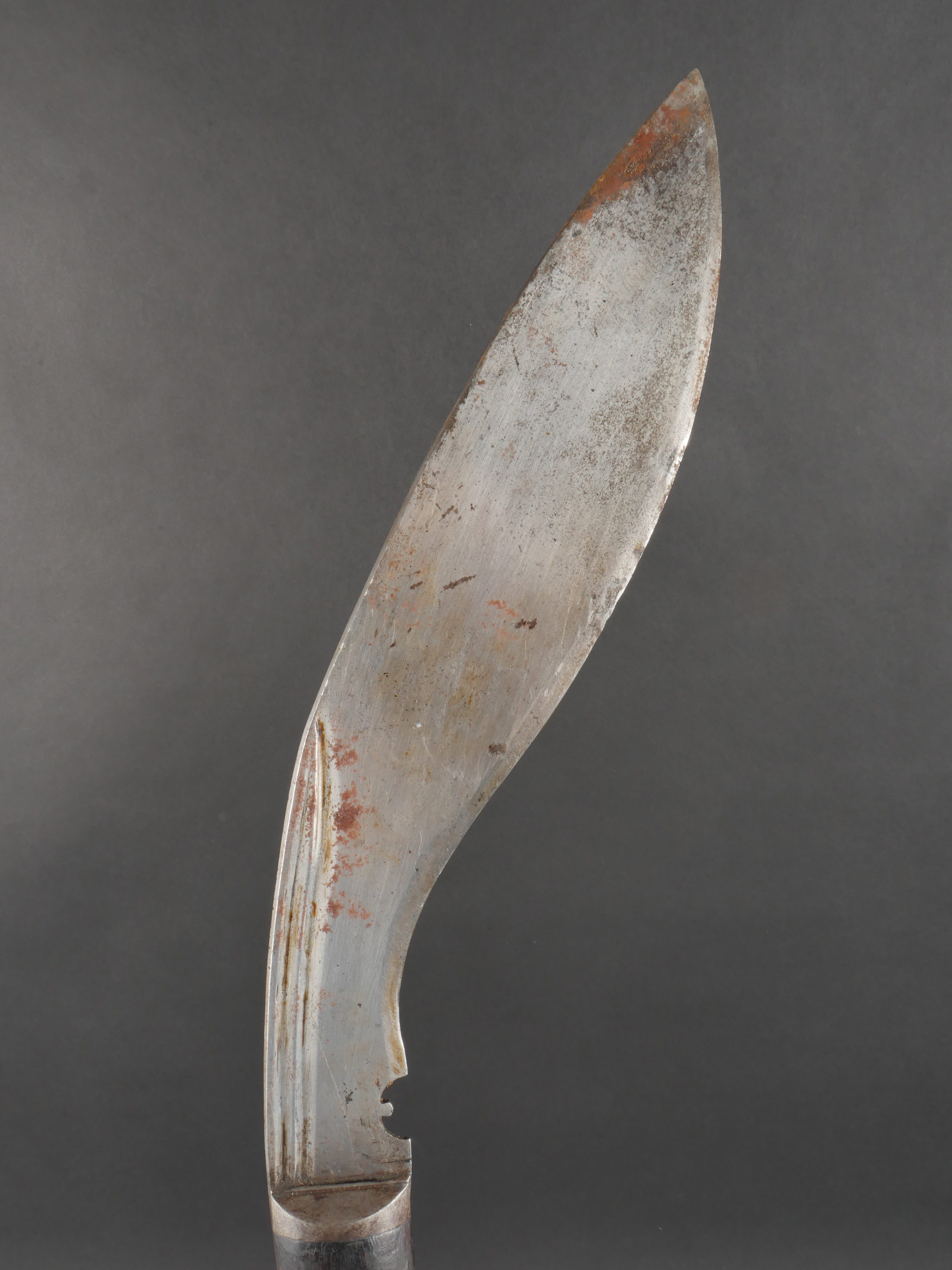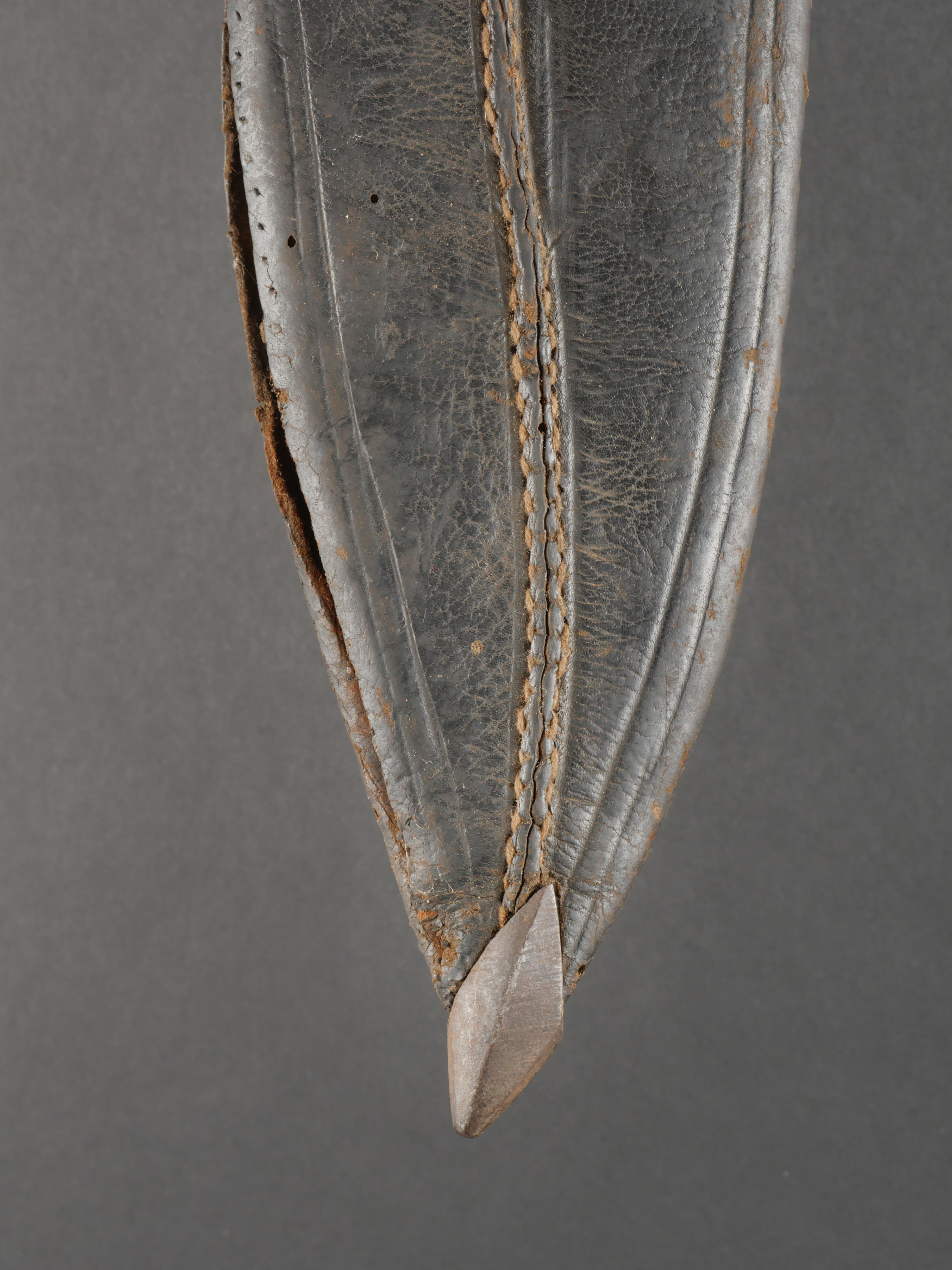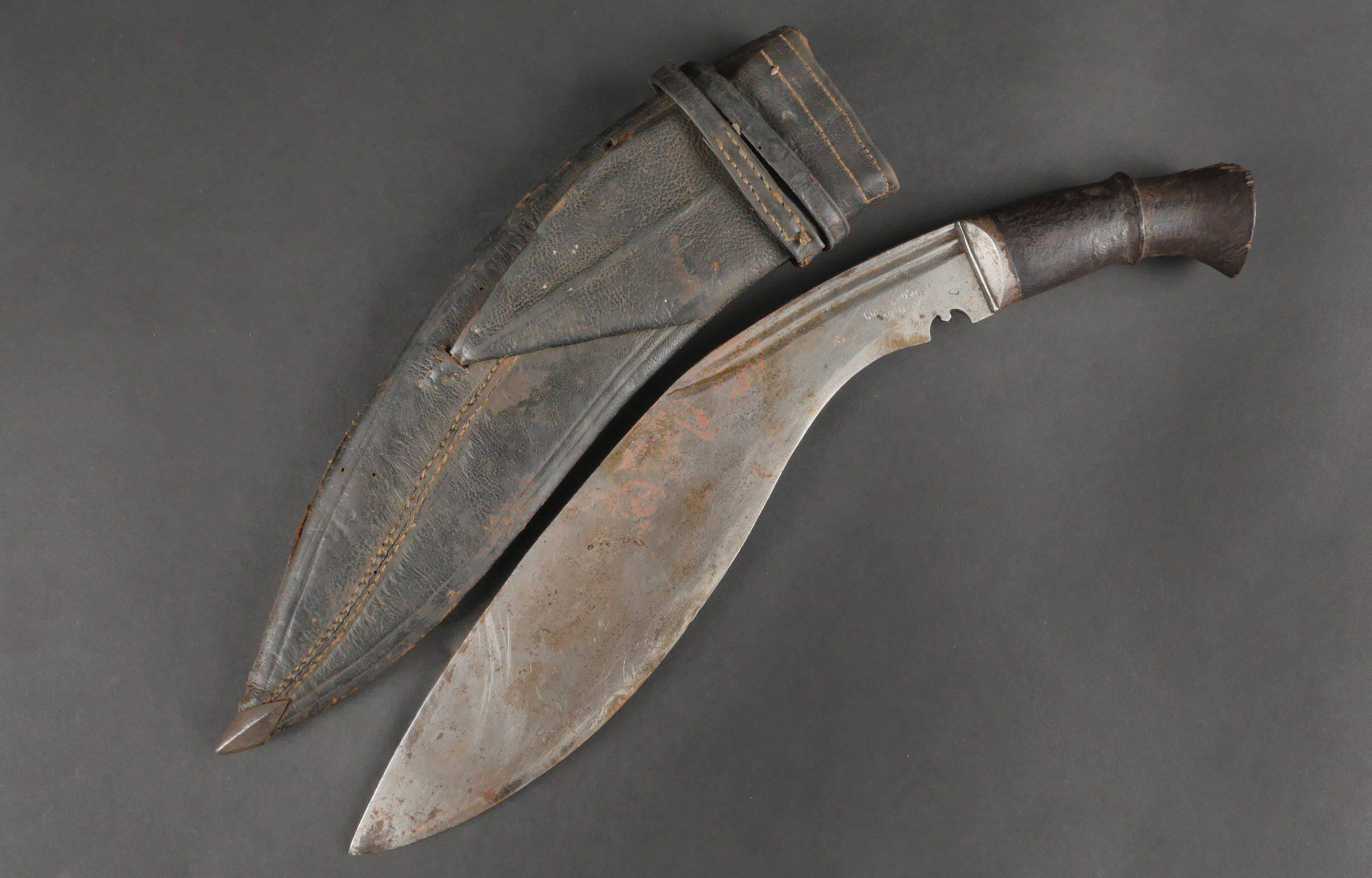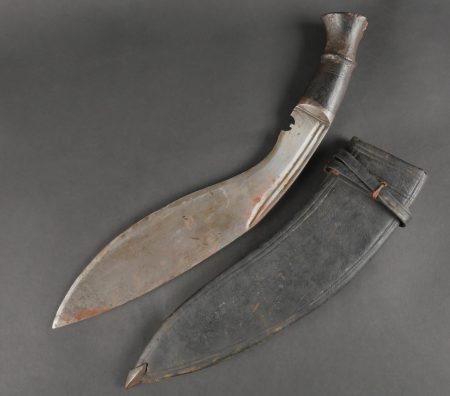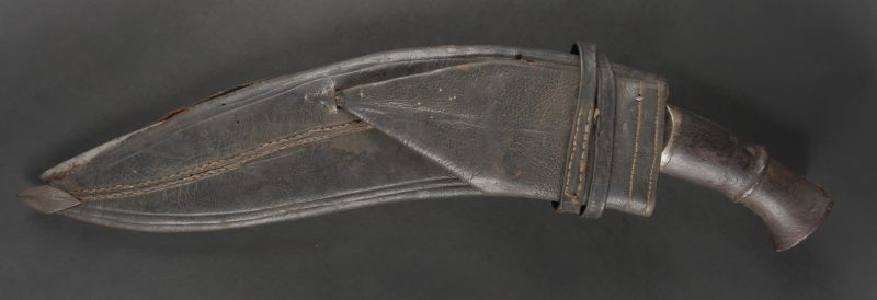 Kukri de Gurkha règlementaire daté 1916. Peu courant Kukri règlementaire, bien marqué de la Broad Arrow, daté 1916. Forte lame en bon état. Poignée en bois noirci. Dans son fourreau en bois gainé de cuir noir, décoré d’un double listel, bouterole en forme de diamant. Ouvert sur 13 cm sur le dessus. Présence des 3 fourreaux secondaires en cuir pour les couteaux et de la sangle de maintien. Usure d’usage. Bon état pour un vrai Kukri militaire et non un objet pour touriste. Regulation Gurkha Kukri Dated 1916Uncommon regulation Gurkha kukri, clearly marked with the Broad Arrow and dated 1916. Heavy blade in good condition with blackened wooden grip. Contained in its wooden scabbard covered in black leather, decorated with a double raised line and a diamond-shaped chape. The upper section is open for 13 cm. Complete with three secondary leather sheaths for the small knives and the retaining strap. Normal wear consistent with age. A genuine military kukri, not a tourist souvenir.