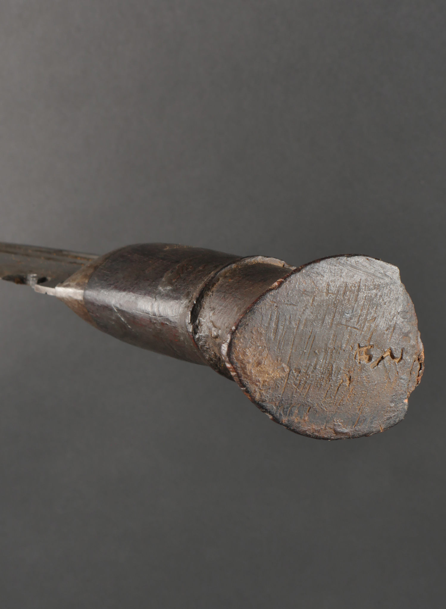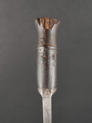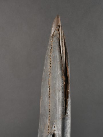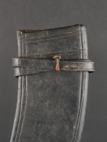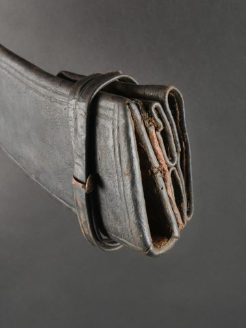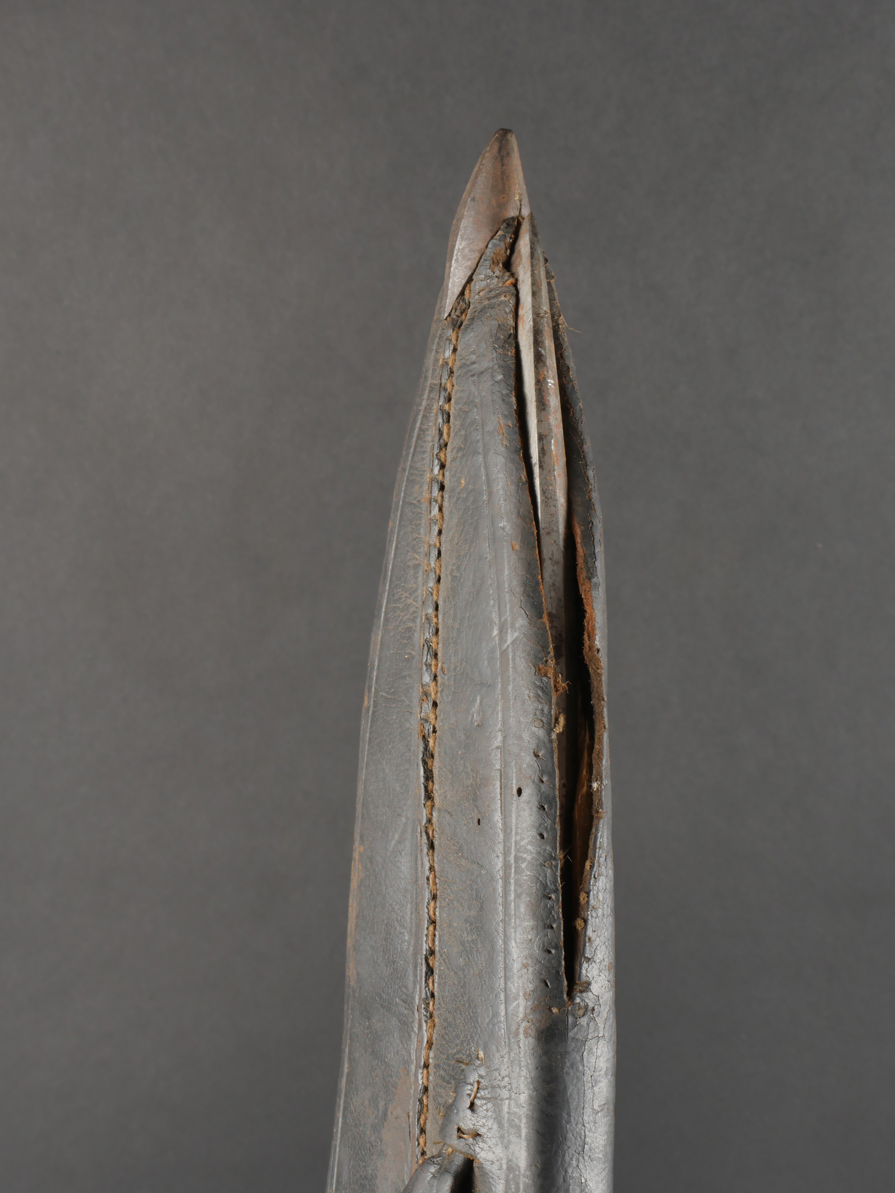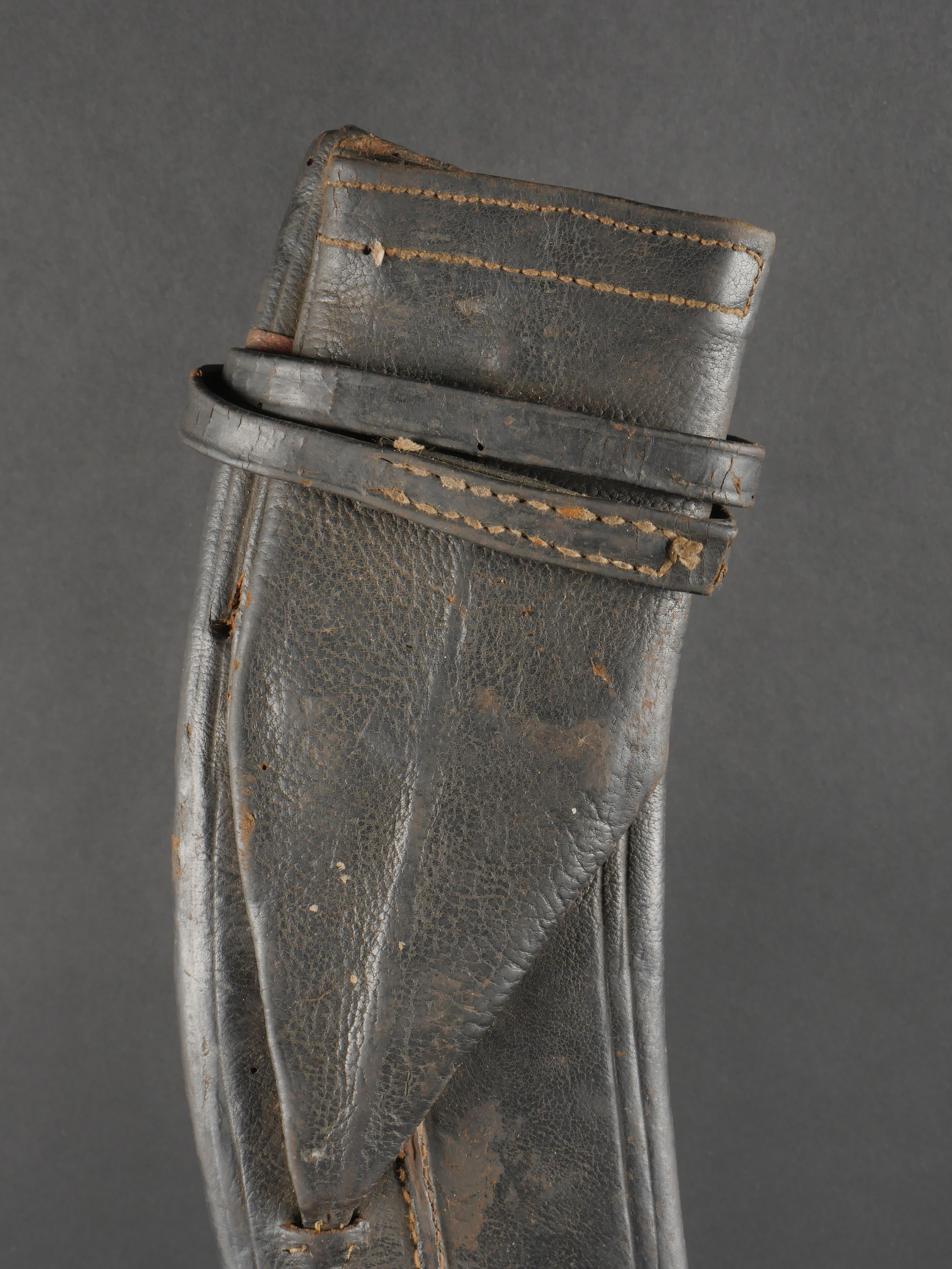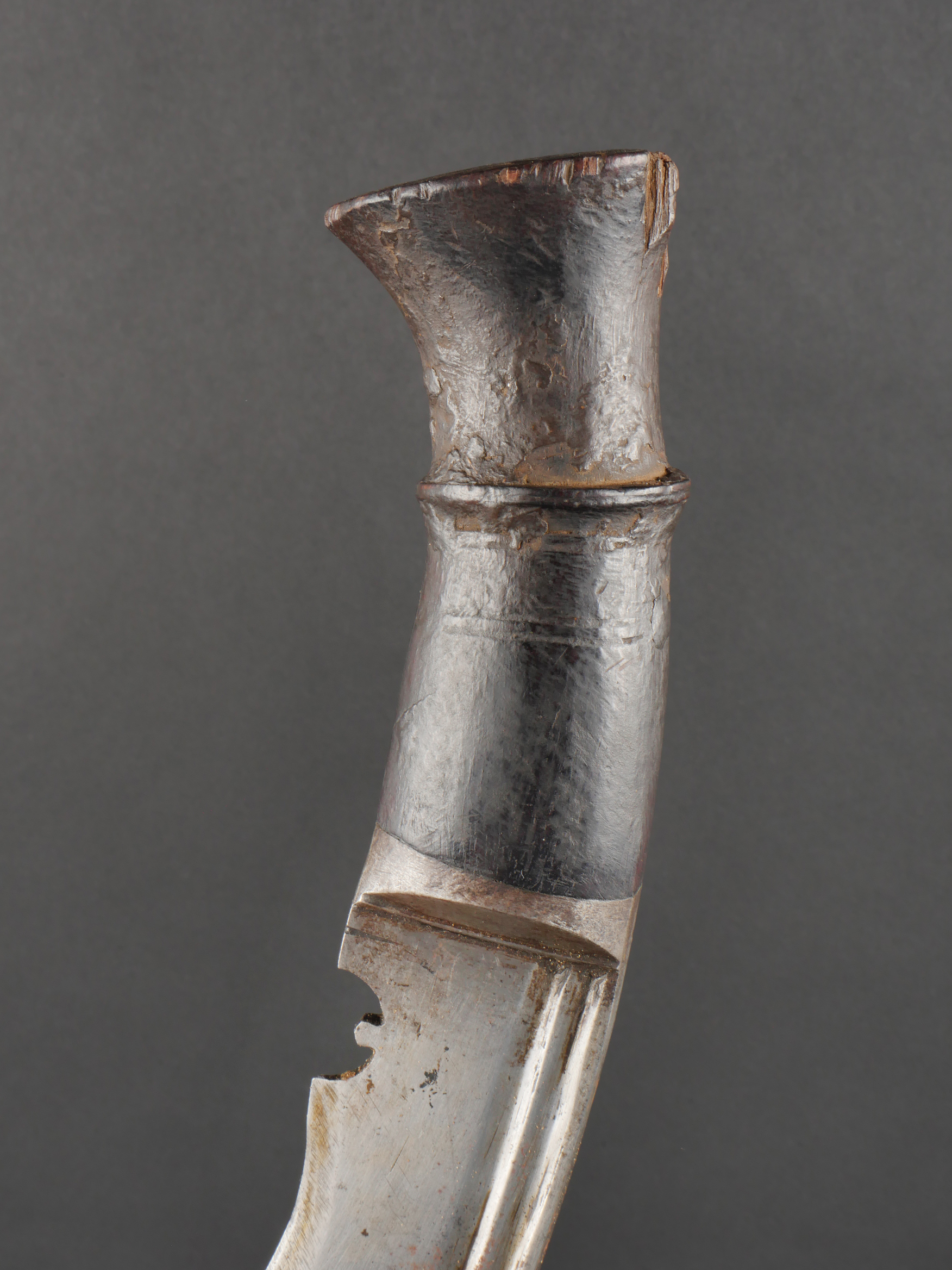 Kukri de Gurkha règlementaire daté 1916. Peu courant Kukri règlementaire, bien marqué de la Broad Arrow, daté 1916. Forte lame en bon état. Poignée en bois noirci. Dans son fourreau en bois gainé de cuir noir, décoré d’un double listel, bouterole en forme de diamant. Ouvert sur 13 cm sur le dessus. Présence des 3 fourreaux secondaires en cuir pour les couteaux et de la sangle de maintien. Usure d’usage. Bon état pour un vrai Kukri militaire et non un objet pour touriste. Regulation Gurkha Kukri Dated 1916Uncommon regulation Gurkha kukri, clearly marked with the Broad Arrow and dated 1916. Heavy blade in good condition with blackened wooden grip. Contained in its wooden scabbard covered in black leather, decorated with a double raised line and a diamond-shaped chape. The upper section is open for 13 cm. Complete with three secondary leather sheaths for the small knives and the retaining strap. Normal wear consistent with age. A genuine military kukri, not a tourist souvenir.