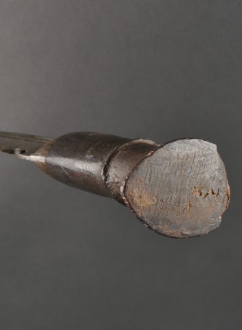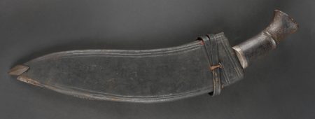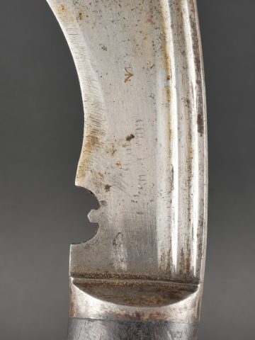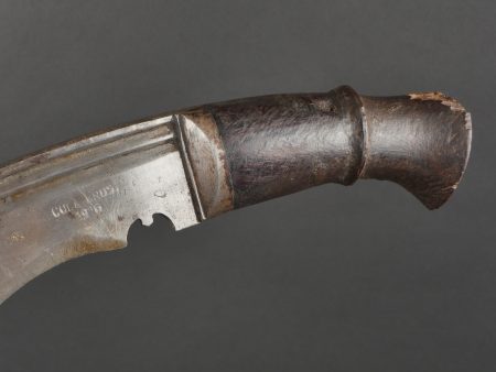 Détails de la vente >Kukri de Gurkha règlementaire daté 1916. Peu courant Kukri règlementaire, bien marqué de la Broad Arrow, daté 1916. Forte lame en bon état. Poignée en bois noirci. Dans son fourreau en bois... en savoir plus