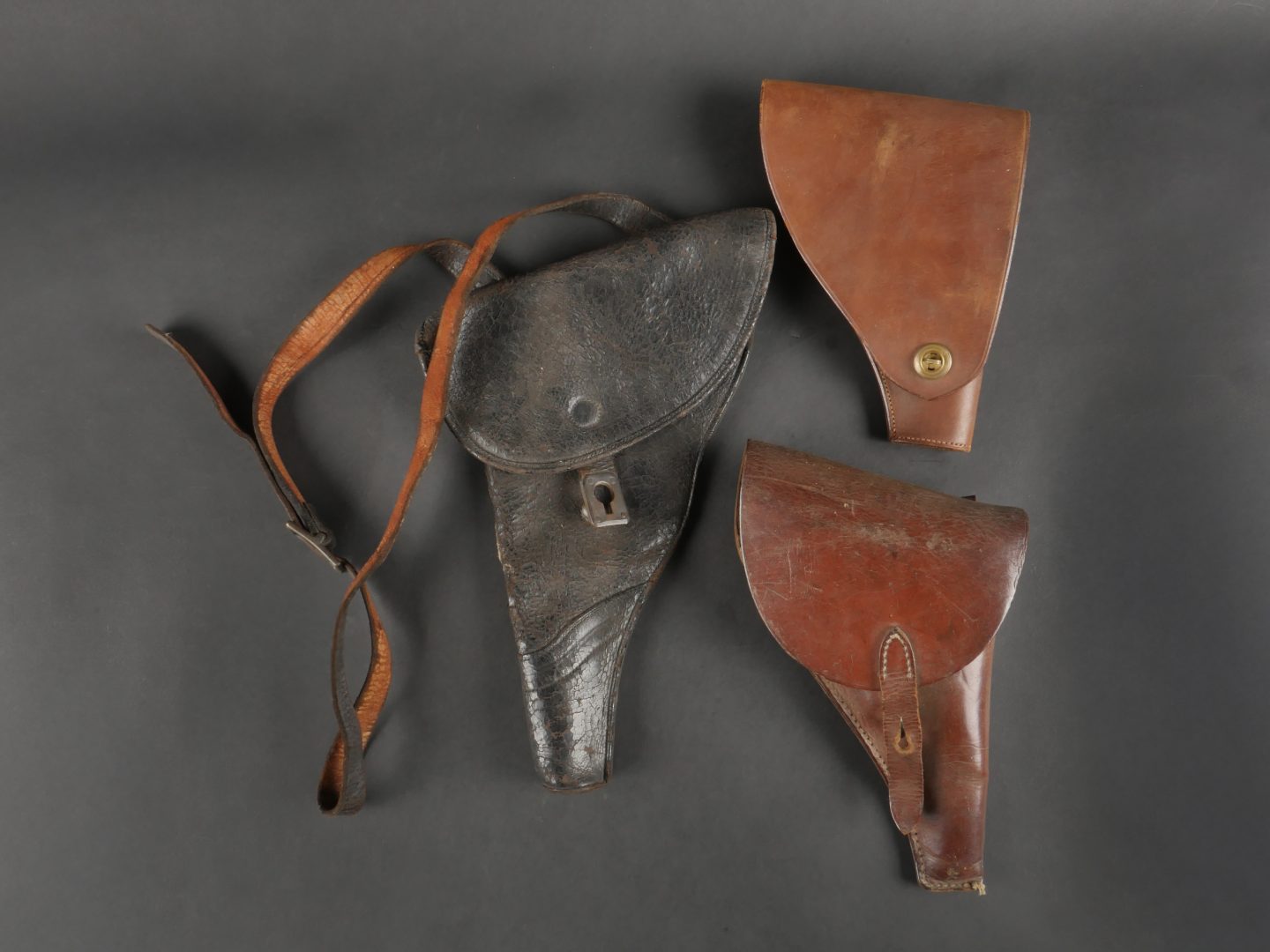 Lot de 3 étuis de revolvers dont 1892 et pistolet automatique. Comprenant un bel étui de revolver d’ordonnance 1892 en cuir verni marron, avec tampon de réception ovale sous le rabat, ses... en savoir plus