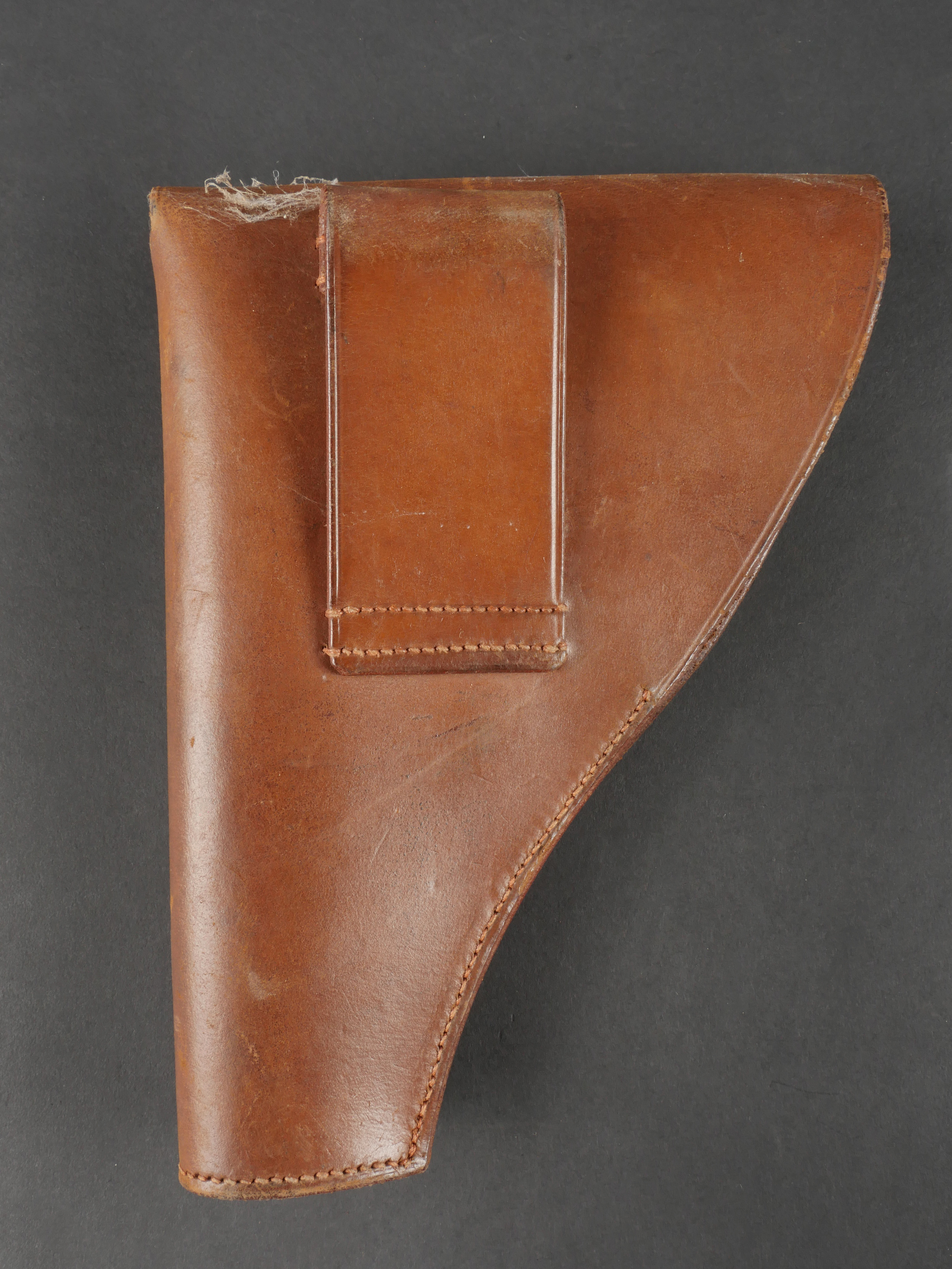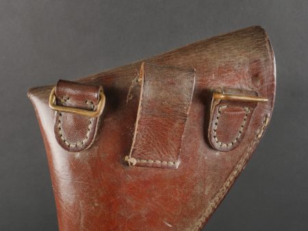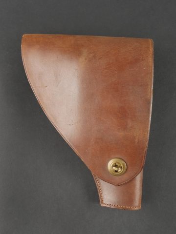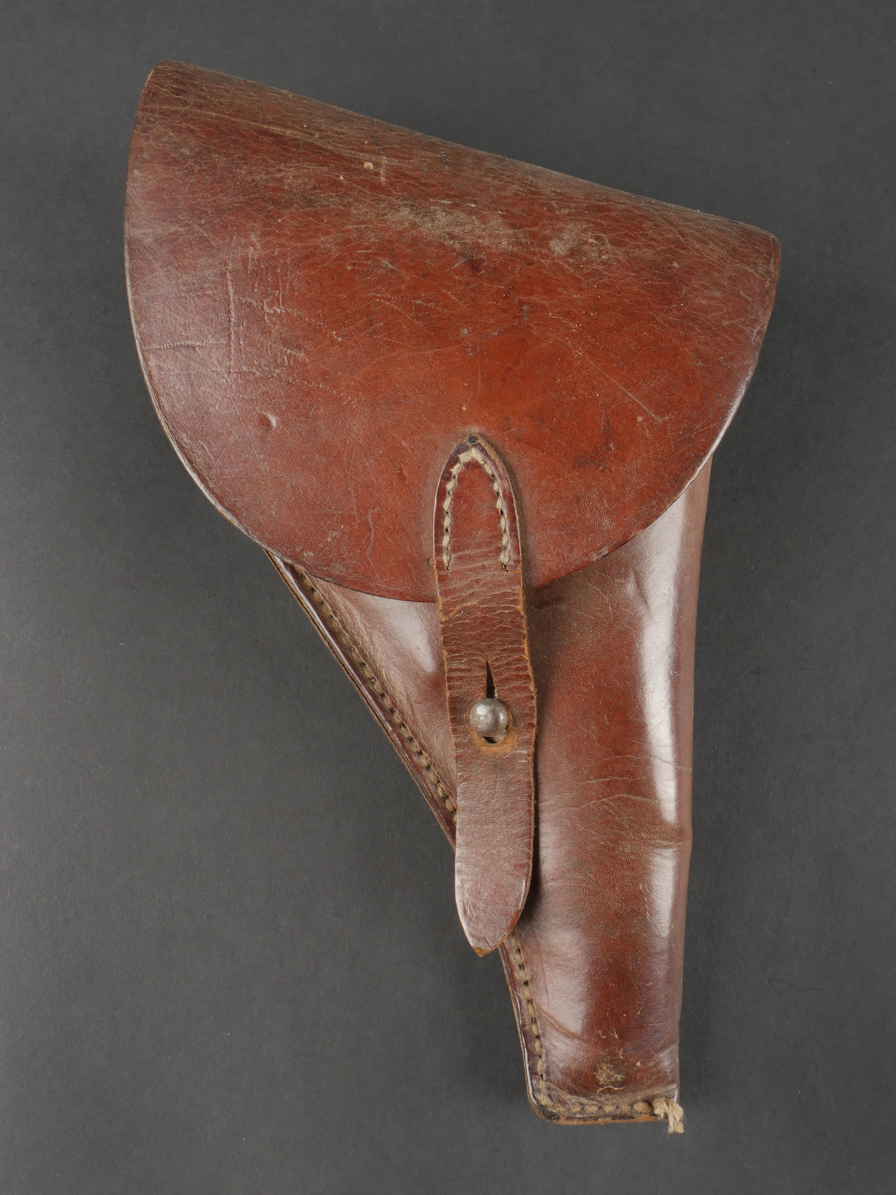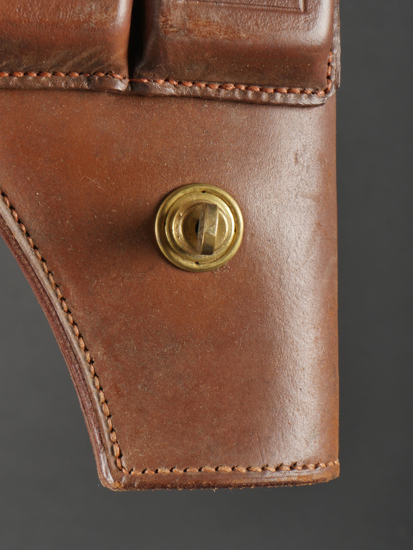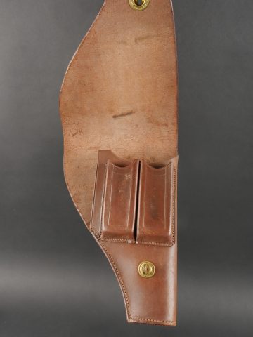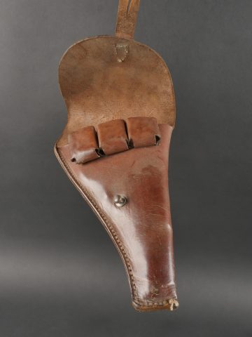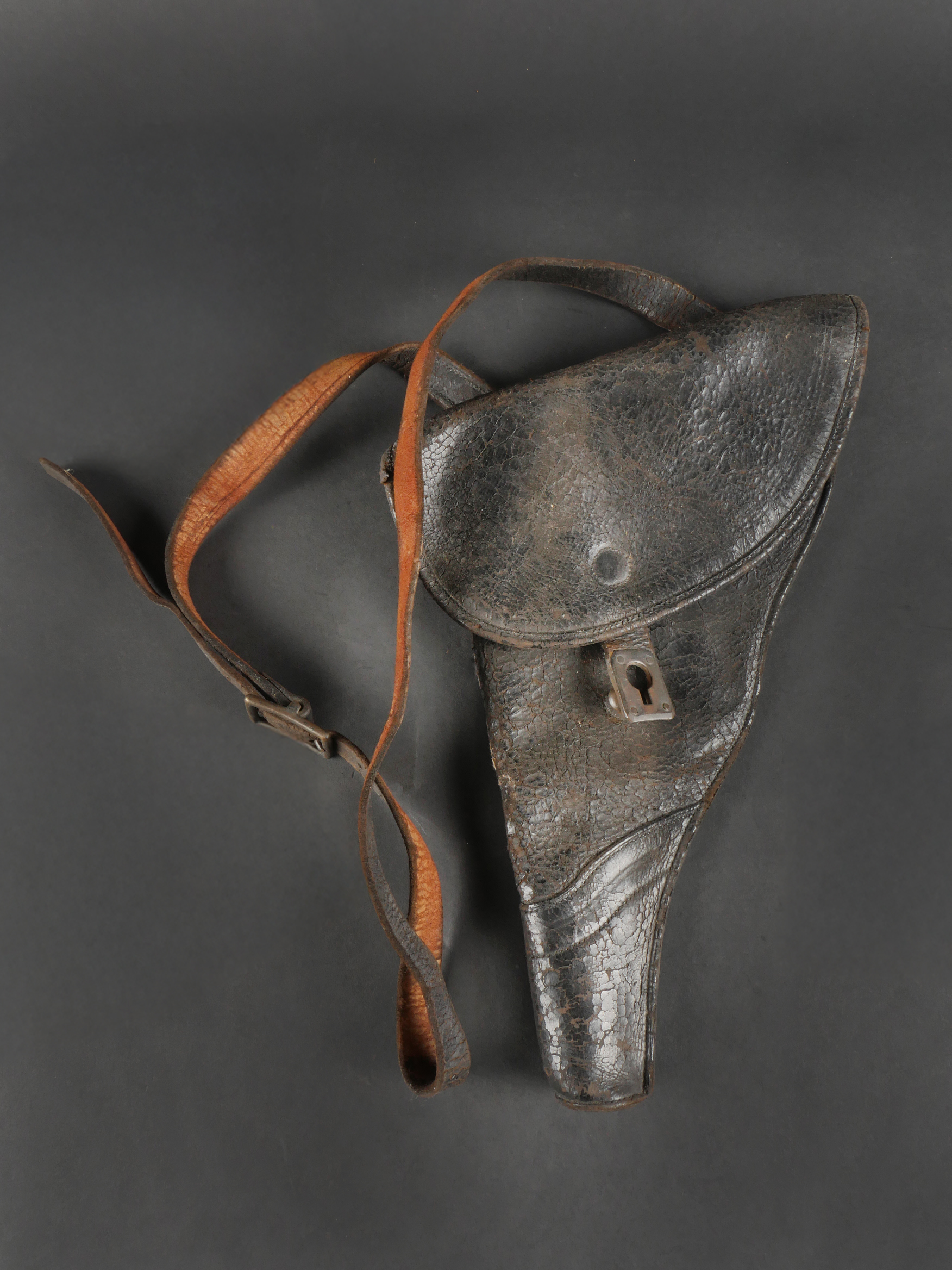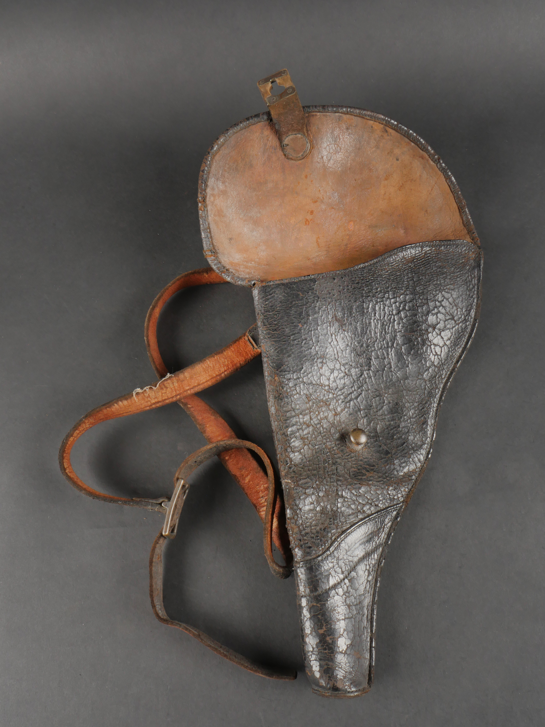 Lot de 3 étuis de revolvers dont 1892 et pistolet automatique. Comprenant un bel étui de revolver d’ordonnance 1892 en cuir verni marron, avec tampon de réception ovale sous le rabat, ses 3 pochettes à cartouches, son passant de ceinturon et ses anneaux, sans bretelle. Un étui de PA en cuir fauve avec système de fermeture à clé pivotante, au dos l’œillet est marqué Tourniquet Bouton breveté SGDB avec emplacement pour deux chargeurs. Et un grand et curieux étui en cuir noir pour un grand revolver qui devait faire environ 30 cm de longueur totale, système de fermeture type serrure. Avec petit passant de ceinturon et bretelle de suspension. Usure, craquelures du cuir. Possiblement un étui d’officier de la guerre de 1870. Lot of Three Revolver Holsters including 1892 Model and Automatic Pistol Includes a fine Model 1892 service revolver holster in brown varnished leather with oval acceptance stamp under the flap, three cartridge pockets, belt loop, and metal rings, without strap. A light brown leather automatic pistol holster with rotating key closure system, marked on the rear eyelet “Tourniquet Bouton breveté SGDB,” with space for two magazines. Also a large and unusual black leather holster for a revolver about 30 cm long, with lock-type closure, small belt loop, and suspension strap. Wear, leather cracking. Possibly an officer’s holster from the Franco-Prussian War.