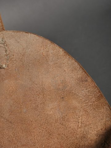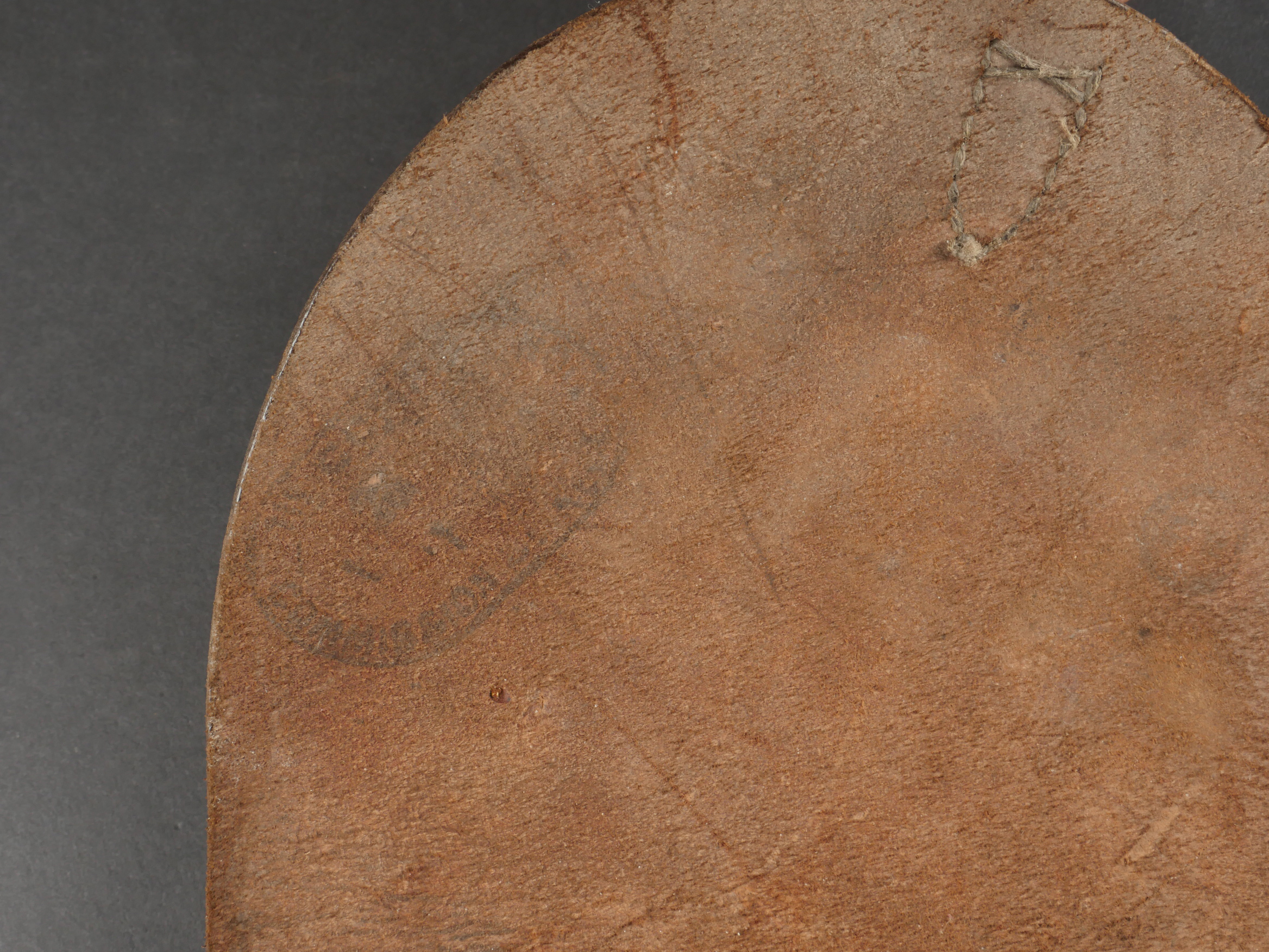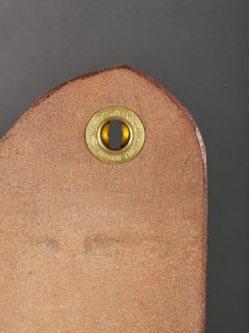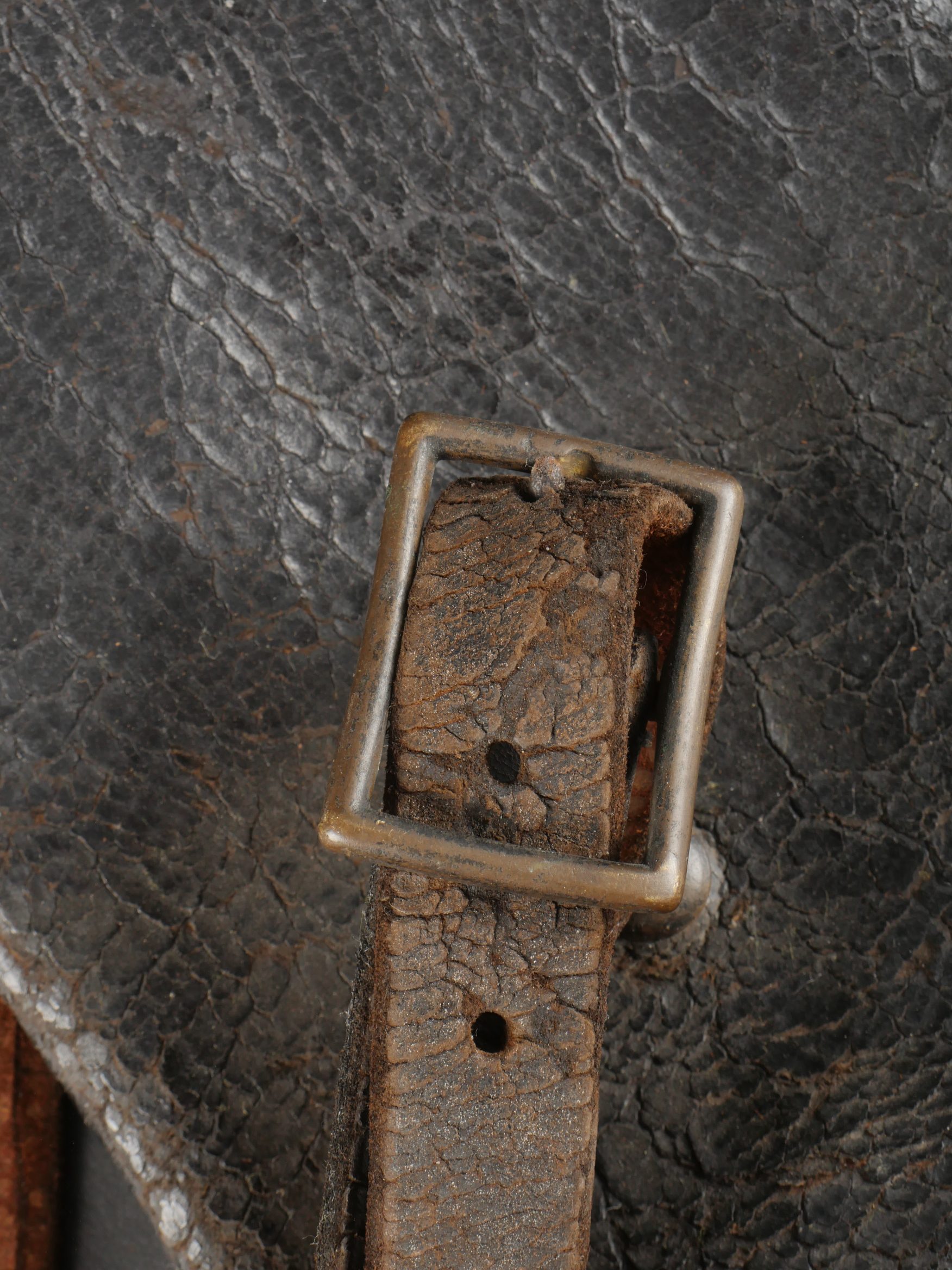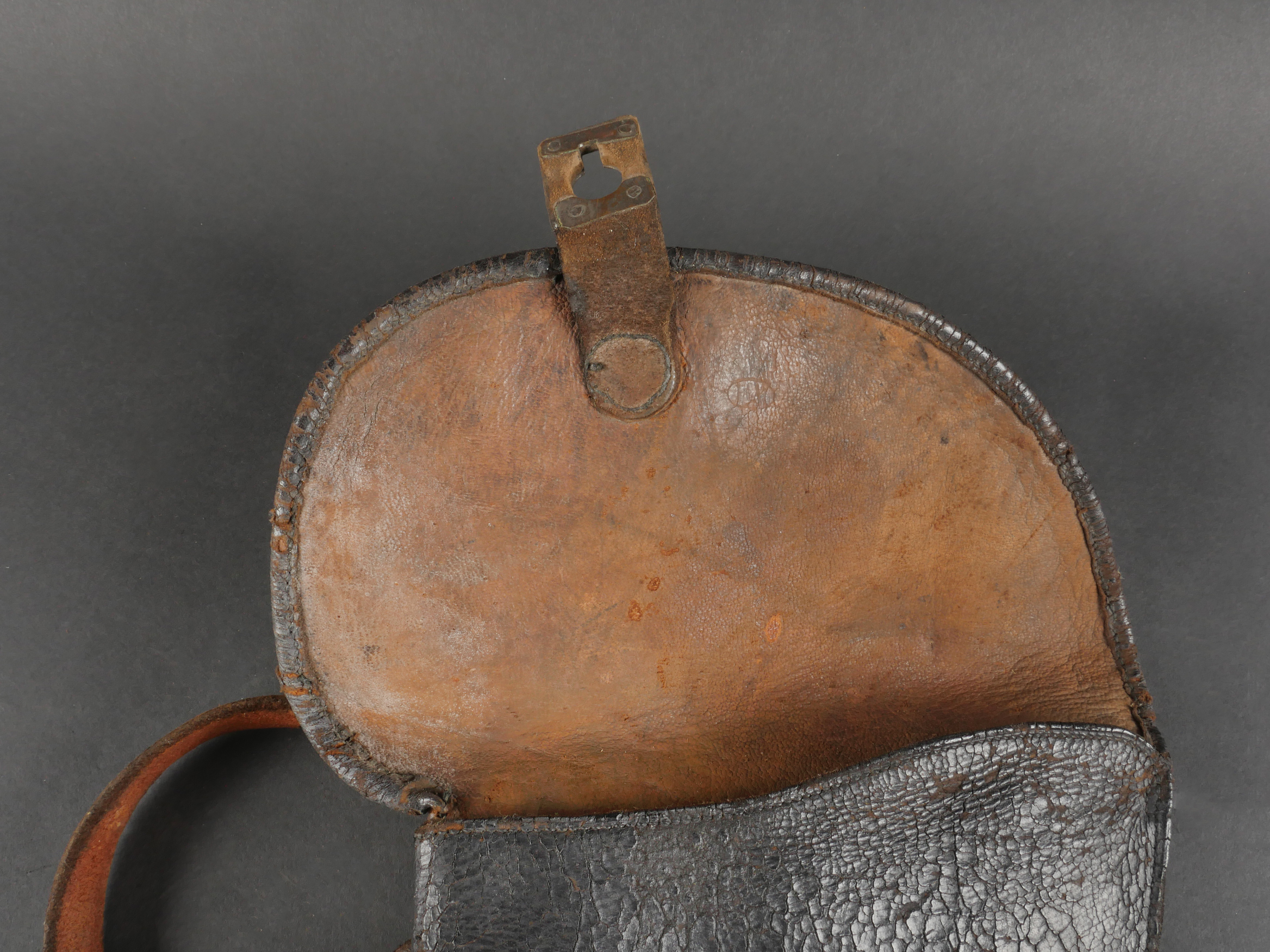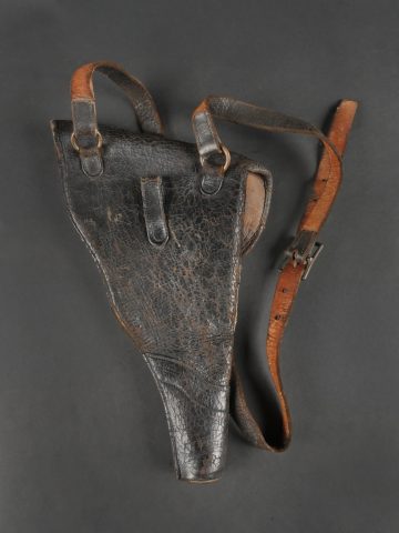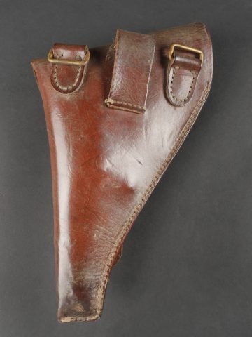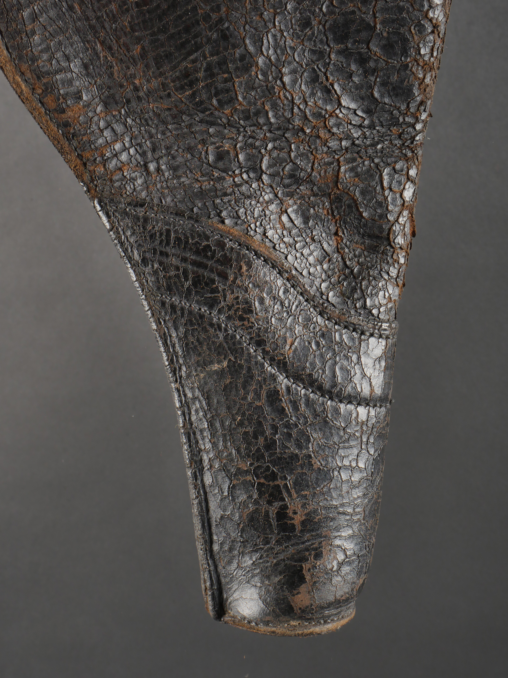 Lot de 3 étuis de revolvers dont 1892 et pistolet automatique. Comprenant un bel étui de revolver d’ordonnance 1892 en cuir verni marron, avec tampon de réception ovale sous le rabat, ses 3 pochettes à cartouches, son passant de ceinturon et ses anneaux, sans bretelle. Un étui de PA en cuir fauve avec système de fermeture à clé pivotante, au dos l’œillet est marqué Tourniquet Bouton breveté SGDB avec emplacement pour deux chargeurs. Et un grand et curieux étui en cuir noir pour un grand revolver qui devait faire environ 30 cm de longueur totale, système de fermeture type serrure. Avec petit passant de ceinturon et bretelle de suspension. Usure, craquelures du cuir. Possiblement un étui d’officier de la guerre de 1870. Lot of Three Revolver Holsters including 1892 Model and Automatic Pistol Includes a fine Model 1892 service revolver holster in brown varnished leather with oval acceptance stamp under the flap, three cartridge pockets, belt loop, and metal rings, without strap. A light brown leather automatic pistol holster with rotating key closure system, marked on the rear eyelet “Tourniquet Bouton breveté SGDB,” with space for two magazines. Also a large and unusual black leather holster for a revolver about 30 cm long, with lock-type closure, small belt loop, and suspension strap. Wear, leather cracking. Possibly an officer’s holster from the Franco-Prussian War.