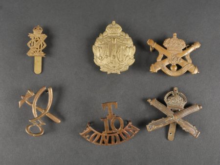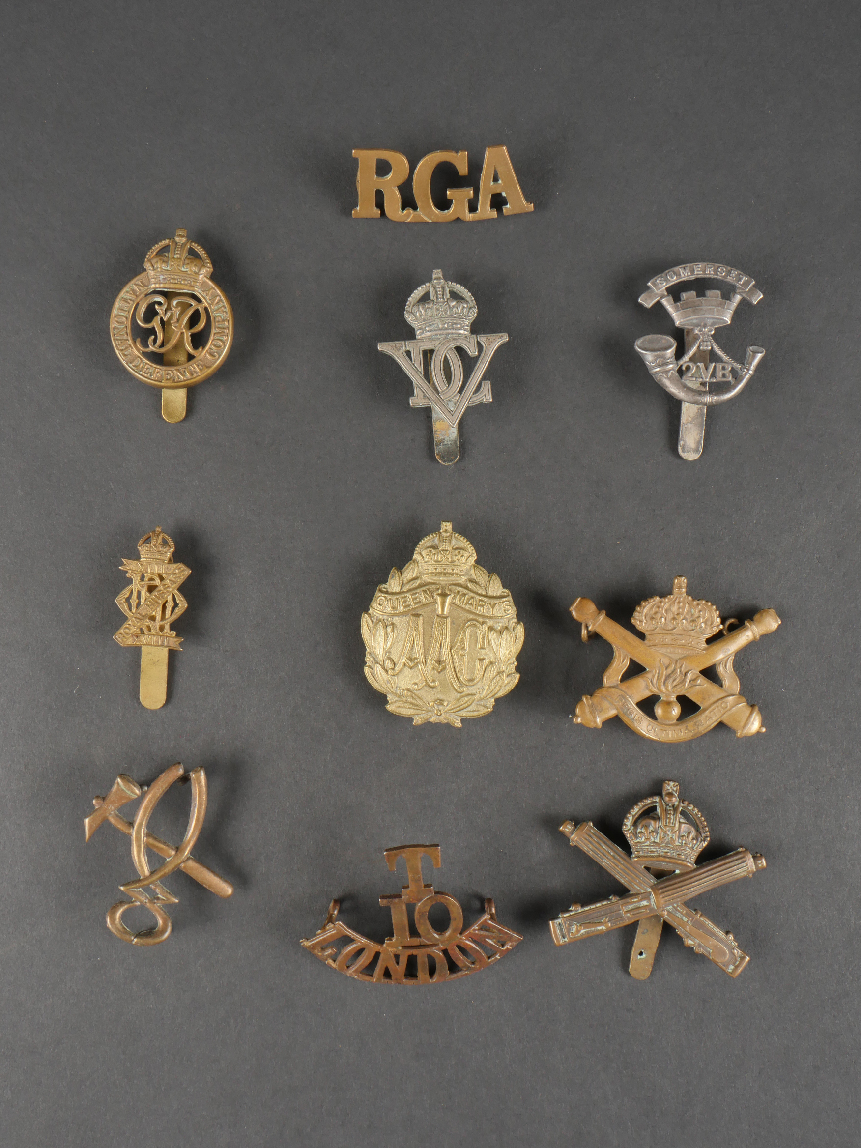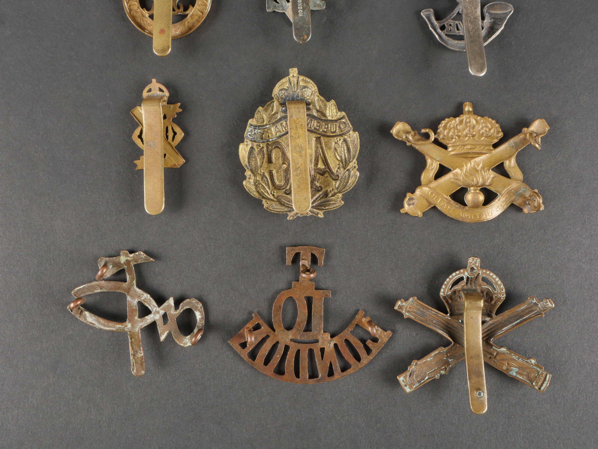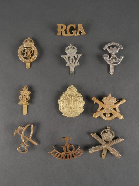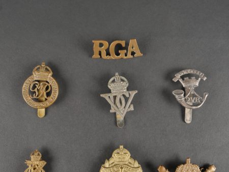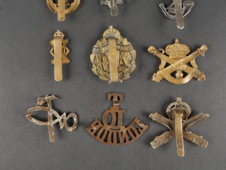 Lot d’insignes anglais et belge. Lot de 9 insignes de diverses époques dont un pre-1914 2nd Volunteers Battalion Somerset Light Infantry, en WW1 un intéressant title Territorial 10th London Regiment avec ses lugs, un cap badge Machine Gun Corps et un du 5th Royal Inniskilling Dragoon Guards, title Kings Royal Rifles. Également des badges WW2. Tous avec leurs attaches, on joint un badge belge d’artillerie post 1918. Bon état. Lot of British and Belgian InsigniaSet of nine badges from various periods including a pre-1914 “2nd Volunteer Battalion Somerset Light Infantry,” a WWI “Territorial 10th London Regiment” title, a “Machine Gun Corps” badge, a “5th Royal Inniskilling Dragoon Guards” badge, and a “King’s Royal Rifles” title. Also includes WWII badges and a post-1918 Belgian artillery badge. All with fittings, good condition.