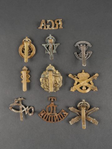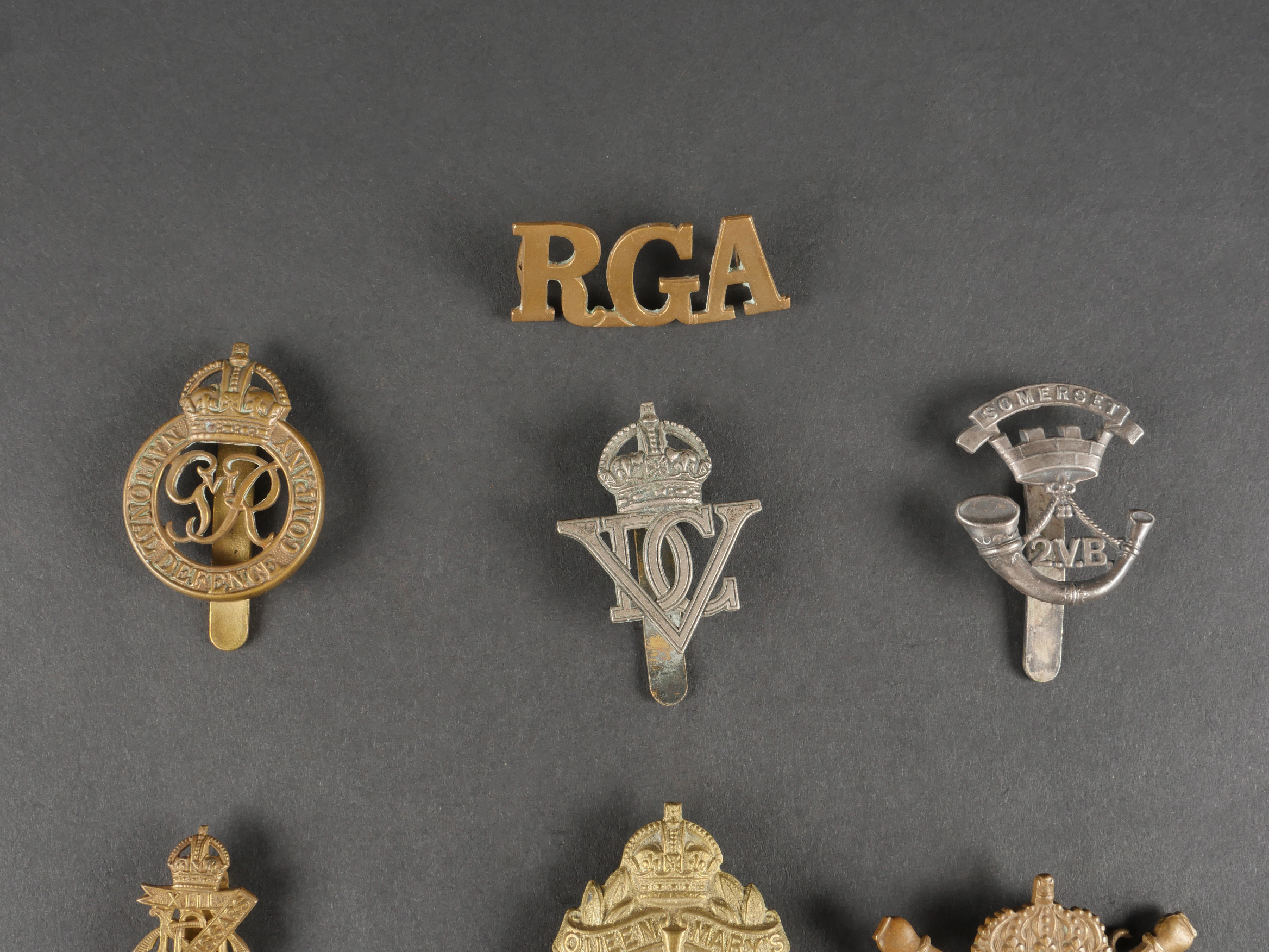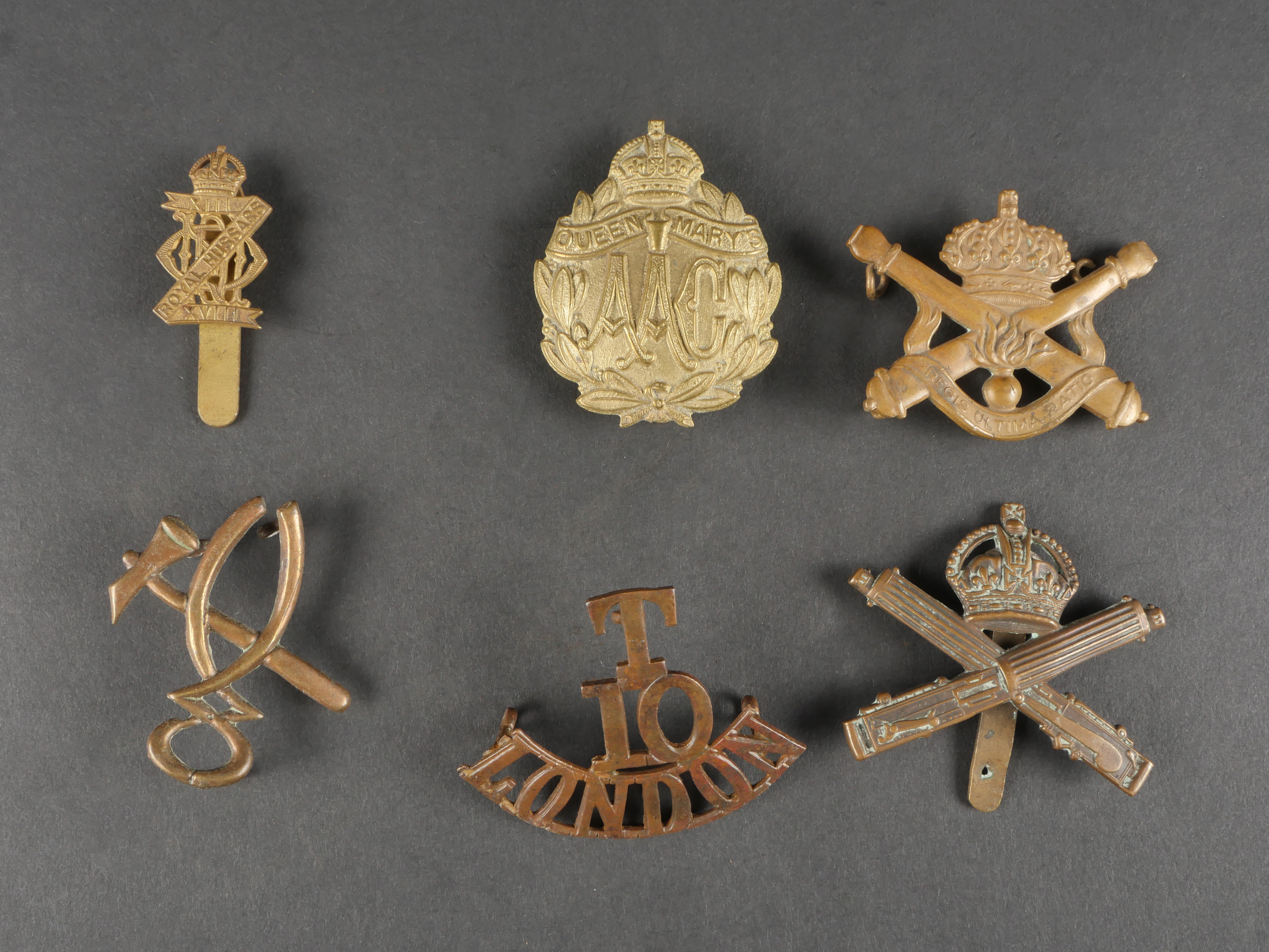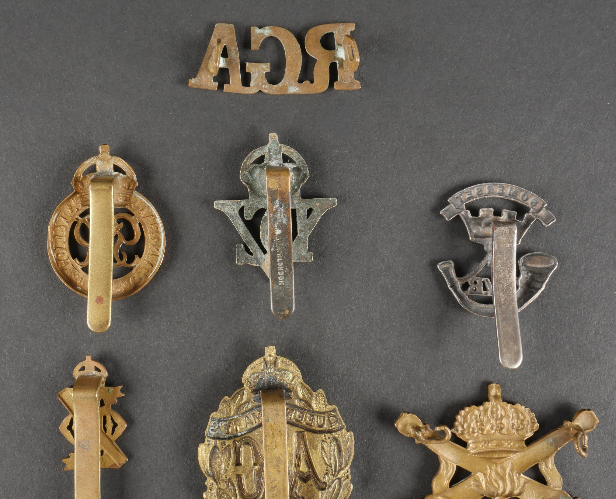 Lot d’insignes anglais et belge. Lot de 9 insignes de diverses époques dont un pre-1914 2nd Volunteers Battalion Somerset Light Infantry, en WW1 un intéressant title Territorial 10th London Regiment avec ses lugs, un cap badge Machine Gun Corps et un du 5th Royal Inniskilling Dragoon Guards, title Kings Royal Rifles. Également des badges WW2. Tous avec leurs attaches, on joint un badge belge d’artillerie post 1918. Bon état. Lot of British and Belgian InsigniaSet of nine badges from various periods including a pre-1914 “2nd Volunteer Battalion Somerset Light Infantry,” a WWI “Territorial 10th London Regiment” title, a “Machine Gun Corps” badge, a “5th Royal Inniskilling Dragoon Guards” badge, and a “King’s Royal Rifles” title. Also includes WWII badges and a post-1918 Belgian artillery badge. All with fittings, good condition.