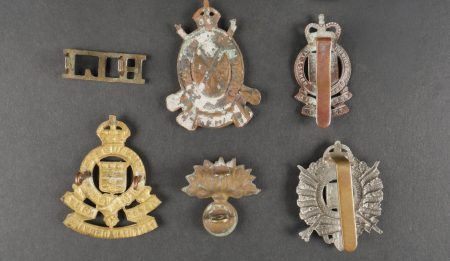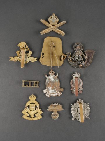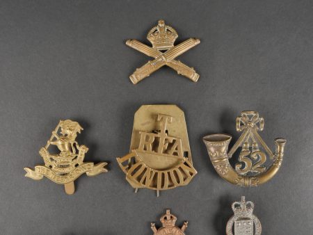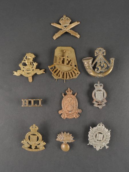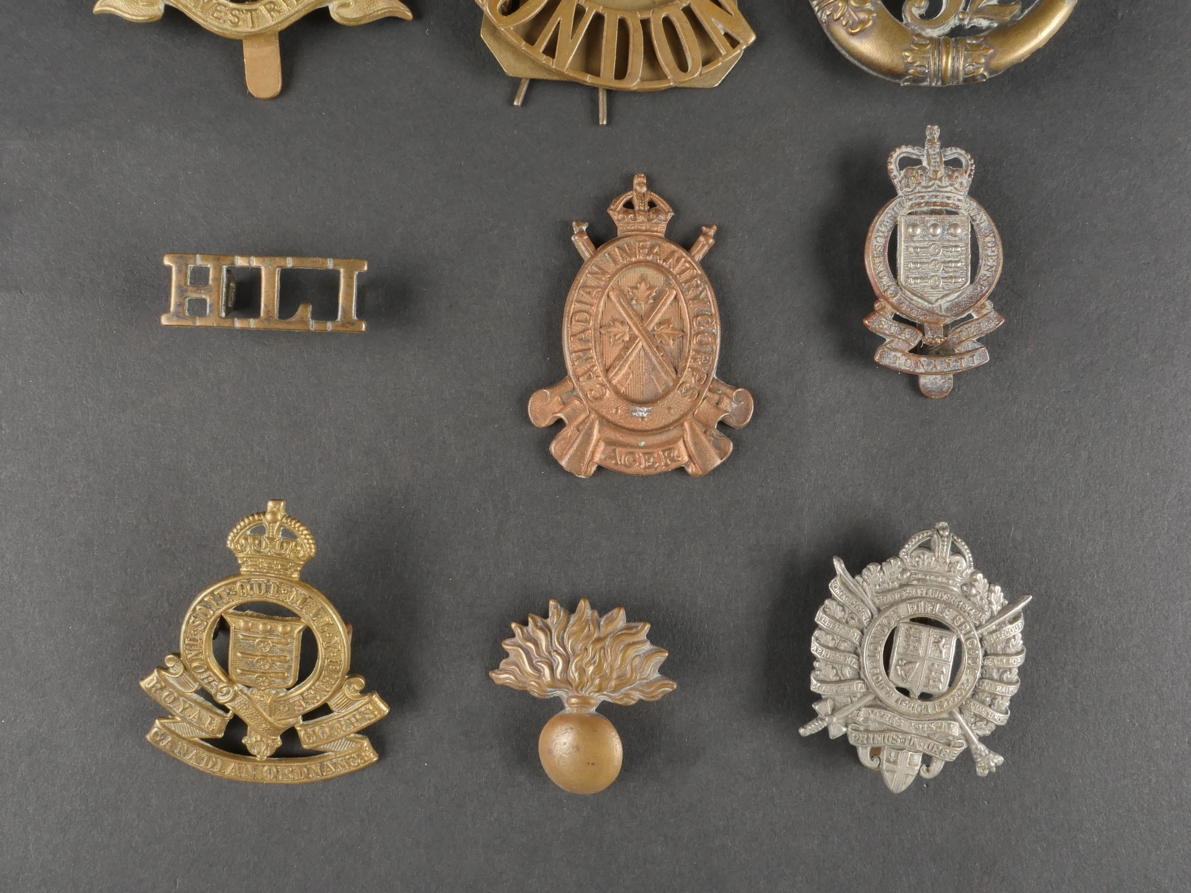 Lot d’insignes anglais et empire britannique. Lot de 10 insignes de diverses époques dont un pre-1914 52nd Oxfordshire Regiment of Foot Light Infantry, en WW1 un intéressant title Territorial Royal Field London Regiment, un lug manquant, title Highland Light Infantry, un cap badge Machine Gun Corps sans attache. Également des badges WW2. Tous avec leurs attaches sauf le Canadian Infantry Corps. Lot of British and Empire InsigniaSet of ten badges from various periods, including a pre-1914 “52nd Oxfordshire Regiment of Foot Light Infantry,” a WWI “Territorial Royal Field London Regiment” shoulder title (one lug missing), a “Highland Light Infantry” title, and a Machine Gun Corps cap badge without fittings, plus WWII badges. All with fittings except the Canadian Infantry Corps badge.
