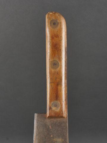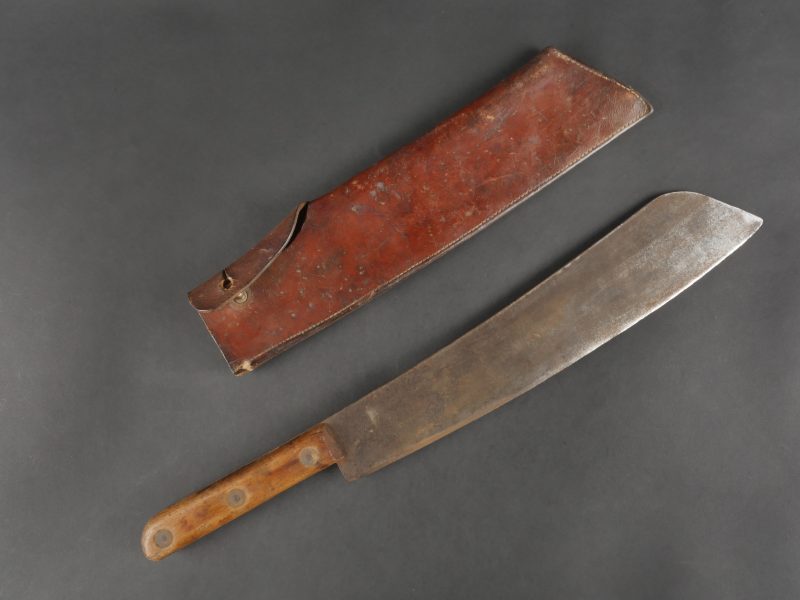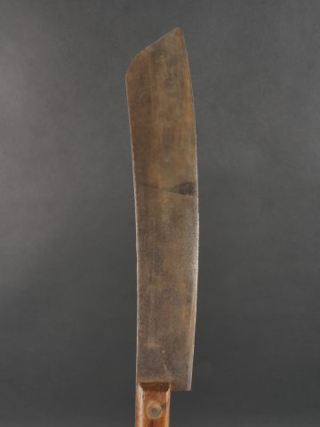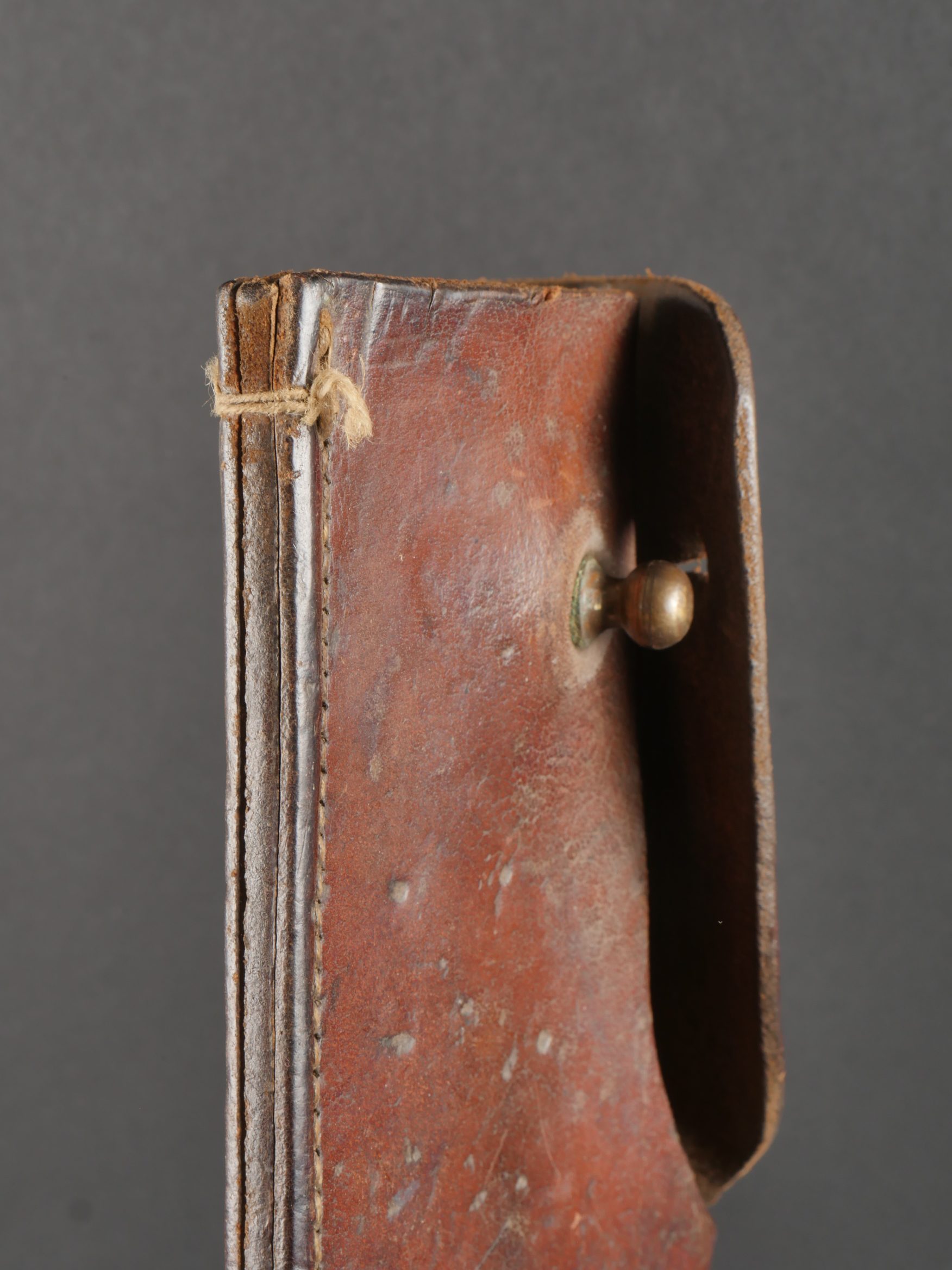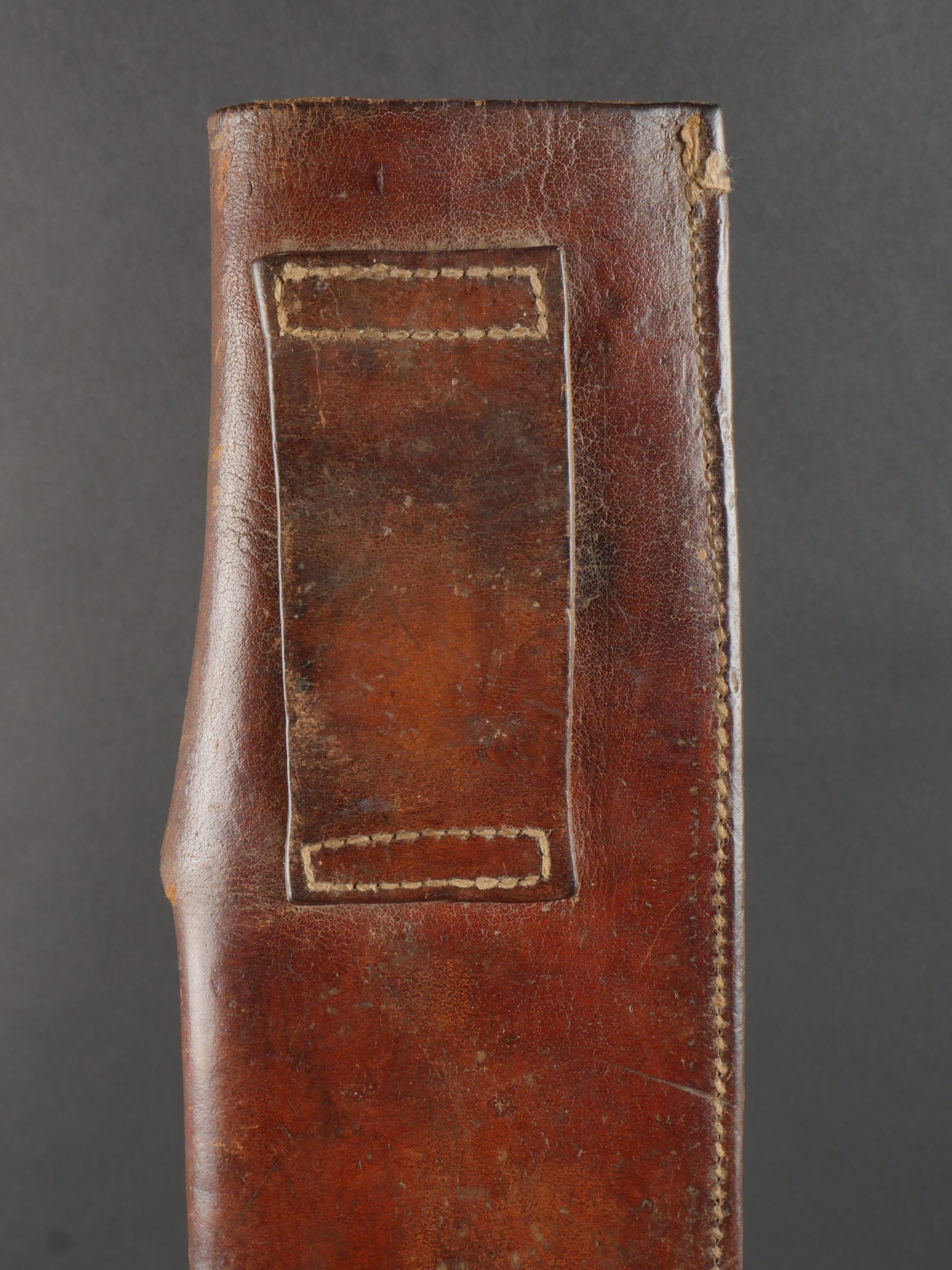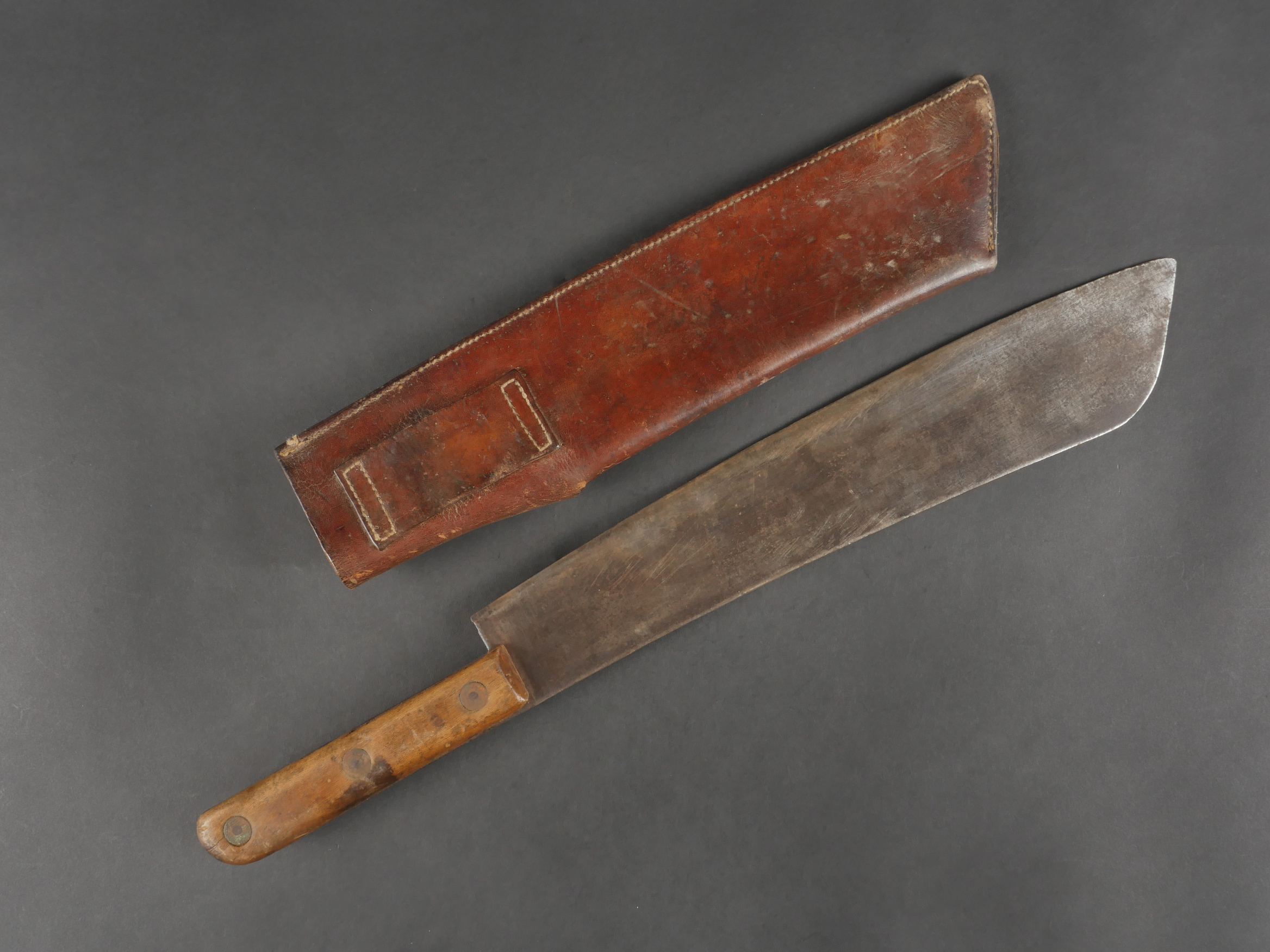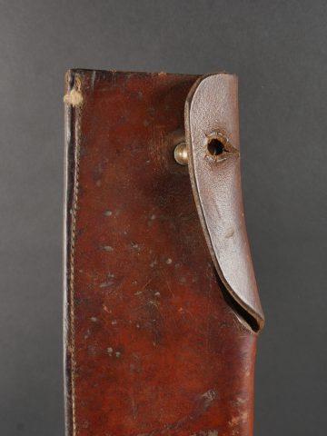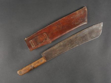 Machette de Tirailleur français 1918 avec son étui cuir/ Forte lame à dos plat, marquée Saut du Tarn 1918, plaquettes bois fixées par 3 gros rivets. Etui en cuir fauve avec son petit rabat et son passant de ceinturon. Cuir souple et coutures solides, bon état. French Tirailleur Machete 1918 with Leather Scabbard Heavy flat-backed blade marked “Saut du Tarn 1918,” wooden grips secured by three large rivets. Light brown leather scabbard with small flap and belt loop. Supple leather, solid stitching, good condition.