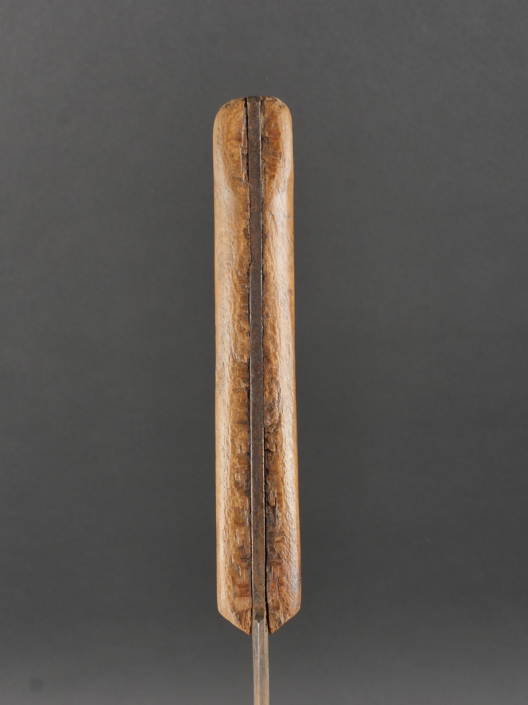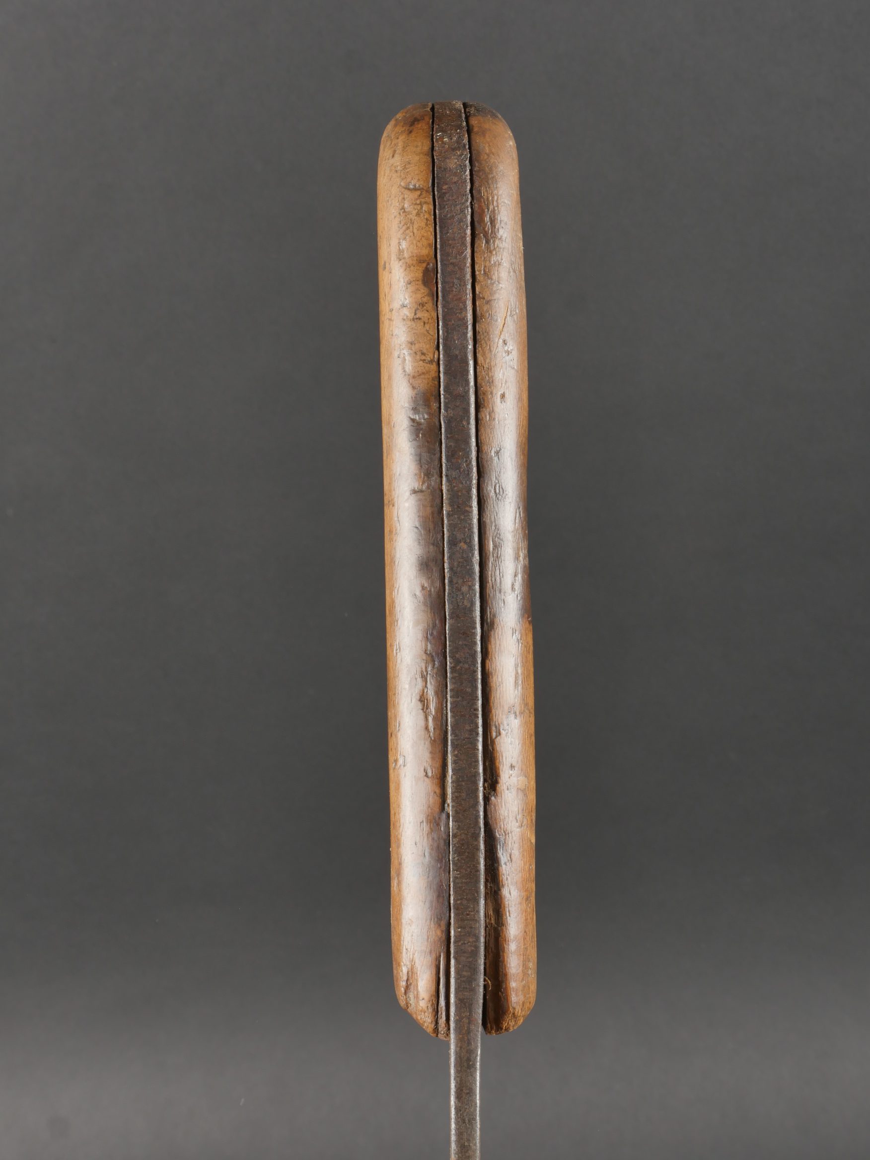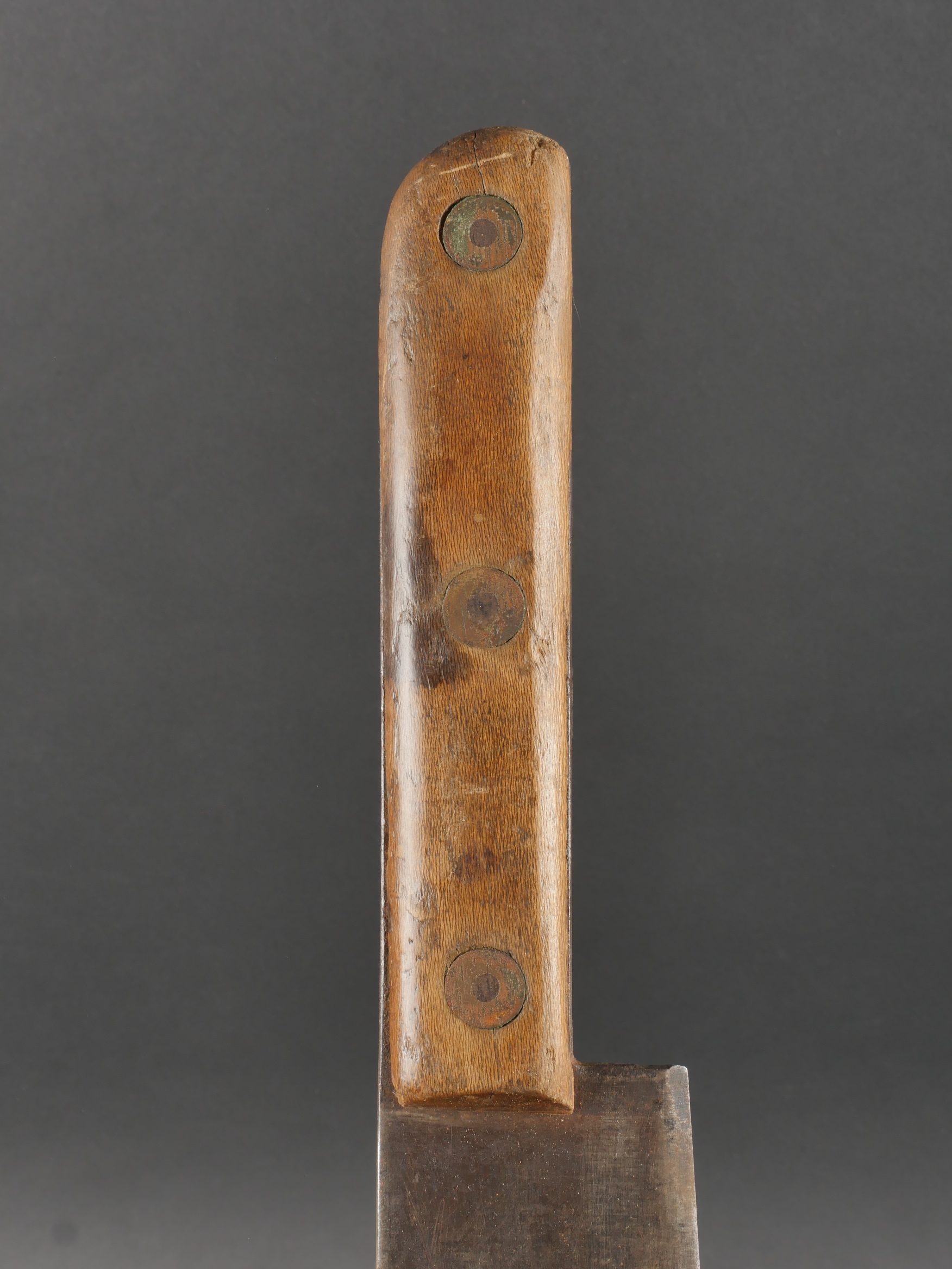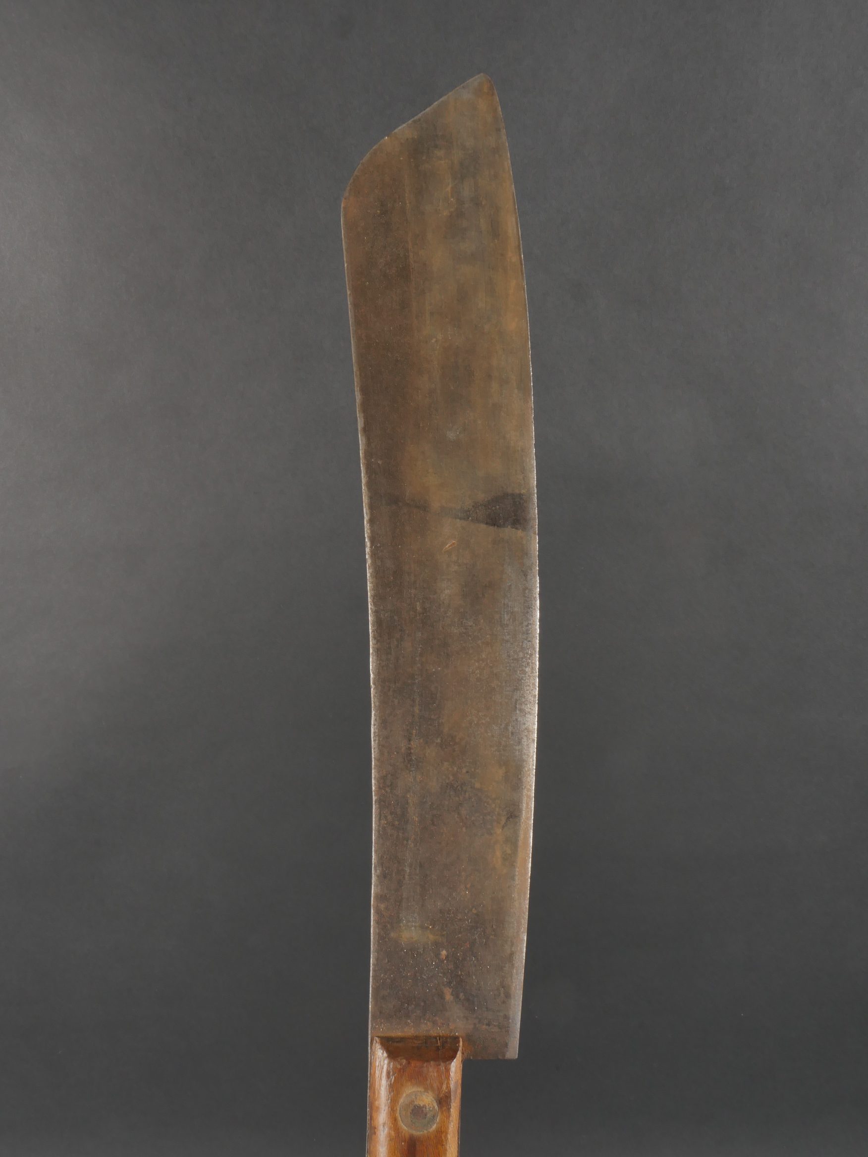 Machette de Tirailleur français 1918 avec son étui cuir/ Forte lame à dos plat, marquée Saut du Tarn 1918, plaquettes bois fixées par 3 gros rivets. Etui en cuir fauve avec son petit rabat et son passant de ceinturon. Cuir souple et coutures solides, bon état. French Tirailleur Machete 1918 with Leather Scabbard Heavy flat-backed blade marked “Saut du Tarn 1918,” wooden grips secured by three large rivets. Light brown leather scabbard with small flap and belt loop. Supple leather, solid stitching, good condition.