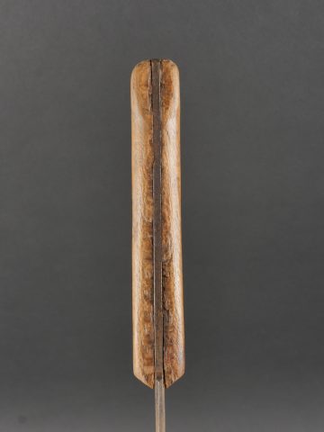 Détails de la vente >Machette de Tirailleur français 1918 avec son étui cuir/ Forte lame à dos plat, marquée Saut du Tarn 1918, plaquettes bois fixées par 3 gros rivets. Etui en cuir fauve avec son petit rabat... en savoir plus