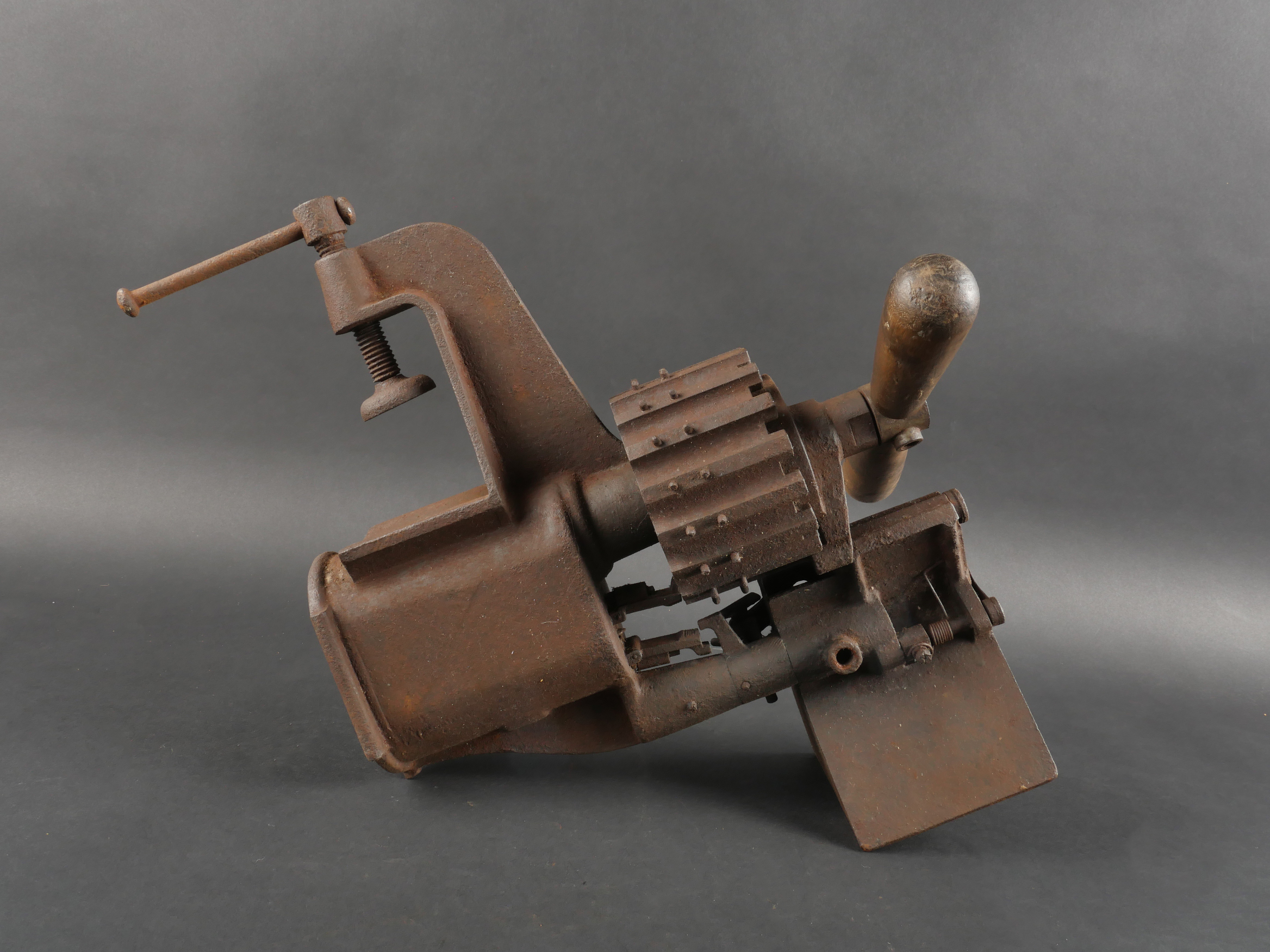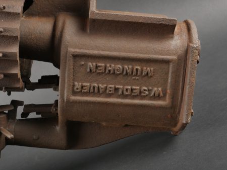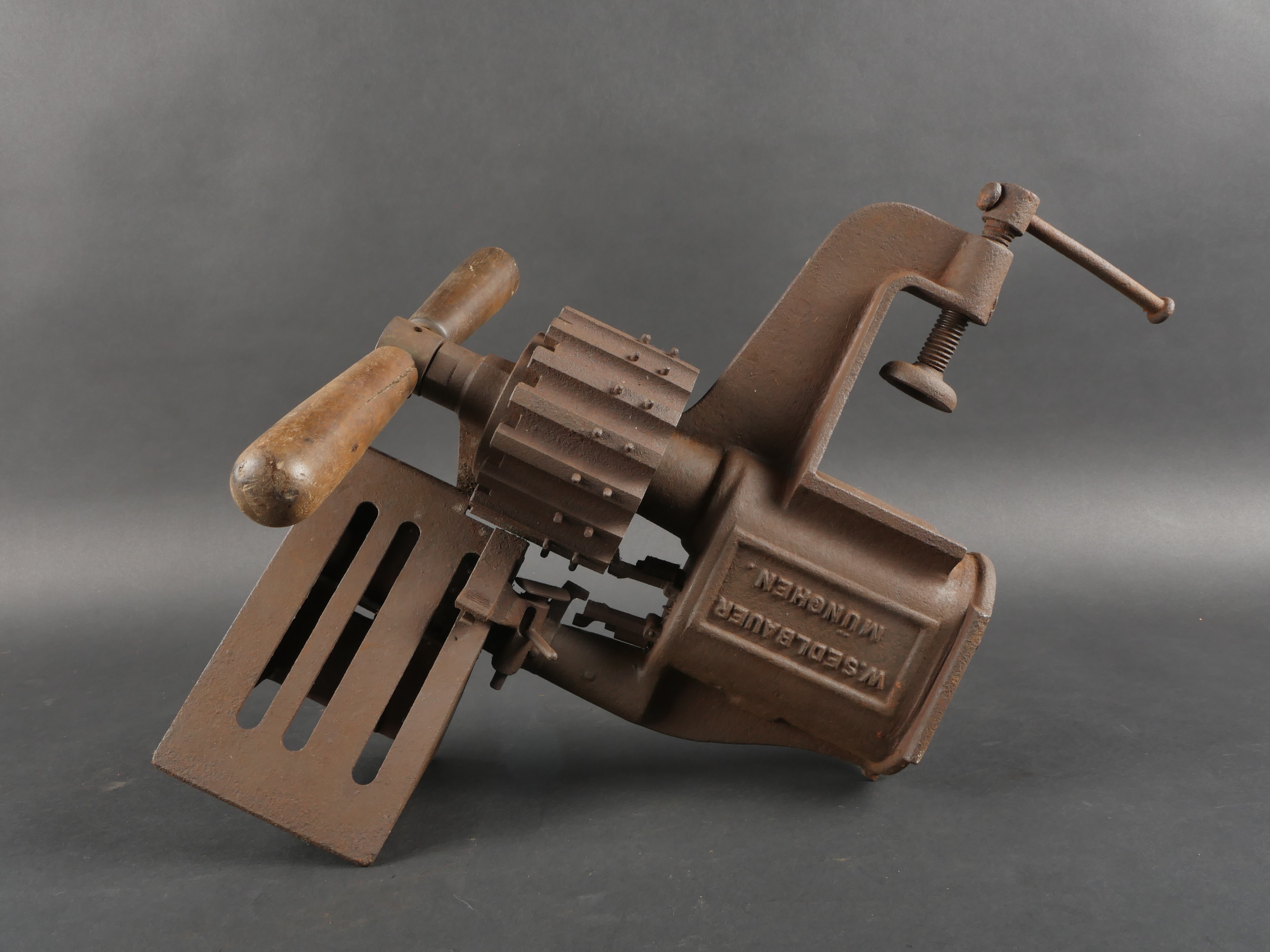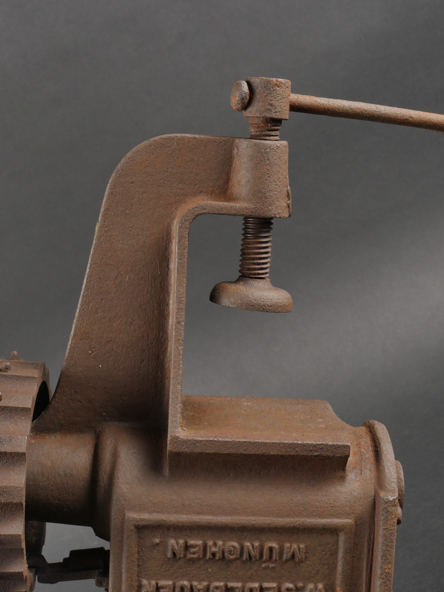 Machine à garnir les bandes pour MG08 Gurtfuller. Garnisseuse de bandes de mitrailleuse allemande MG08, appelé Gurtfüller. Fabricant bavarois W. Sedlbauer München. Vis de serrage de l’étau présente, manette à poignées en bois, panier. Oxydation de surface mais bon état. Parties mobiles grippées. MG08 Ammunition Belt Loader (Gurtfüller) German MG08 belt-filling machine, Bavarian manufacture by “W. Sedlbauer, München.” Clamp screw and wooden-handled lever present, light surface oxidation, moving parts stiff but complete. Good overall condition.
