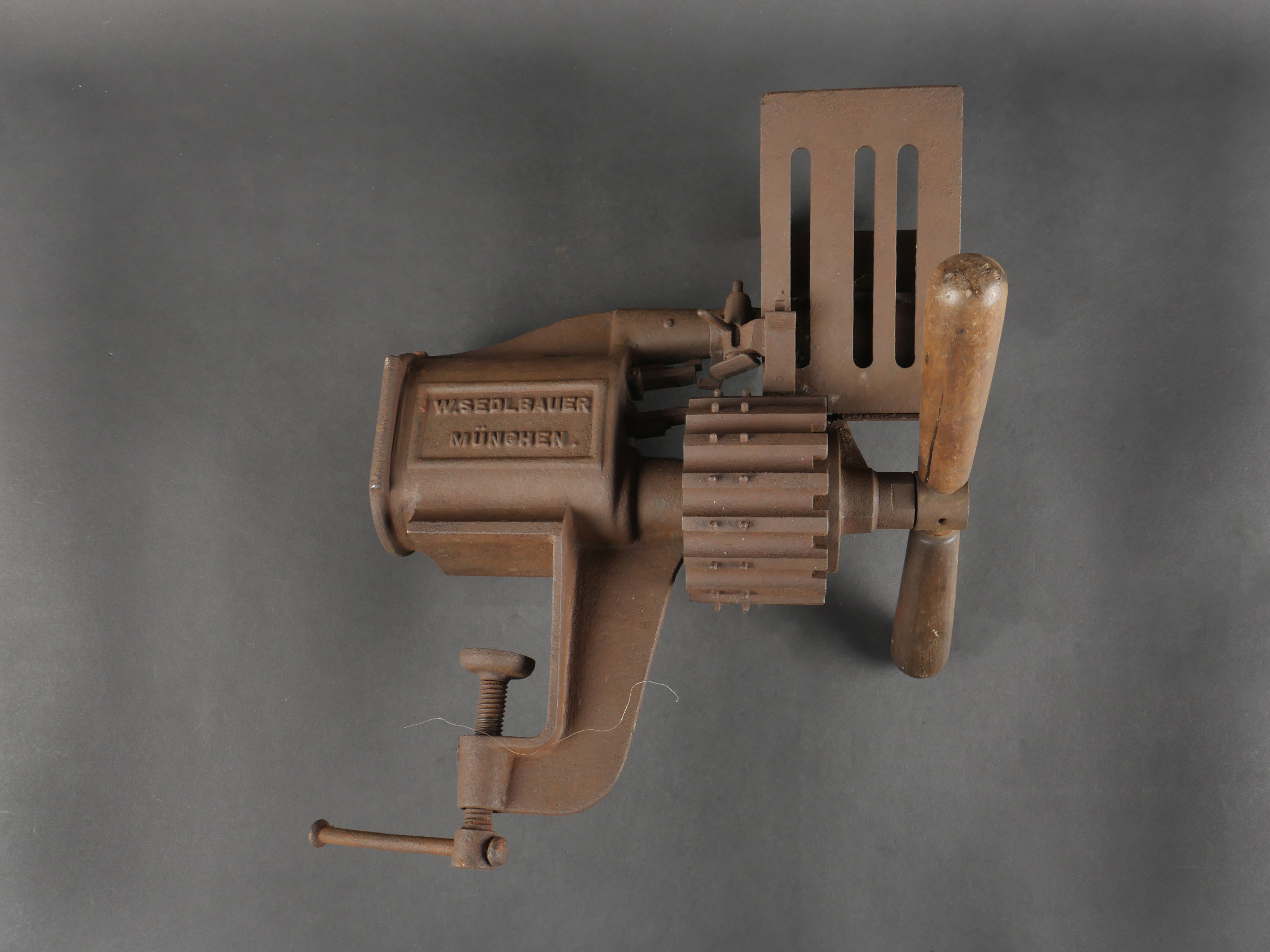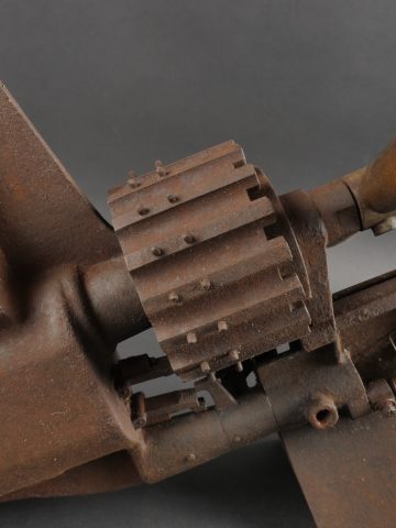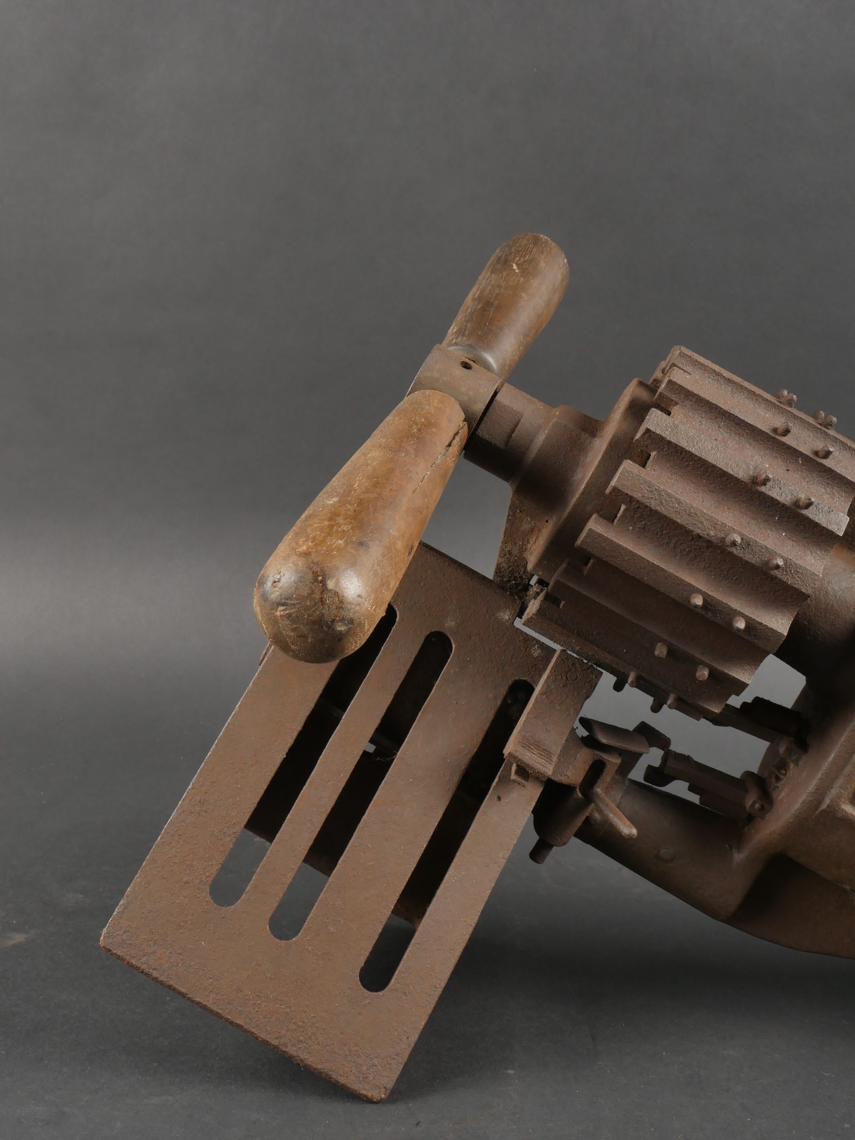 Machine à garnir les bandes pour MG08 Gurtfuller. Garnisseuse de bandes de mitrailleuse allemande MG08, appelé Gurtfüller. Fabricant bavarois W. Sedlbauer München. Vis de serrage de l’étau présente, manette à poignées en bois, panier. Oxydation de surface mais bon état. Parties mobiles grippées. MG08 Ammunition Belt Loader (Gurtfüller) German MG08 belt-filling machine, Bavarian manufacture by “W. Sedlbauer, München.” Clamp screw and wooden-handled lever present, light surface oxidation, moving parts stiff but complete. Good overall condition.
