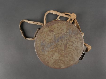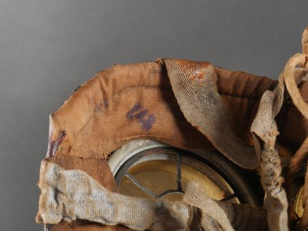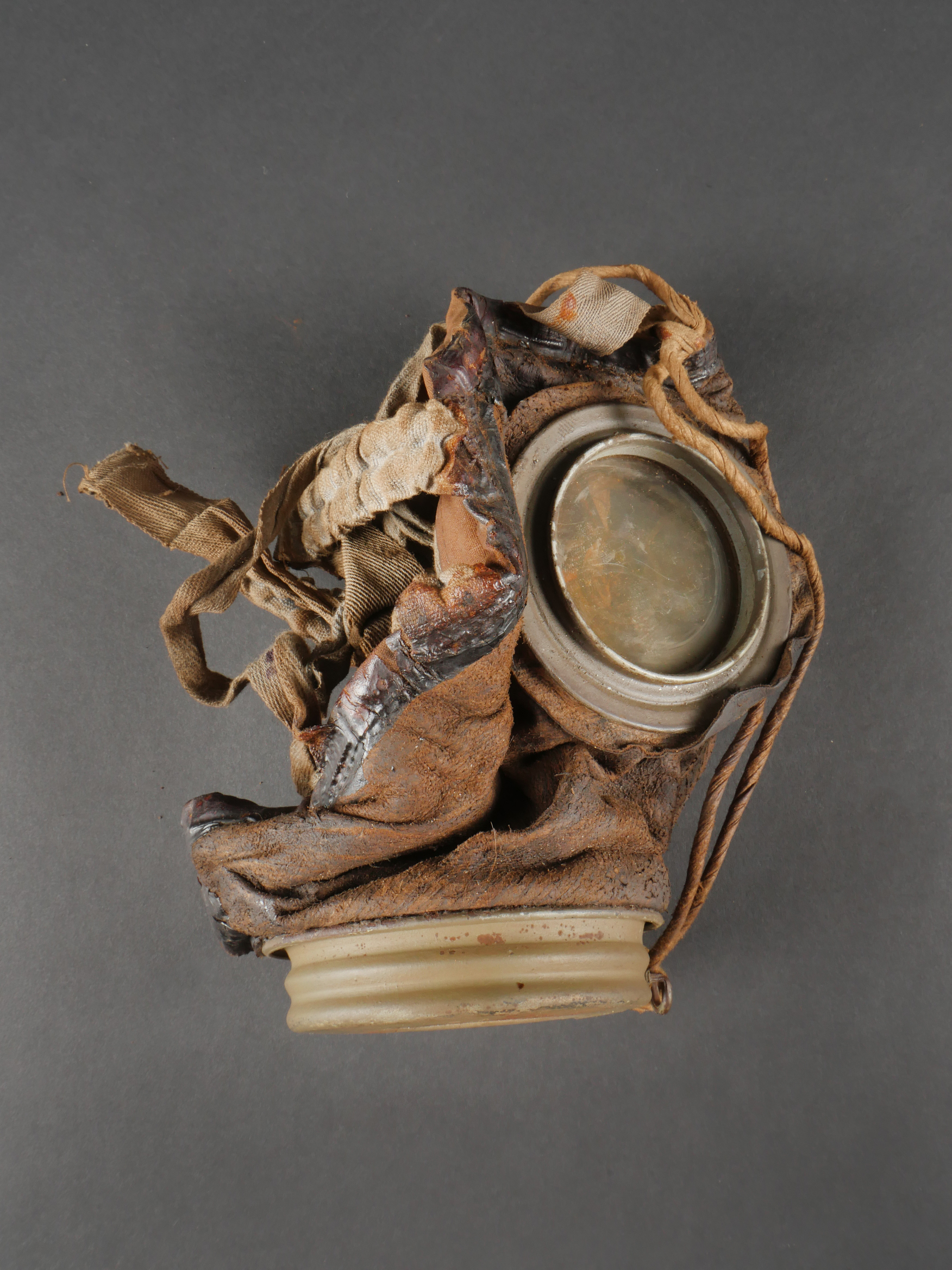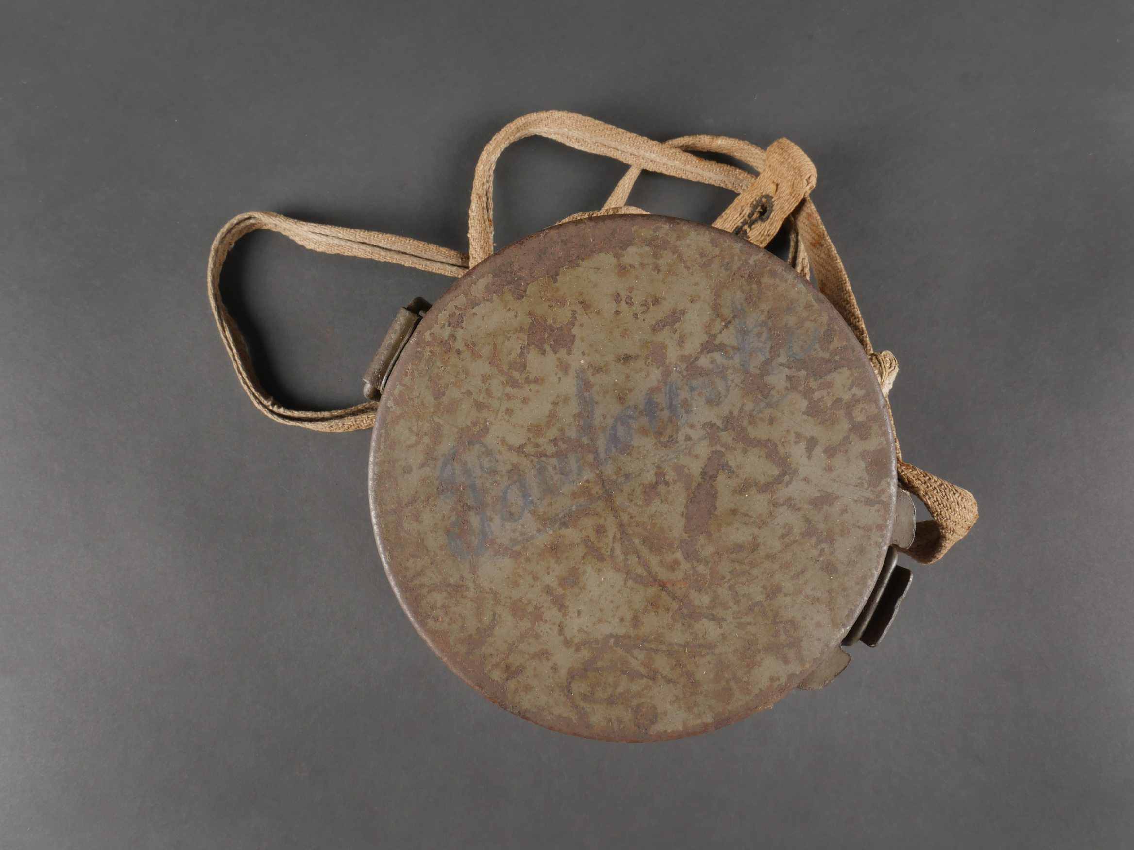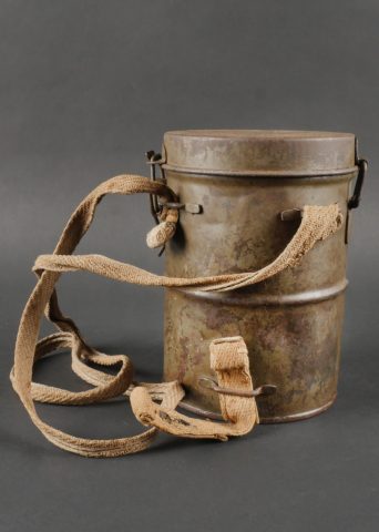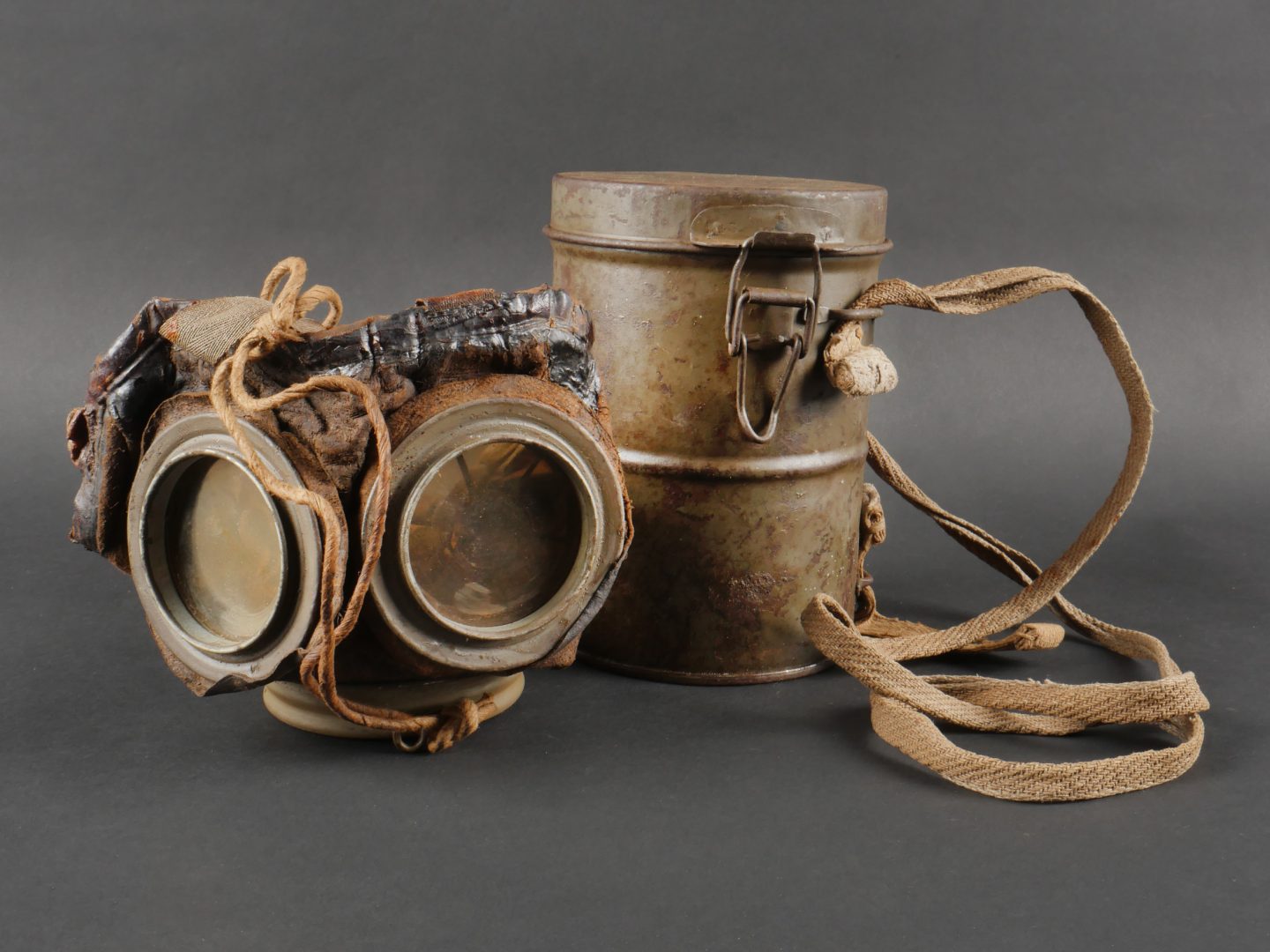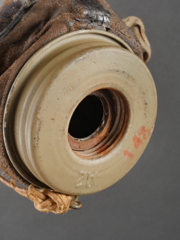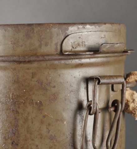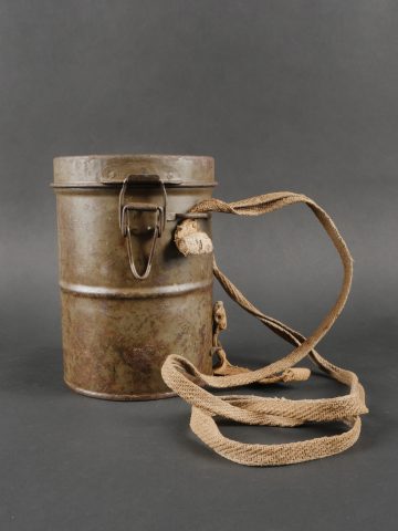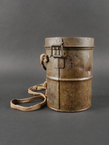 Masque anti-gaz allemand Lederschutzmaske avec boîtier nominatif. Masque anti-gaz en cuir, en bel état, souple, avec toutes ses sangles et sa cordelette. Optiques renforcés. Sans cartouche. Dans son boîtier en tole peinte feldgrau, plus de 70% de peinture, usure, légère oxydation. Couverle interne présent mais détaché, un oculaire de rechange. Avec ses sangles ersatz en ortie. Nom manuscrit sur le couvercle. German Gas Mask with Named Canister Leather gas mask in supple condition, complete with all straps and cord. Reinforced lenses. No filter. Metal canister in field-grey paint, about 70% remaining, with slight wear and oxidation. Inner lid present but detached, includes one spare lens. Ersatz nettle-fiber carrying straps. Handwritten name on the lid.