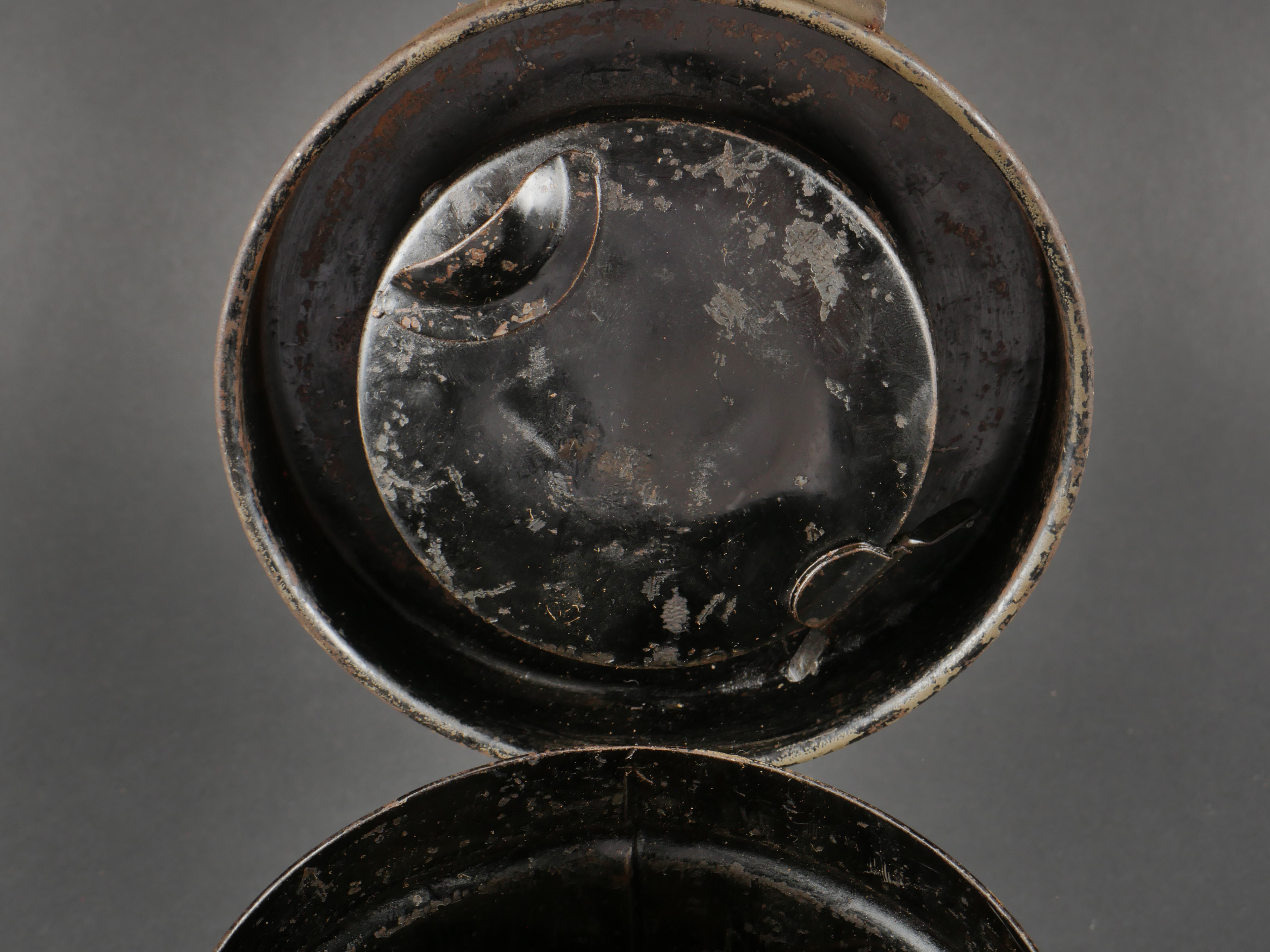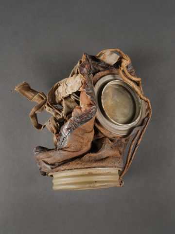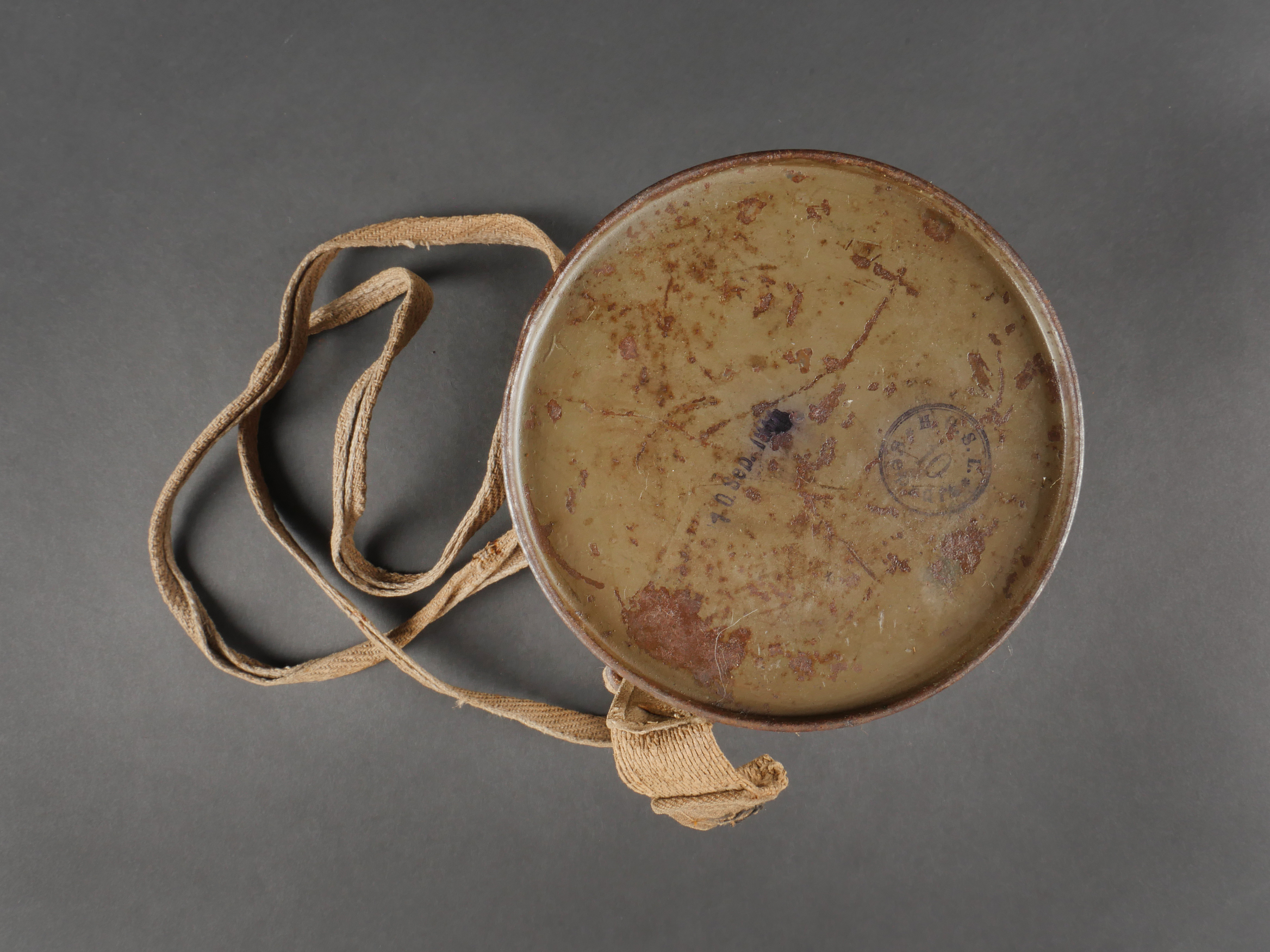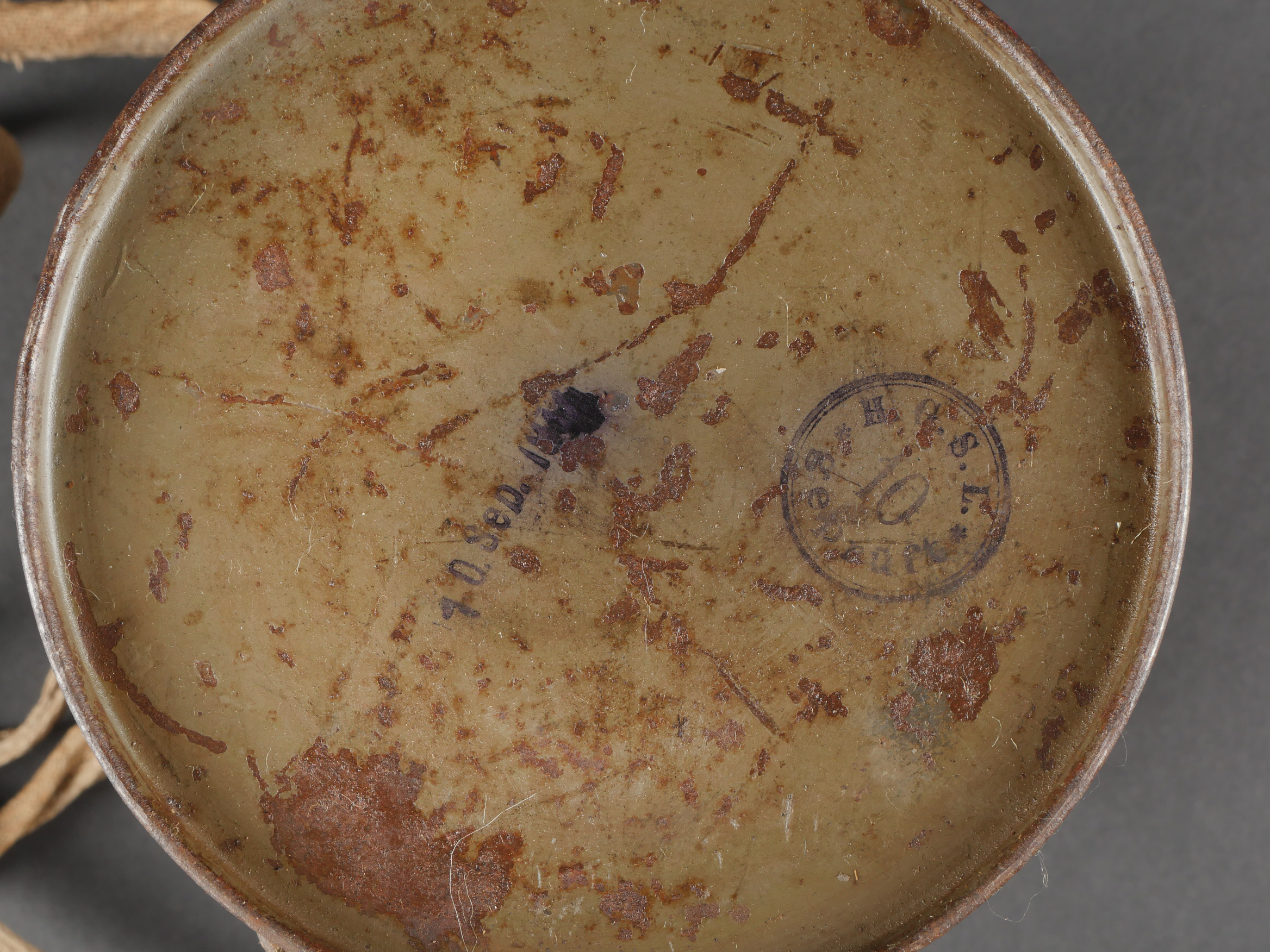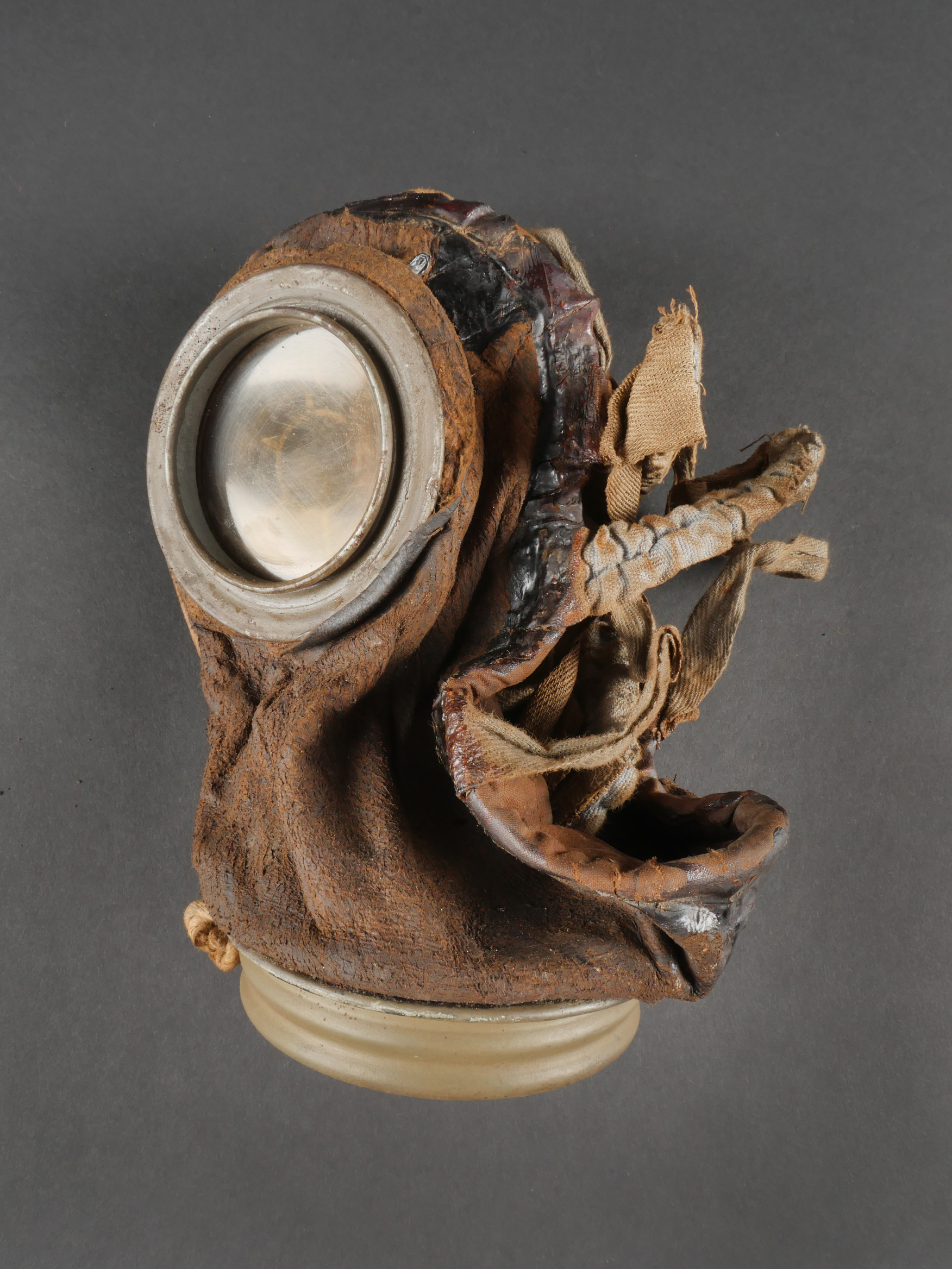 Masque anti-gaz allemand Lederschutzmaske avec boîtier nominatif. Masque anti-gaz en cuir, en bel état, souple, avec toutes ses sangles et sa cordelette. Optiques renforcés. Sans cartouche. Dans son boîtier en tole peinte feldgrau, plus de 70% de peinture, usure, légère oxydation. Couverle interne présent mais détaché, un oculaire de rechange. Avec ses sangles ersatz en ortie. Nom manuscrit sur le couvercle. German Gas Mask with Named Canister Leather gas mask in supple condition, complete with all straps and cord. Reinforced lenses. No filter. Metal canister in field-grey paint, about 70% remaining, with slight wear and oxidation. Inner lid present but detached, includes one spare lens. Ersatz nettle-fiber carrying straps. Handwritten name on the lid.