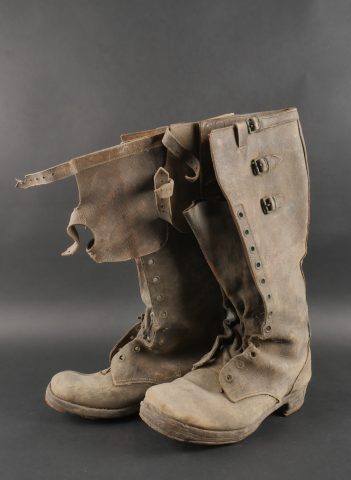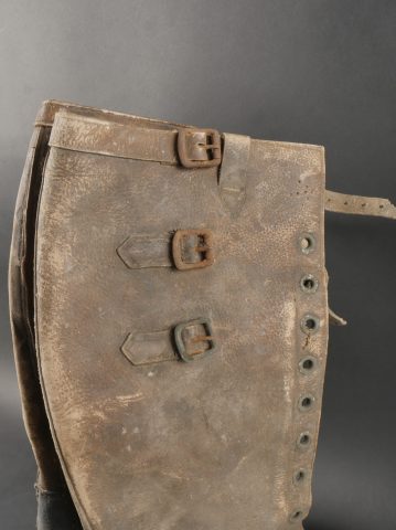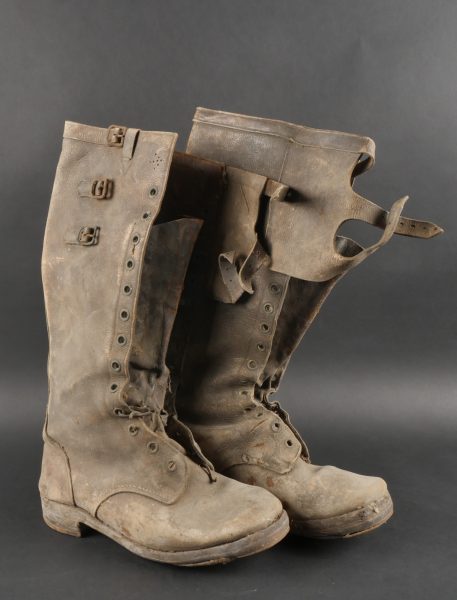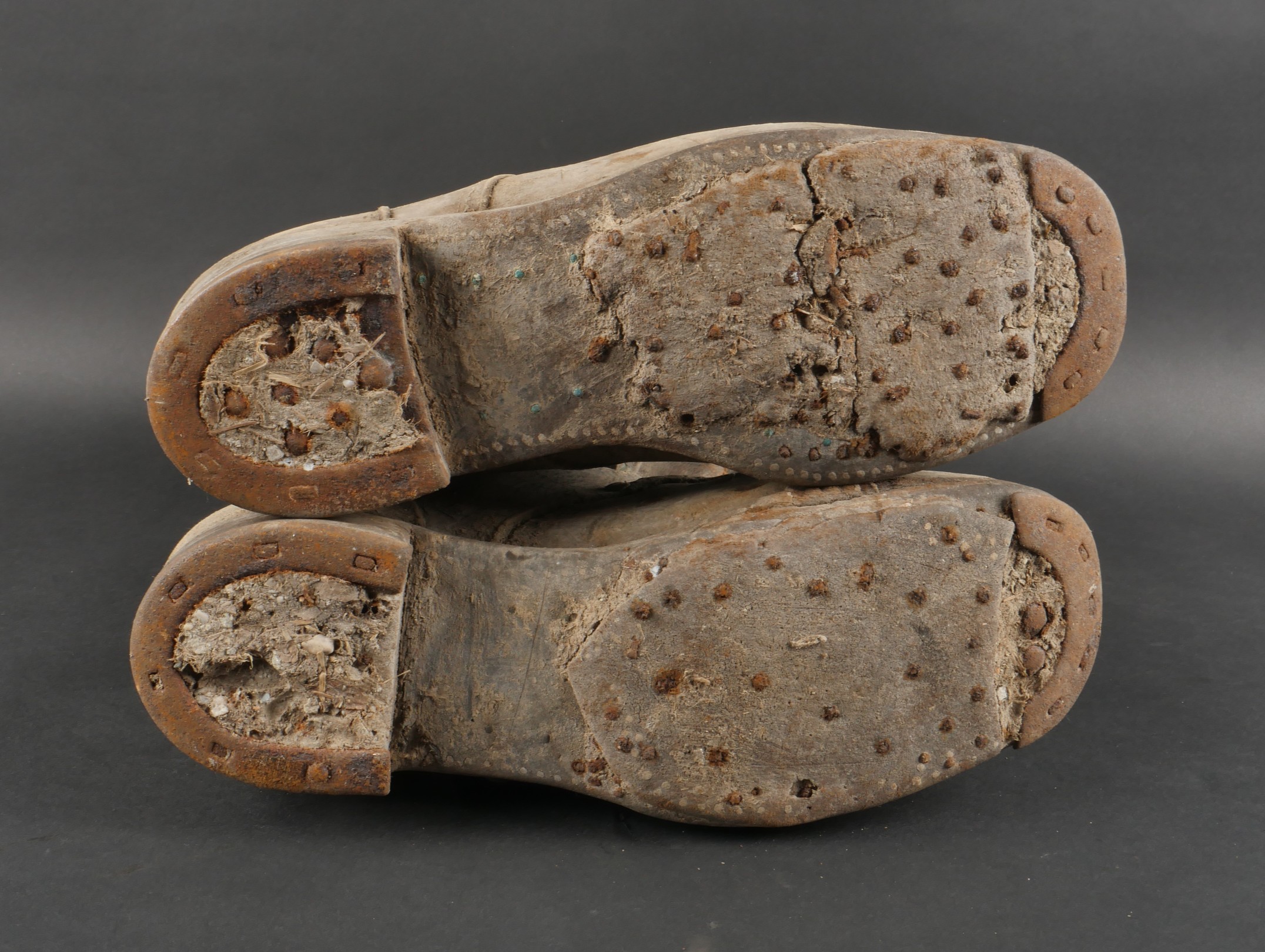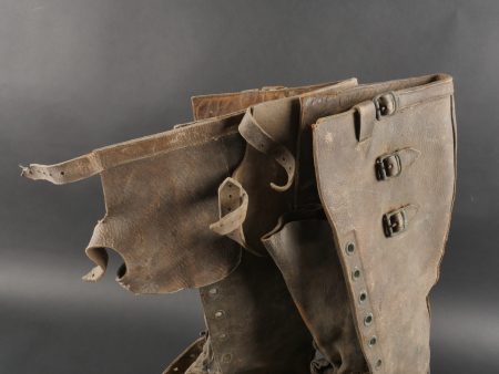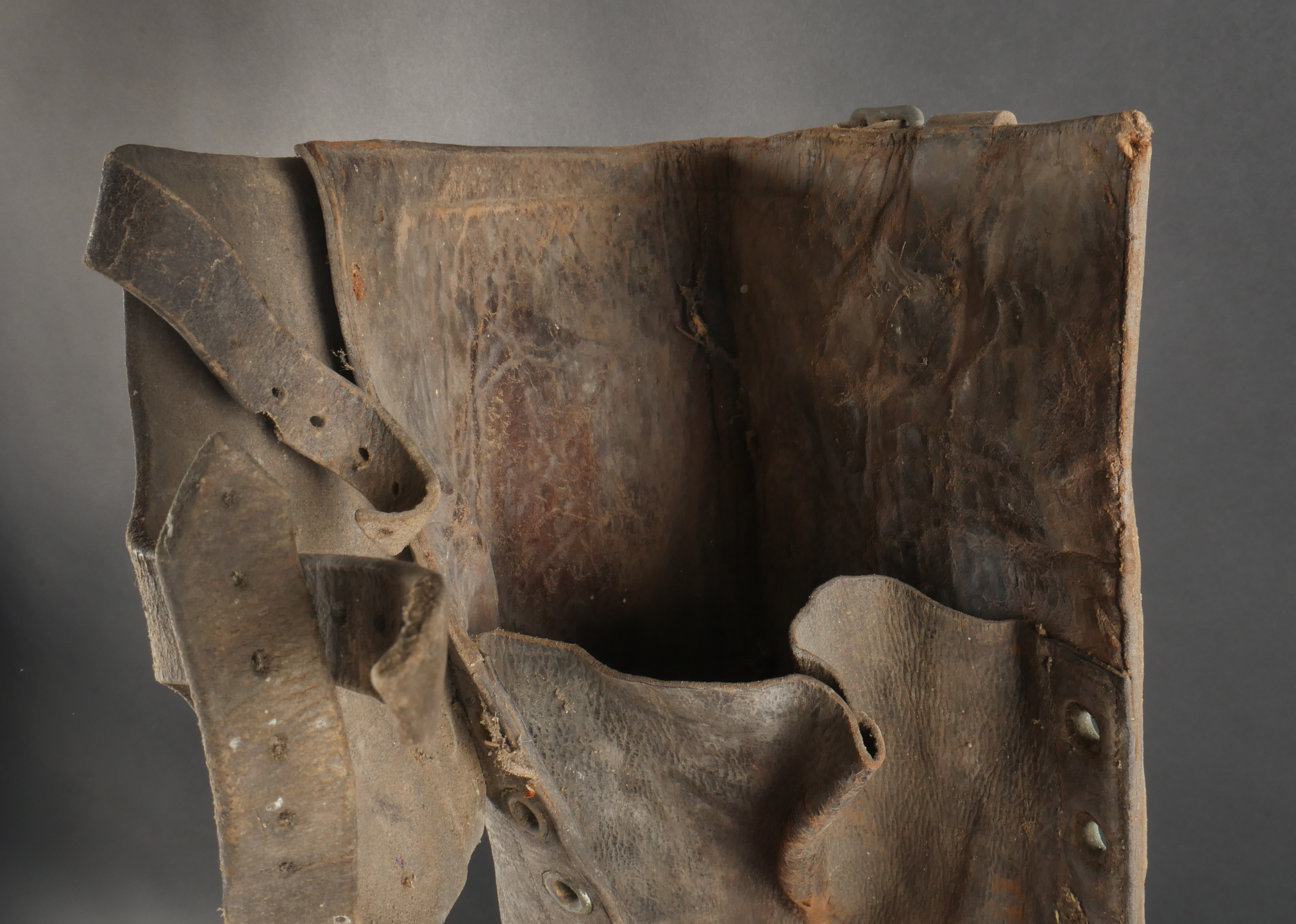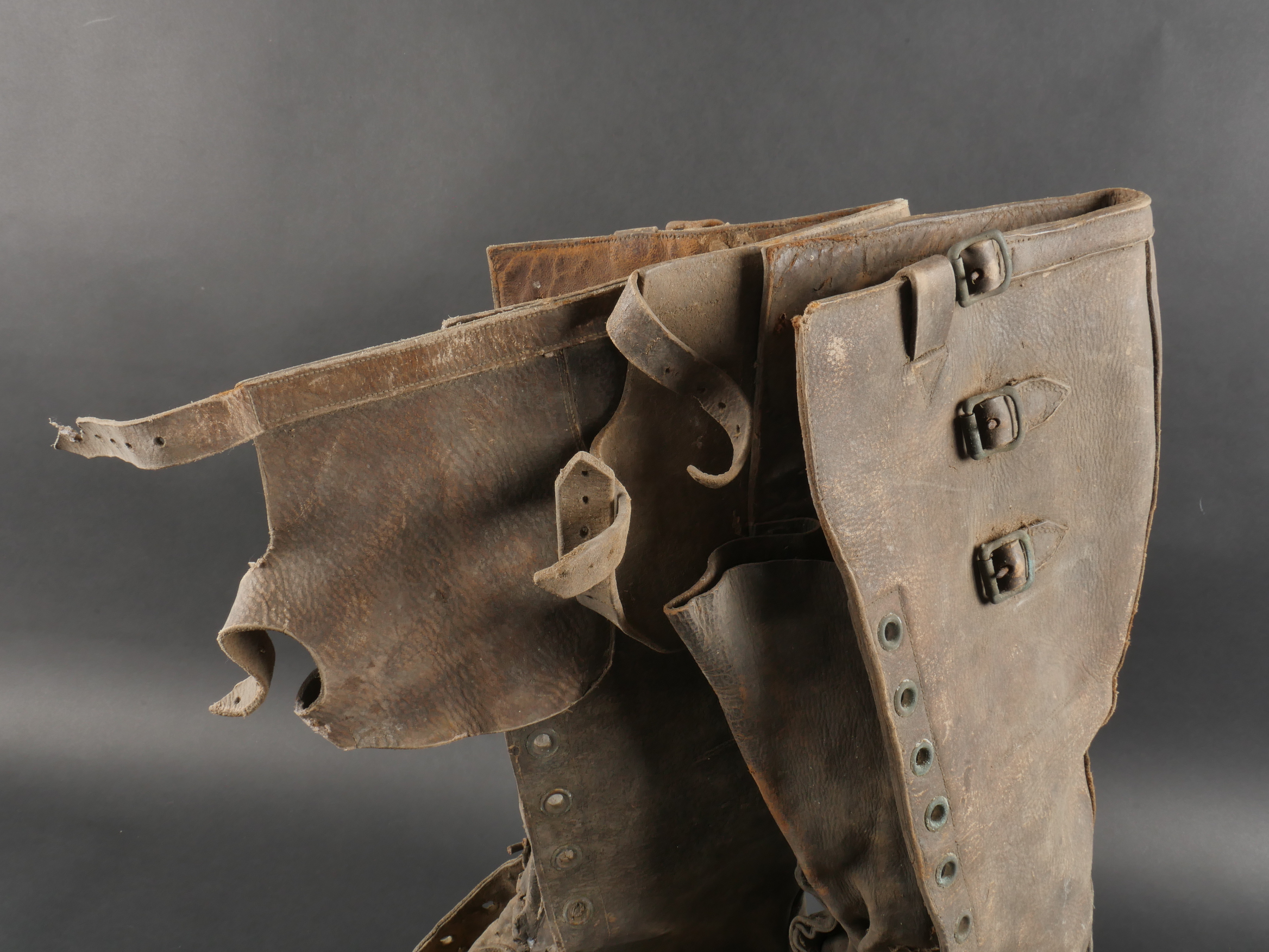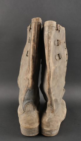 Paire de bottes anglaises de dispatch rider. Bottes anglaise dans leur état de découverte. Bottes à tige haute, initialement destinées aux estafettes à moto, de nombreuses photos attestent de leur usage dans les tranchées. Fausse paire mais vraiment homogène. Fermant par laçage dans 13 paires d’œillets, lacets absents. Haut de la tige avec jambière attenante fermant par 3 sanglons et boucles à ardillon, tous présents. Broad arrow en pointillés sur le haut de la tige de la botte droite, et chiffre 8 sur le haut de la tige de celle de gauche. Semelle interne datée 1916 à gauche, 1917 à droite. Semelles externes cloutées, pointe et talon ferrés. Usure et réparations. Une réparation au talon de la botte gauche. à nettoyer, cuir encore relativement souple. Pair of British Dispatch Rider’s BootsTall leather dispatch rider’s boots as found. Originally issued to motorcycle messengers, also seen worn in the trenches. Mismatched but well-matched pair. Lace-up front with thirteen eyelets, laces missing. Upper section fitted with integrated gaiters closing with three brass buckled straps, all present. Dotted Broad Arrow marking on right boot shaft, “8” on left. Insoles dated 1916 (left) and 1917 (right). Clouted soles with steel toe and heel plates. Worn but supple leather with minor repairs.