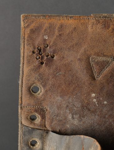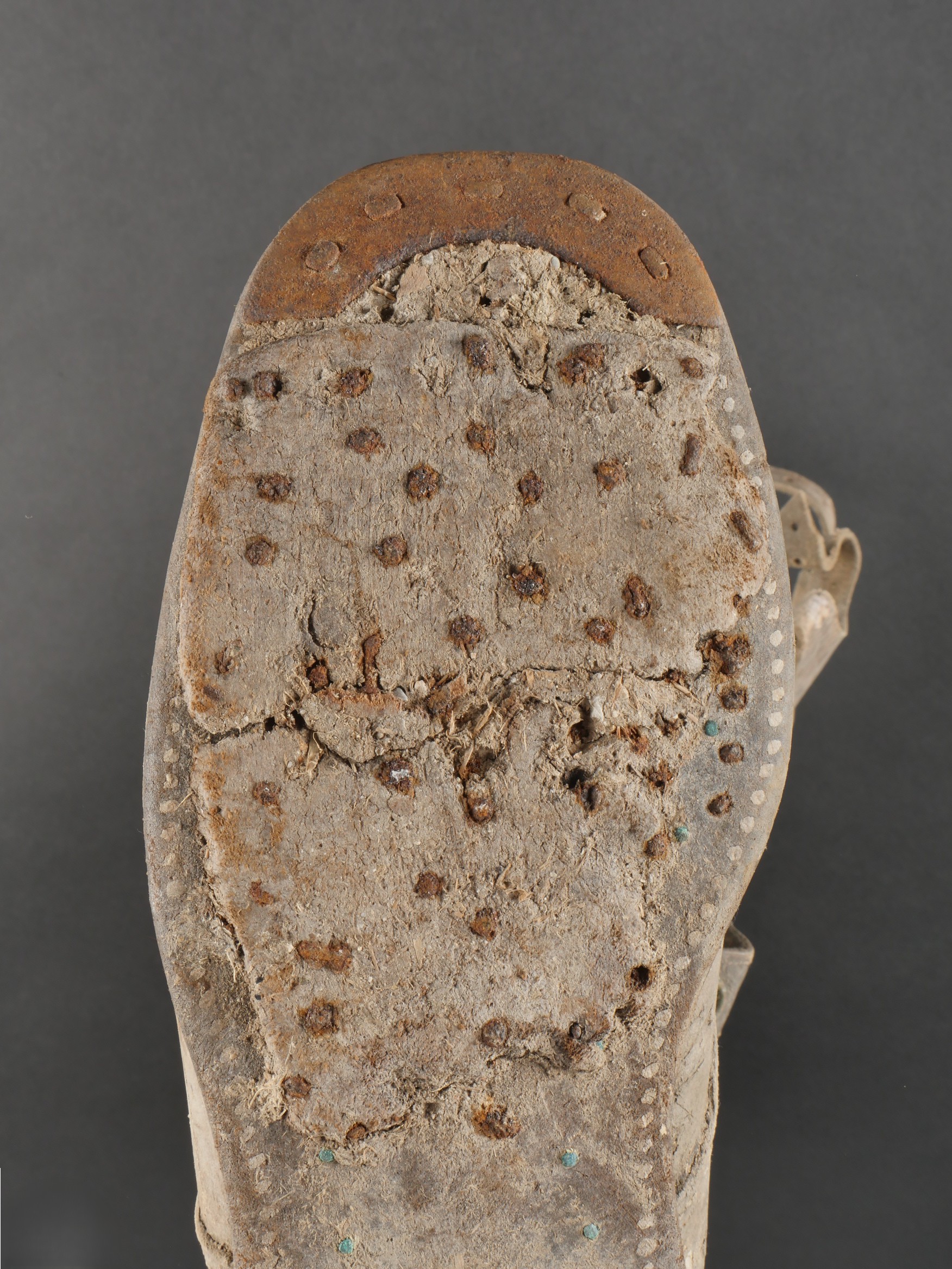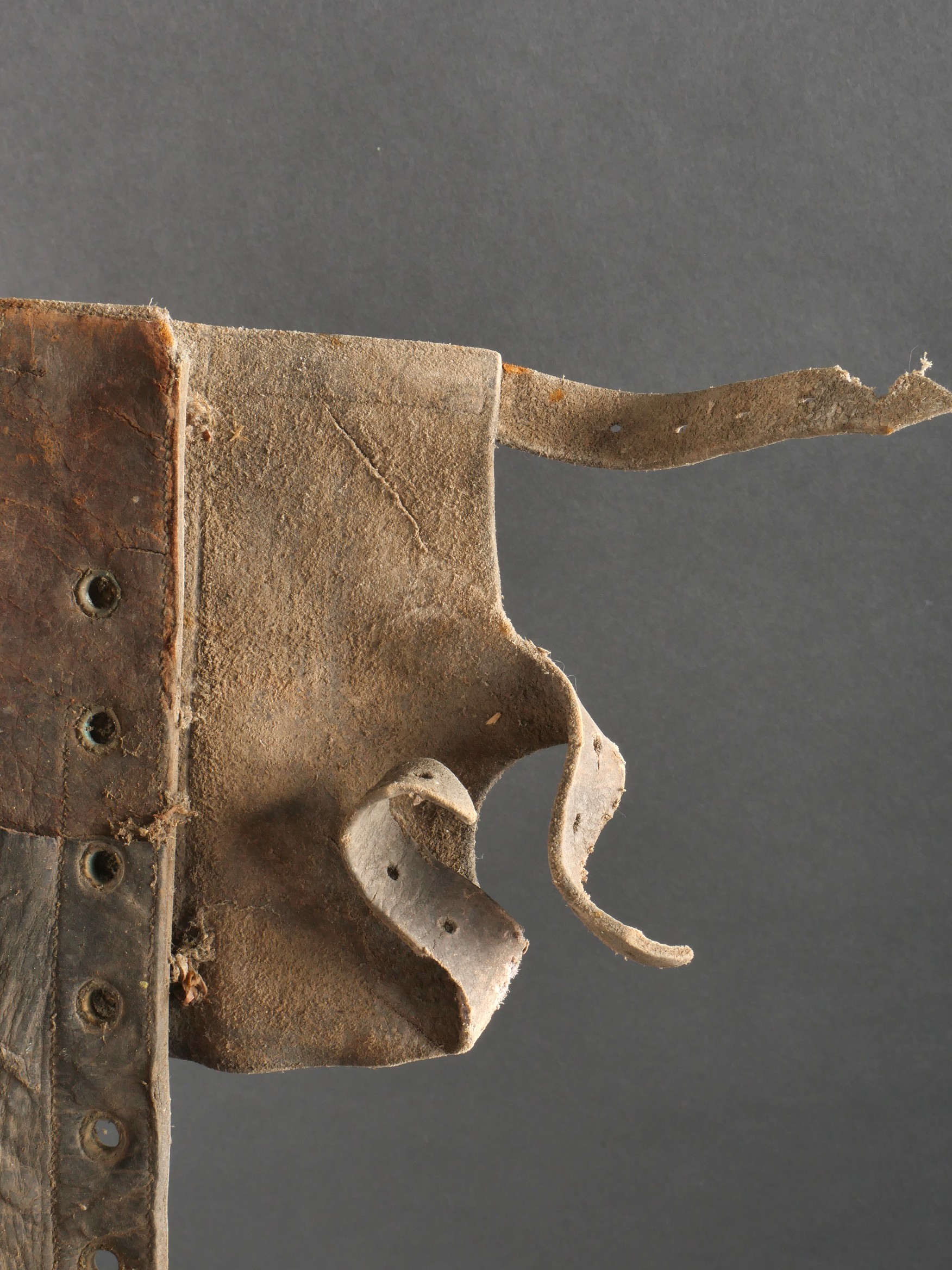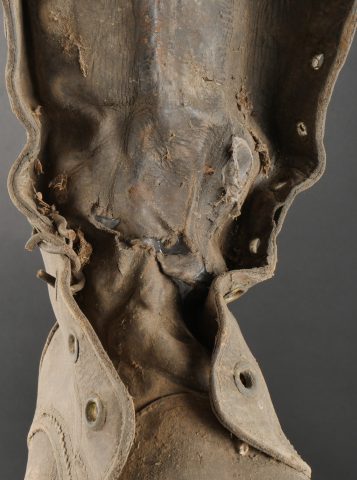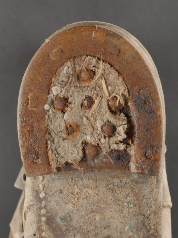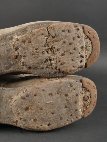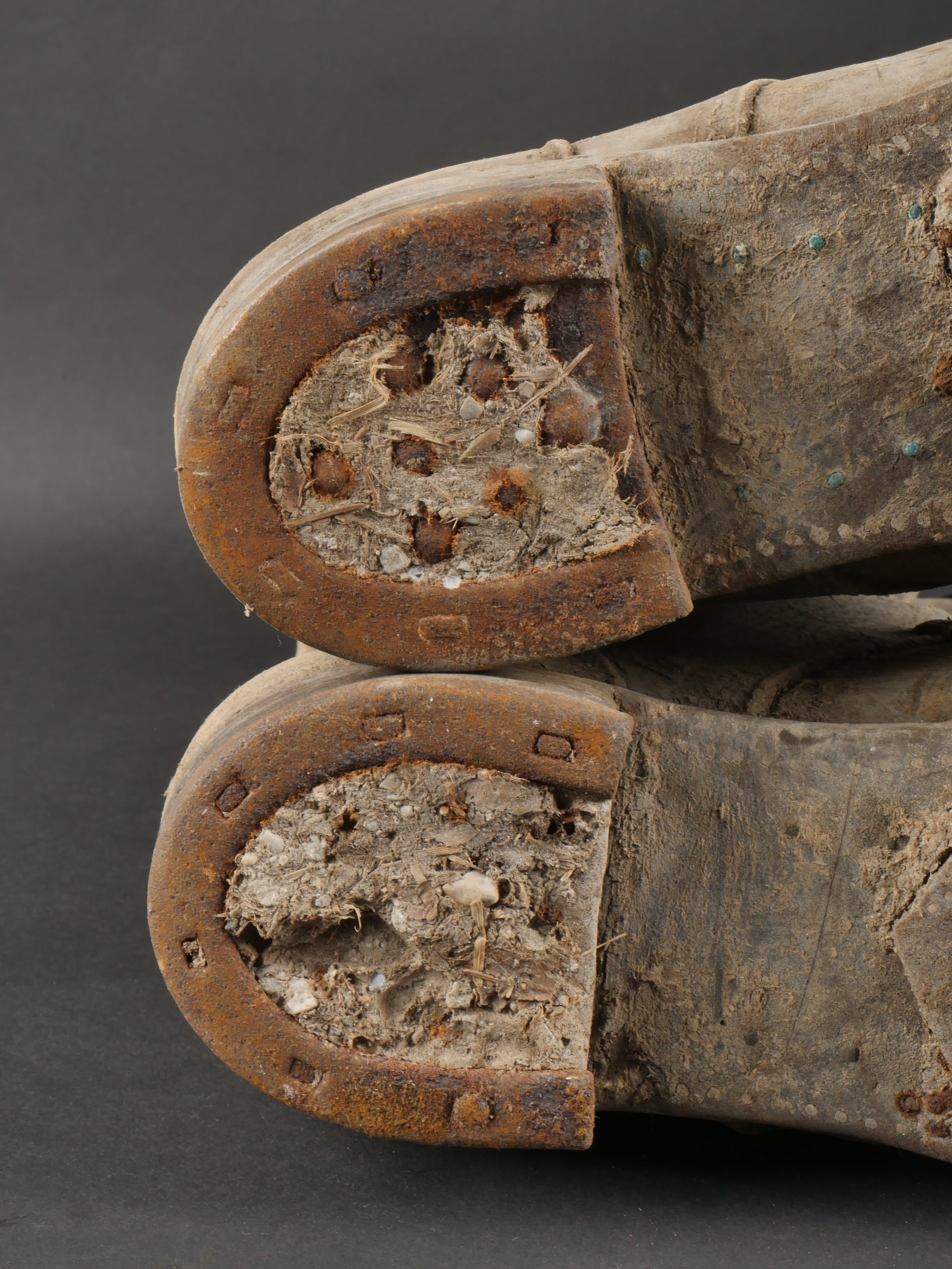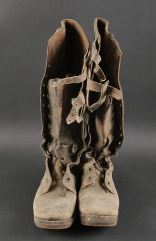 Paire de bottes anglaises de dispatch rider. Bottes anglaise dans leur état de découverte. Bottes à tige haute, initialement destinées aux estafettes à moto, de nombreuses photos attestent de leur usage dans les tranchées. Fausse paire mais vraiment homogène. Fermant par laçage dans 13 paires d’œillets, lacets absents. Haut de la tige avec jambière attenante fermant par 3 sanglons et boucles à ardillon, tous présents. Broad arrow en pointillés sur le haut de la tige de la botte droite, et chiffre 8 sur le haut de la tige de celle de gauche. Semelle interne datée 1916 à gauche, 1917 à droite. Semelles externes cloutées, pointe et talon ferrés. Usure et réparations. Une réparation au talon de la botte gauche. à nettoyer, cuir encore relativement souple. Pair of British Dispatch Rider’s BootsTall leather dispatch rider’s boots as found. Originally issued to motorcycle messengers, also seen worn in the trenches. Mismatched but well-matched pair. Lace-up front with thirteen eyelets, laces missing. Upper section fitted with integrated gaiters closing with three brass buckled straps, all present. Dotted Broad Arrow marking on right boot shaft, “8” on left. Insoles dated 1916 (left) and 1917 (right). Clouted soles with steel toe and heel plates. Worn but supple leather with minor repairs.