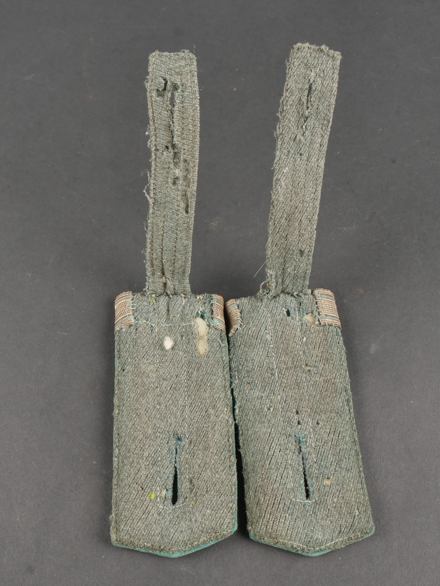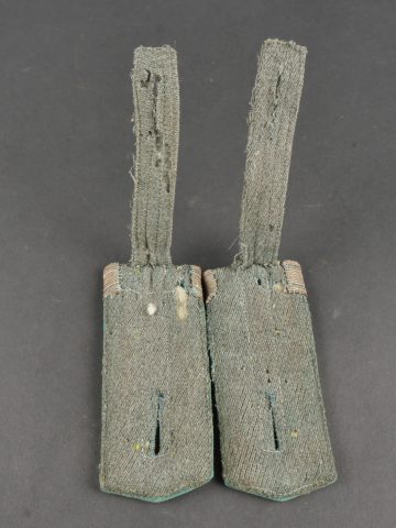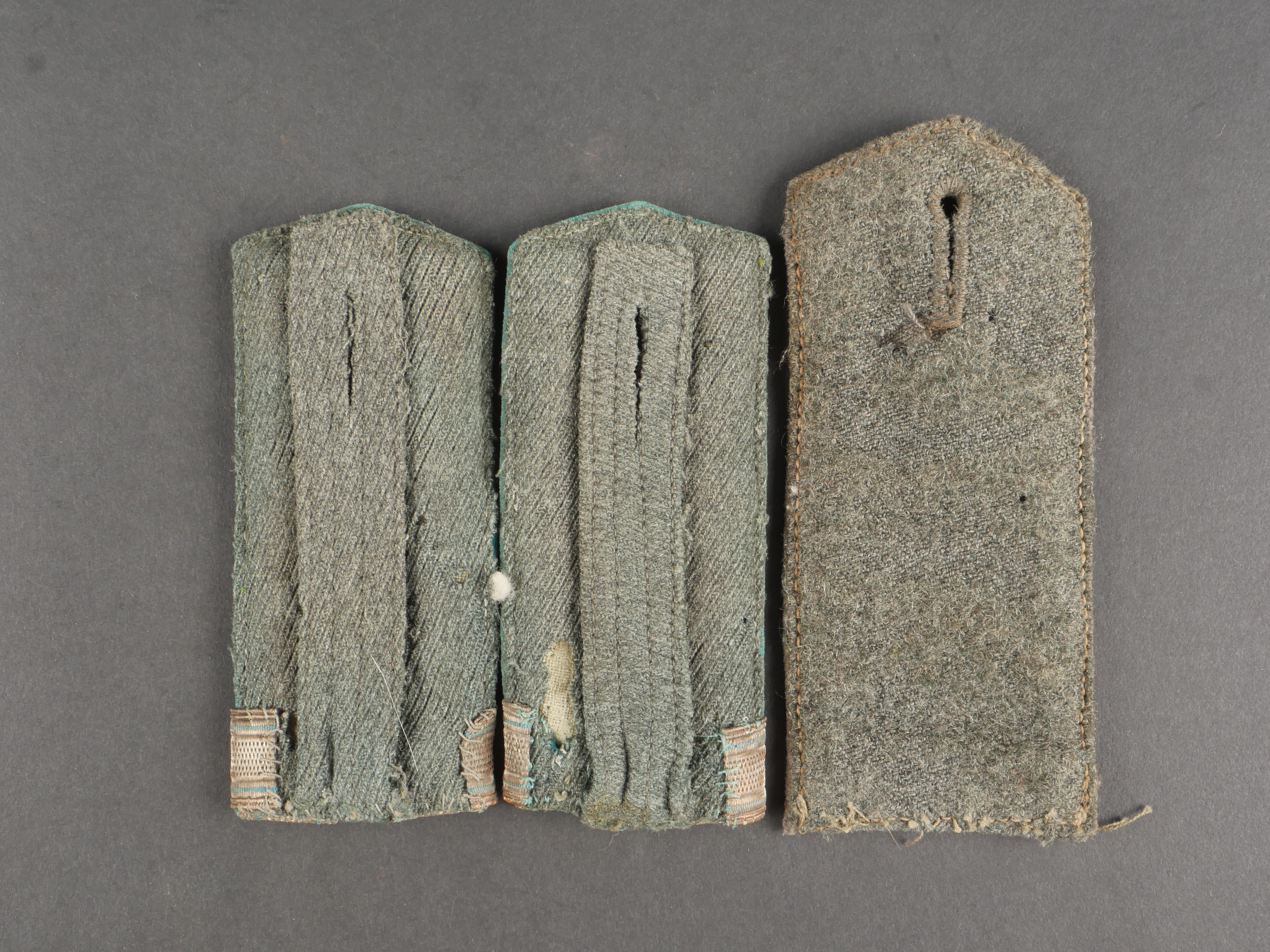Pattes d’épaule troupe et sous-officier allemand. Une patte modèle 1907 simplifiée, également appelée modèle 1914 du JR176 de Thorn, faisant partie de la 35 ID, usure. Une paire de patte d’épaule de sous officier supérieur Offizierstellvertreter M1915, dessous feldgrau dessus vert, possiblement pour un Chasseur à Pied bavarois. Usure d’usage, quelques trous de mites. German Shoulder Straps for Enlisted Man and NCO One simplified model 1907 strap, also known as 1914 pattern, from Infantry Regiment 176 (Thorn), part of 35th Division. One pair of NCO superior (Offizierstellvertreter) shoulder straps, 1915 pattern, green top with field-grey underlay, possibly for Bavarian Jäger. Signs of use, minor moth holes.