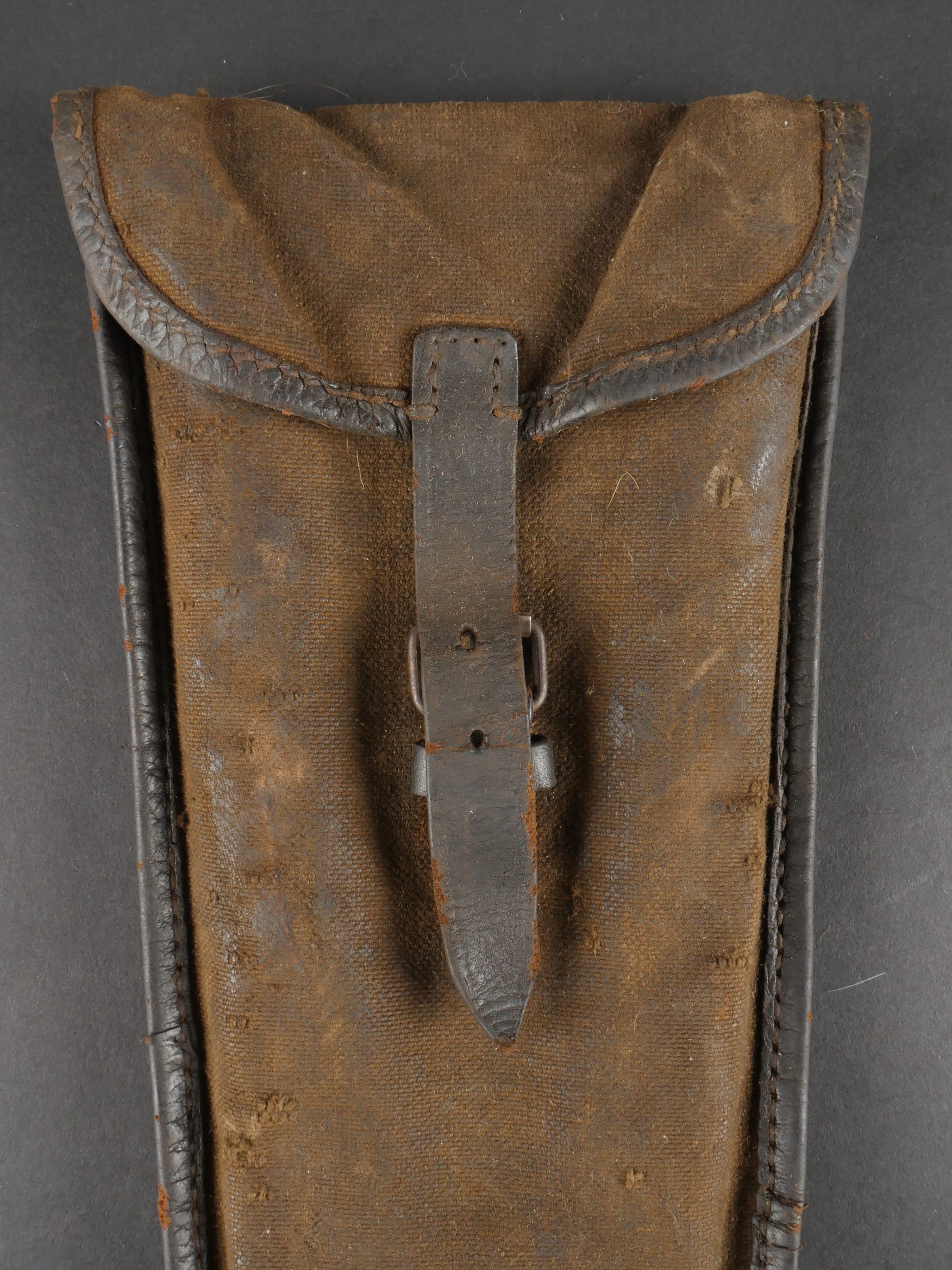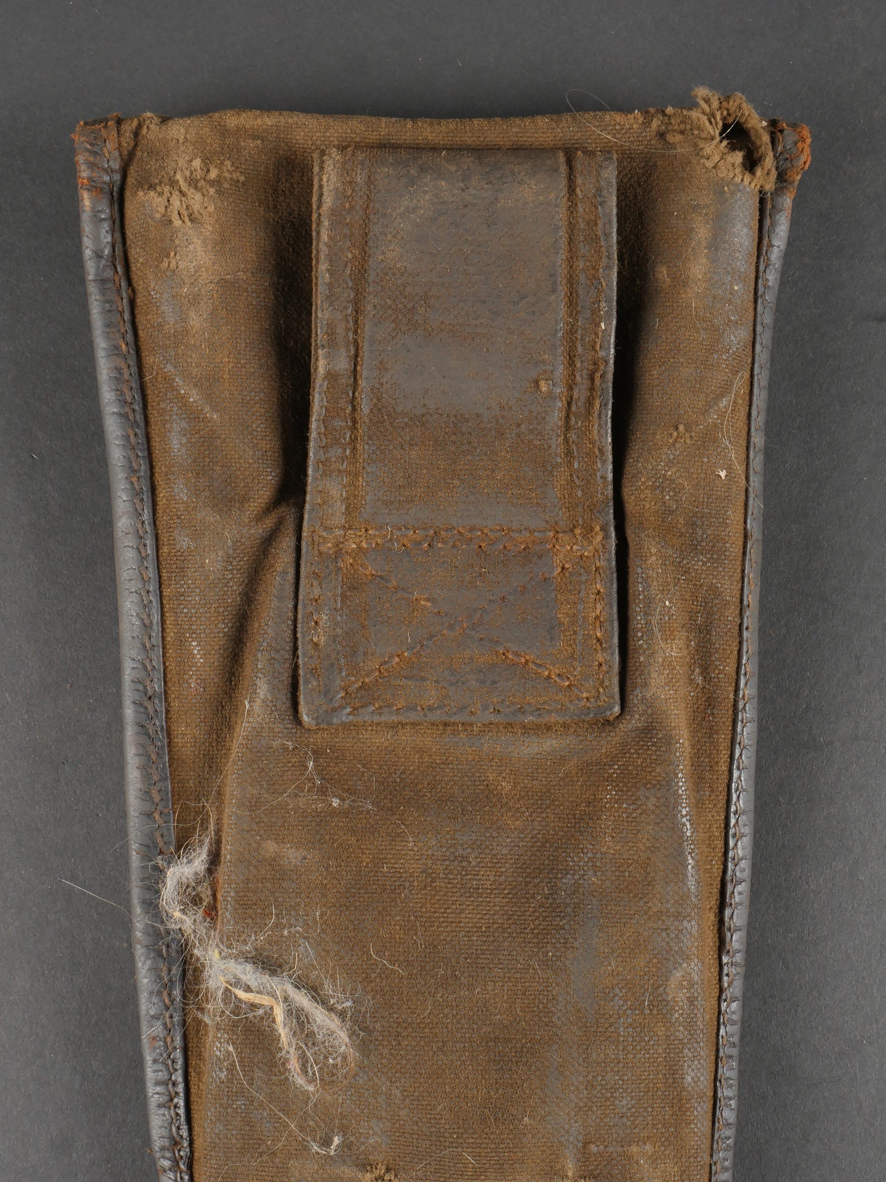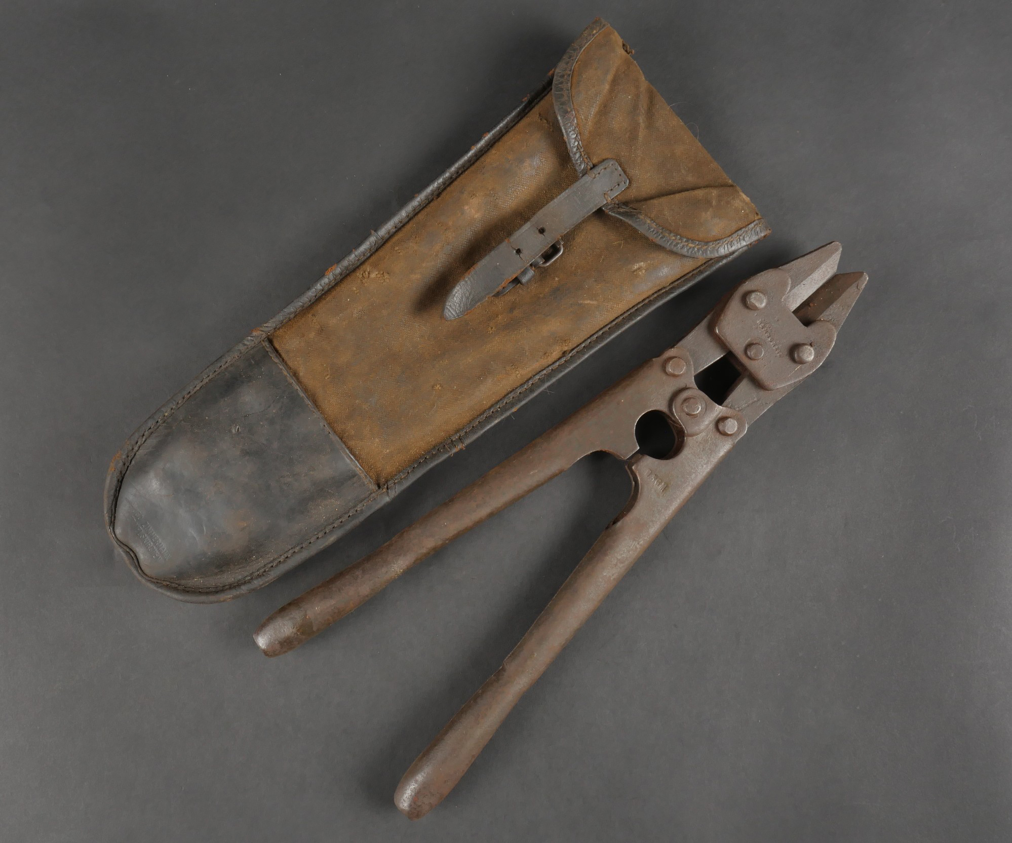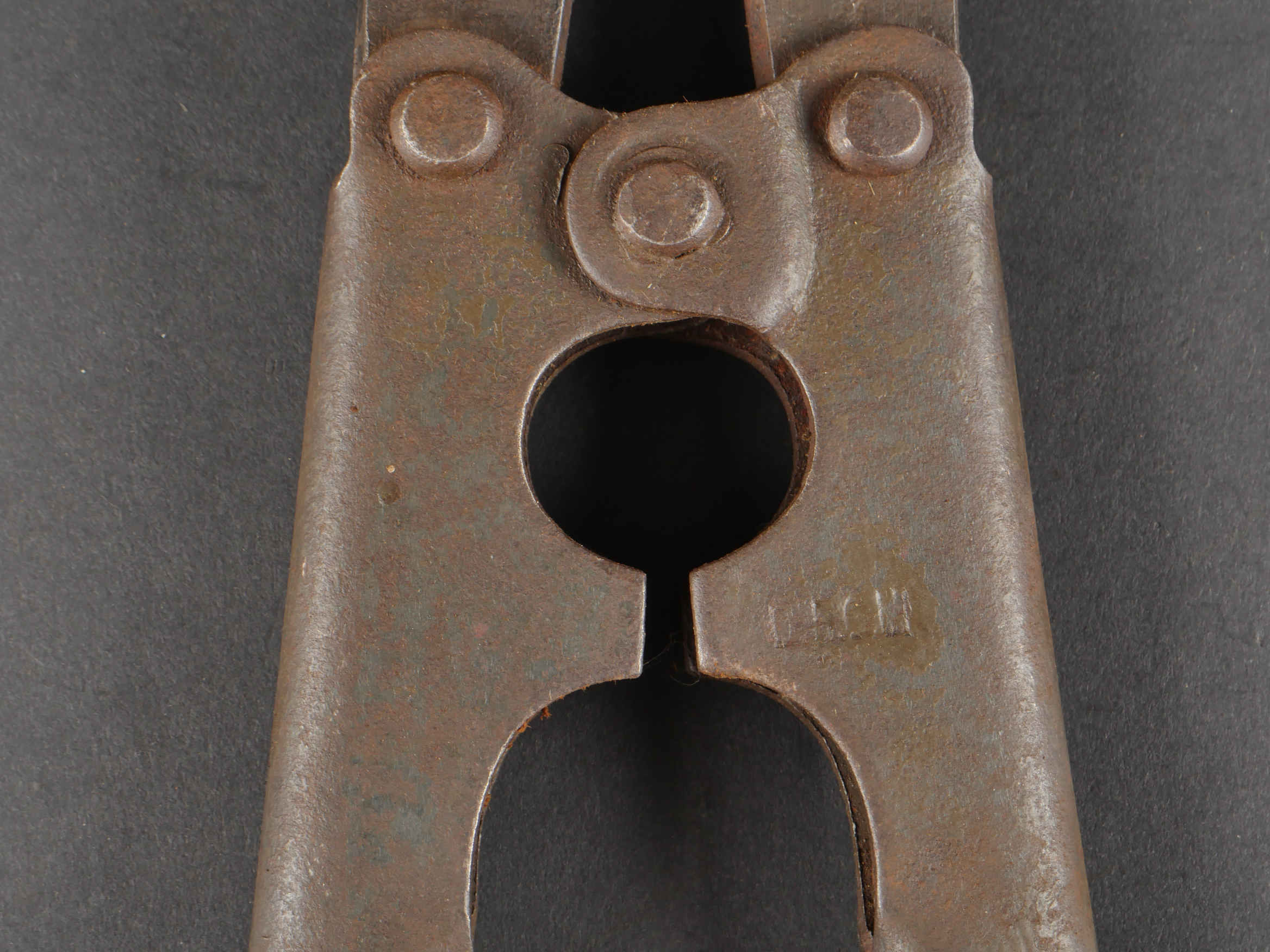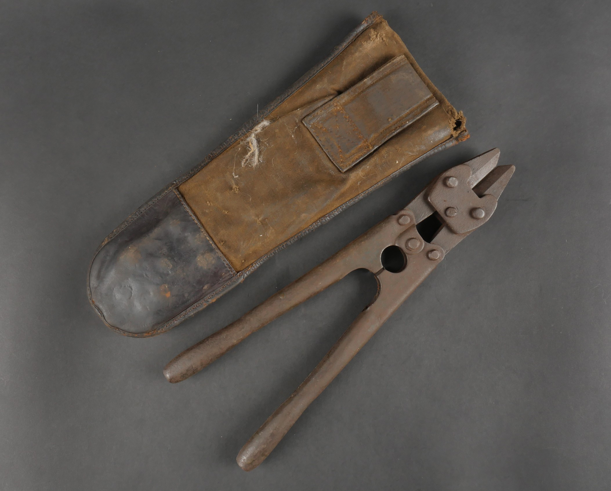 Pince coupante allemande dans son étui en toile. Pince modèle moyen, tout en métal, fonctionnelle, restes de peinture feldgrau. Marquage d’un fabricant de Remsheid, et marquage DRGM. Etui en toile renforcé de cuir. Sanglon de fermeture cuir. Passant de ceinturon en toile. Etui sale, graisse. German Wire Cutters with Canvas Pouch Medium-sized all-metal wire cutters, functional, with remnants of field-grey paint. Marked by a manufacturer in Remscheid and stamped DRGM. Reinforced canvas and leather case with closing strap and belt loop. Case dirty and greasy.